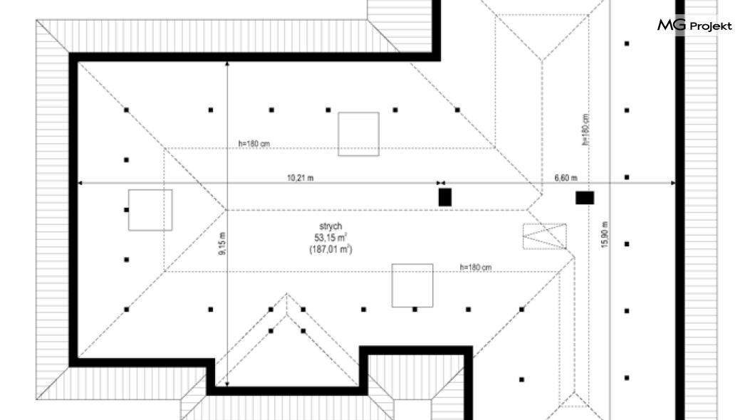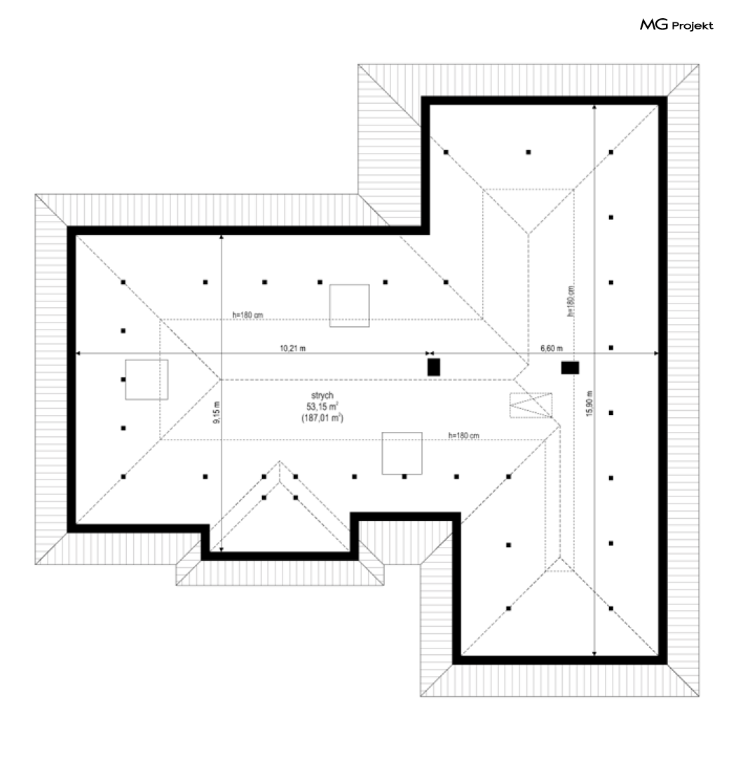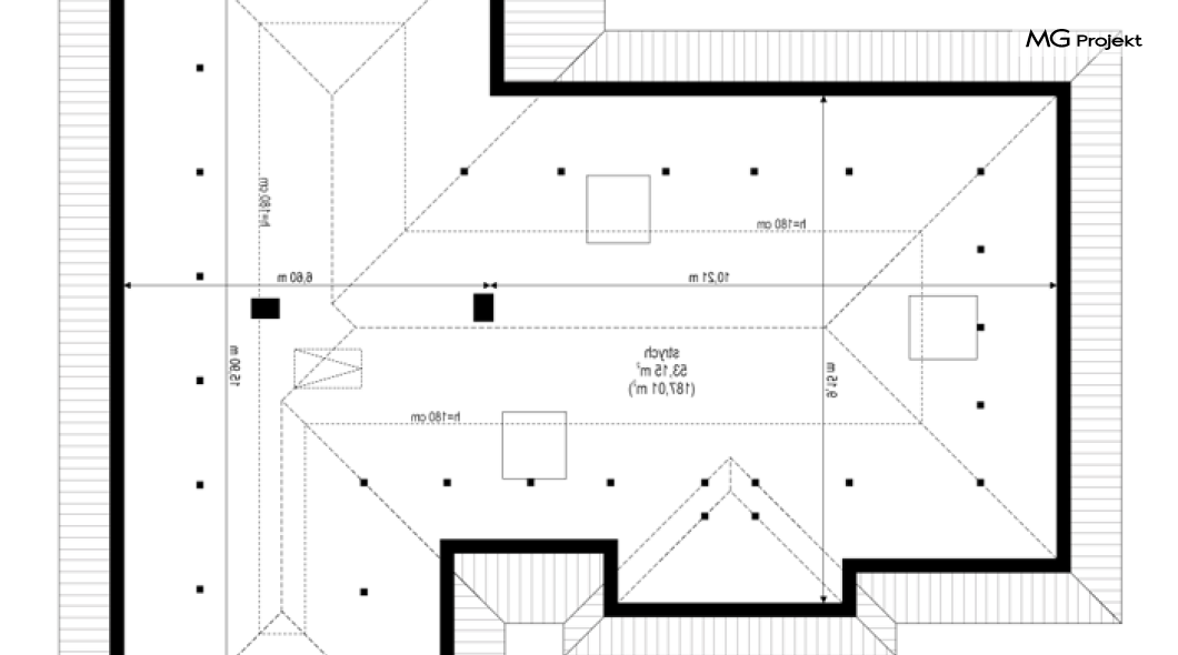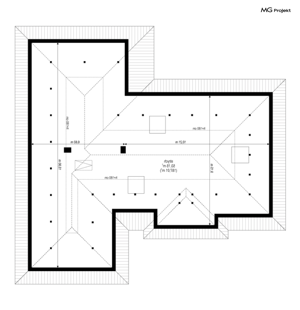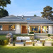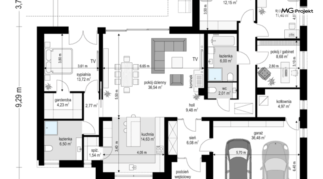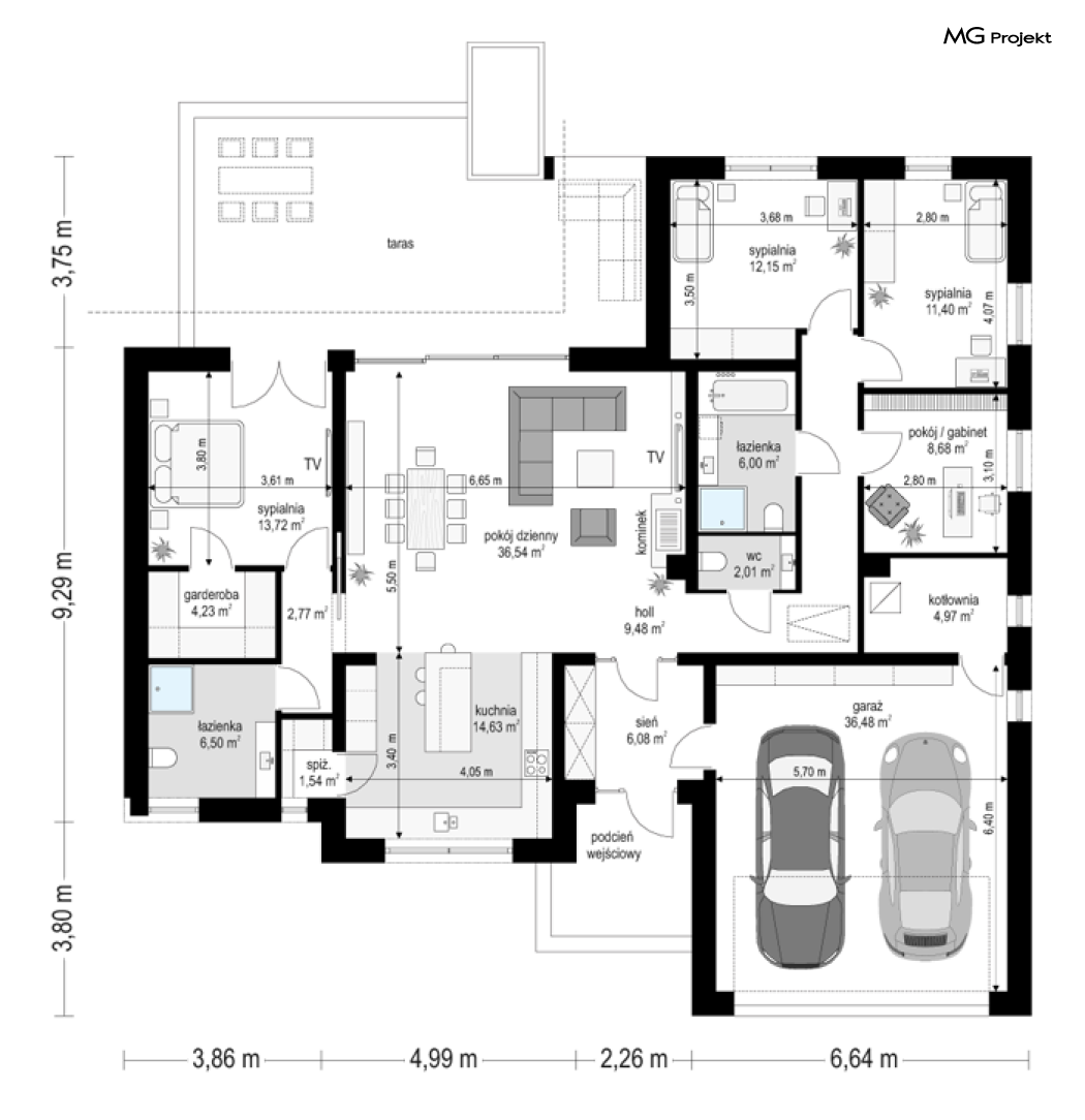 Projekt domu Willa parterowa 2 jest nieco mniejszą wersją projektu „Willa parterowa”, idealny dla Inwestorów zamierzających budować dom o powierzchni użytkowej do 140 m2 + garaż. Projekt jest przeznaczony dla 4-5 osobowej rodziny. Dom jest parterowy, zbudowany na planie litery T, przykryty czterospadowym dachem, z dobudówkami nad garażem i sypialniami. Architektura budynku jest nowoczesna, a zarazem powściągliwa w formie i logiczna. Poziomy podział elewacji oraz duże przeszklenia, połączone z wstawkami z kontrastującego tynku i okładzinami drewnianymi (lub imitującymi drewno) uatrakcyjniają sylwetkę domu. Do wnętrza wchodzimy pięknymi drzwiami wejściowymi z naświetlem - do przedsionka i od razu do centralnej części dziennej z salonem i kuchnią, a stamtąd na boki do części osobnej rodziców, oraz części z sypialniami dziecięcymi. Salon ze ścianą kominkowo – telewizyjną, miejscem na wygodny wypoczynek oraz dużym stołem jadalnym połączony jest przestrzennie z kuchnią z wyspą i spiżarnią. Salon doświetlony jest zarówno od strony ogrodu - szerokimi przeszklonymi drzwiami na taras, jak i pośrednio od frontu domu - przez duże okno kuchenne. Z boku części dziennej mamy apartament rodziców, z sypialnią z wyjściem na taras, oraz łazienką i garderobą. Z drugiej strony domu mamy trzy pokoje - sypialnie dziecięce i łazienkę. Z przedsionka przedostajemy się do dwustanowiskowego garażu i do kotłowni. Plan domu jest bardzo prosty i logiczny, a jednocześnie oryginalny, przełamujący utarty schemat wnętrza. Nad parterem znajduje się strych nieużytkowy, który można oczywiście zaadaptować na dodatkową powierzchnię użytkową po niewielkich modyfikacjach. Projekt domu Willa parterowa 2 jest świetną propozycją dla Inwestorów planujących budowę nowoczesnego, nie za dużego, ale komfortowego domu jednorodzinnego. Parterowego, w którym żyje się wygodnie na jednej kondygnacji, mając bezpośredni kontakt z ogrodem, otoczeniem, tarasami. Budynek ma prostą konstrukcję, jest energooszczędny. Będzie łatwy w budowie i niedrogi w późniejszej eksploatacji. Zapraszamy !