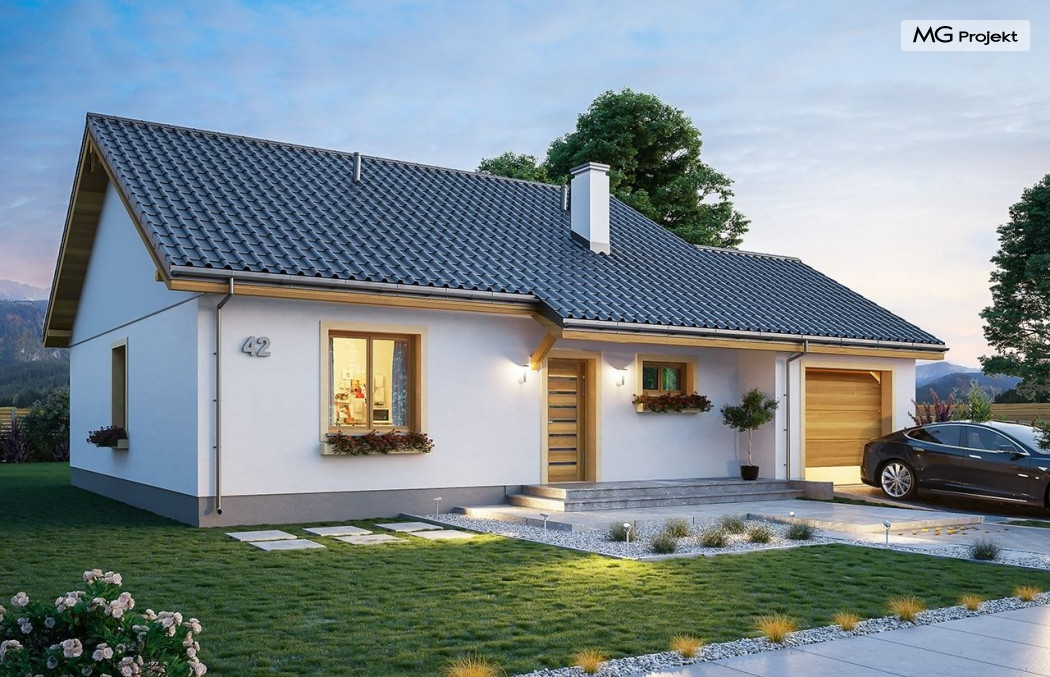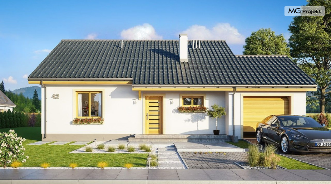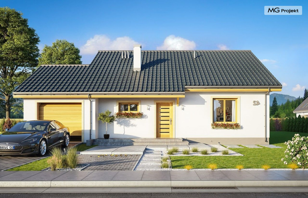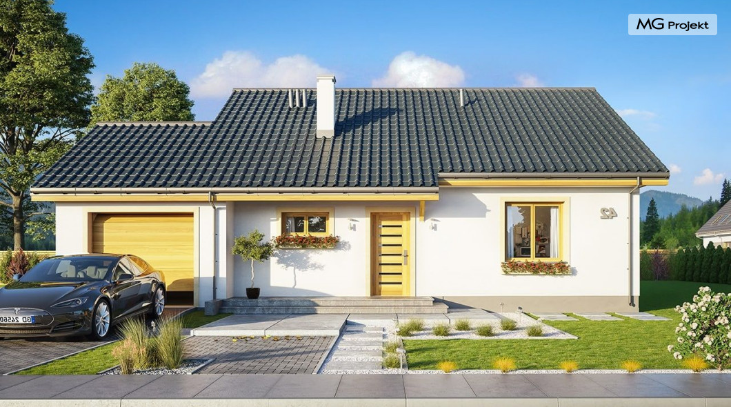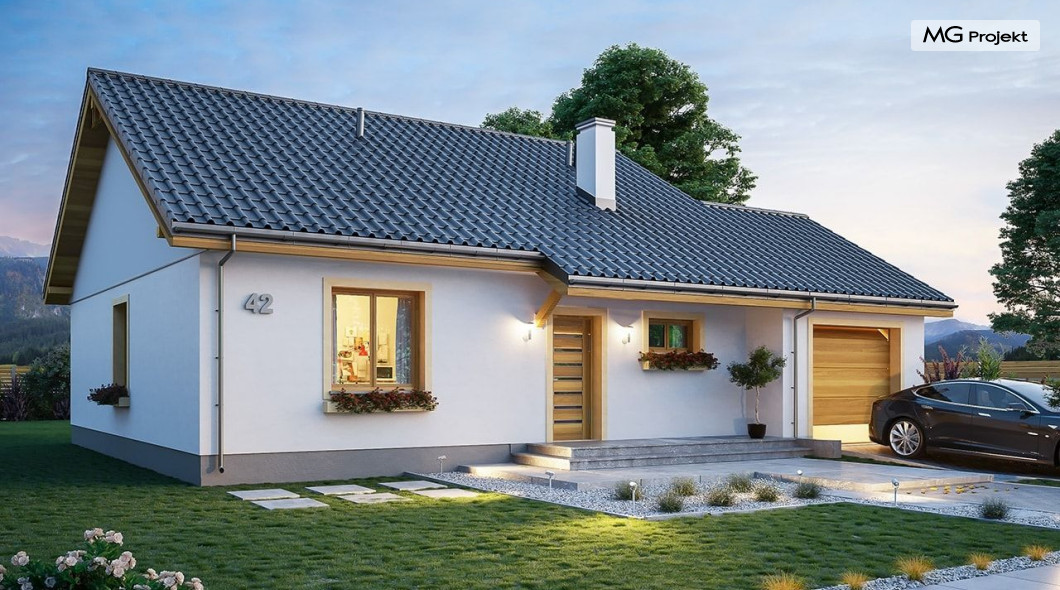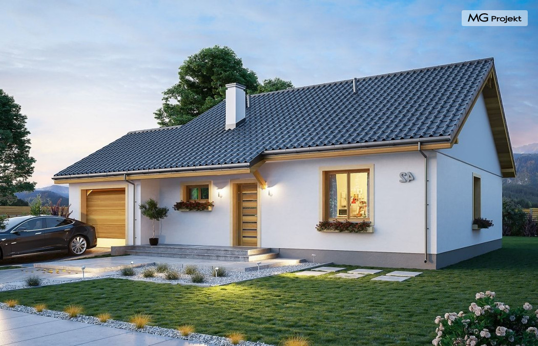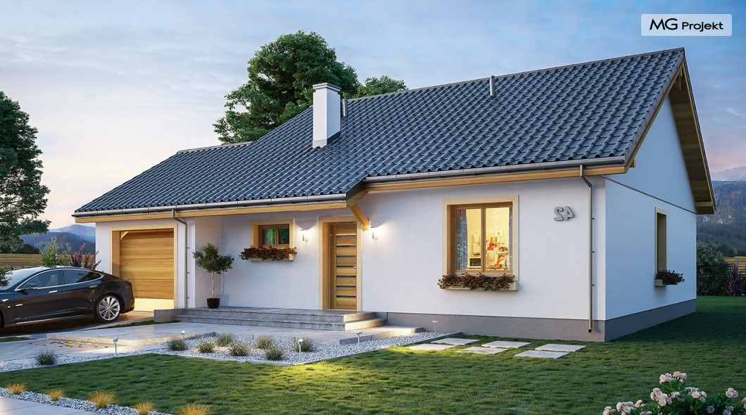 Projekt domu Zosia 8 – czyli kolejny projekt z serii „Zosia” – wersja powiększona w stosunku do bazowego projektu, zbudowaną na kwadratowym planie o wymiarach 10,7 x 10,7 m, z dodatkowym garażem. Dom ma prostą bryłę i konstrukcję, i spokojną bezpretensjonalną architekturę. Budynek dzięki swojej prostocie jest łatwy w budowie, a przez to niedrogi. Jednocześnie projekt domu Zosia 8 spełnia wymagania komfortowego mieszkania dla czteroosobowej rodziny. Dom wieńczy dwuspadowy dach o kącie 30 stopni. Nad parterem przewidziano strop drewniany belkowy i krokwiową więźbę dachową, co tworzy dużą przestrzeń strychową, na którą dostajemy się schodkami drabinkowymi. Do domu wchodzimy przez przedsionek z dużą szafą do holu i salonu. Z boku przy wejściu przechodzimy do kotłowni i dalej do garażu. Kotłownia została przewidziana w projekcie jako gazowa, ale łatwo można ją przerobić na kotłownię na paliwo stałe.Dalej mamy łazienkę, a następnie przestrzeń dzienną z salonem i aneksem kuchennym - o łącznej powierzchni około 35 m2. Z lewej strony mamy trzy sypialnie, w tym sypialnię rodziców z garderobą Z salonu wydostajemy się do ogrodu i na taras. Strych nad parterem można przeprojektować na poddasze użytkowe, dodając schody na górę. Dom jest bardzo funkcjonalny i ma rozbudowany program pomieszczeń. Nie ma tutaj zmarnowanej przestrzeni - wszystko jest praktycznie wykorzystane. Dom ma bezpretensjonalną i przyjemną dla oka stylistykę. Zdecydowaną zaletą domków z serii „Zosia” jest ich prostota i funkcjonalność, przekładające się na maksymalny efekt inwestycji uzyskany za niewielkie pieniądze. Każdą kolejną wersję domu z tej serii staramy się projektować jeszcze lepiej i sensowniej. Dom Zosia 8 jest zaprojektowany jako energooszczędny, bardzo dobrze ocieplony. Będzie dzięki temu tani w późniejszej eksploatacji. Zachęcamy do zapoznania się z pełną ofertą pracowni MG Projekt tej serii: projekt domu Zosia, projekt domu Zosia 2, projekt domu Zosia 3, projekt domu Zosia 4, projekt domu Zosia 5, projekt domu Zosia 6, projekt domu Zosia 7, projekt domu Zosia 7B. Zapraszamy!