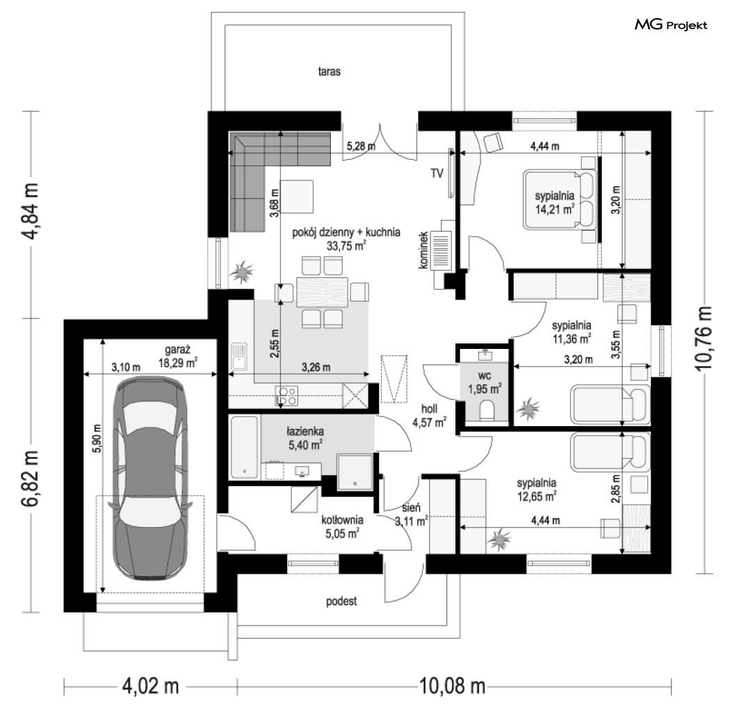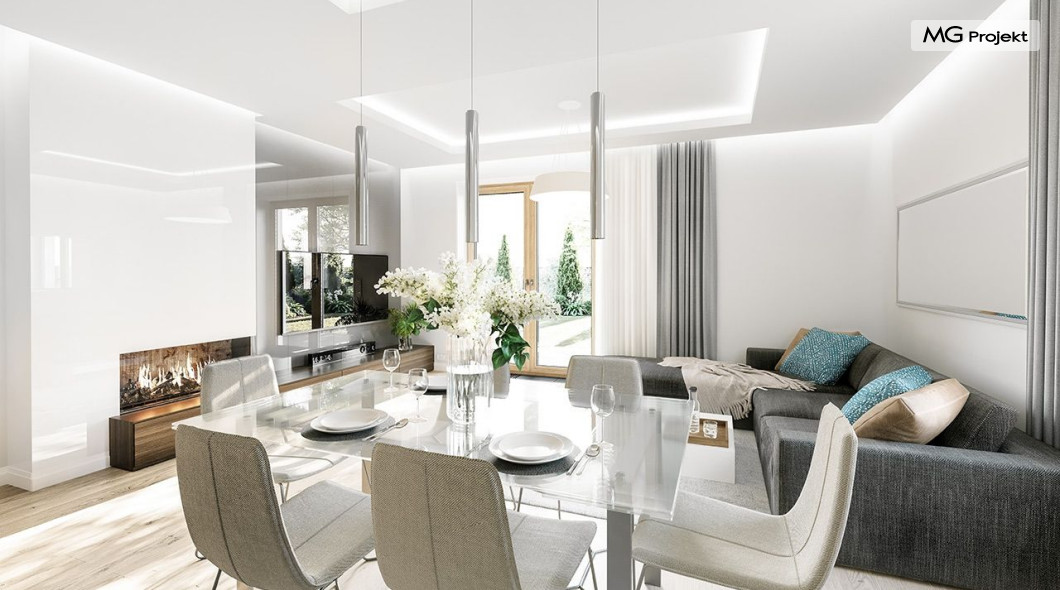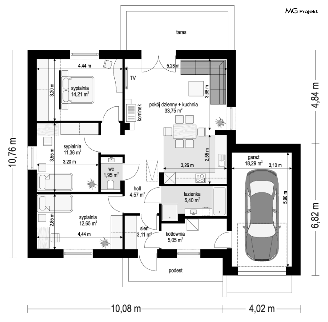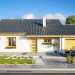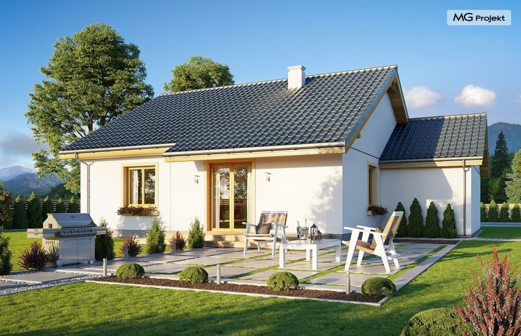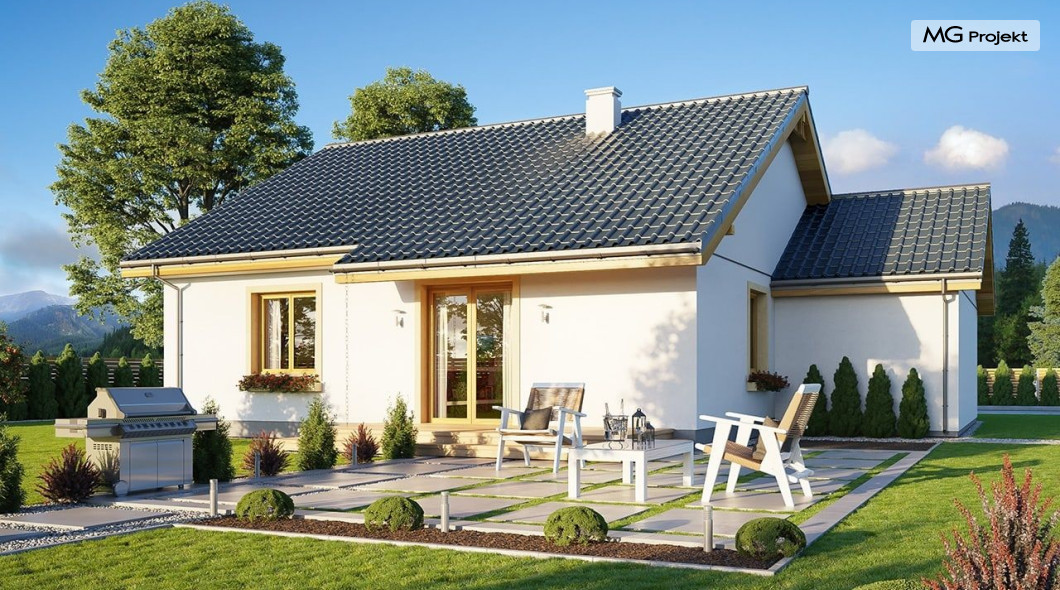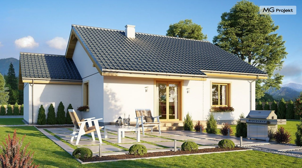 Projekt domu Zosia 8 – czyli kolejny projekt z serii „Zosia” – wersja powiększona w stosunku do bazowego projektu, zbudowaną na kwadratowym planie o wymiarach 10,7 x 10,7 m, z dodatkowym garażem. Dom ma prostą bryłę i konstrukcję, i spokojną bezpretensjonalną architekturę. Budynek dzięki swojej prostocie jest łatwy w budowie, a przez to niedrogi. Jednocześnie projekt domu Zosia 8 spełnia wymagania komfortowego mieszkania dla czteroosobowej rodziny. Dom wieńczy dwuspadowy dach o kącie 30 stopni. Nad parterem przewidziano strop drewniany belkowy i krokwiową więźbę dachową, co tworzy dużą przestrzeń strychową, na którą dostajemy się schodkami drabinkowymi. Do domu wchodzimy przez przedsionek z dużą szafą do holu i salonu. Z boku przy wejściu przechodzimy do kotłowni i dalej do garażu. Kotłownia została przewidziana w projekcie jako gazowa, ale łatwo można ją przerobić na kotłownię na paliwo stałe.Dalej mamy łazienkę, a następnie przestrzeń dzienną z salonem i aneksem kuchennym - o łącznej powierzchni około 35 m2. Z lewej strony mamy trzy sypialnie, w tym sypialnię rodziców z garderobą Z salonu wydostajemy się do ogrodu i na taras. Strych nad parterem można przeprojektować na poddasze użytkowe, dodając schody na górę. Dom jest bardzo funkcjonalny i ma rozbudowany program pomieszczeń. Nie ma tutaj zmarnowanej przestrzeni - wszystko jest praktycznie wykorzystane. Dom ma bezpretensjonalną i przyjemną dla oka stylistykę. Zdecydowaną zaletą domków z serii „Zosia” jest ich prostota i funkcjonalność, przekładające się na maksymalny efekt inwestycji uzyskany za niewielkie pieniądze. Każdą kolejną wersję domu z tej serii staramy się projektować jeszcze lepiej i sensowniej. Dom Zosia 8 jest zaprojektowany jako energooszczędny, bardzo dobrze ocieplony. Będzie dzięki temu tani w późniejszej eksploatacji. Zachęcamy do zapoznania się z pełną ofertą pracowni MG Projekt tej serii: projekt domu Zosia, projekt domu Zosia 2, projekt domu Zosia 3, projekt domu Zosia 4, projekt domu Zosia 5, projekt domu Zosia 6, projekt domu Zosia 7, projekt domu Zosia 7B. Zapraszamy!