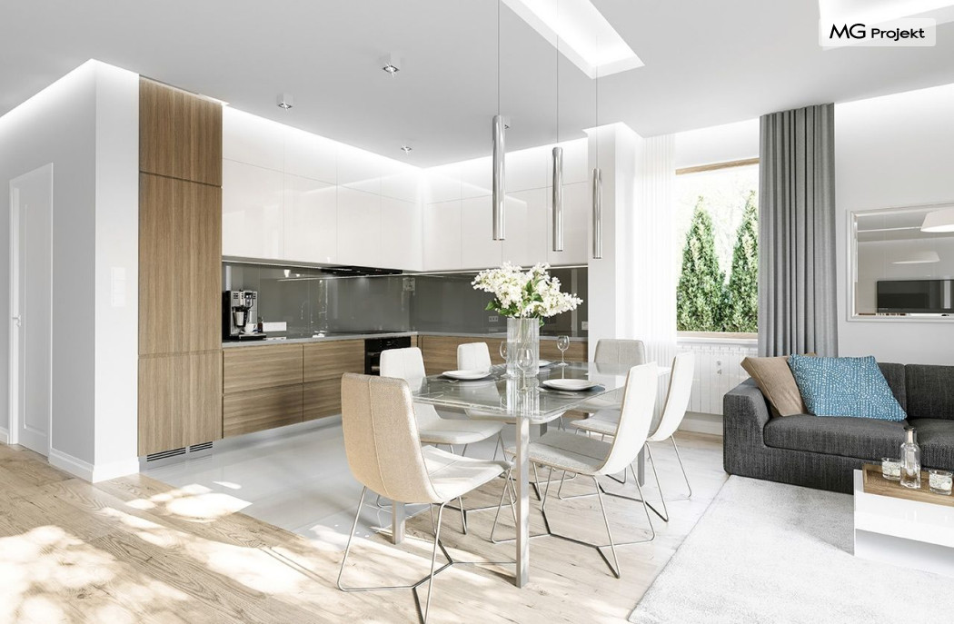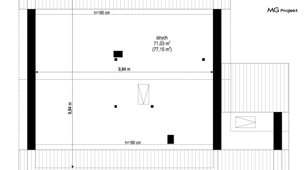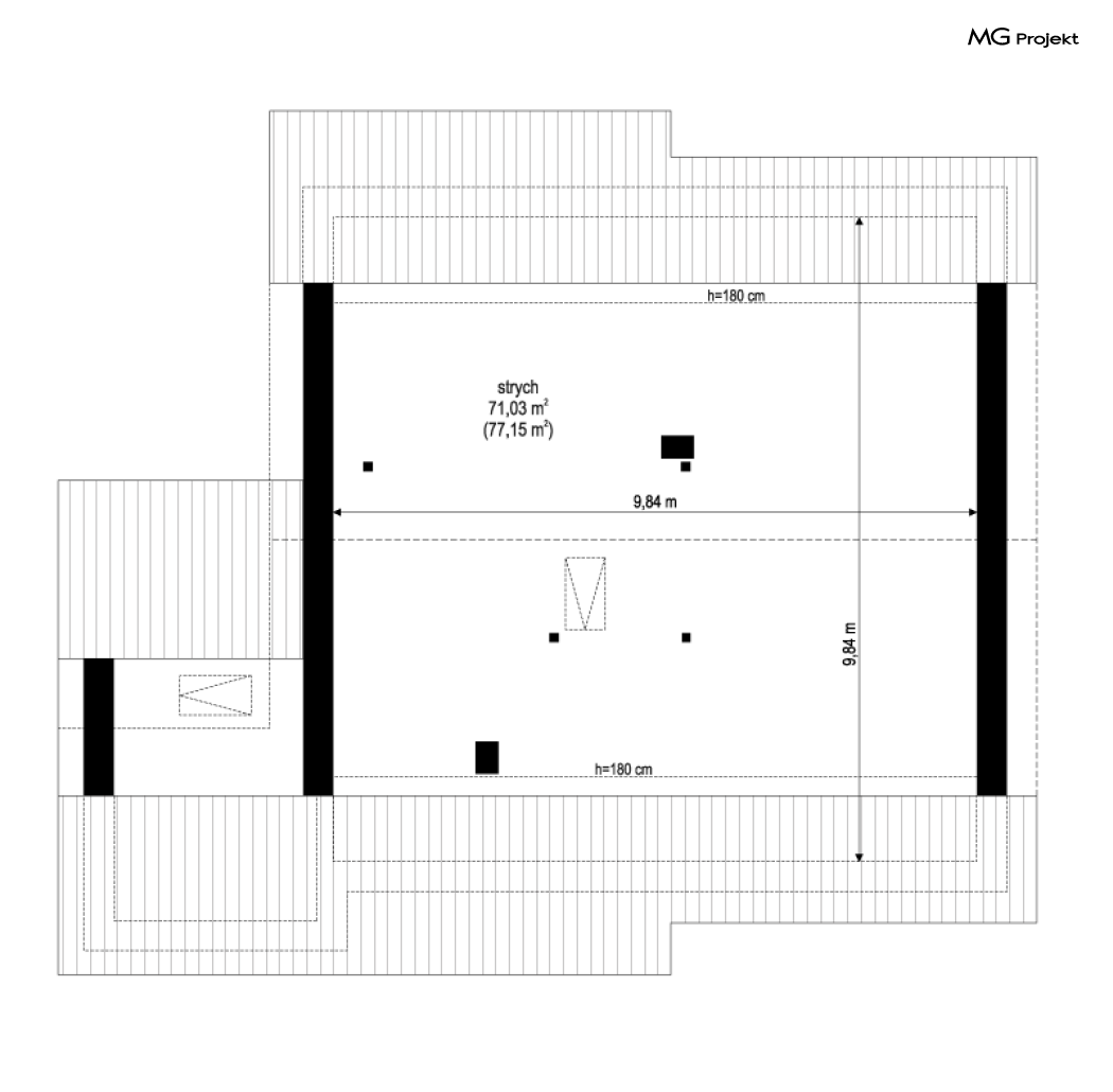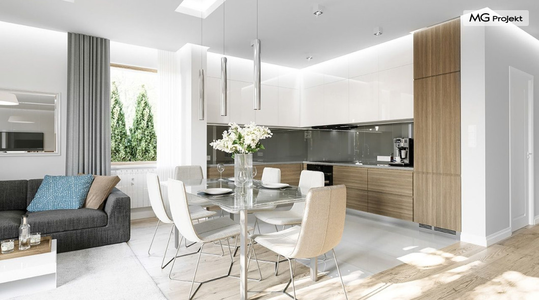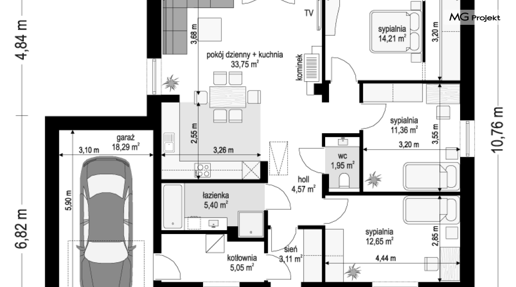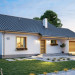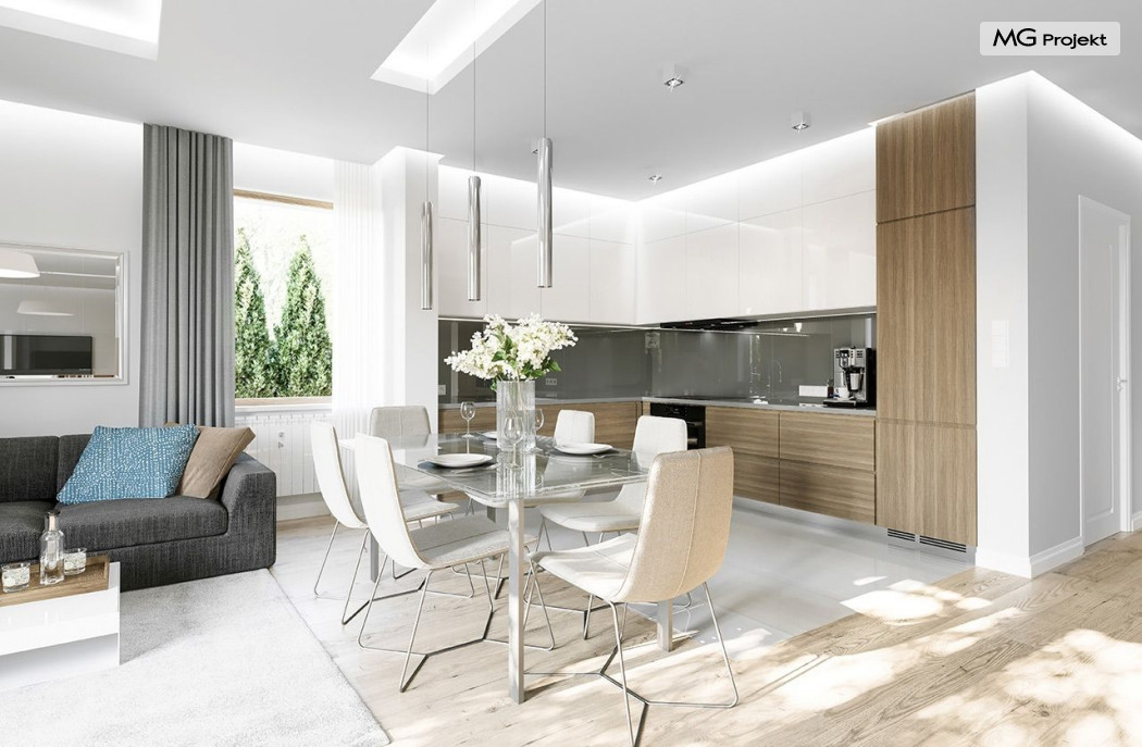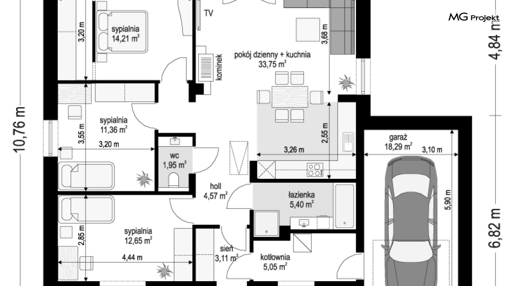 Projekt domu Zosia 8 – czyli kolejny projekt z serii „Zosia” – wersja powiększona w stosunku do bazowego projektu, zbudowaną na kwadratowym planie o wymiarach 10,7 x 10,7 m, z dodatkowym garażem. Dom ma prostą bryłę i konstrukcję, i spokojną bezpretensjonalną architekturę. Budynek dzięki swojej prostocie jest łatwy w budowie, a przez to niedrogi. Jednocześnie projekt domu Zosia 8 spełnia wymagania komfortowego mieszkania dla czteroosobowej rodziny. Dom wieńczy dwuspadowy dach o kącie 30 stopni. Nad parterem przewidziano strop drewniany belkowy i krokwiową więźbę dachową, co tworzy dużą przestrzeń strychową, na którą dostajemy się schodkami drabinkowymi. Do domu wchodzimy przez przedsionek z dużą szafą do holu i salonu. Z boku przy wejściu przechodzimy do kotłowni i dalej do garażu. Kotłownia została przewidziana w projekcie jako gazowa, ale łatwo można ją przerobić na kotłownię na paliwo stałe.Dalej mamy łazienkę, a następnie przestrzeń dzienną z salonem i aneksem kuchennym - o łącznej powierzchni około 35 m2. Z lewej strony mamy trzy sypialnie, w tym sypialnię rodziców z garderobą Z salonu wydostajemy się do ogrodu i na taras. Strych nad parterem można przeprojektować na poddasze użytkowe, dodając schody na górę. Dom jest bardzo funkcjonalny i ma rozbudowany program pomieszczeń. Nie ma tutaj zmarnowanej przestrzeni - wszystko jest praktycznie wykorzystane. Dom ma bezpretensjonalną i przyjemną dla oka stylistykę. Zdecydowaną zaletą domków z serii „Zosia” jest ich prostota i funkcjonalność, przekładające się na maksymalny efekt inwestycji uzyskany za niewielkie pieniądze. Każdą kolejną wersję domu z tej serii staramy się projektować jeszcze lepiej i sensowniej. Dom Zosia 8 jest zaprojektowany jako energooszczędny, bardzo dobrze ocieplony. Będzie dzięki temu tani w późniejszej eksploatacji. Zachęcamy do zapoznania się z pełną ofertą pracowni MG Projekt tej serii: projekt domu Zosia, projekt domu Zosia 2, projekt domu Zosia 3, projekt domu Zosia 4, projekt domu Zosia 5, projekt domu Zosia 6, projekt domu Zosia 7, projekt domu Zosia 7B. Zapraszamy!