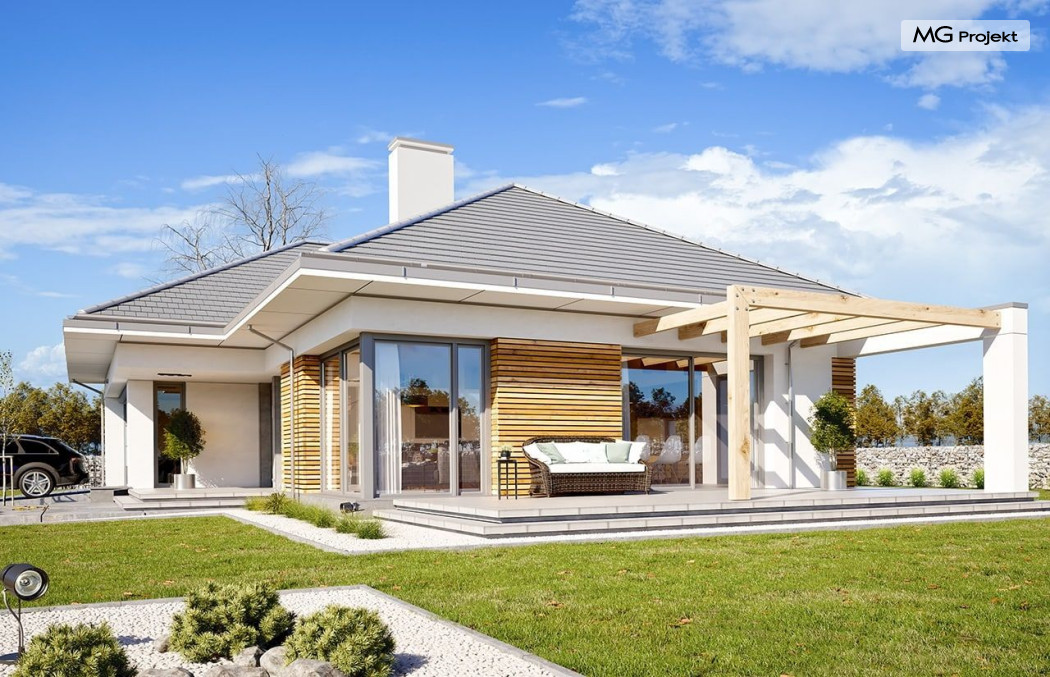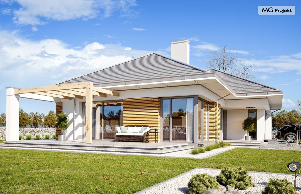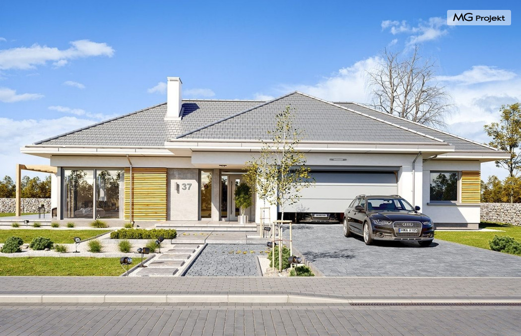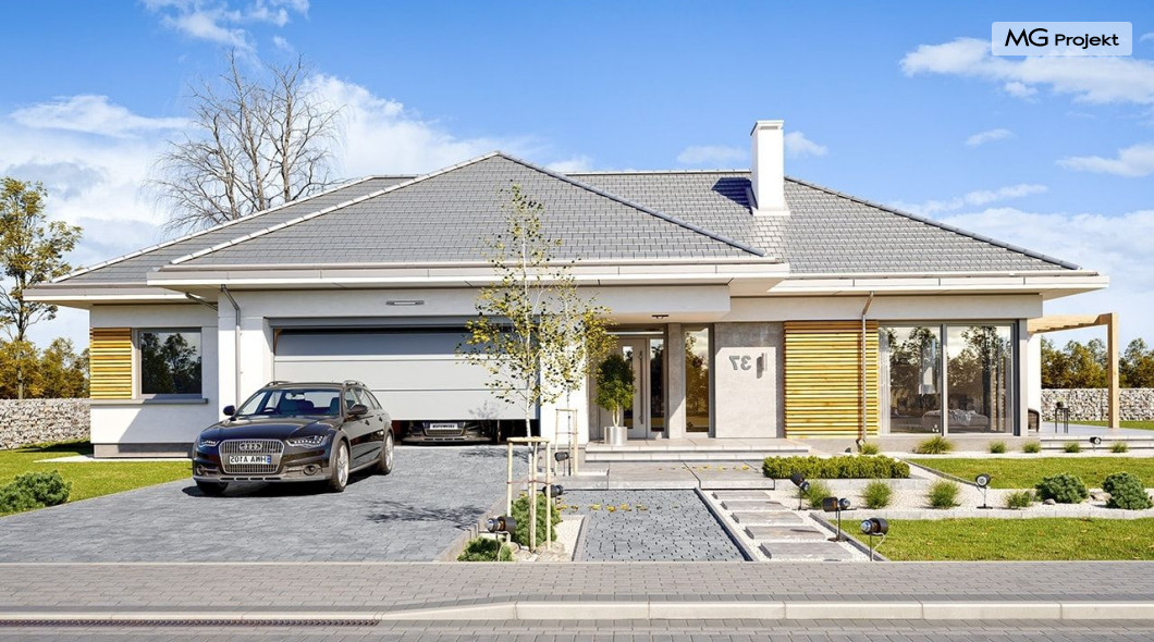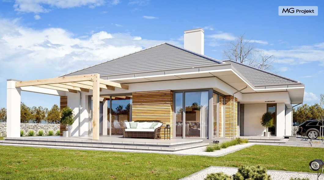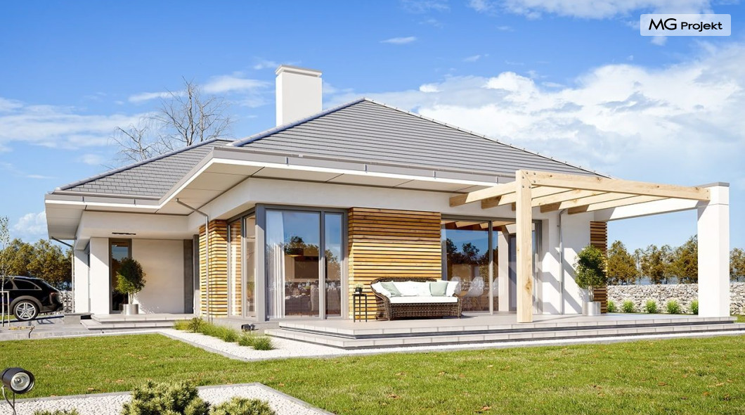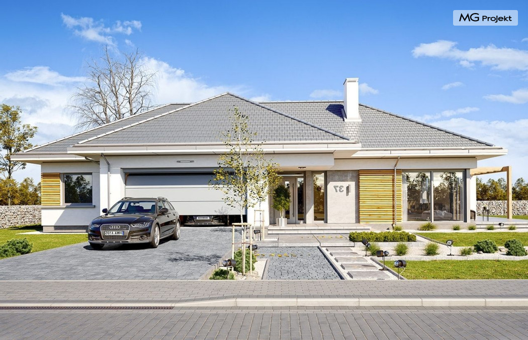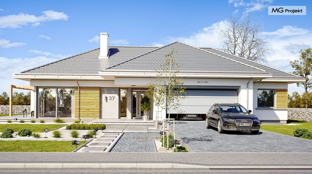 Projekt domu Wymarzony 3 jest kolejnym projektem z serii domów „Wymarzonych” - budynek parterowy, zbudowany na planie prostokąta, z wystającą na froncie częścią garażową przykryty wielospadowym dachem o kącie nachylenia 30 stopni. Projekt domu Wymarzony 3 z trochę bardziej finezyjną bryłą w stosunku do bazowej wersji, z ciekawymi detalami i rozwiązaniami architektonicznymi, tworzącymi nietuzinkowy i oryginalny efekt. Nowoczesną stylistykę projektu, uzyskano przez odpowiedni dobór materiałów, okładzin, zastosowanie dużych przeszkleń, otwierających wnętrze na otaczający ogród. Głównymi elementami nadającymi charakter bryle są : wystający przed ścianę frontową garaż z narożnym zadaszeniem nad podcieniem wejściowym, pięknie zaakcentowane drzwi wejściowe z naświetlami, oraz część tarasowa przedłużająca salon. Dzięki lokalizacji tarasów z boku budynku dom nadaje się doskonale nawet na działkę z wjazdem od południa. Salon w „Wymarzonym 3” jest oświetlony z trzech stron, zatem budynek można lokalizować na działce z ogródkiem z boku albo z tyłu, a nawet od frontu domu, w narożniku działki. Wnętrze : Oryginalna lokalizacja garażu, w centralnej części bryły, daje łatwy dostęp między garażem, przedsionkiem i kotłownią, co jest rzadko spotykane w domach parterowych o prostokątnym kształcie. Tutaj garaż jest w idealnym miejscu - przy wejściu, blisko holu i kuchni. Kotłownia obok salonu i kominka sprawia, że mamy jeden wspólny komin w całym budynku. Z przedsionka wchodzimy do holu i części dziennej połączonych pomieszczeń salonu jadalni i kuchni. Kuchnia jest oddzielona od jadalni półwyspem z barkiem. Z kuchni mamy dostęp do spiżarni, pralni i wyjścia gospodarczego na tył domu. Salon doświetlony jest z każdej strony, a przez piękne przesuwne drzwi w elewacji bocznej wychodzimy na taras częściowo przykryty pergolą. Z drugiej strony domu mamy trzy sypialnie, łazienkę i garderobę. Nad parterem zaprojektowano strop i krokwiową więźbę dachową, dzięki czemu do dyspozycji jest dodatkowy duży strych - magazyn, do dowolnej aranżacji. Na strych dostajemy się schodkami drabinkowymi z holu. Konstrukcję dachu można przeprojektować też na wiązary kratownicowe i wyłączyć tą przestrzeń z jakiegokolwiek użytkowania. Projekt domu Wymarzony 3 to komfortowa, wygodna mini-willa dla czteroosobowej rodziny - funkcjonalna, praktyczna, bez biegania po schodach. Budynek jest energooszczędny, ma prostą konstrukcję, będzie łatwy w budowie i tani w utrzymaniu. Zapraszamy do zapoznania się z pełną ofertą pracowni MG Projekt tej serii: Wymarzony, Wymarzony 2, Wymarzony 4, Wymarzony 5, Wymarzony 6, Wymarzony 7, Wymarzony 8, Wymarzony 9, Wymarzony 10, Wymarzony 11.