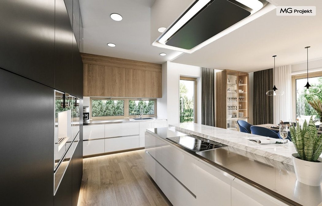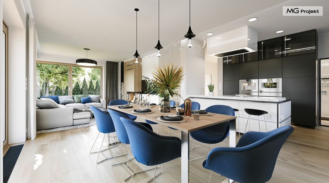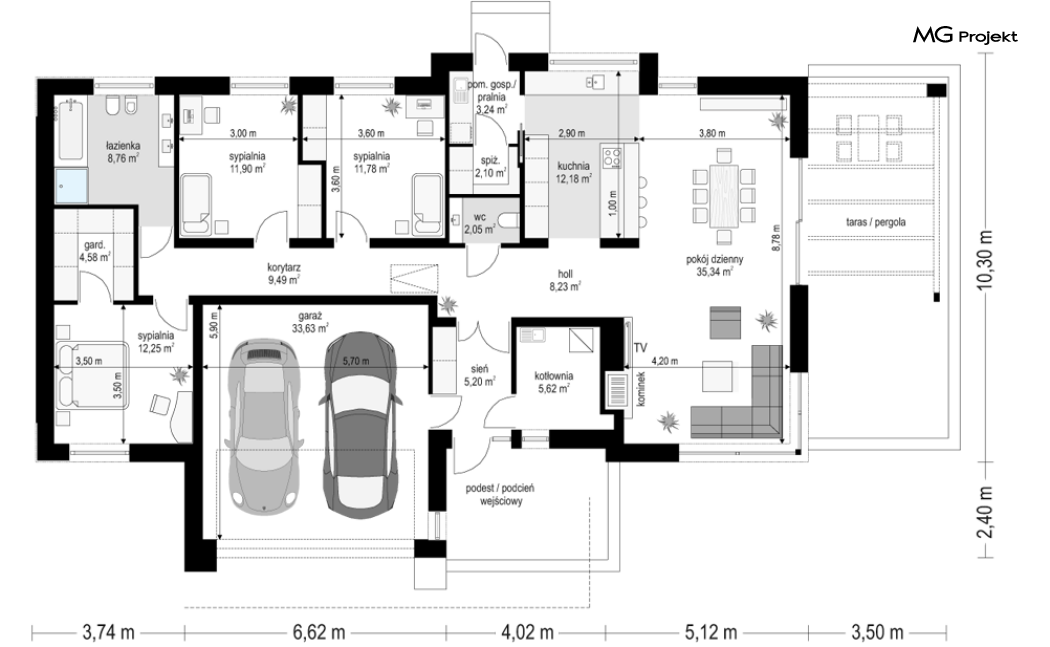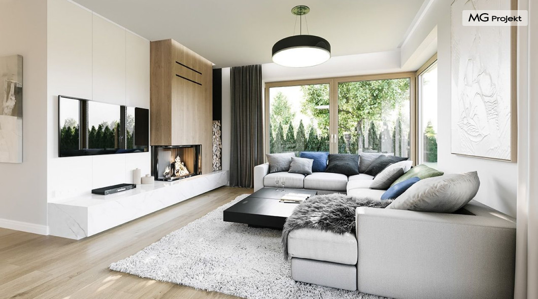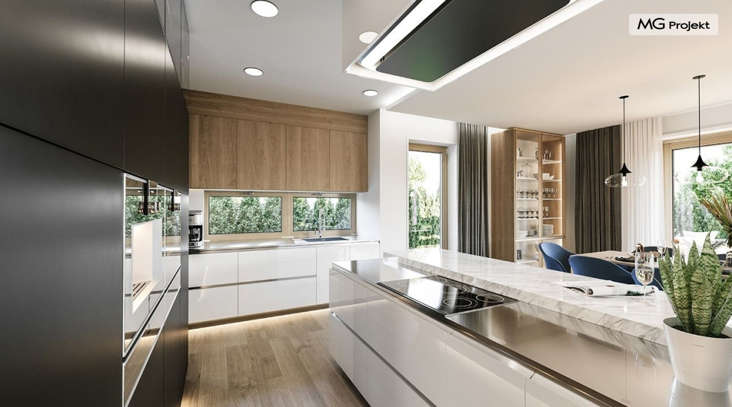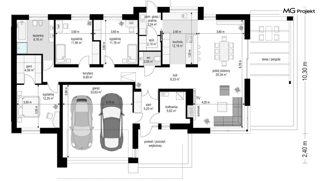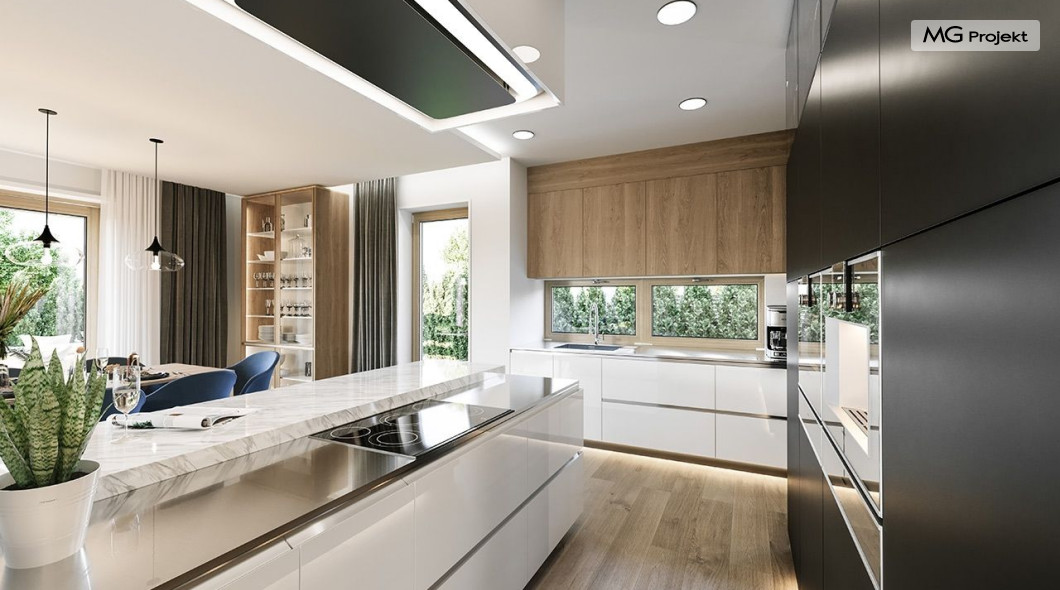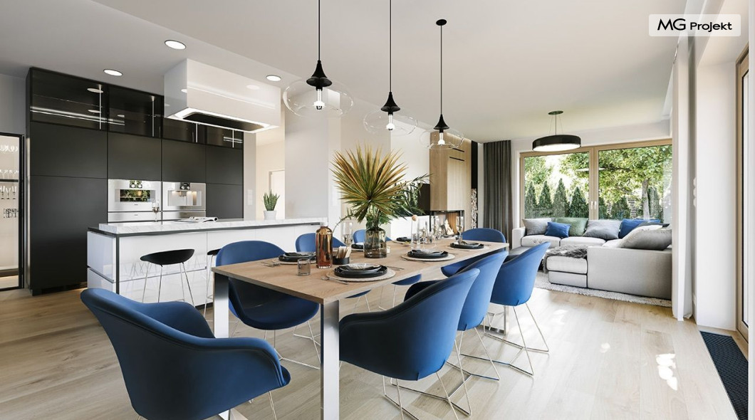 Projekt domu Wymarzony 3 jest kolejnym projektem z serii domów „Wymarzonych” - budynek parterowy, zbudowany na planie prostokąta, z wystającą na froncie częścią garażową przykryty wielospadowym dachem o kącie nachylenia 30 stopni. Projekt domu Wymarzony 3 z trochę bardziej finezyjną bryłą w stosunku do bazowej wersji, z ciekawymi detalami i rozwiązaniami architektonicznymi, tworzącymi nietuzinkowy i oryginalny efekt. Nowoczesną stylistykę projektu, uzyskano przez odpowiedni dobór materiałów, okładzin, zastosowanie dużych przeszkleń, otwierających wnętrze na otaczający ogród. Głównymi elementami nadającymi charakter bryle są : wystający przed ścianę frontową garaż z narożnym zadaszeniem nad podcieniem wejściowym, pięknie zaakcentowane drzwi wejściowe z naświetlami, oraz część tarasowa przedłużająca salon. Dzięki lokalizacji tarasów z boku budynku dom nadaje się doskonale nawet na działkę z wjazdem od południa. Salon w „Wymarzonym 3” jest oświetlony z trzech stron, zatem budynek można lokalizować na działce z ogródkiem z boku albo z tyłu, a nawet od frontu domu, w narożniku działki. Wnętrze : Oryginalna lokalizacja garażu, w centralnej części bryły, daje łatwy dostęp między garażem, przedsionkiem i kotłownią, co jest rzadko spotykane w domach parterowych o prostokątnym kształcie. Tutaj garaż jest w idealnym miejscu - przy wejściu, blisko holu i kuchni. Kotłownia obok salonu i kominka sprawia, że mamy jeden wspólny komin w całym budynku. Z przedsionka wchodzimy do holu i części dziennej połączonych pomieszczeń salonu jadalni i kuchni. Kuchnia jest oddzielona od jadalni półwyspem z barkiem. Z kuchni mamy dostęp do spiżarni, pralni i wyjścia gospodarczego na tył domu. Salon doświetlony jest z każdej strony, a przez piękne przesuwne drzwi w elewacji bocznej wychodzimy na taras częściowo przykryty pergolą. Z drugiej strony domu mamy trzy sypialnie, łazienkę i garderobę. Nad parterem zaprojektowano strop i krokwiową więźbę dachową, dzięki czemu do dyspozycji jest dodatkowy duży strych - magazyn, do dowolnej aranżacji. Na strych dostajemy się schodkami drabinkowymi z holu. Konstrukcję dachu można przeprojektować też na wiązary kratownicowe i wyłączyć tą przestrzeń z jakiegokolwiek użytkowania. Projekt domu Wymarzony 3 to komfortowa, wygodna mini-willa dla czteroosobowej rodziny - funkcjonalna, praktyczna, bez biegania po schodach. Budynek jest energooszczędny, ma prostą konstrukcję, będzie łatwy w budowie i tani w utrzymaniu. Zapraszamy do zapoznania się z pełną ofertą pracowni MG Projekt tej serii: Wymarzony, Wymarzony 2, Wymarzony 4, Wymarzony 5, Wymarzony 6, Wymarzony 7, Wymarzony 8, Wymarzony 9, Wymarzony 10, Wymarzony 11.