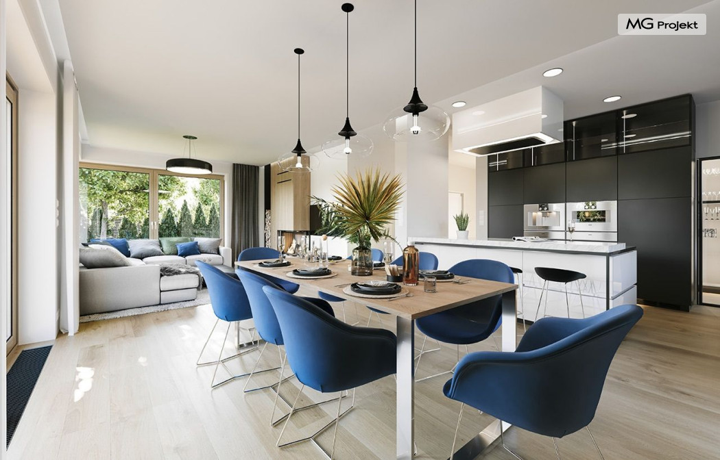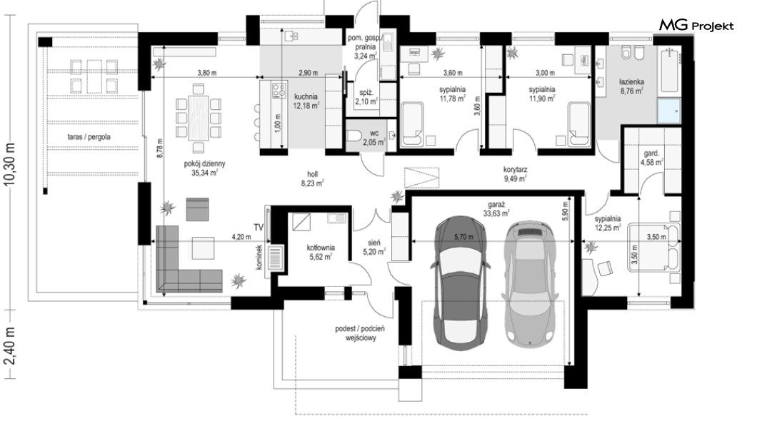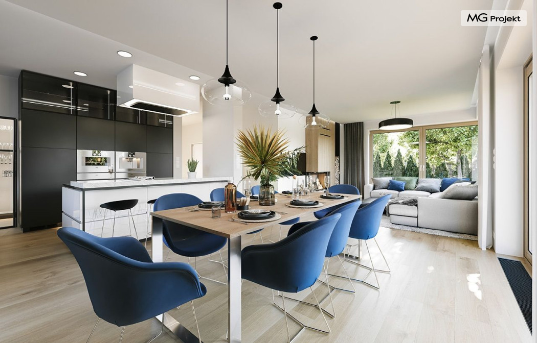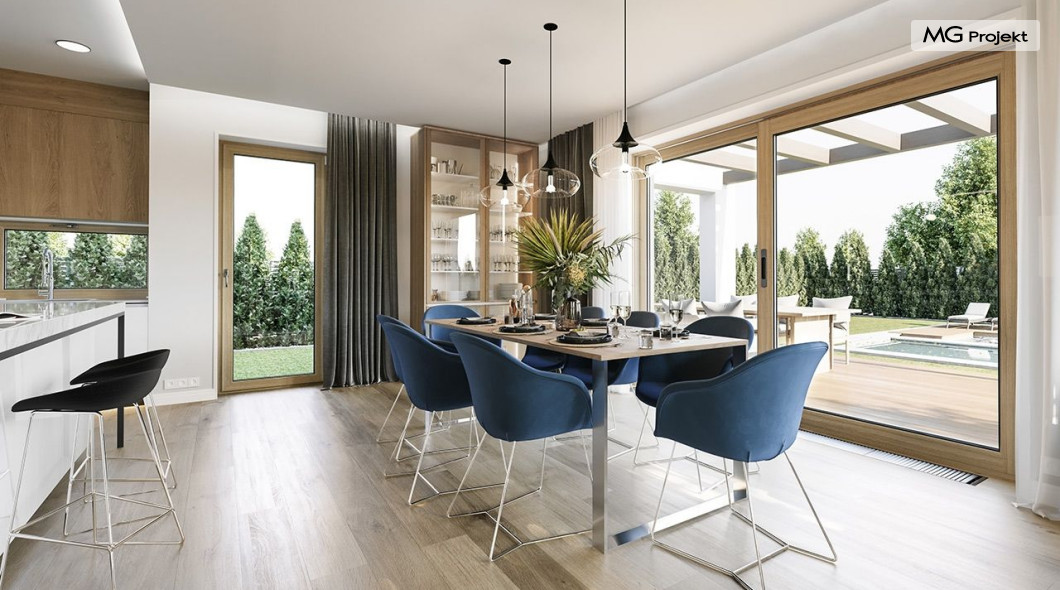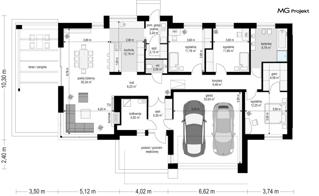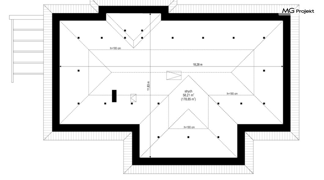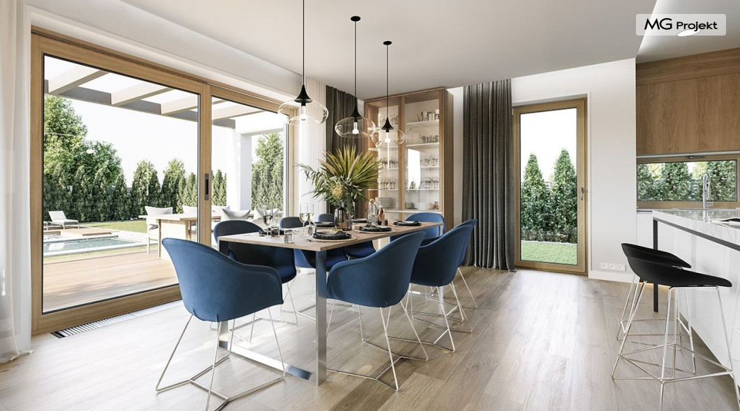 Projekt domu Wymarzony 3 jest kolejnym projektem z serii domów „Wymarzonych” - budynek parterowy, zbudowany na planie prostokąta, z wystającą na froncie częścią garażową przykryty wielospadowym dachem o kącie nachylenia 30 stopni. Projekt domu Wymarzony 3 z trochę bardziej finezyjną bryłą w stosunku do bazowej wersji, z ciekawymi detalami i rozwiązaniami architektonicznymi, tworzącymi nietuzinkowy i oryginalny efekt. Nowoczesną stylistykę projektu, uzyskano przez odpowiedni dobór materiałów, okładzin, zastosowanie dużych przeszkleń, otwierających wnętrze na otaczający ogród. Głównymi elementami nadającymi charakter bryle są : wystający przed ścianę frontową garaż z narożnym zadaszeniem nad podcieniem wejściowym, pięknie zaakcentowane drzwi wejściowe z naświetlami, oraz część tarasowa przedłużająca salon. Dzięki lokalizacji tarasów z boku budynku dom nadaje się doskonale nawet na działkę z wjazdem od południa. Salon w „Wymarzonym 3” jest oświetlony z trzech stron, zatem budynek można lokalizować na działce z ogródkiem z boku albo z tyłu, a nawet od frontu domu, w narożniku działki. Wnętrze : Oryginalna lokalizacja garażu, w centralnej części bryły, daje łatwy dostęp między garażem, przedsionkiem i kotłownią, co jest rzadko spotykane w domach parterowych o prostokątnym kształcie. Tutaj garaż jest w idealnym miejscu - przy wejściu, blisko holu i kuchni. Kotłownia obok salonu i kominka sprawia, że mamy jeden wspólny komin w całym budynku. Z przedsionka wchodzimy do holu i części dziennej połączonych pomieszczeń salonu jadalni i kuchni. Kuchnia jest oddzielona od jadalni półwyspem z barkiem. Z kuchni mamy dostęp do spiżarni, pralni i wyjścia gospodarczego na tył domu. Salon doświetlony jest z każdej strony, a przez piękne przesuwne drzwi w elewacji bocznej wychodzimy na taras częściowo przykryty pergolą. Z drugiej strony domu mamy trzy sypialnie, łazienkę i garderobę. Nad parterem zaprojektowano strop i krokwiową więźbę dachową, dzięki czemu do dyspozycji jest dodatkowy duży strych - magazyn, do dowolnej aranżacji. Na strych dostajemy się schodkami drabinkowymi z holu. Konstrukcję dachu można przeprojektować też na wiązary kratownicowe i wyłączyć tą przestrzeń z jakiegokolwiek użytkowania. Projekt domu Wymarzony 3 to komfortowa, wygodna mini-willa dla czteroosobowej rodziny - funkcjonalna, praktyczna, bez biegania po schodach. Budynek jest energooszczędny, ma prostą konstrukcję, będzie łatwy w budowie i tani w utrzymaniu. Zapraszamy do zapoznania się z pełną ofertą pracowni MG Projekt tej serii: Wymarzony, Wymarzony 2, Wymarzony 4, Wymarzony 5, Wymarzony 6, Wymarzony 7, Wymarzony 8, Wymarzony 9, Wymarzony 10, Wymarzony 11.