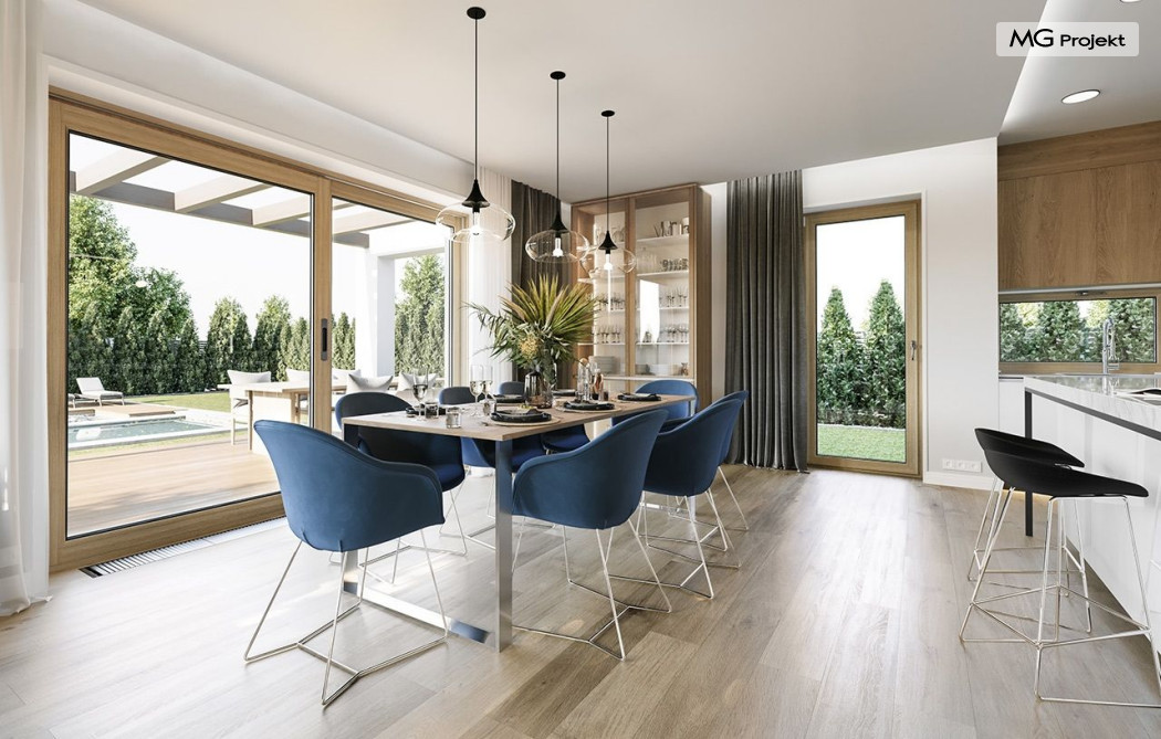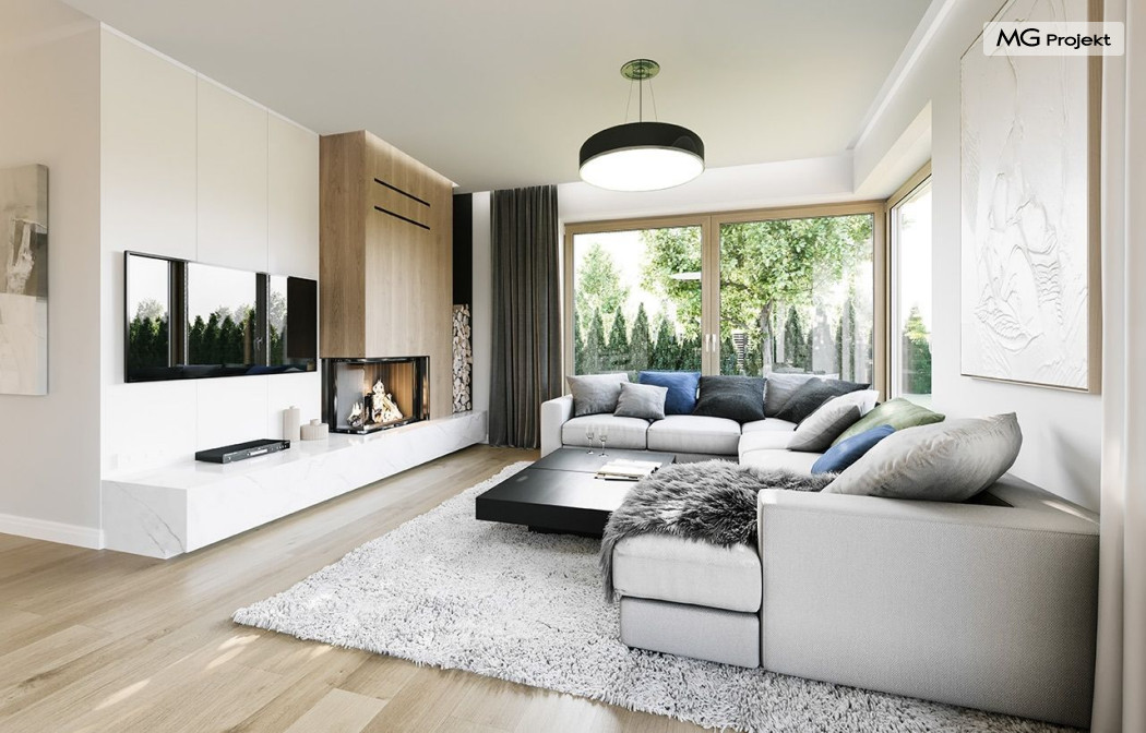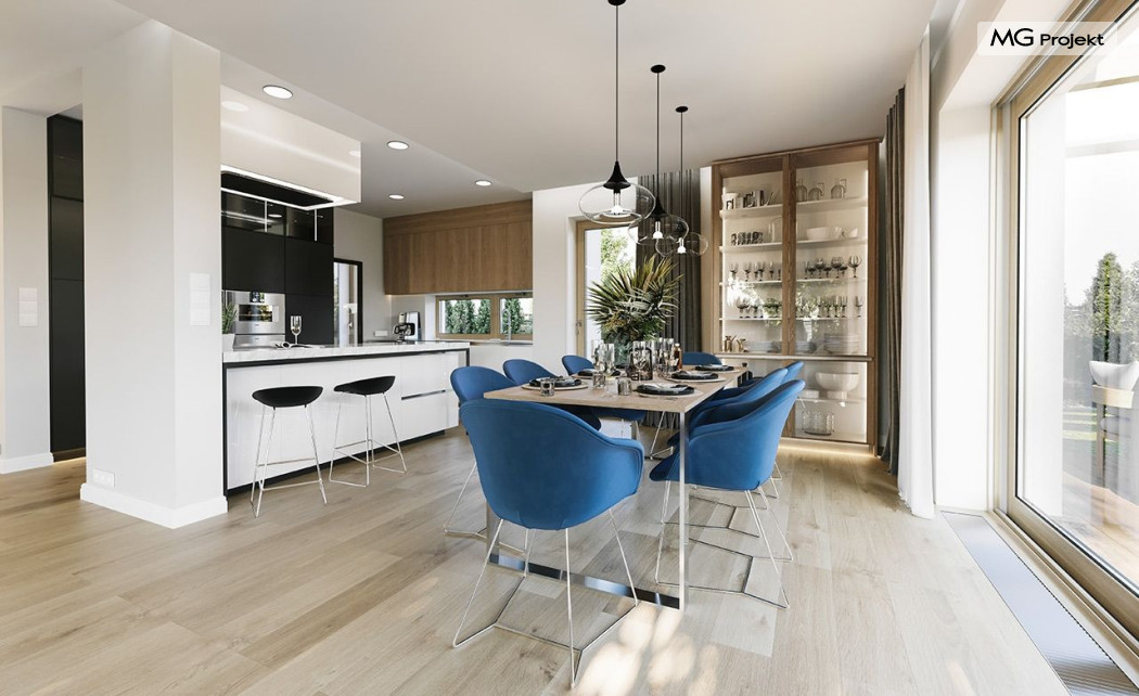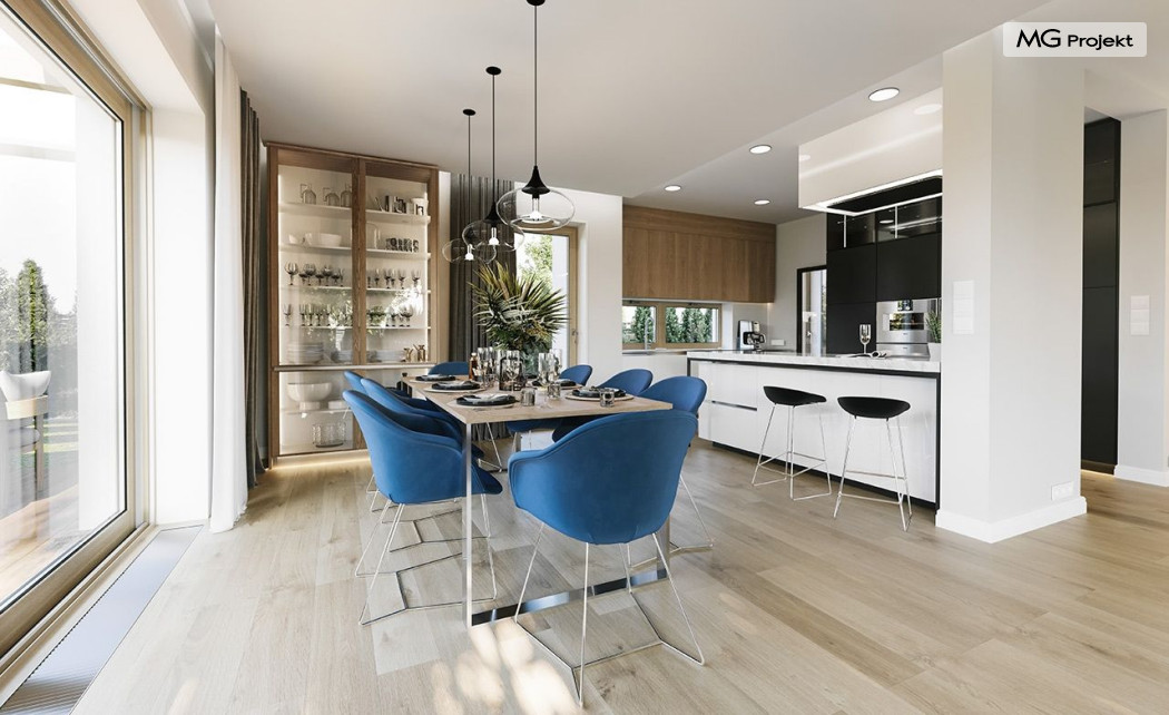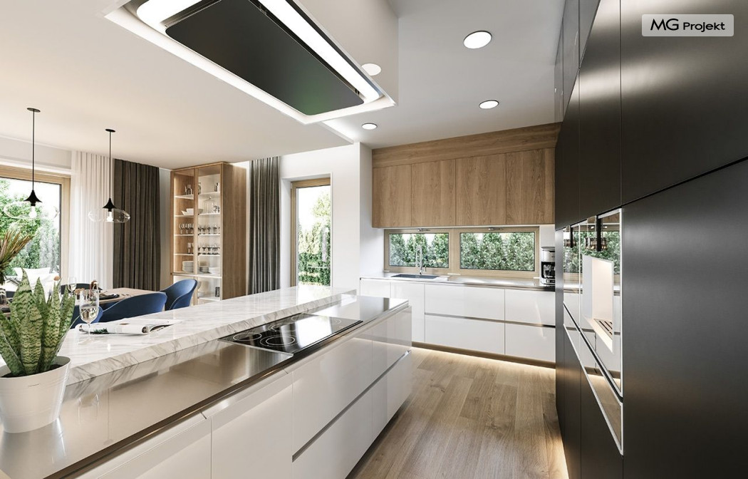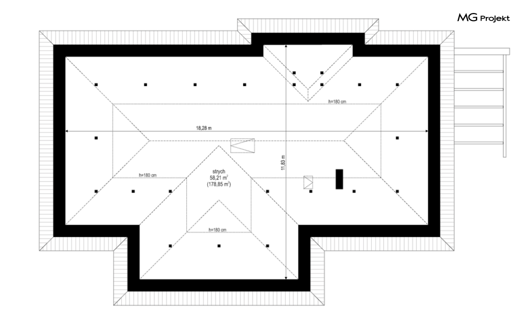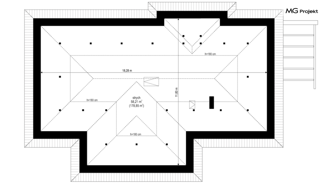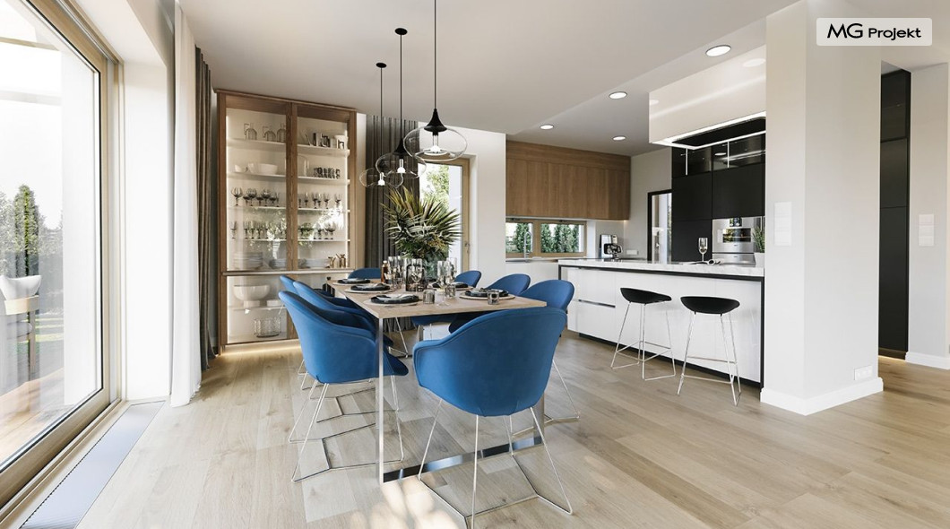 Projekt domu Wymarzony 3 jest kolejnym projektem z serii domów „Wymarzonych” - budynek parterowy, zbudowany na planie prostokąta, z wystającą na froncie częścią garażową przykryty wielospadowym dachem o kącie nachylenia 30 stopni. Projekt domu Wymarzony 3 z trochę bardziej finezyjną bryłą w stosunku do bazowej wersji, z ciekawymi detalami i rozwiązaniami architektonicznymi, tworzącymi nietuzinkowy i oryginalny efekt. Nowoczesną stylistykę projektu, uzyskano przez odpowiedni dobór materiałów, okładzin, zastosowanie dużych przeszkleń, otwierających wnętrze na otaczający ogród. Głównymi elementami nadającymi charakter bryle są : wystający przed ścianę frontową garaż z narożnym zadaszeniem nad podcieniem wejściowym, pięknie zaakcentowane drzwi wejściowe z naświetlami, oraz część tarasowa przedłużająca salon. Dzięki lokalizacji tarasów z boku budynku dom nadaje się doskonale nawet na działkę z wjazdem od południa. Salon w „Wymarzonym 3” jest oświetlony z trzech stron, zatem budynek można lokalizować na działce z ogródkiem z boku albo z tyłu, a nawet od frontu domu, w narożniku działki. Wnętrze : Oryginalna lokalizacja garażu, w centralnej części bryły, daje łatwy dostęp między garażem, przedsionkiem i kotłownią, co jest rzadko spotykane w domach parterowych o prostokątnym kształcie. Tutaj garaż jest w idealnym miejscu - przy wejściu, blisko holu i kuchni. Kotłownia obok salonu i kominka sprawia, że mamy jeden wspólny komin w całym budynku. Z przedsionka wchodzimy do holu i części dziennej połączonych pomieszczeń salonu jadalni i kuchni. Kuchnia jest oddzielona od jadalni półwyspem z barkiem. Z kuchni mamy dostęp do spiżarni, pralni i wyjścia gospodarczego na tył domu. Salon doświetlony jest z każdej strony, a przez piękne przesuwne drzwi w elewacji bocznej wychodzimy na taras częściowo przykryty pergolą. Z drugiej strony domu mamy trzy sypialnie, łazienkę i garderobę. Nad parterem zaprojektowano strop i krokwiową więźbę dachową, dzięki czemu do dyspozycji jest dodatkowy duży strych - magazyn, do dowolnej aranżacji. Na strych dostajemy się schodkami drabinkowymi z holu. Konstrukcję dachu można przeprojektować też na wiązary kratownicowe i wyłączyć tą przestrzeń z jakiegokolwiek użytkowania. Projekt domu Wymarzony 3 to komfortowa, wygodna mini-willa dla czteroosobowej rodziny - funkcjonalna, praktyczna, bez biegania po schodach. Budynek jest energooszczędny, ma prostą konstrukcję, będzie łatwy w budowie i tani w utrzymaniu. Zapraszamy do zapoznania się z pełną ofertą pracowni MG Projekt tej serii: Wymarzony, Wymarzony 2, Wymarzony 4, Wymarzony 5, Wymarzony 6, Wymarzony 7, Wymarzony 8, Wymarzony 9, Wymarzony 10, Wymarzony 11.