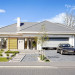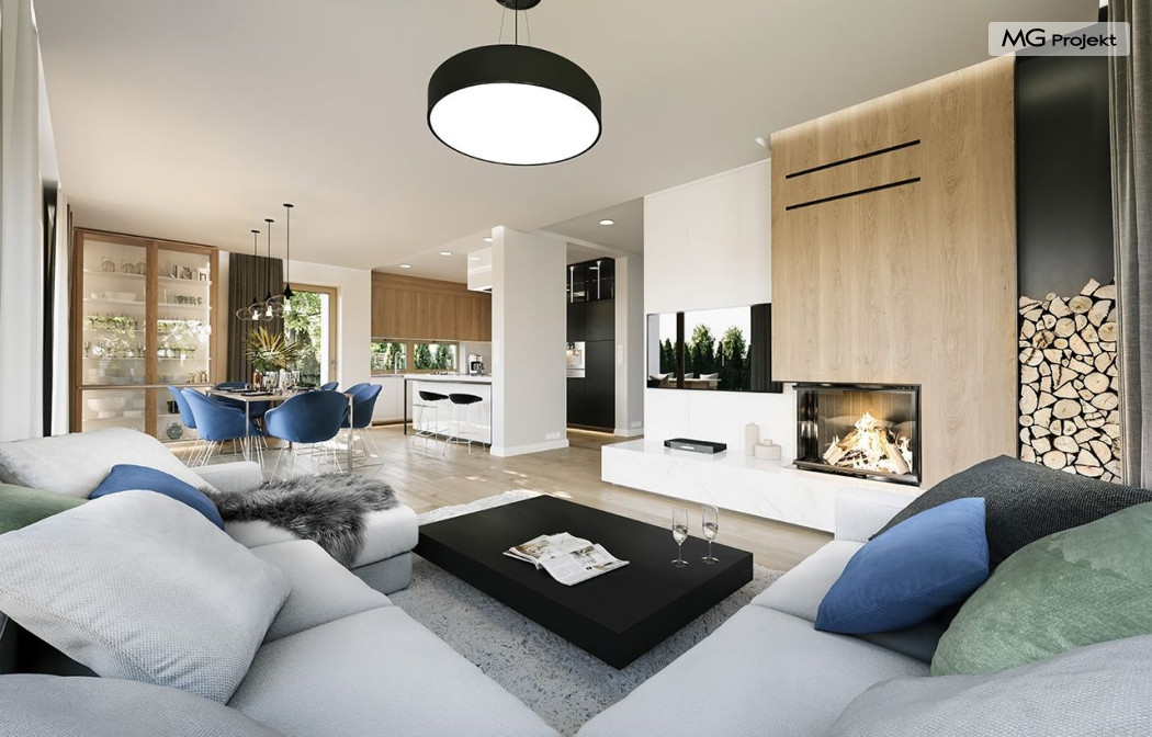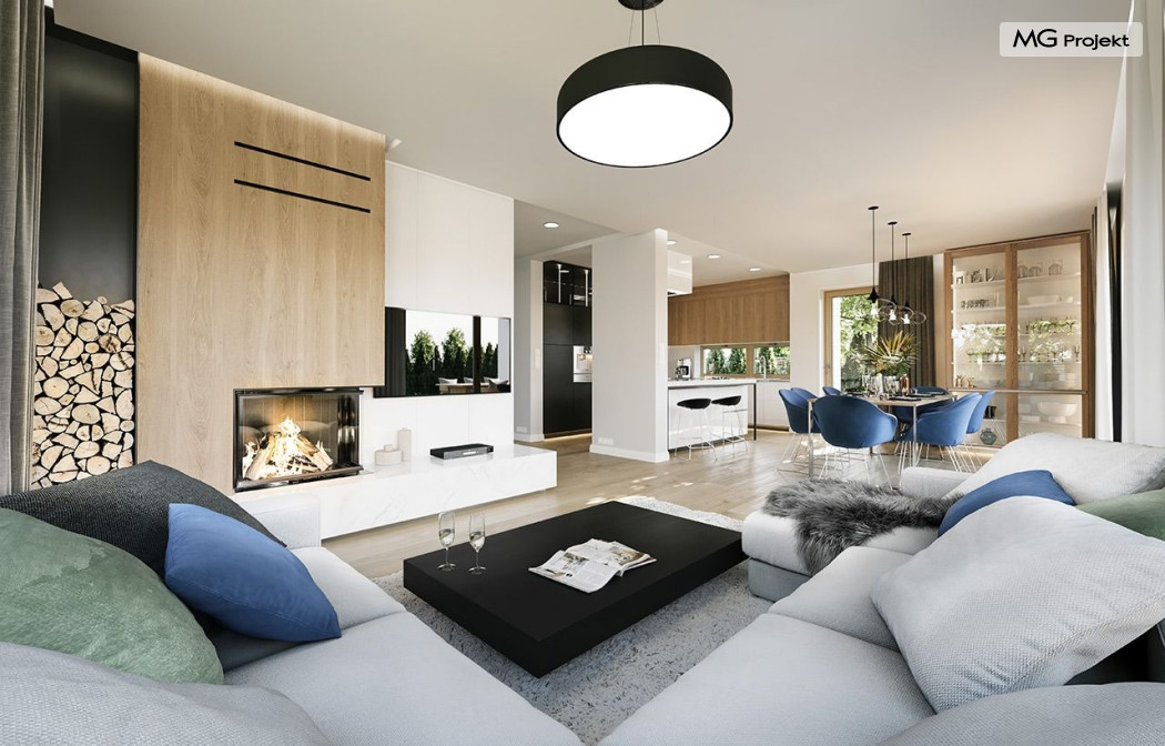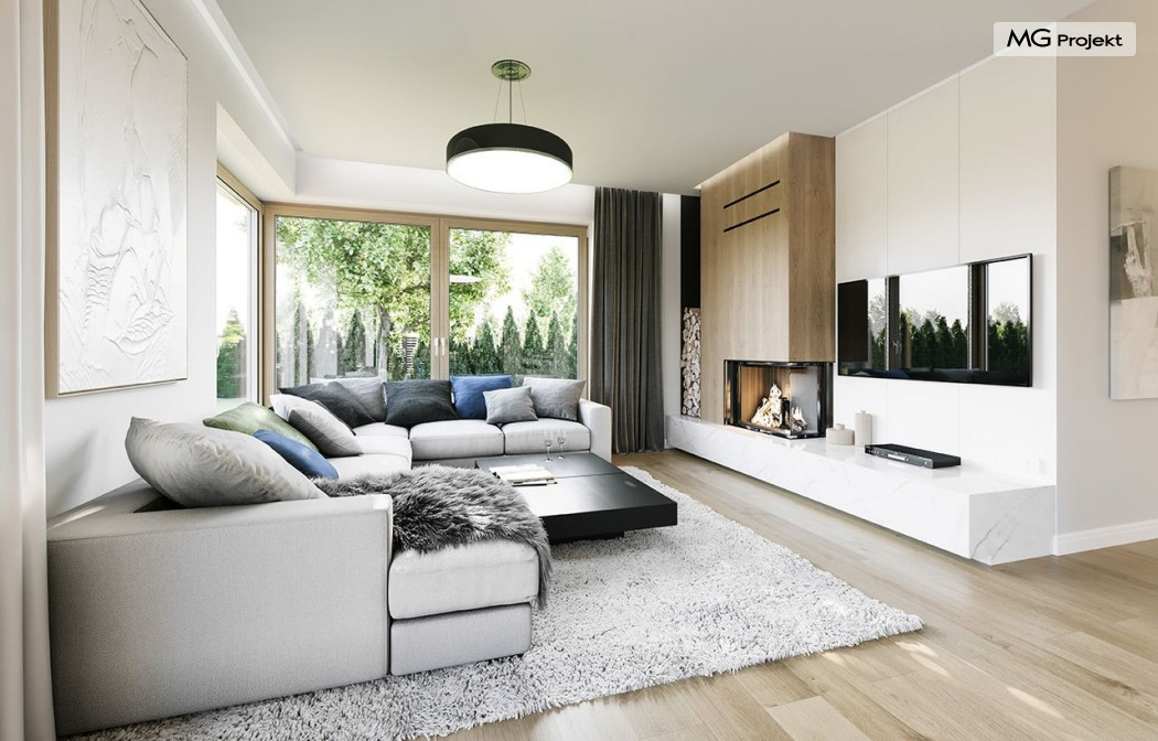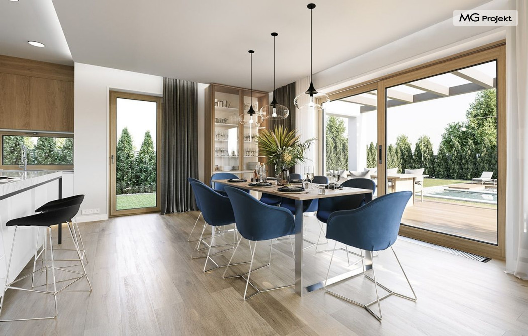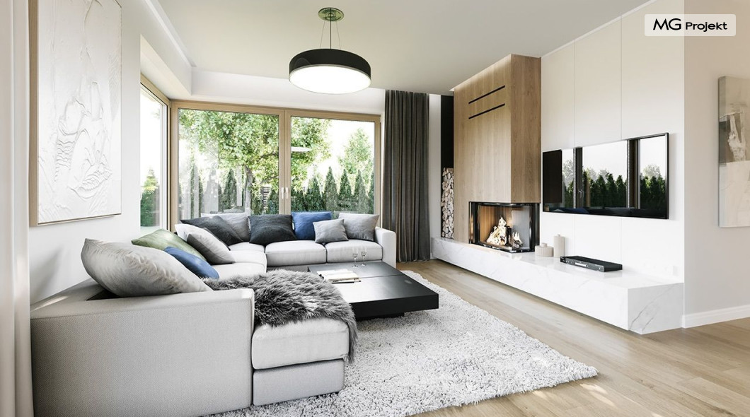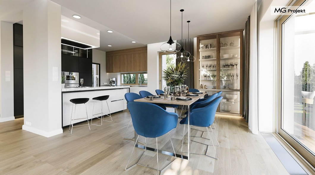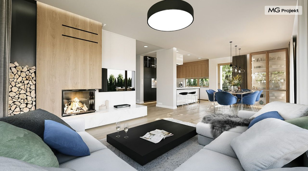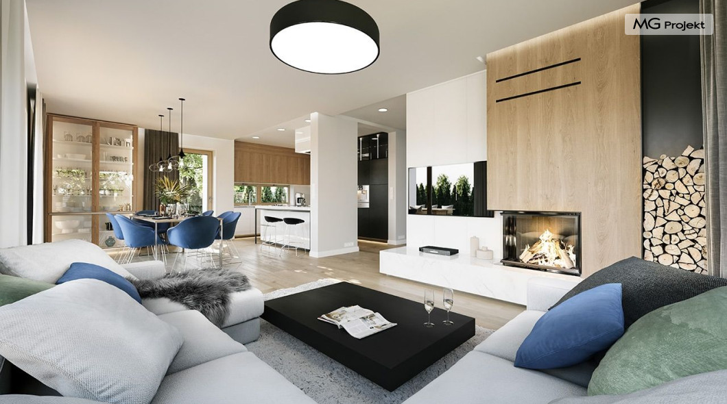 Projekt domu Wymarzony 3 jest kolejnym projektem z serii domów „Wymarzonych” - budynek parterowy, zbudowany na planie prostokąta, z wystającą na froncie częścią garażową przykryty wielospadowym dachem o kącie nachylenia 30 stopni. Projekt domu Wymarzony 3 z trochę bardziej finezyjną bryłą w stosunku do bazowej wersji, z ciekawymi detalami i rozwiązaniami architektonicznymi, tworzącymi nietuzinkowy i oryginalny efekt. Nowoczesną stylistykę projektu, uzyskano przez odpowiedni dobór materiałów, okładzin, zastosowanie dużych przeszkleń, otwierających wnętrze na otaczający ogród. Głównymi elementami nadającymi charakter bryle są : wystający przed ścianę frontową garaż z narożnym zadaszeniem nad podcieniem wejściowym, pięknie zaakcentowane drzwi wejściowe z naświetlami, oraz część tarasowa przedłużająca salon. Dzięki lokalizacji tarasów z boku budynku dom nadaje się doskonale nawet na działkę z wjazdem od południa. Salon w „Wymarzonym 3” jest oświetlony z trzech stron, zatem budynek można lokalizować na działce z ogródkiem z boku albo z tyłu, a nawet od frontu domu, w narożniku działki. Wnętrze : Oryginalna lokalizacja garażu, w centralnej części bryły, daje łatwy dostęp między garażem, przedsionkiem i kotłownią, co jest rzadko spotykane w domach parterowych o prostokątnym kształcie. Tutaj garaż jest w idealnym miejscu - przy wejściu, blisko holu i kuchni. Kotłownia obok salonu i kominka sprawia, że mamy jeden wspólny komin w całym budynku. Z przedsionka wchodzimy do holu i części dziennej połączonych pomieszczeń salonu jadalni i kuchni. Kuchnia jest oddzielona od jadalni półwyspem z barkiem. Z kuchni mamy dostęp do spiżarni, pralni i wyjścia gospodarczego na tył domu. Salon doświetlony jest z każdej strony, a przez piękne przesuwne drzwi w elewacji bocznej wychodzimy na taras częściowo przykryty pergolą. Z drugiej strony domu mamy trzy sypialnie, łazienkę i garderobę. Nad parterem zaprojektowano strop i krokwiową więźbę dachową, dzięki czemu do dyspozycji jest dodatkowy duży strych - magazyn, do dowolnej aranżacji. Na strych dostajemy się schodkami drabinkowymi z holu. Konstrukcję dachu można przeprojektować też na wiązary kratownicowe i wyłączyć tą przestrzeń z jakiegokolwiek użytkowania. Projekt domu Wymarzony 3 to komfortowa, wygodna mini-willa dla czteroosobowej rodziny - funkcjonalna, praktyczna, bez biegania po schodach. Budynek jest energooszczędny, ma prostą konstrukcję, będzie łatwy w budowie i tani w utrzymaniu. Zapraszamy do zapoznania się z pełną ofertą pracowni MG Projekt tej serii: Wymarzony, Wymarzony 2, Wymarzony 4, Wymarzony 5, Wymarzony 6, Wymarzony 7, Wymarzony 8, Wymarzony 9, Wymarzony 10, Wymarzony 11.