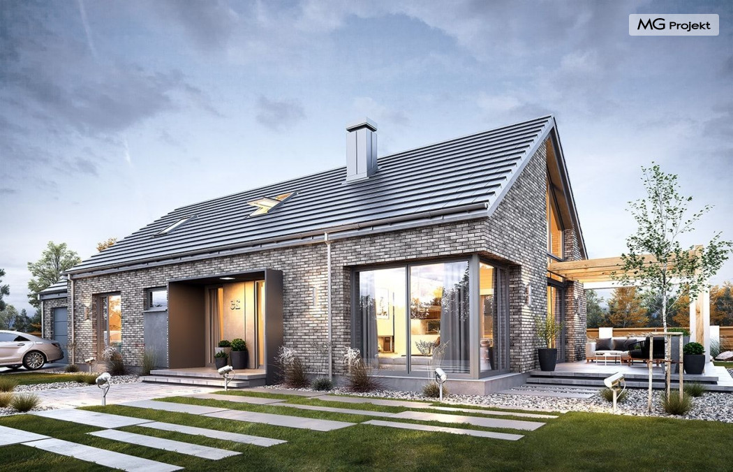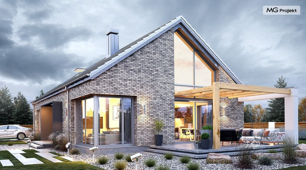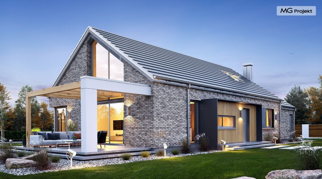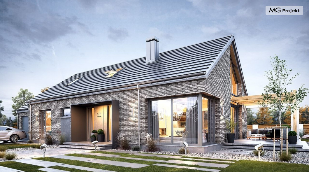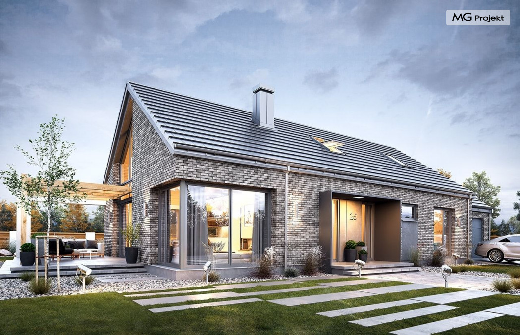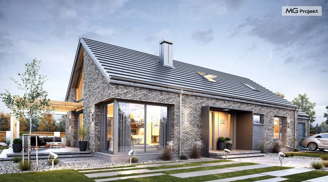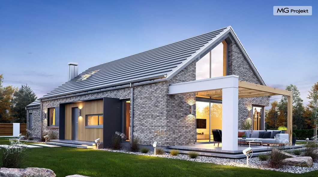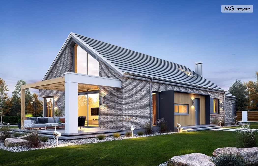 Projekt domu Wymarzony 9 to następny dom z serii projektów „Wymarzonych” z naszej pracowni. Budynek został zaprojektowany w modnej stylistyce domu-stodoły. Dom jest parterowy z poddaszem. Przykryty został dwuspadowym dachem o kącie nachylenia 35 stopni. Dach nie ma okapów, bryła jest maksymalnie prosta, nowoczesna, z dostawionymi od frontu i tyłu pudełkowymi zadaszeniami kryjącymi wejście i wykusz kuchni. W projekcie zastosowano ciekawe detale i materiały uatrakcyjniające wygląd zewnętrzny. Przede wszystkim charakter budynku tworzy okładzina klinkierowa na ścianach, połączona z szarymi wstawkami, szarą stolarką okienną i szaro – grafitową dachówką. Połączenie użytych materiałów i detali stworzyło udany efekt wizualny. Dom jest nowoczesny, prosty, a zarazem elegancji i reprezentacyjny. W projekcie domu Wymarzony 9 głównym detalem wyróżniającym elewację frontową jest część wejściowa, z podestem, ciekawym pudełkowym zadaszeniem i drzwiami wejściowymi z naświetlami. Od strony elewacji tylnej zabieg ten powtórzono w wykuszu kuchni. Niewątpliwie najciekawszy jest szczyt domu z oknem biegnącym przez całą wysokość elewacji, które doświetla salon z pustką i antresolą, otwierając wnętrze na taras z pergolą i ogród. Dom zaprojektowano w taki sposób, aby salon miał doświetlenie z trzech stron budynku, co pozwala lokalizować go na niekorzystnej działce - z wjazdem od południa, czy z ogrodem z boku. Projektując wnętrze staraliśmy się zmieścić wygodne cztery pokoje + salon, oraz wszystkie potrzebne pomieszczenia dodatkowe. Do domu wchodzimy wygodnym przedsionkiem wprost do części dziennej, z salonem, jadalnią i częściowo zamkniętą półwyspem kuchnią. Kuchnia połączona jest ze spiżarką, oraz pralnią z wyjściem gospodarczym na tył domu. Z drugiej strony domu mamy trzy sypialnie, w tym sypialnię rodziców z garderoba, łazienkę i dodatkowy pokój – gabinet lub extra sypialnię. Przez podwójne drzwi i dodatkowy korytarz dom łączy się z garażem i kotłownią. Nad parterem zaprojektowano poddasze z pustką nad salonem, antresolą ze schodami nad salonem, oraz z dodatkową przestrzenią strychu-poddasza, którą można pozostawić jako strych (magazyn), albo zamienić na dodatkowe pokoje użytkowe - wedle życzenia właściciela. Projekt domu Wymarzony 9 to komfortowy, wygodny dom o nowoczesnej i atrakcyjnej architekturze, przeznaczony dla cztero- pięcioosobowej rodziny. Budynek jest energooszczędny, ma prostą konstrukcję, będzie łatwy w budowie i tani w utrzymaniu. Zapraszamy do zapoznania się z pełną ofertą pracowni MG Projekt tej serii: Wymarzony, Wymarzony 2, Wymarzony 3, Wymarzony 4, Wymarzony 5, Wymarzony 6, Wymarzony 7, Wymarzony 8, Wymarzony 10, Wymarzony 11.