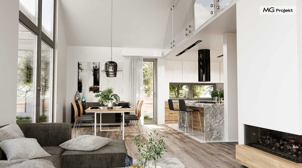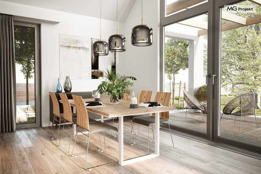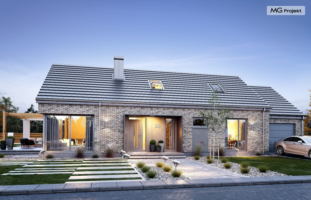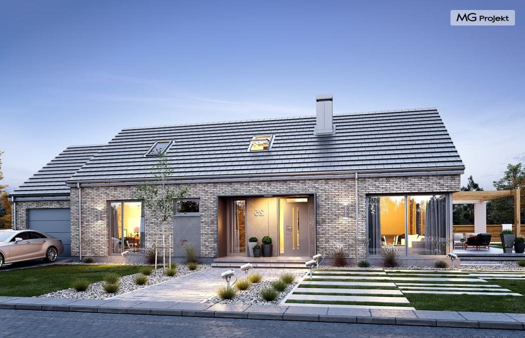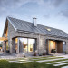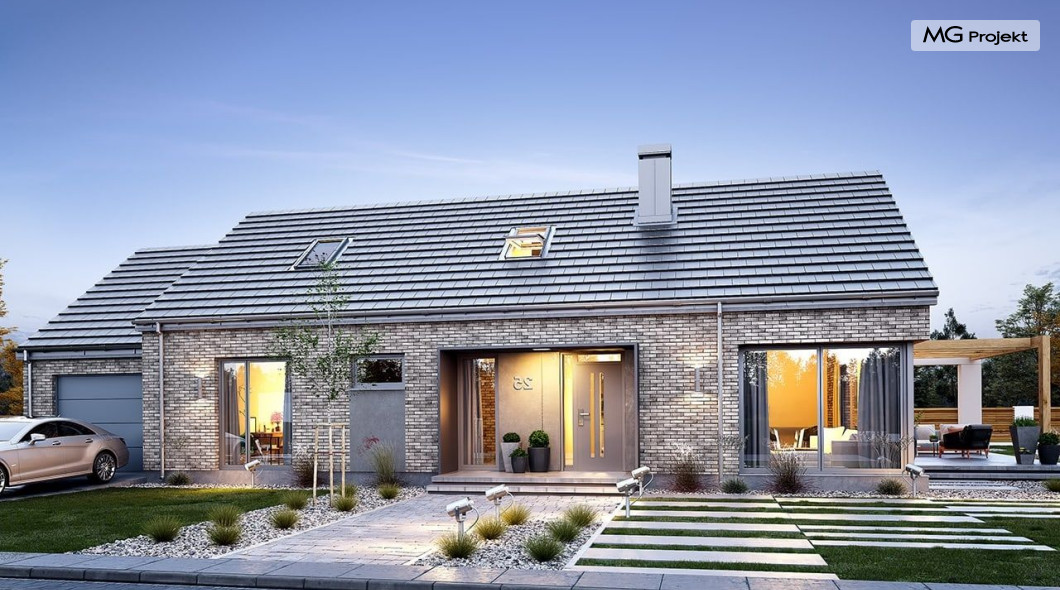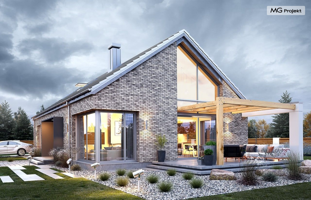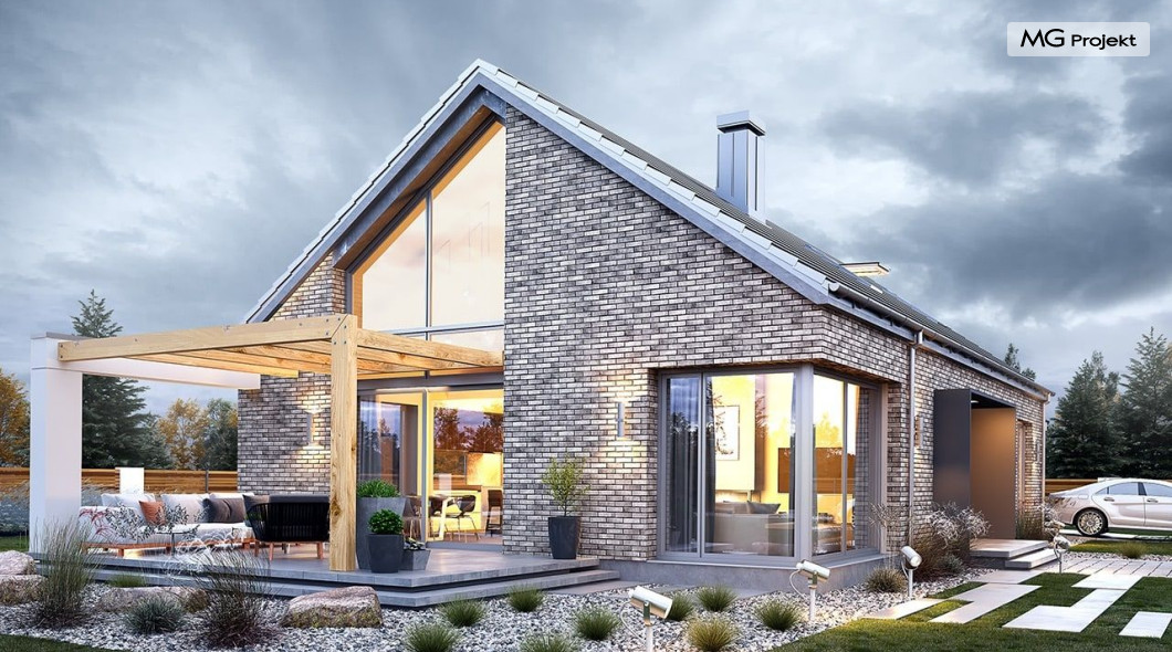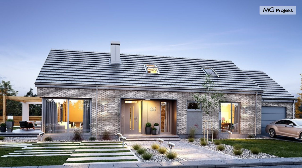 Projekt domu Wymarzony 9 to następny dom z serii projektów „Wymarzonych” z naszej pracowni. Budynek został zaprojektowany w modnej stylistyce domu-stodoły. Dom jest parterowy z poddaszem. Przykryty został dwuspadowym dachem o kącie nachylenia 35 stopni. Dach nie ma okapów, bryła jest maksymalnie prosta, nowoczesna, z dostawionymi od frontu i tyłu pudełkowymi zadaszeniami kryjącymi wejście i wykusz kuchni. W projekcie zastosowano ciekawe detale i materiały uatrakcyjniające wygląd zewnętrzny. Przede wszystkim charakter budynku tworzy okładzina klinkierowa na ścianach, połączona z szarymi wstawkami, szarą stolarką okienną i szaro – grafitową dachówką. Połączenie użytych materiałów i detali stworzyło udany efekt wizualny. Dom jest nowoczesny, prosty, a zarazem elegancji i reprezentacyjny. W projekcie domu Wymarzony 9 głównym detalem wyróżniającym elewację frontową jest część wejściowa, z podestem, ciekawym pudełkowym zadaszeniem i drzwiami wejściowymi z naświetlami. Od strony elewacji tylnej zabieg ten powtórzono w wykuszu kuchni. Niewątpliwie najciekawszy jest szczyt domu z oknem biegnącym przez całą wysokość elewacji, które doświetla salon z pustką i antresolą, otwierając wnętrze na taras z pergolą i ogród. Dom zaprojektowano w taki sposób, aby salon miał doświetlenie z trzech stron budynku, co pozwala lokalizować go na niekorzystnej działce - z wjazdem od południa, czy z ogrodem z boku. Projektując wnętrze staraliśmy się zmieścić wygodne cztery pokoje + salon, oraz wszystkie potrzebne pomieszczenia dodatkowe. Do domu wchodzimy wygodnym przedsionkiem wprost do części dziennej, z salonem, jadalnią i częściowo zamkniętą półwyspem kuchnią. Kuchnia połączona jest ze spiżarką, oraz pralnią z wyjściem gospodarczym na tył domu. Z drugiej strony domu mamy trzy sypialnie, w tym sypialnię rodziców z garderoba, łazienkę i dodatkowy pokój – gabinet lub extra sypialnię. Przez podwójne drzwi i dodatkowy korytarz dom łączy się z garażem i kotłownią. Nad parterem zaprojektowano poddasze z pustką nad salonem, antresolą ze schodami nad salonem, oraz z dodatkową przestrzenią strychu-poddasza, którą można pozostawić jako strych (magazyn), albo zamienić na dodatkowe pokoje użytkowe - wedle życzenia właściciela. Projekt domu Wymarzony 9 to komfortowy, wygodny dom o nowoczesnej i atrakcyjnej architekturze, przeznaczony dla cztero- pięcioosobowej rodziny. Budynek jest energooszczędny, ma prostą konstrukcję, będzie łatwy w budowie i tani w utrzymaniu. Zapraszamy do zapoznania się z pełną ofertą pracowni MG Projekt tej serii: Wymarzony, Wymarzony 2, Wymarzony 3, Wymarzony 4, Wymarzony 5, Wymarzony 6, Wymarzony 7, Wymarzony 8, Wymarzony 10, Wymarzony 11.
