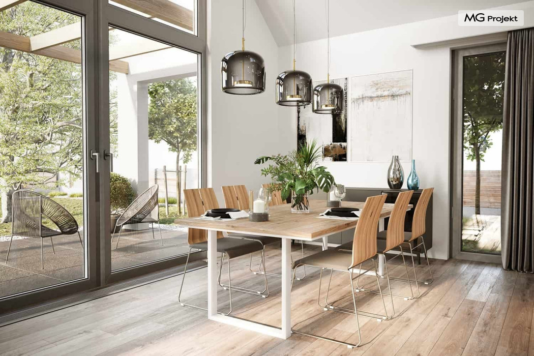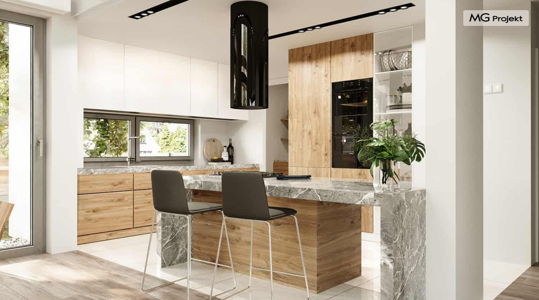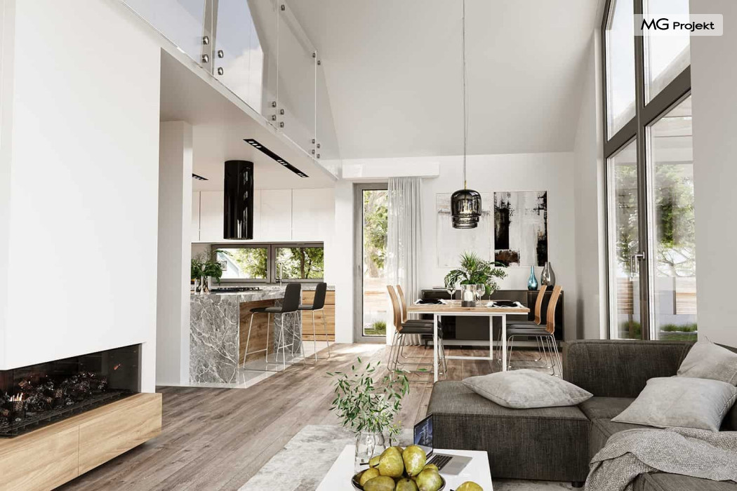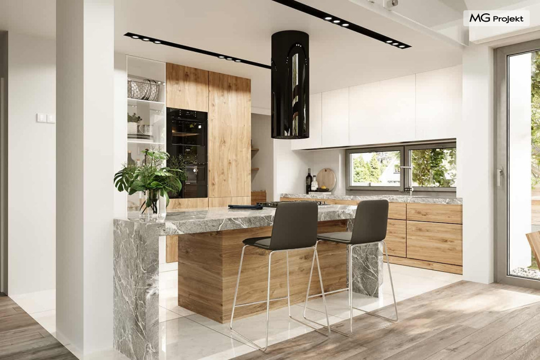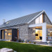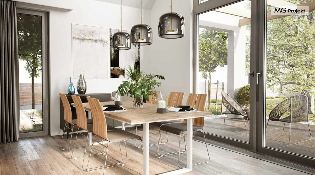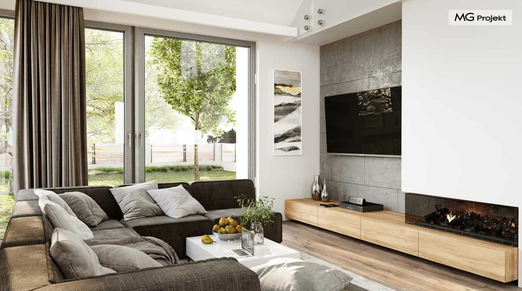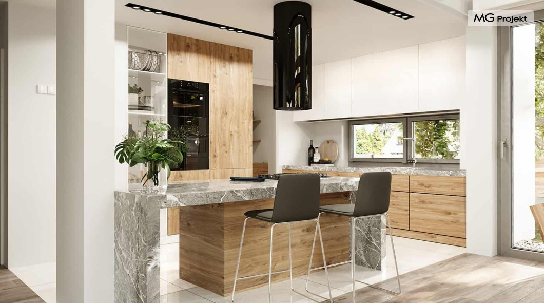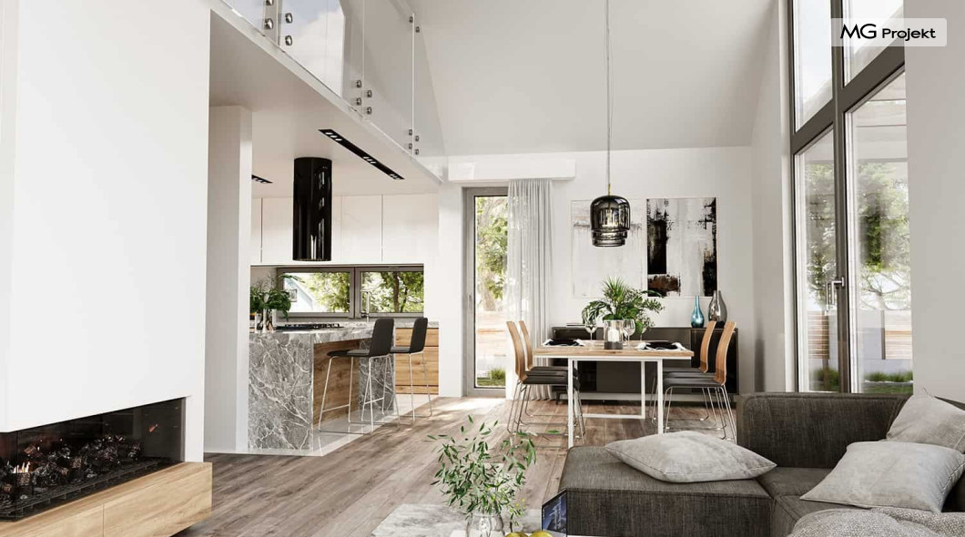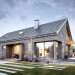 Projekt domu Wymarzony 9 to następny dom z serii projektów „Wymarzonych” z naszej pracowni. Budynek został zaprojektowany w modnej stylistyce domu-stodoły. Dom jest parterowy z poddaszem. Przykryty został dwuspadowym dachem o kącie nachylenia 35 stopni. Dach nie ma okapów, bryła jest maksymalnie prosta, nowoczesna, z dostawionymi od frontu i tyłu pudełkowymi zadaszeniami kryjącymi wejście i wykusz kuchni. W projekcie zastosowano ciekawe detale i materiały uatrakcyjniające wygląd zewnętrzny. Przede wszystkim charakter budynku tworzy okładzina klinkierowa na ścianach, połączona z szarymi wstawkami, szarą stolarką okienną i szaro – grafitową dachówką. Połączenie użytych materiałów i detali stworzyło udany efekt wizualny. Dom jest nowoczesny, prosty, a zarazem elegancji i reprezentacyjny. W projekcie domu Wymarzony 9 głównym detalem wyróżniającym elewację frontową jest część wejściowa, z podestem, ciekawym pudełkowym zadaszeniem i drzwiami wejściowymi z naświetlami. Od strony elewacji tylnej zabieg ten powtórzono w wykuszu kuchni. Niewątpliwie najciekawszy jest szczyt domu z oknem biegnącym przez całą wysokość elewacji, które doświetla salon z pustką i antresolą, otwierając wnętrze na taras z pergolą i ogród. Dom zaprojektowano w taki sposób, aby salon miał doświetlenie z trzech stron budynku, co pozwala lokalizować go na niekorzystnej działce - z wjazdem od południa, czy z ogrodem z boku. Projektując wnętrze staraliśmy się zmieścić wygodne cztery pokoje + salon, oraz wszystkie potrzebne pomieszczenia dodatkowe. Do domu wchodzimy wygodnym przedsionkiem wprost do części dziennej, z salonem, jadalnią i częściowo zamkniętą półwyspem kuchnią. Kuchnia połączona jest ze spiżarką, oraz pralnią z wyjściem gospodarczym na tył domu. Z drugiej strony domu mamy trzy sypialnie, w tym sypialnię rodziców z garderoba, łazienkę i dodatkowy pokój – gabinet lub extra sypialnię. Przez podwójne drzwi i dodatkowy korytarz dom łączy się z garażem i kotłownią. Nad parterem zaprojektowano poddasze z pustką nad salonem, antresolą ze schodami nad salonem, oraz z dodatkową przestrzenią strychu-poddasza, którą można pozostawić jako strych (magazyn), albo zamienić na dodatkowe pokoje użytkowe - wedle życzenia właściciela. Projekt domu Wymarzony 9 to komfortowy, wygodny dom o nowoczesnej i atrakcyjnej architekturze, przeznaczony dla cztero- pięcioosobowej rodziny. Budynek jest energooszczędny, ma prostą konstrukcję, będzie łatwy w budowie i tani w utrzymaniu. Zapraszamy do zapoznania się z pełną ofertą pracowni MG Projekt tej serii: Wymarzony, Wymarzony 2, Wymarzony 3, Wymarzony 4, Wymarzony 5, Wymarzony 6, Wymarzony 7, Wymarzony 8, Wymarzony 10, Wymarzony 11.
