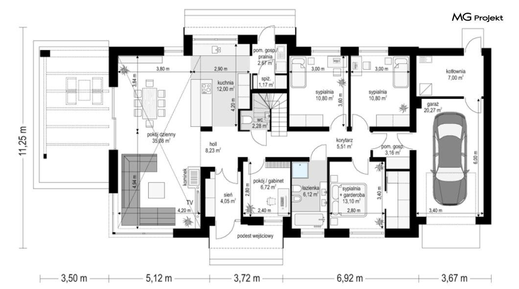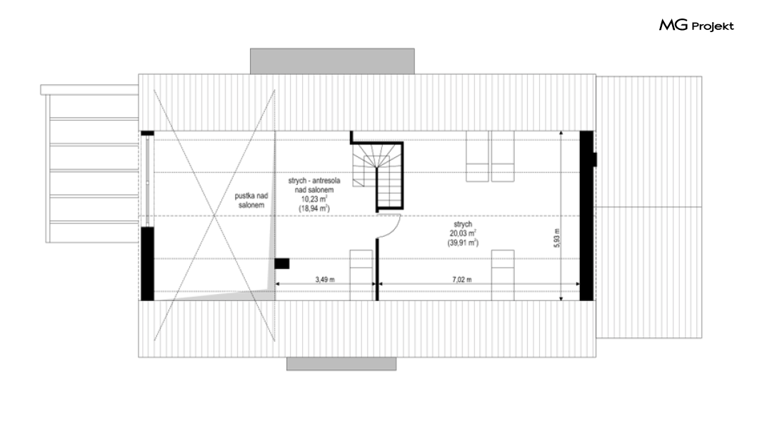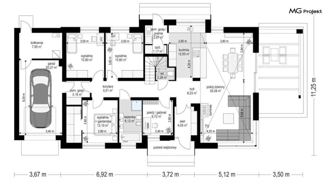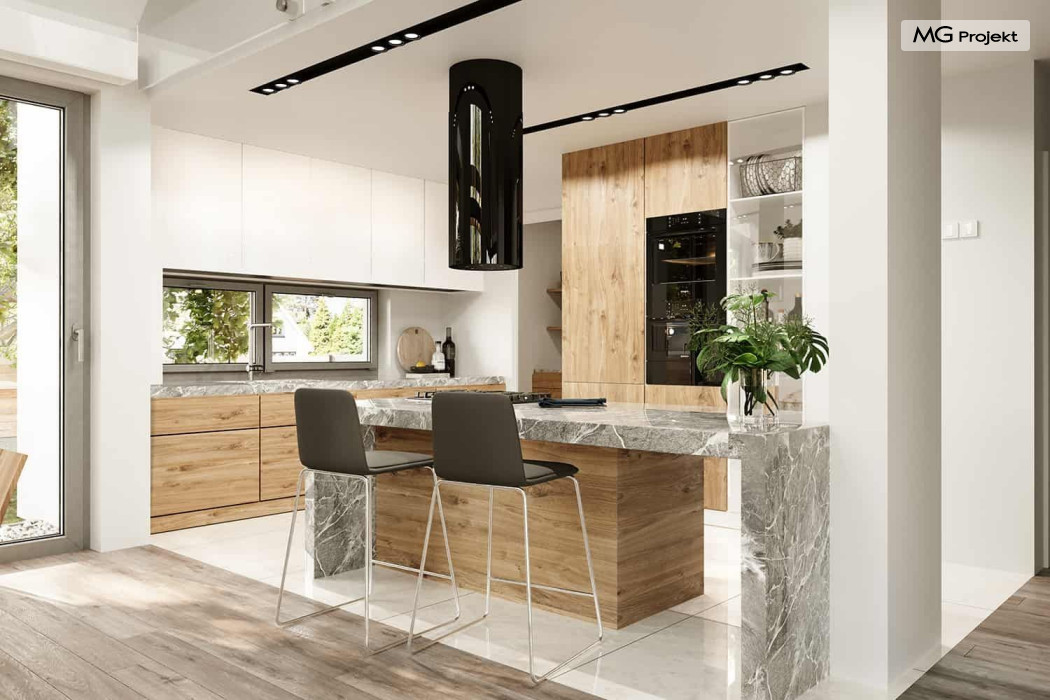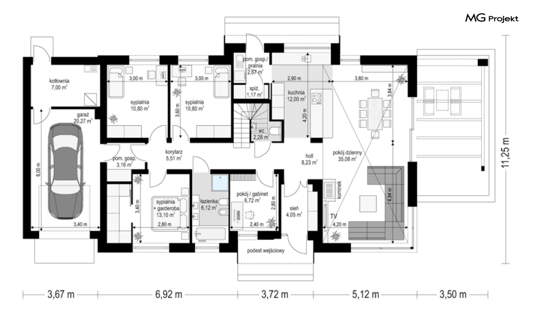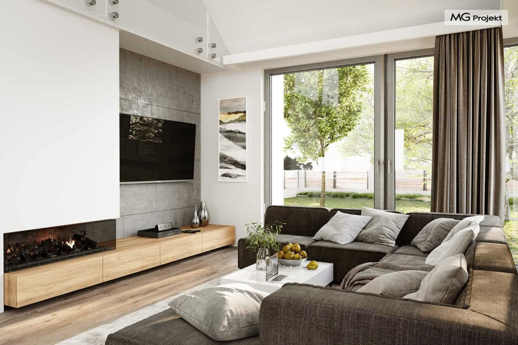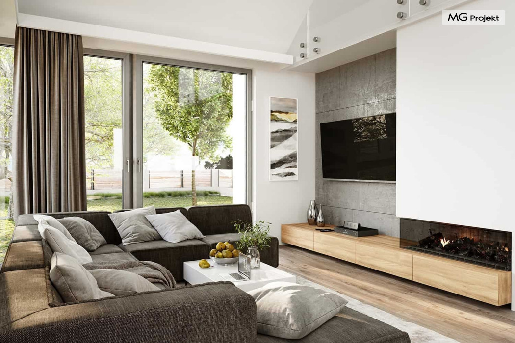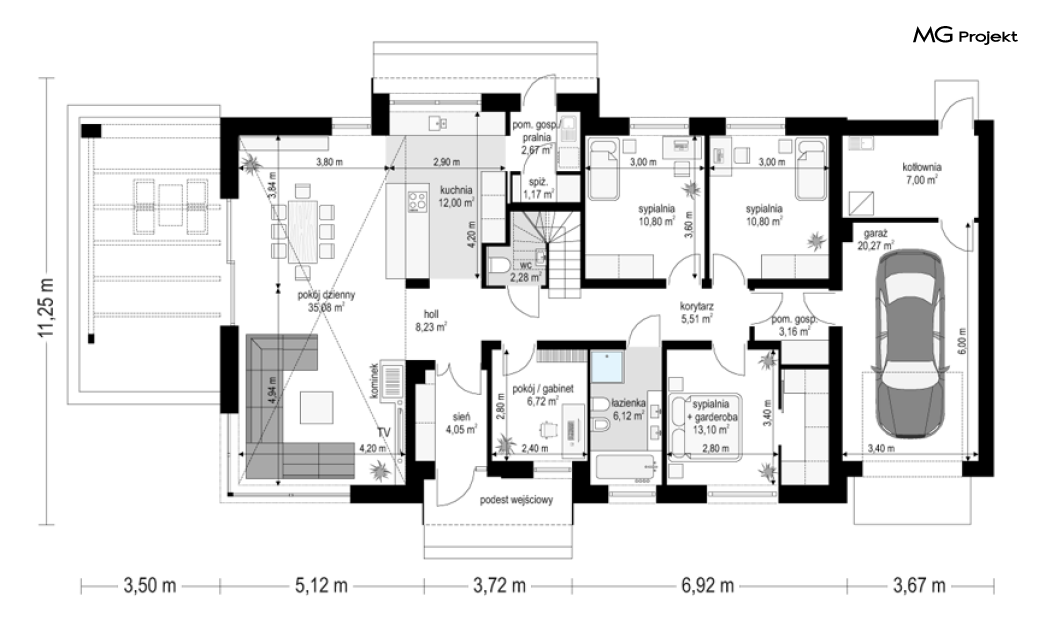 Projekt domu Wymarzony 9 to następny dom z serii projektów „Wymarzonych” z naszej pracowni. Budynek został zaprojektowany w modnej stylistyce domu-stodoły. Dom jest parterowy z poddaszem. Przykryty został dwuspadowym dachem o kącie nachylenia 35 stopni. Dach nie ma okapów, bryła jest maksymalnie prosta, nowoczesna, z dostawionymi od frontu i tyłu pudełkowymi zadaszeniami kryjącymi wejście i wykusz kuchni. W projekcie zastosowano ciekawe detale i materiały uatrakcyjniające wygląd zewnętrzny. Przede wszystkim charakter budynku tworzy okładzina klinkierowa na ścianach, połączona z szarymi wstawkami, szarą stolarką okienną i szaro – grafitową dachówką. Połączenie użytych materiałów i detali stworzyło udany efekt wizualny. Dom jest nowoczesny, prosty, a zarazem elegancji i reprezentacyjny. W projekcie domu Wymarzony 9 głównym detalem wyróżniającym elewację frontową jest część wejściowa, z podestem, ciekawym pudełkowym zadaszeniem i drzwiami wejściowymi z naświetlami. Od strony elewacji tylnej zabieg ten powtórzono w wykuszu kuchni. Niewątpliwie najciekawszy jest szczyt domu z oknem biegnącym przez całą wysokość elewacji, które doświetla salon z pustką i antresolą, otwierając wnętrze na taras z pergolą i ogród. Dom zaprojektowano w taki sposób, aby salon miał doświetlenie z trzech stron budynku, co pozwala lokalizować go na niekorzystnej działce - z wjazdem od południa, czy z ogrodem z boku. Projektując wnętrze staraliśmy się zmieścić wygodne cztery pokoje + salon, oraz wszystkie potrzebne pomieszczenia dodatkowe. Do domu wchodzimy wygodnym przedsionkiem wprost do części dziennej, z salonem, jadalnią i częściowo zamkniętą półwyspem kuchnią. Kuchnia połączona jest ze spiżarką, oraz pralnią z wyjściem gospodarczym na tył domu. Z drugiej strony domu mamy trzy sypialnie, w tym sypialnię rodziców z garderoba, łazienkę i dodatkowy pokój – gabinet lub extra sypialnię. Przez podwójne drzwi i dodatkowy korytarz dom łączy się z garażem i kotłownią. Nad parterem zaprojektowano poddasze z pustką nad salonem, antresolą ze schodami nad salonem, oraz z dodatkową przestrzenią strychu-poddasza, którą można pozostawić jako strych (magazyn), albo zamienić na dodatkowe pokoje użytkowe - wedle życzenia właściciela. Projekt domu Wymarzony 9 to komfortowy, wygodny dom o nowoczesnej i atrakcyjnej architekturze, przeznaczony dla cztero- pięcioosobowej rodziny. Budynek jest energooszczędny, ma prostą konstrukcję, będzie łatwy w budowie i tani w utrzymaniu. Zapraszamy do zapoznania się z pełną ofertą pracowni MG Projekt tej serii: Wymarzony, Wymarzony 2, Wymarzony 3, Wymarzony 4, Wymarzony 5, Wymarzony 6, Wymarzony 7, Wymarzony 8, Wymarzony 10, Wymarzony 11.