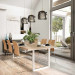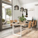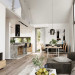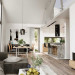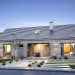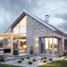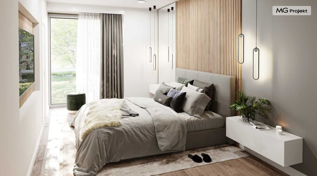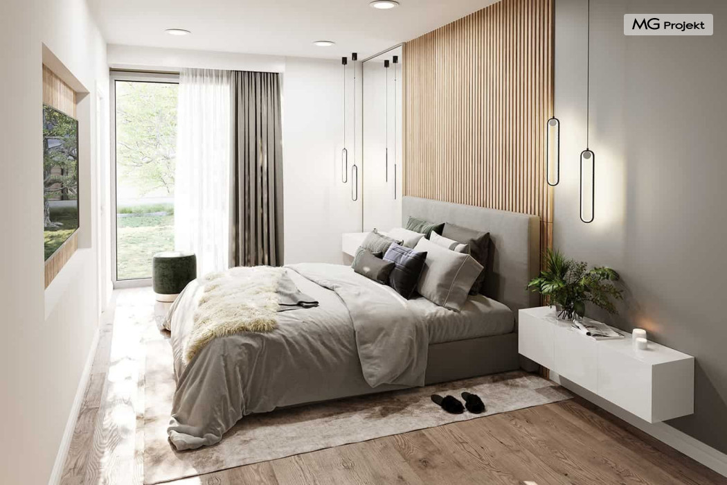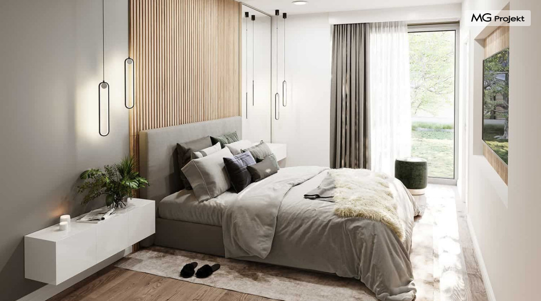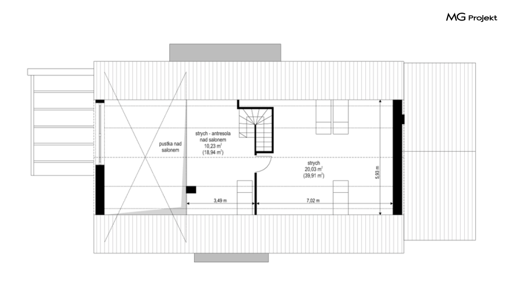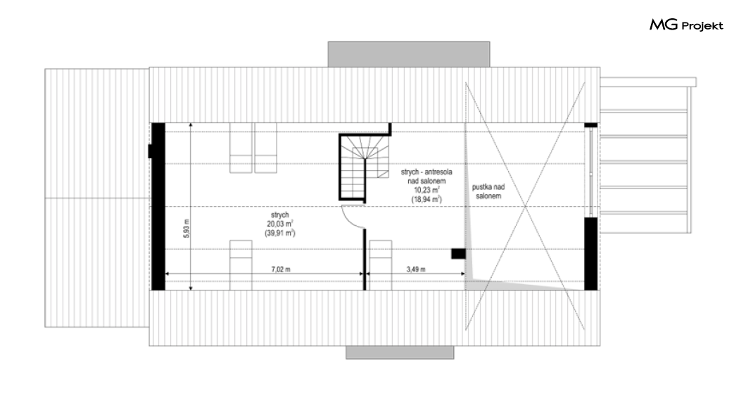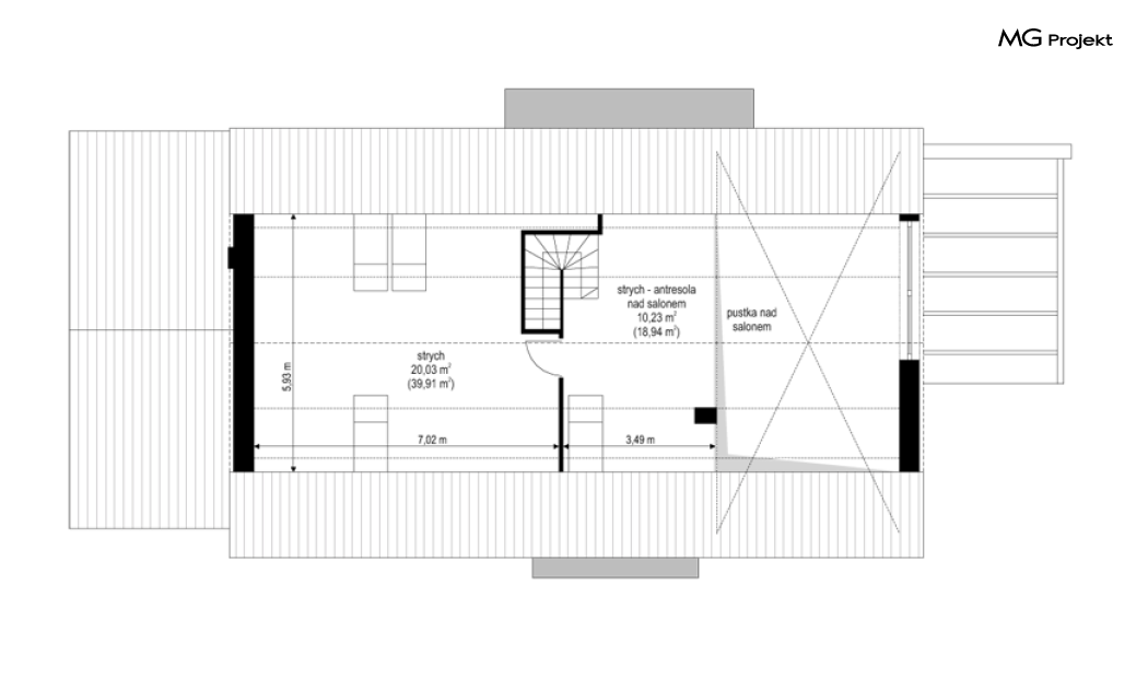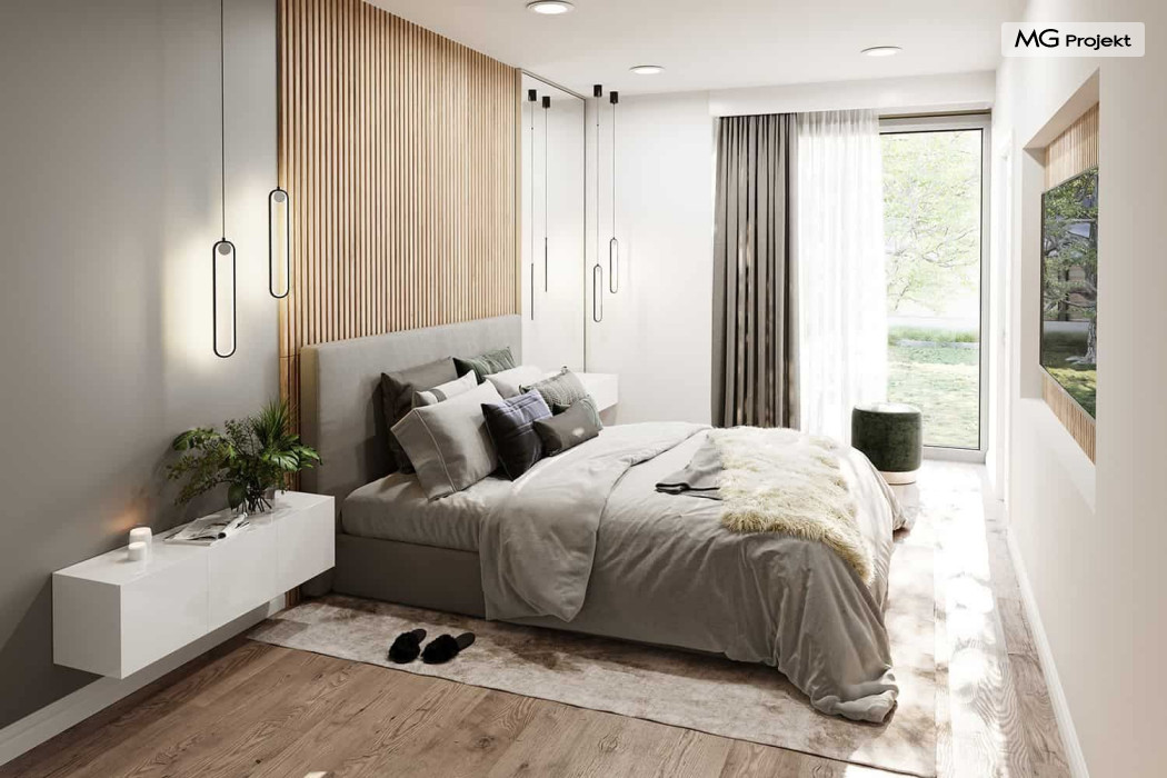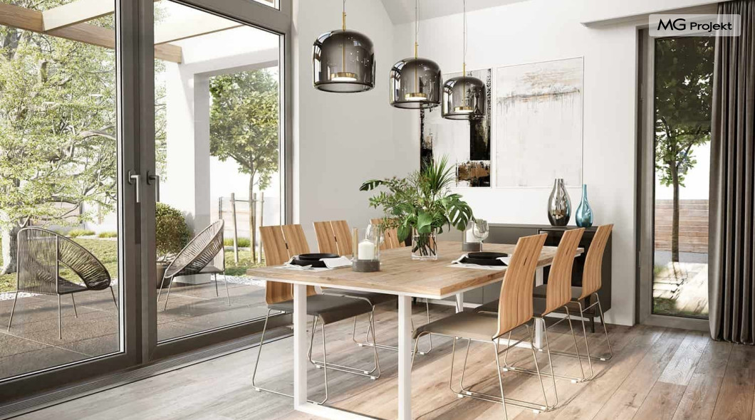 Projekt domu Wymarzony 9 to następny dom z serii projektów „Wymarzonych” z naszej pracowni. Budynek został zaprojektowany w modnej stylistyce domu-stodoły. Dom jest parterowy z poddaszem. Przykryty został dwuspadowym dachem o kącie nachylenia 35 stopni. Dach nie ma okapów, bryła jest maksymalnie prosta, nowoczesna, z dostawionymi od frontu i tyłu pudełkowymi zadaszeniami kryjącymi wejście i wykusz kuchni. W projekcie zastosowano ciekawe detale i materiały uatrakcyjniające wygląd zewnętrzny. Przede wszystkim charakter budynku tworzy okładzina klinkierowa na ścianach, połączona z szarymi wstawkami, szarą stolarką okienną i szaro – grafitową dachówką. Połączenie użytych materiałów i detali stworzyło udany efekt wizualny. Dom jest nowoczesny, prosty, a zarazem elegancji i reprezentacyjny. W projekcie domu Wymarzony 9 głównym detalem wyróżniającym elewację frontową jest część wejściowa, z podestem, ciekawym pudełkowym zadaszeniem i drzwiami wejściowymi z naświetlami. Od strony elewacji tylnej zabieg ten powtórzono w wykuszu kuchni. Niewątpliwie najciekawszy jest szczyt domu z oknem biegnącym przez całą wysokość elewacji, które doświetla salon z pustką i antresolą, otwierając wnętrze na taras z pergolą i ogród. Dom zaprojektowano w taki sposób, aby salon miał doświetlenie z trzech stron budynku, co pozwala lokalizować go na niekorzystnej działce - z wjazdem od południa, czy z ogrodem z boku. Projektując wnętrze staraliśmy się zmieścić wygodne cztery pokoje + salon, oraz wszystkie potrzebne pomieszczenia dodatkowe. Do domu wchodzimy wygodnym przedsionkiem wprost do części dziennej, z salonem, jadalnią i częściowo zamkniętą półwyspem kuchnią. Kuchnia połączona jest ze spiżarką, oraz pralnią z wyjściem gospodarczym na tył domu. Z drugiej strony domu mamy trzy sypialnie, w tym sypialnię rodziców z garderoba, łazienkę i dodatkowy pokój – gabinet lub extra sypialnię. Przez podwójne drzwi i dodatkowy korytarz dom łączy się z garażem i kotłownią. Nad parterem zaprojektowano poddasze z pustką nad salonem, antresolą ze schodami nad salonem, oraz z dodatkową przestrzenią strychu-poddasza, którą można pozostawić jako strych (magazyn), albo zamienić na dodatkowe pokoje użytkowe - wedle życzenia właściciela. Projekt domu Wymarzony 9 to komfortowy, wygodny dom o nowoczesnej i atrakcyjnej architekturze, przeznaczony dla cztero- pięcioosobowej rodziny. Budynek jest energooszczędny, ma prostą konstrukcję, będzie łatwy w budowie i tani w utrzymaniu. Zapraszamy do zapoznania się z pełną ofertą pracowni MG Projekt tej serii: Wymarzony, Wymarzony 2, Wymarzony 3, Wymarzony 4, Wymarzony 5, Wymarzony 6, Wymarzony 7, Wymarzony 8, Wymarzony 10, Wymarzony 11.
