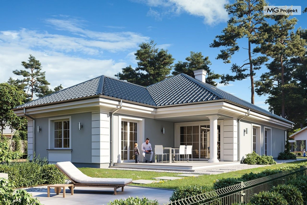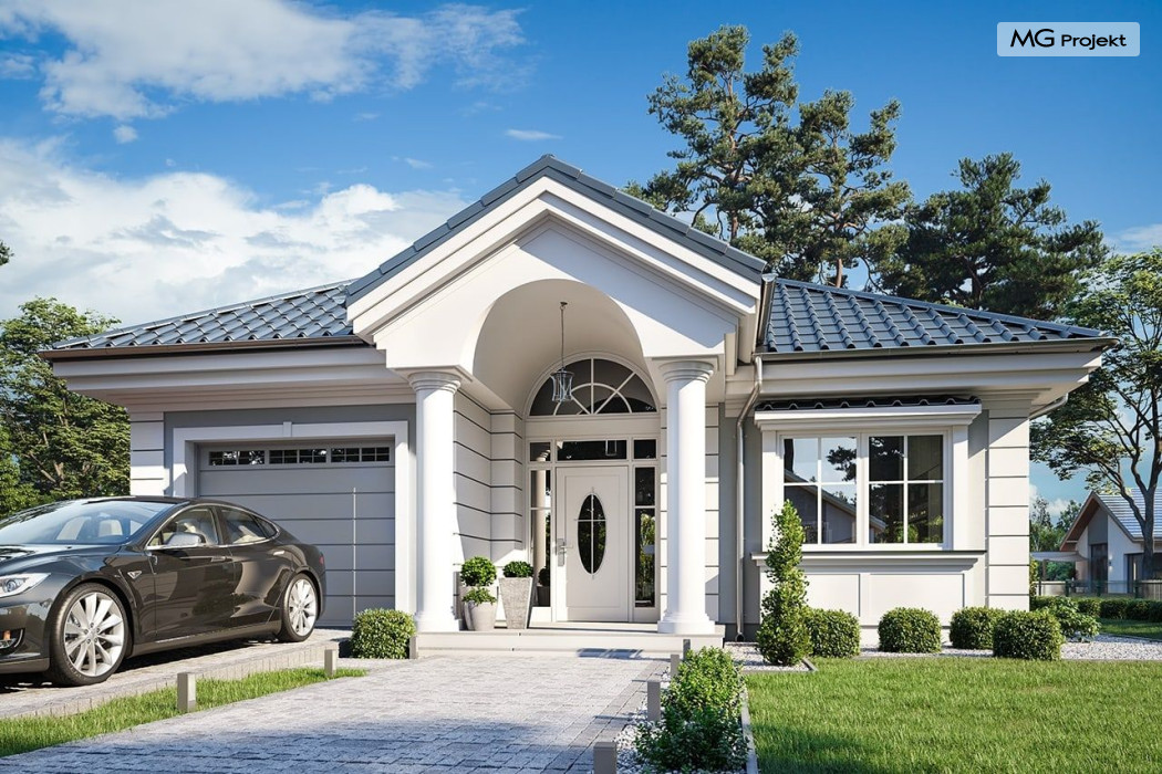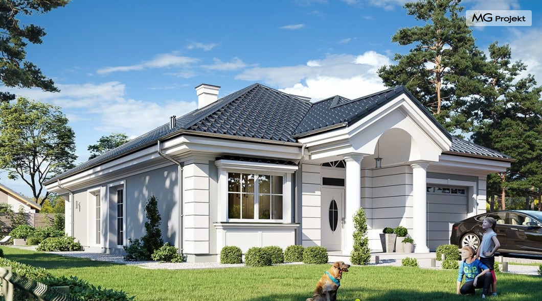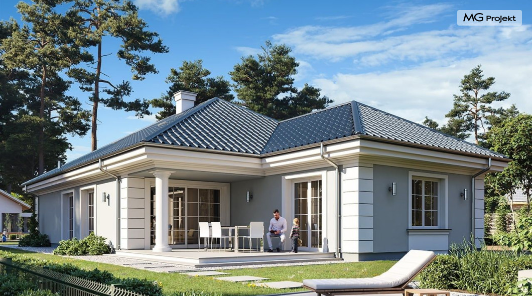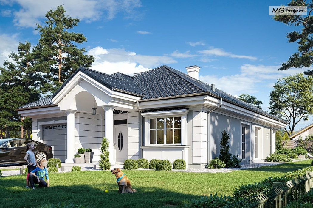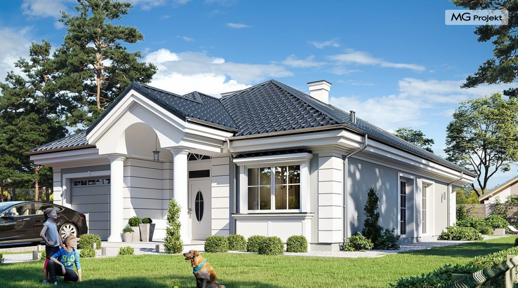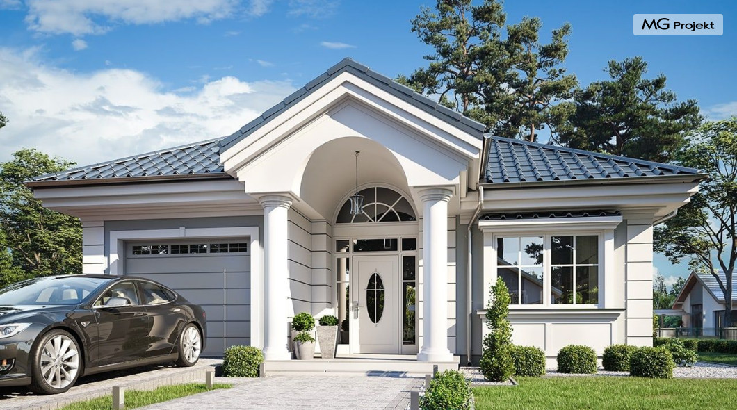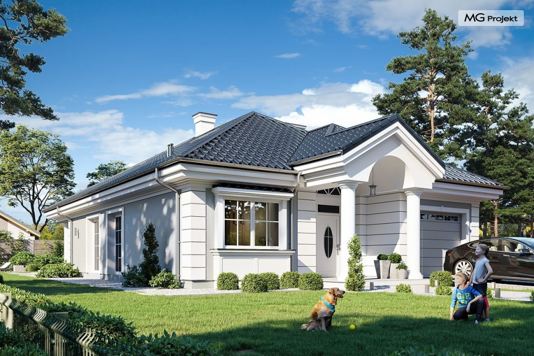 Projekt domu Dom na parkowej 7A jest kolejną propozycją projektu z cieszącej się popularnością serii „Dom na Parkowej”. Budynek zaprojektowano za planie prostokąta, jako podłużną, dość wąską bryłę przykrytą czterospadowym dachem, z dobudowaną częścią z sypialnią rodziców, a od frontu z wystającym garażem. Projekt domu Dom na parkowej 7A to idealna propozycja na wąską działkę o szerokości poniżej 19 metrów. Cała funkcja budynku mieści się na jednej kondygnacji, na parterze, dając mieszkańcom komfort i luksus życia na jednym poziomie - blisko ogrodu. Obszerny strych nad parterem można zaadaptować na dodatkowe poddasze użytkowe z pomieszczeniami, albo pozostawić go jako domowy magazyn. Architektura Domu Parkowego 7A nawiązuje do innych modeli z tej serii – stylizowanych na klasyczne podmiejskie wille, z dworkowo-rezydencyjnymi detalami. Do domu wchodzimy przez piękny przedsionek z łukowym sklepieniem, przez wejściowe drzwi z naświetlami, do przedsionka i wnętrza. Od strony ogrodowej mamy zaprojektowane ogrodowe patio przesłonięte ścianami w układzie litery „L”, z zadaszonym podcieniem nad tarasem. Wnętrze domu to jednoprzestrzenne wnętrze salonu, holu i kuchni, cześć gospodarczo –garażowa, oraz część nocna z sypialniami dzieci i rodziców oraz łazienką. Wnętrze ma przewidziane szafy i praktyczne schowki, każde z pomieszczeń jest ustawne i funkcjonalne. Zapasowa przestrzeń strychu może być dodatkowo zaadaptowana na powierzchnię użytkową i włączona do domu powiększając go znacznie. Dom ma dość prostą konstrukcję i nie powinien być trudny w realizacji. Z kolei bardzo dobre izolacje termiczne i zastosowane nowoczesne instalacje sprawią, że budynek będzie tani w późniejszym utrzymaniu i eksploatacji. Projekt domu Dom na parkowej 7A to idealna propozycja dla Inwestorów lubiących klasyczną architekturę, posiadających wąską parcelę, planujących budowę domu parterowego i dysponujących niewygórowanym budżetem. Zapraszamy do zapoznania się z pełną ofertą pracowni MG Projekt: projekt domu Dom na parkowej, projekt domu Dom na parkowej 2, projekt domu Dom na parkowej 3, projekt domu Dom na parkowej 4, projekt domu Dom na parkowej 5, projekt domu Dom na parkowej 6, projekt domu Dom na parkowej 7 B.