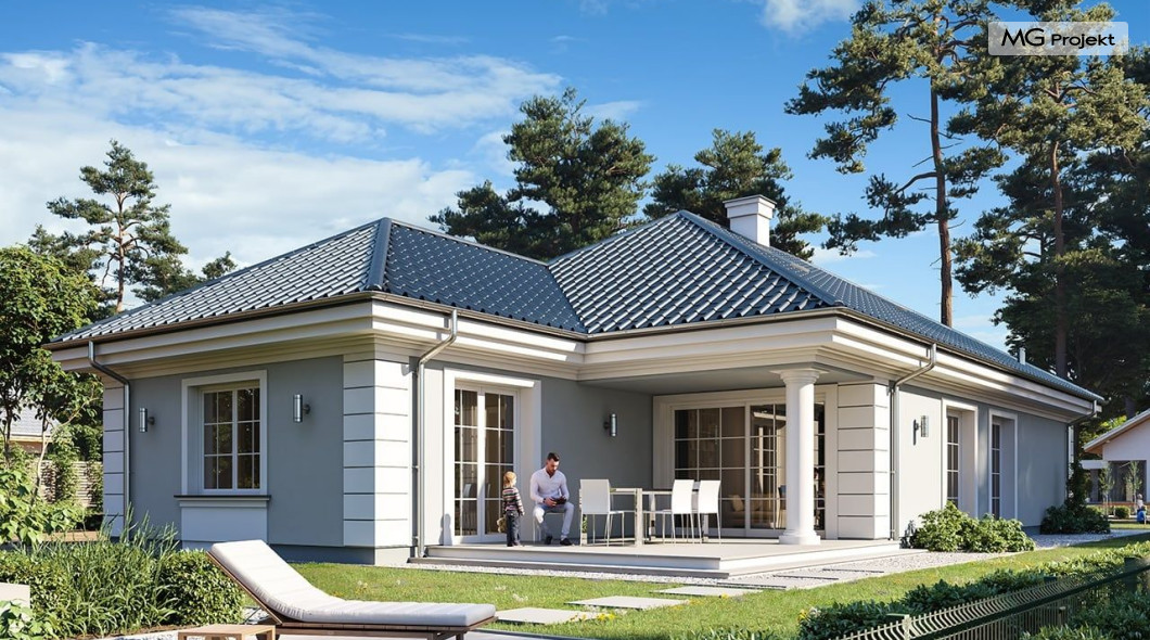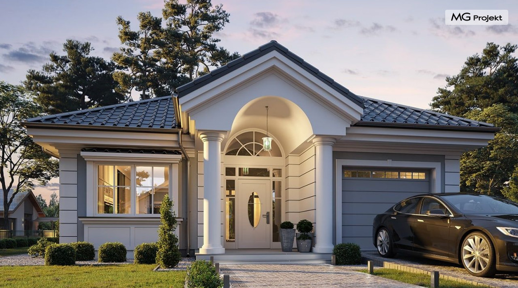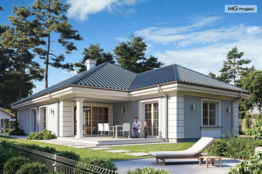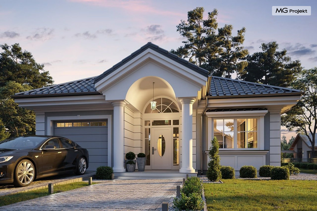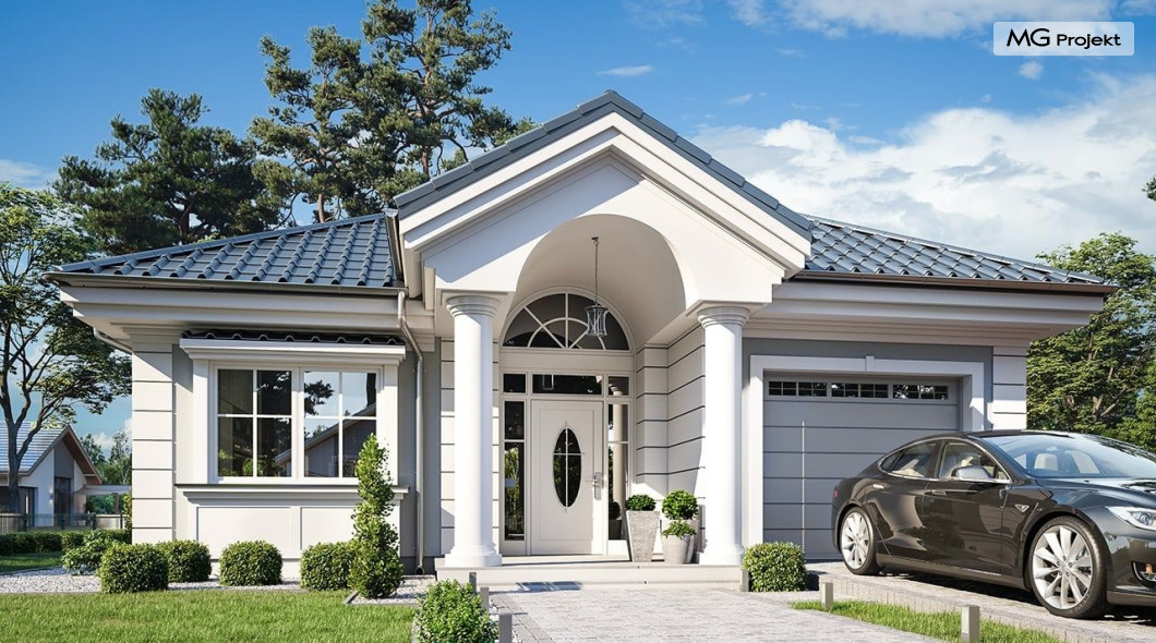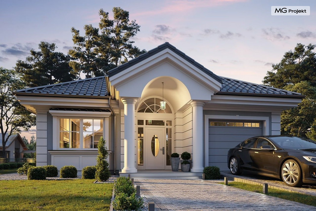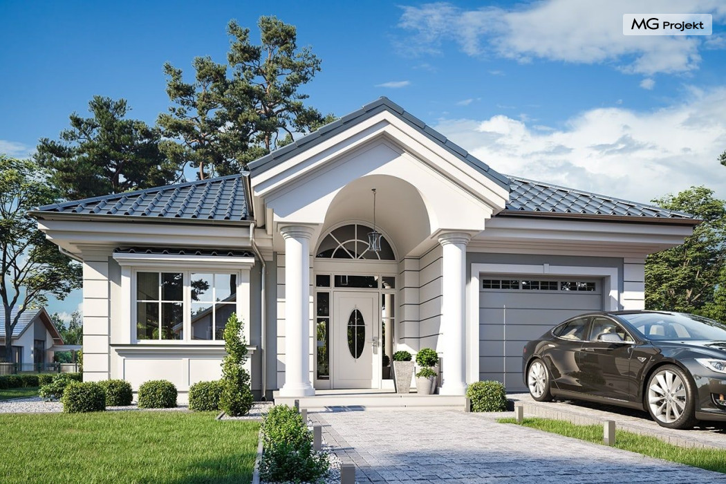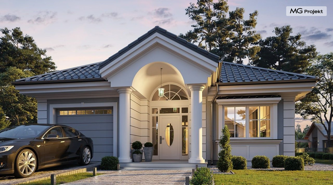 Projekt domu Dom na parkowej 7A jest kolejną propozycją projektu z cieszącej się popularnością serii „Dom na Parkowej”. Budynek zaprojektowano za planie prostokąta, jako podłużną, dość wąską bryłę przykrytą czterospadowym dachem, z dobudowaną częścią z sypialnią rodziców, a od frontu z wystającym garażem. Projekt domu Dom na parkowej 7A to idealna propozycja na wąską działkę o szerokości poniżej 19 metrów. Cała funkcja budynku mieści się na jednej kondygnacji, na parterze, dając mieszkańcom komfort i luksus życia na jednym poziomie - blisko ogrodu. Obszerny strych nad parterem można zaadaptować na dodatkowe poddasze użytkowe z pomieszczeniami, albo pozostawić go jako domowy magazyn. Architektura Domu Parkowego 7A nawiązuje do innych modeli z tej serii – stylizowanych na klasyczne podmiejskie wille, z dworkowo-rezydencyjnymi detalami. Do domu wchodzimy przez piękny przedsionek z łukowym sklepieniem, przez wejściowe drzwi z naświetlami, do przedsionka i wnętrza. Od strony ogrodowej mamy zaprojektowane ogrodowe patio przesłonięte ścianami w układzie litery „L”, z zadaszonym podcieniem nad tarasem. Wnętrze domu to jednoprzestrzenne wnętrze salonu, holu i kuchni, cześć gospodarczo –garażowa, oraz część nocna z sypialniami dzieci i rodziców oraz łazienką. Wnętrze ma przewidziane szafy i praktyczne schowki, każde z pomieszczeń jest ustawne i funkcjonalne. Zapasowa przestrzeń strychu może być dodatkowo zaadaptowana na powierzchnię użytkową i włączona do domu powiększając go znacznie. Dom ma dość prostą konstrukcję i nie powinien być trudny w realizacji. Z kolei bardzo dobre izolacje termiczne i zastosowane nowoczesne instalacje sprawią, że budynek będzie tani w późniejszym utrzymaniu i eksploatacji. Projekt domu Dom na parkowej 7A to idealna propozycja dla Inwestorów lubiących klasyczną architekturę, posiadających wąską parcelę, planujących budowę domu parterowego i dysponujących niewygórowanym budżetem. Zapraszamy do zapoznania się z pełną ofertą pracowni MG Projekt: projekt domu Dom na parkowej, projekt domu Dom na parkowej 2, projekt domu Dom na parkowej 3, projekt domu Dom na parkowej 4, projekt domu Dom na parkowej 5, projekt domu Dom na parkowej 6, projekt domu Dom na parkowej 7 B.