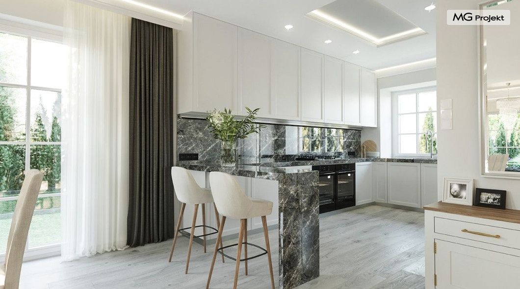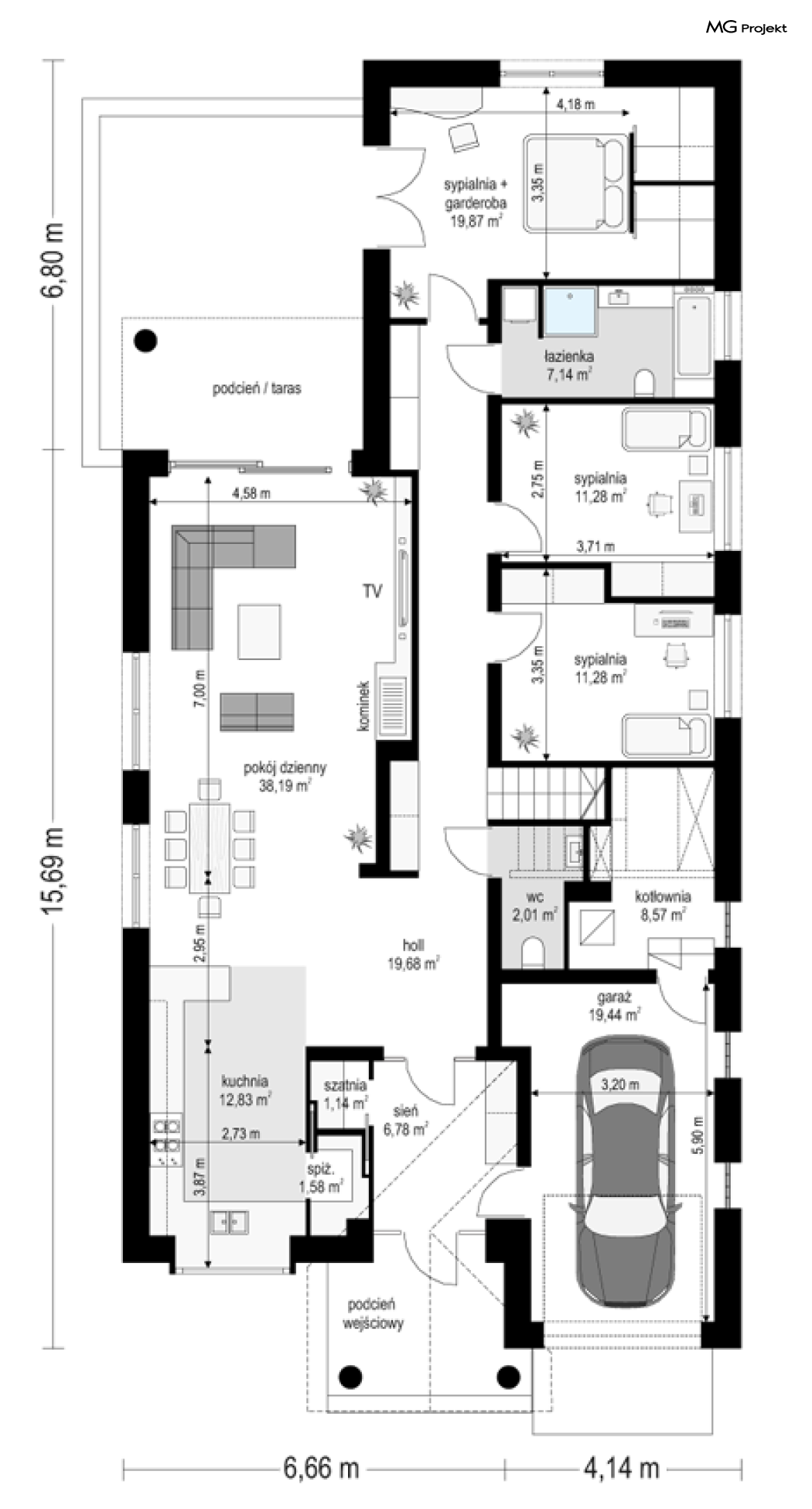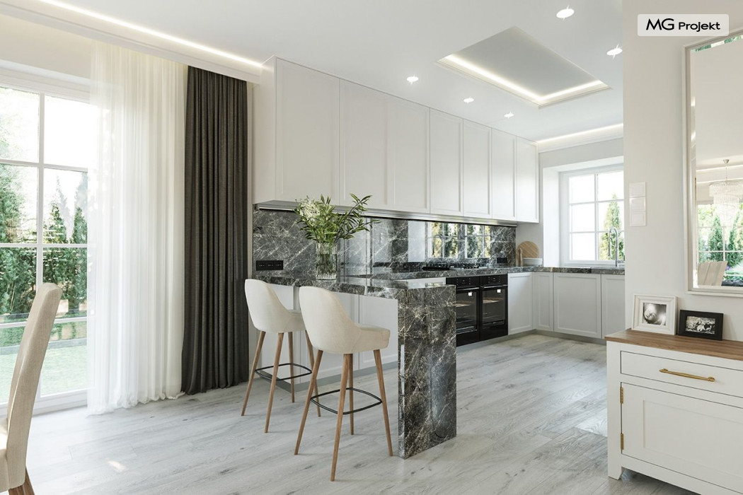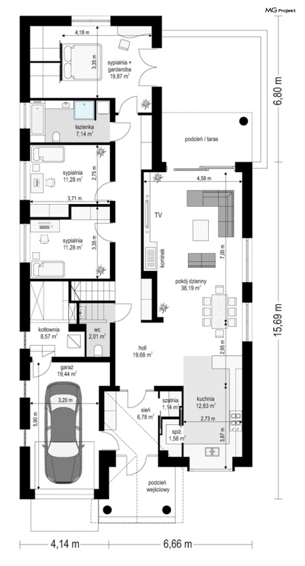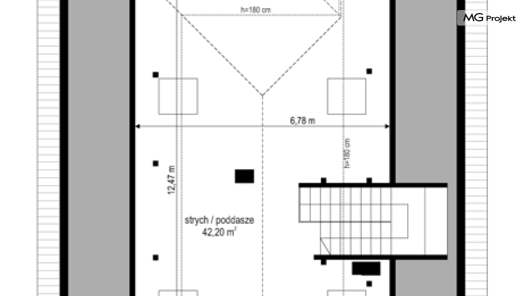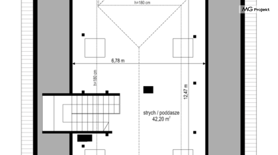 Projekt domu Dom na parkowej 7A jest kolejną propozycją projektu z cieszącej się popularnością serii „Dom na Parkowej”. Budynek zaprojektowano za planie prostokąta, jako podłużną, dość wąską bryłę przykrytą czterospadowym dachem, z dobudowaną częścią z sypialnią rodziców, a od frontu z wystającym garażem. Projekt domu Dom na parkowej 7A to idealna propozycja na wąską działkę o szerokości poniżej 19 metrów. Cała funkcja budynku mieści się na jednej kondygnacji, na parterze, dając mieszkańcom komfort i luksus życia na jednym poziomie - blisko ogrodu. Obszerny strych nad parterem można zaadaptować na dodatkowe poddasze użytkowe z pomieszczeniami, albo pozostawić go jako domowy magazyn. Architektura Domu Parkowego 7A nawiązuje do innych modeli z tej serii – stylizowanych na klasyczne podmiejskie wille, z dworkowo-rezydencyjnymi detalami. Do domu wchodzimy przez piękny przedsionek z łukowym sklepieniem, przez wejściowe drzwi z naświetlami, do przedsionka i wnętrza. Od strony ogrodowej mamy zaprojektowane ogrodowe patio przesłonięte ścianami w układzie litery „L”, z zadaszonym podcieniem nad tarasem. Wnętrze domu to jednoprzestrzenne wnętrze salonu, holu i kuchni, cześć gospodarczo –garażowa, oraz część nocna z sypialniami dzieci i rodziców oraz łazienką. Wnętrze ma przewidziane szafy i praktyczne schowki, każde z pomieszczeń jest ustawne i funkcjonalne. Zapasowa przestrzeń strychu może być dodatkowo zaadaptowana na powierzchnię użytkową i włączona do domu powiększając go znacznie. Dom ma dość prostą konstrukcję i nie powinien być trudny w realizacji. Z kolei bardzo dobre izolacje termiczne i zastosowane nowoczesne instalacje sprawią, że budynek będzie tani w późniejszym utrzymaniu i eksploatacji. Projekt domu Dom na parkowej 7A to idealna propozycja dla Inwestorów lubiących klasyczną architekturę, posiadających wąską parcelę, planujących budowę domu parterowego i dysponujących niewygórowanym budżetem. Zapraszamy do zapoznania się z pełną ofertą pracowni MG Projekt: projekt domu Dom na parkowej, projekt domu Dom na parkowej 2, projekt domu Dom na parkowej 3, projekt domu Dom na parkowej 4, projekt domu Dom na parkowej 5, projekt domu Dom na parkowej 6, projekt domu Dom na parkowej 7 B.