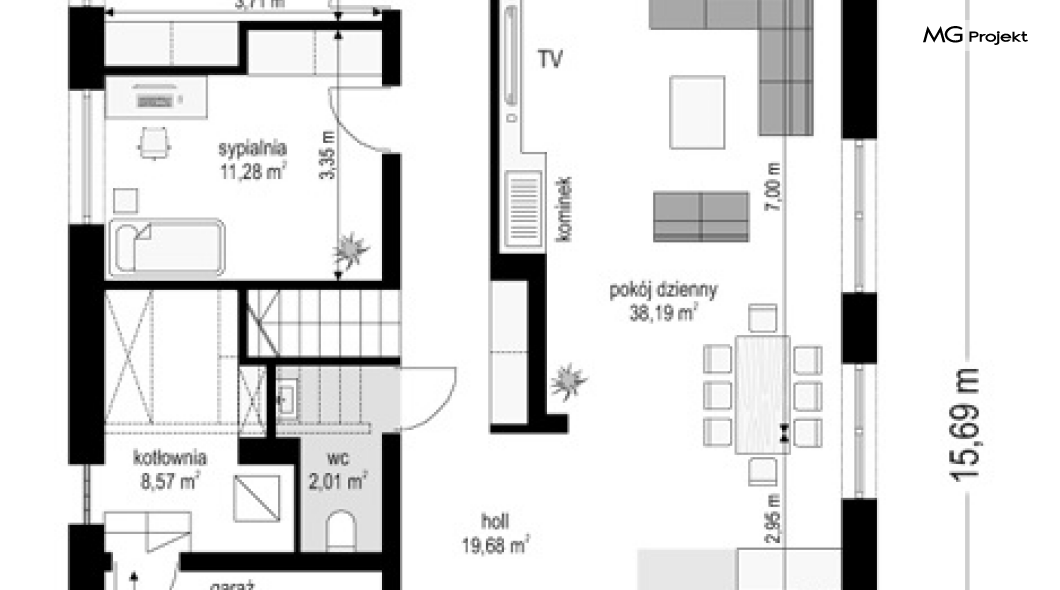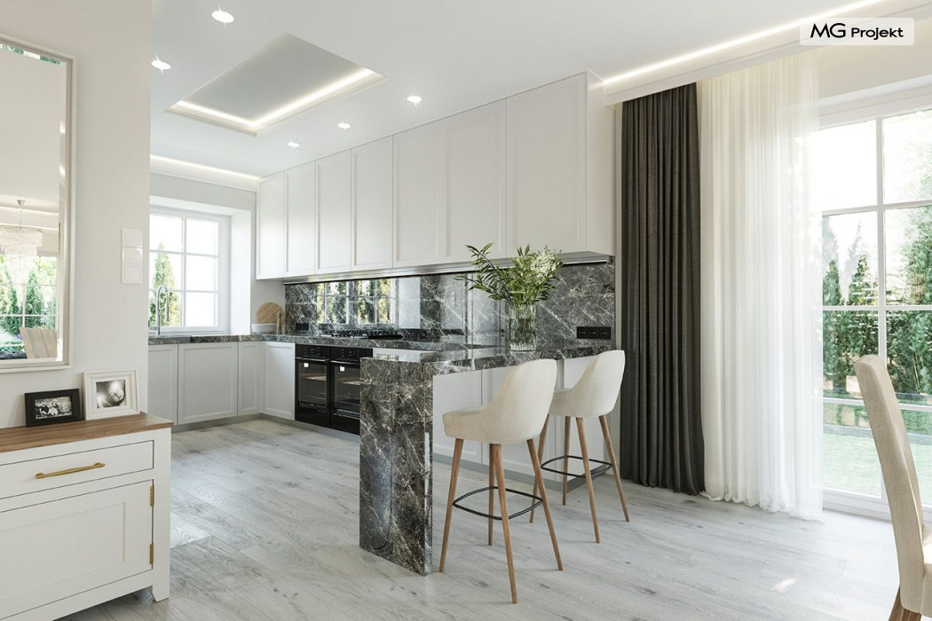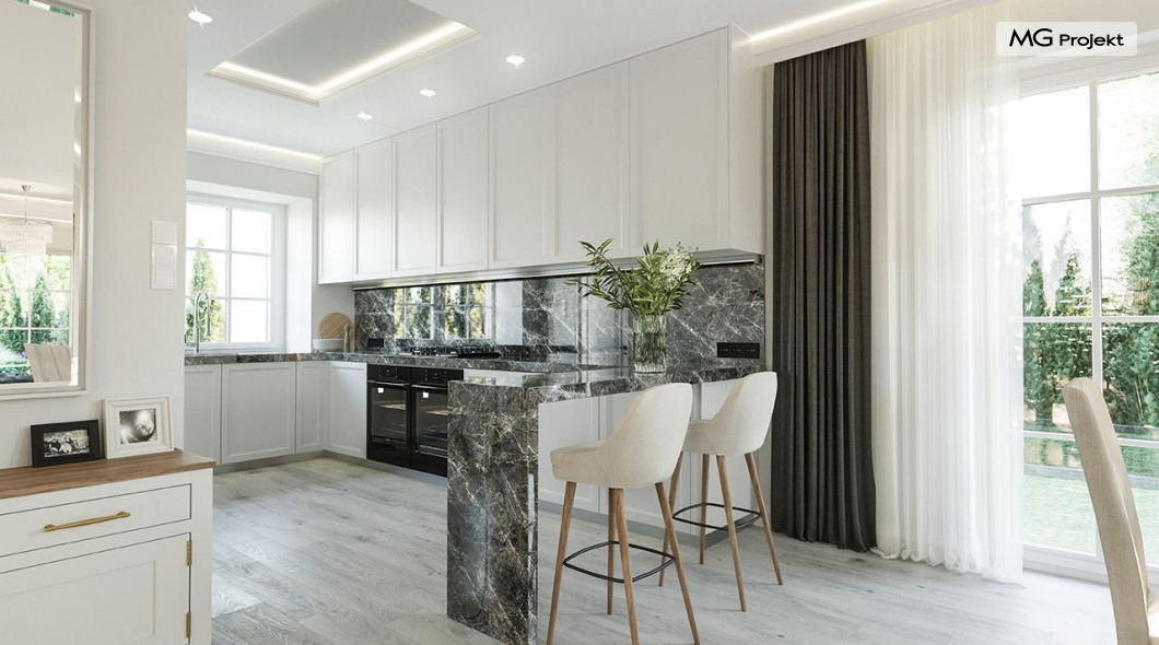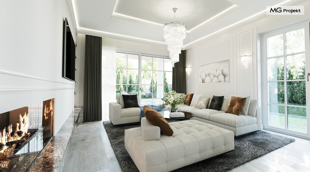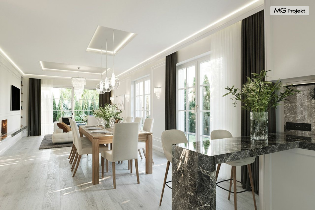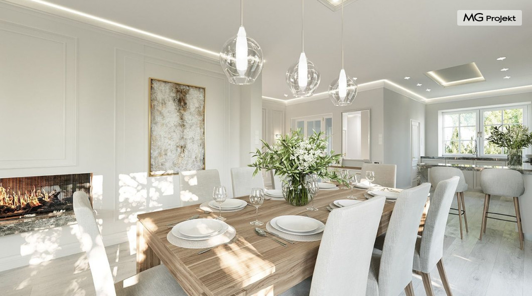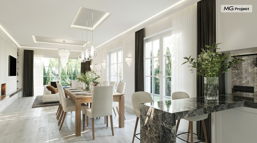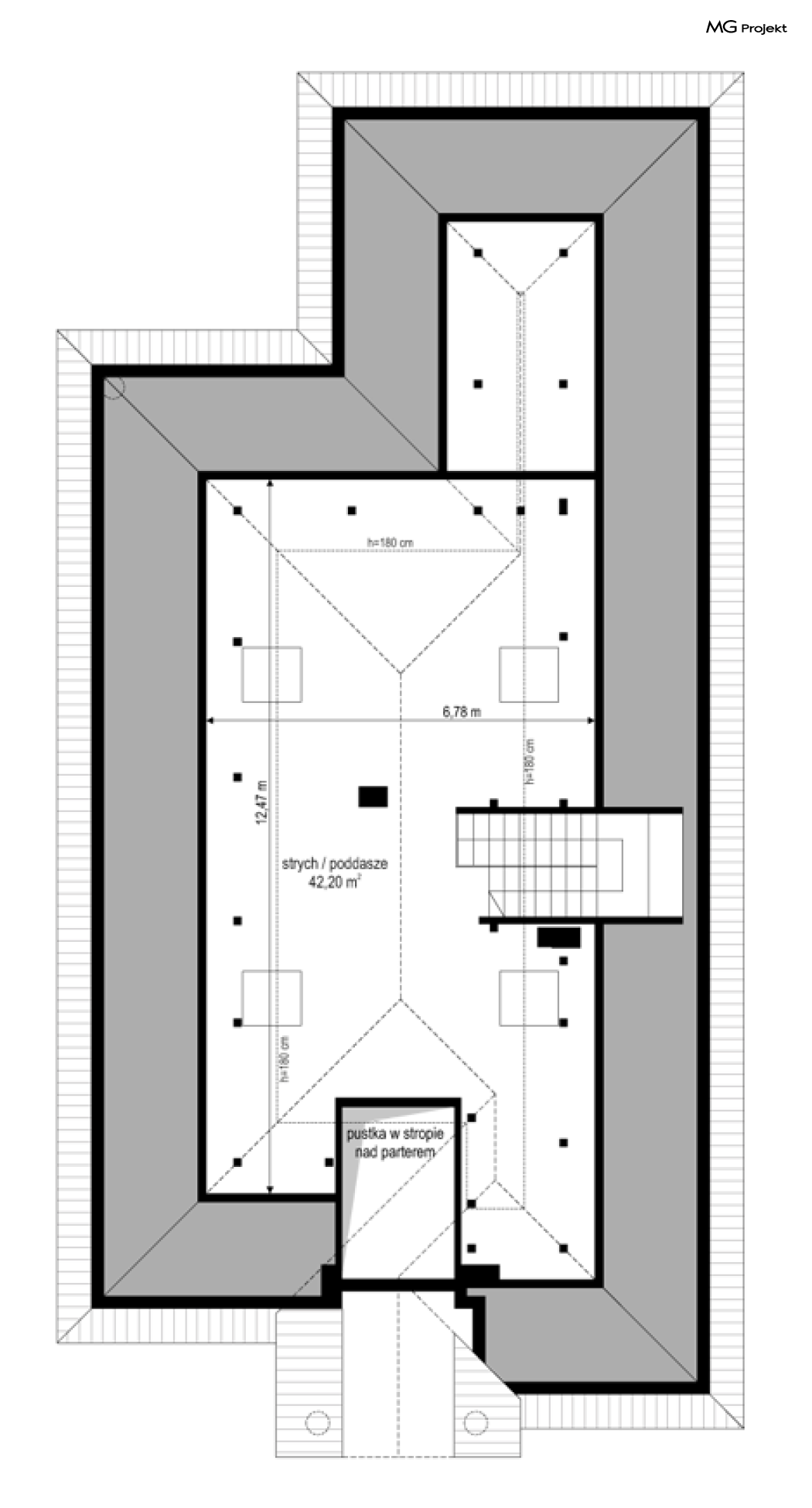 Projekt domu Dom na parkowej 7A jest kolejną propozycją projektu z cieszącej się popularnością serii „Dom na Parkowej”. Budynek zaprojektowano za planie prostokąta, jako podłużną, dość wąską bryłę przykrytą czterospadowym dachem, z dobudowaną częścią z sypialnią rodziców, a od frontu z wystającym garażem. Projekt domu Dom na parkowej 7A to idealna propozycja na wąską działkę o szerokości poniżej 19 metrów. Cała funkcja budynku mieści się na jednej kondygnacji, na parterze, dając mieszkańcom komfort i luksus życia na jednym poziomie - blisko ogrodu. Obszerny strych nad parterem można zaadaptować na dodatkowe poddasze użytkowe z pomieszczeniami, albo pozostawić go jako domowy magazyn. Architektura Domu Parkowego 7A nawiązuje do innych modeli z tej serii – stylizowanych na klasyczne podmiejskie wille, z dworkowo-rezydencyjnymi detalami. Do domu wchodzimy przez piękny przedsionek z łukowym sklepieniem, przez wejściowe drzwi z naświetlami, do przedsionka i wnętrza. Od strony ogrodowej mamy zaprojektowane ogrodowe patio przesłonięte ścianami w układzie litery „L”, z zadaszonym podcieniem nad tarasem. Wnętrze domu to jednoprzestrzenne wnętrze salonu, holu i kuchni, cześć gospodarczo –garażowa, oraz część nocna z sypialniami dzieci i rodziców oraz łazienką. Wnętrze ma przewidziane szafy i praktyczne schowki, każde z pomieszczeń jest ustawne i funkcjonalne. Zapasowa przestrzeń strychu może być dodatkowo zaadaptowana na powierzchnię użytkową i włączona do domu powiększając go znacznie. Dom ma dość prostą konstrukcję i nie powinien być trudny w realizacji. Z kolei bardzo dobre izolacje termiczne i zastosowane nowoczesne instalacje sprawią, że budynek będzie tani w późniejszym utrzymaniu i eksploatacji. Projekt domu Dom na parkowej 7A to idealna propozycja dla Inwestorów lubiących klasyczną architekturę, posiadających wąską parcelę, planujących budowę domu parterowego i dysponujących niewygórowanym budżetem. Zapraszamy do zapoznania się z pełną ofertą pracowni MG Projekt: projekt domu Dom na parkowej, projekt domu Dom na parkowej 2, projekt domu Dom na parkowej 3, projekt domu Dom na parkowej 4, projekt domu Dom na parkowej 5, projekt domu Dom na parkowej 6, projekt domu Dom na parkowej 7 B.