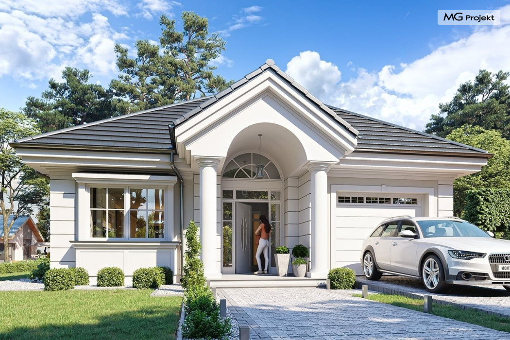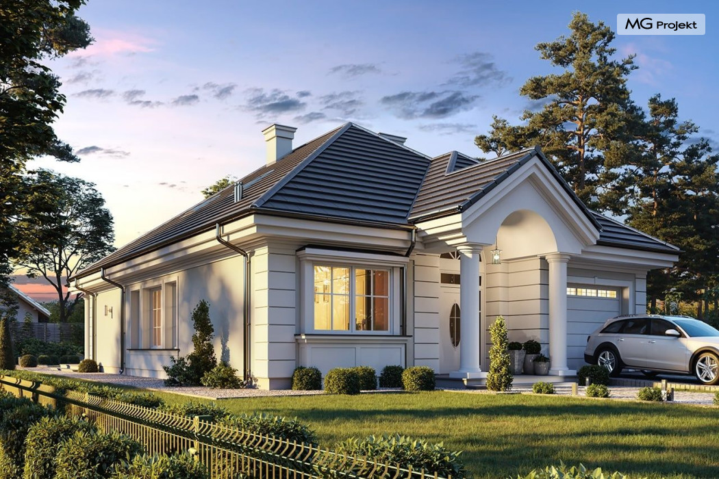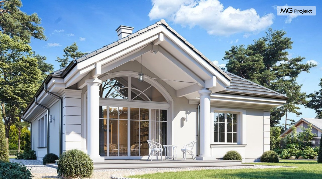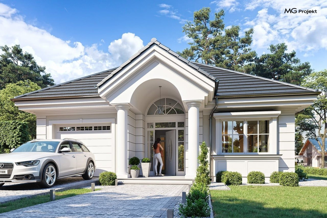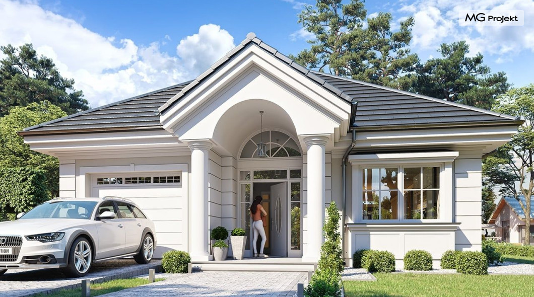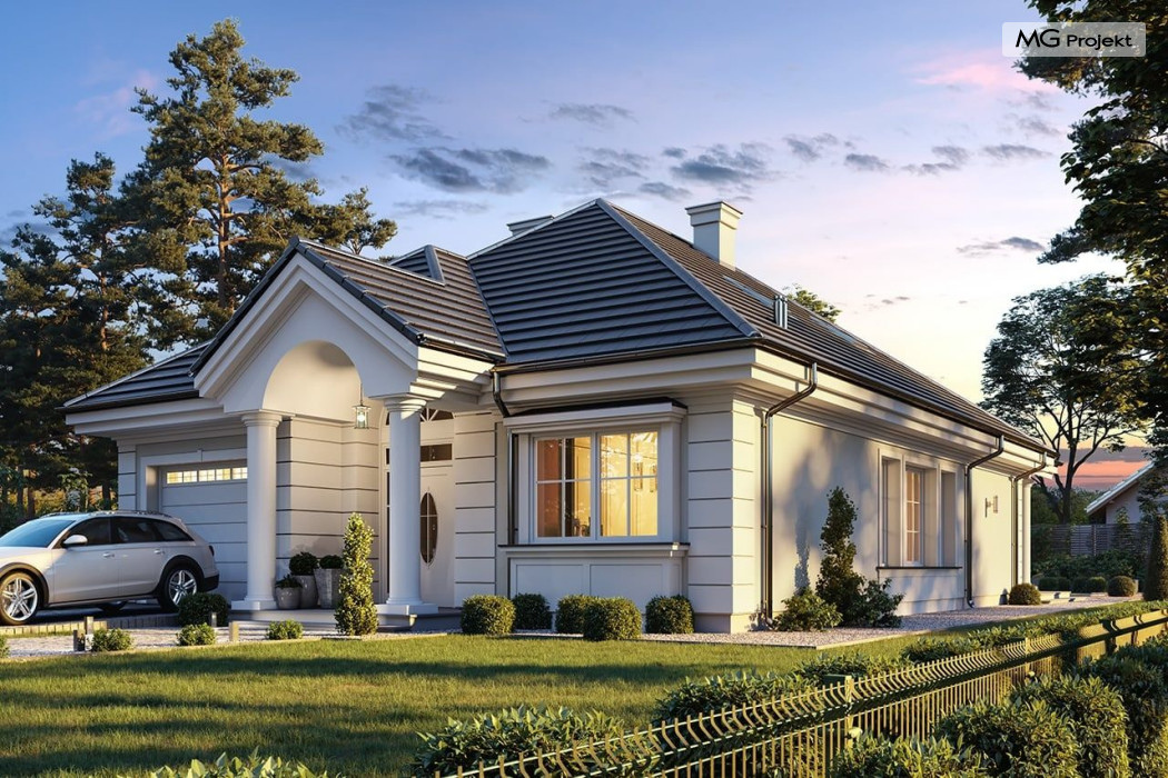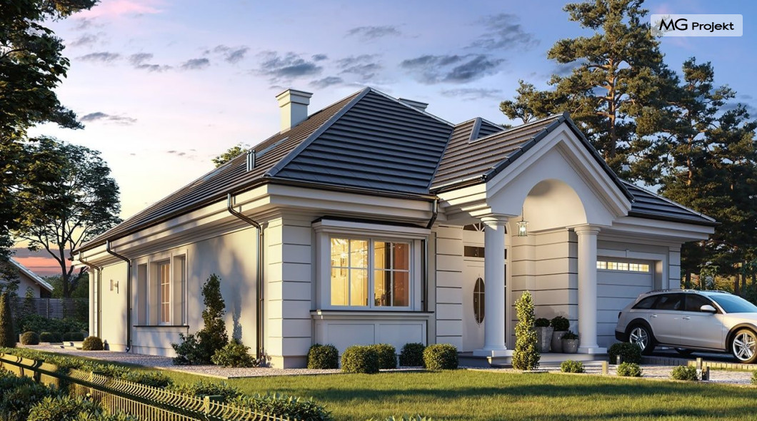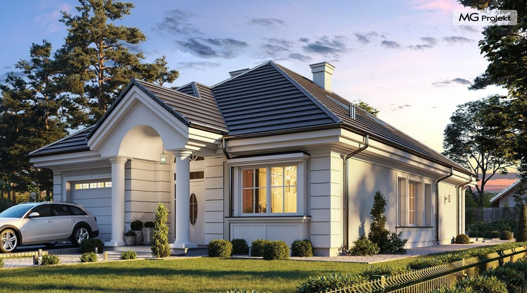 Projekt domu Dom na parkowej 7B to kolejny projekt z cieszącej się popularnością serii projektów: Dom na Parkowej. Budynek zaprojektowano w podobnej stylistyce do innych „parkowych”, z zastosowaniem identycznych detali, ale jego bryła jest zasadniczo inna - przystosowana do budowy domu na wąskiej działce, mającej szerokość nawet poniżej 18-tu metrów. Projekt domu Dom na parkowej 7B zakomponowano na planie prostokąta, którego krótszy bok przylega do frontu działki i drogi dojazdowej. Bryłę przykryto czterospadowych dachem o kącie nachylenia 35 stopni, skrywającym w sobie poddasze użytkowe z sypialniami dziecięcymi. Do domu wchodzimy reprezentacyjnym portykiem wejściowym, z łukowym sklepieniem i frontowymi drzwiami z naświetlami wprost do przedsionka i wnętrza budynku. Po obu stronach podcienia wejściowego pozostają : duże kuchenne okno, oraz wrota garażowe. Od strony elewacji tylnej - ogrodowej, mamy uroczy zadaszony taras z pięknym szerokim oknem salonu z łukowym naświetlem, łączącym wnętrze z tarasem i otaczającym dom ogrodem. Na parterze budynku przewidziano przestrzeń dzienną połączonego salonu, holu i kuchni, dalej część gospodarczą, z garażem, kotłownią i pralnią, oraz apartament rodziców z sypialnią, łazienką i garderobą. Na poddaszu mamy trzy pokoje, oraz łazienkę. Nad częścią salonu przewidziano otwarcie przestrzenne – pustkę, odkrywającą sufit, aby uzyskać więcej oddechu, urozmaicić salon i otworzyć się na piękne wysokie okno na taras. Dom na Parkowej 7B to elegancka, reprezentacyjna niewielka willa. Projekt domu Dom na parkowej 7B zaprojektowany z klasą i smakiem, przewidziany na niedużą działkę i obliczony na rozsądny budżet. Budynek ma zwartą bryłę i prostą konstrukcję. Budowa domu nie powinna przysporzyć wielu kłopotów, a koszty eksploatacji, dzięki doskonałym izolacjom i nowoczesnym instalacjom będą niskie. Projekt domu Dom na parkowej 7B to doskonała propozycja dla Inwestorów lubiących klasyczną architekturę podmiejskich willi i dworku polskiego, ale planujących zmieścić się w sensownym budżecie z samą budową. Zapraszamy do zapoznania się z pełną ofertą pracowni MG Projekt: projekt domu Dom na parkowej, projekt domu Dom na parkowej 2, projekt domu Dom na parkowej 3, projekt domu Dom na parkowej 4, projekt domu Dom na parkowej 5, projekt domu Dom na parkowej 6, projekt domu Dom na parkowej 7 A.