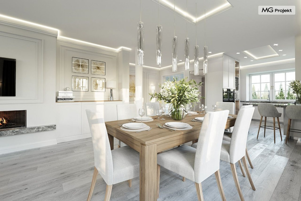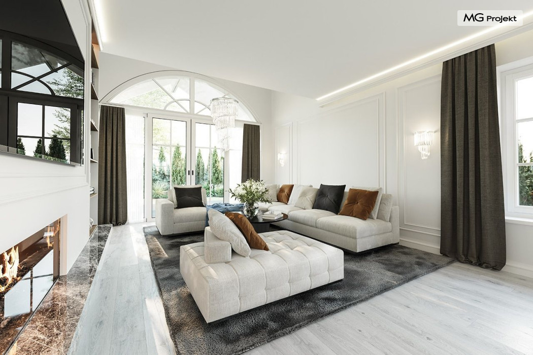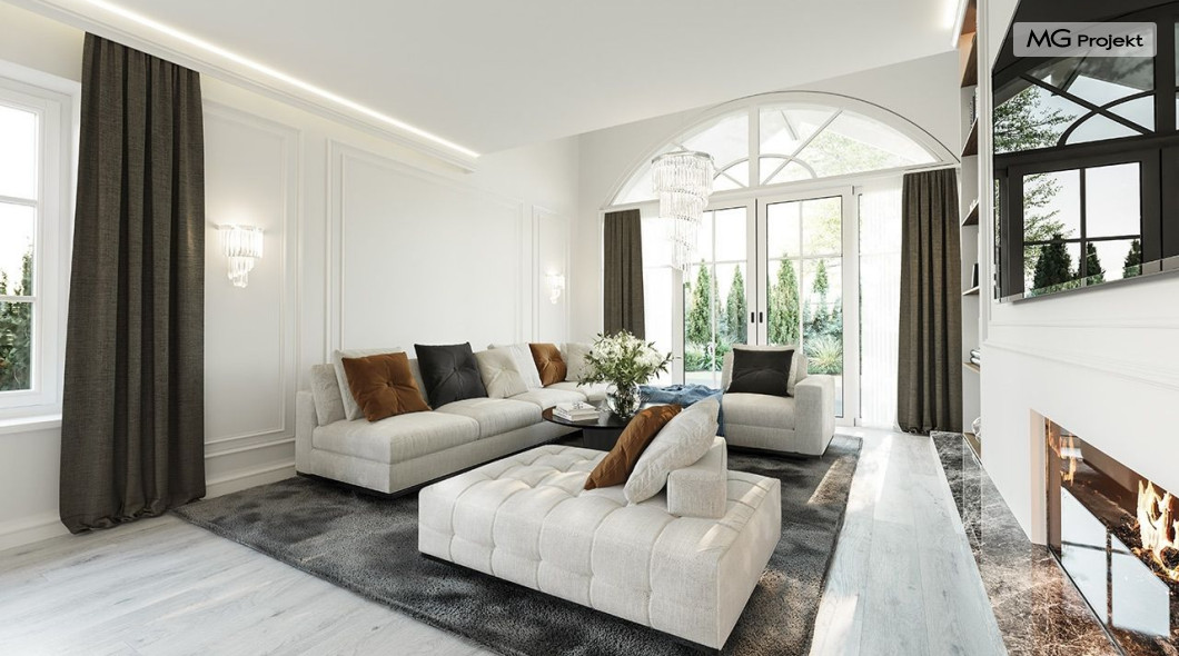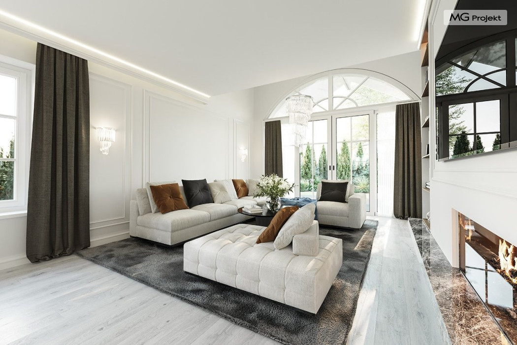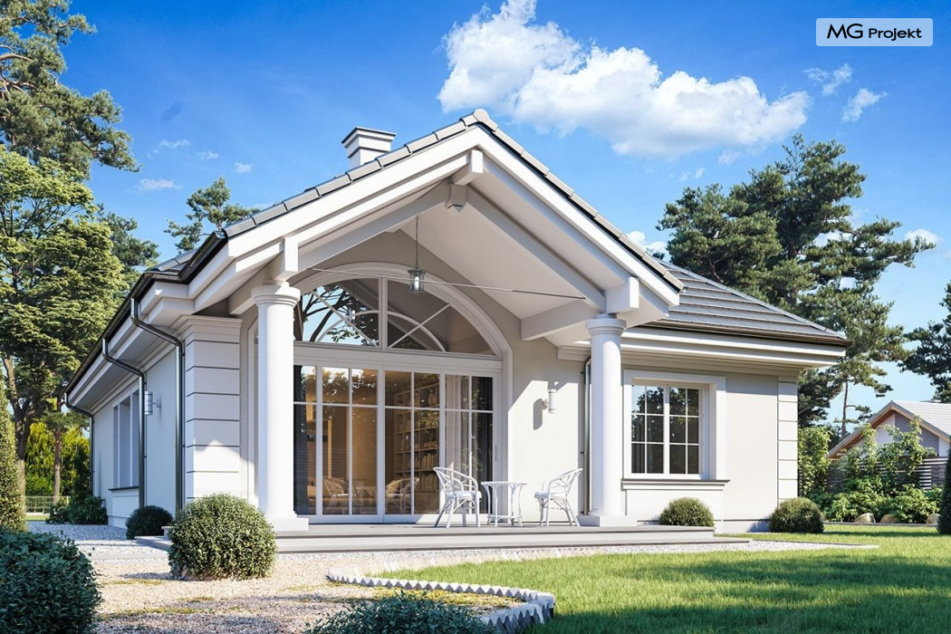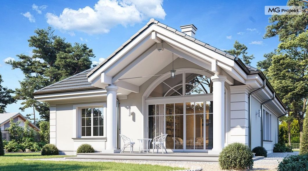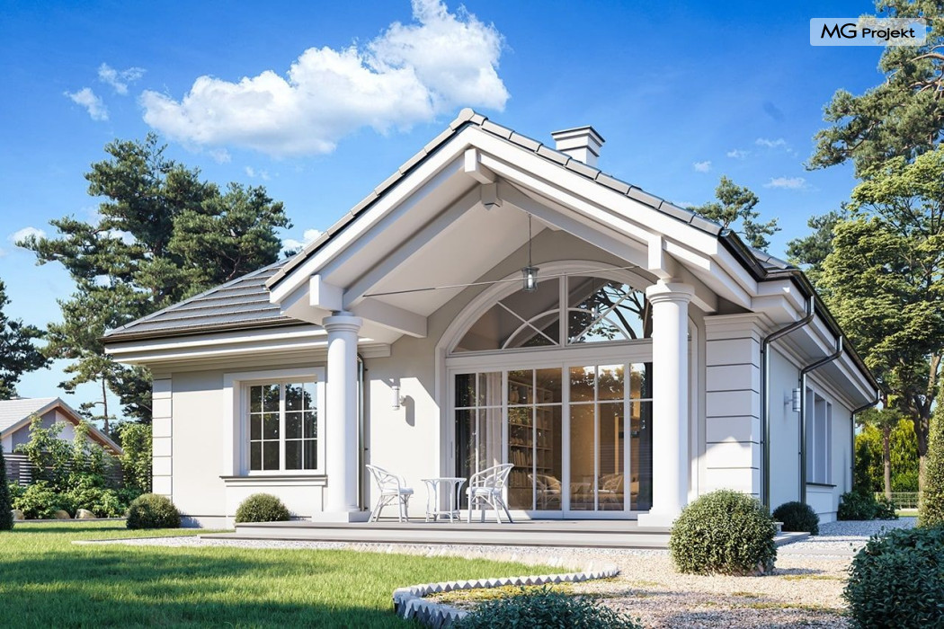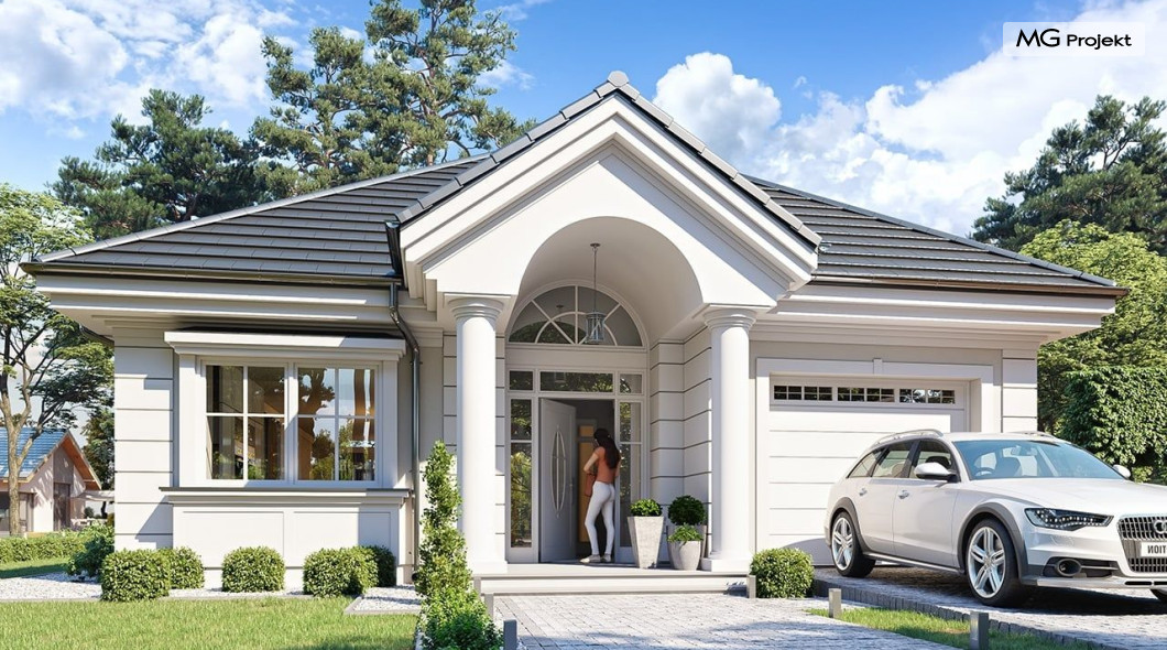 Projekt domu Dom na parkowej 7B to kolejny projekt z cieszącej się popularnością serii projektów: Dom na Parkowej. Budynek zaprojektowano w podobnej stylistyce do innych „parkowych”, z zastosowaniem identycznych detali, ale jego bryła jest zasadniczo inna - przystosowana do budowy domu na wąskiej działce, mającej szerokość nawet poniżej 18-tu metrów. Projekt domu Dom na parkowej 7B zakomponowano na planie prostokąta, którego krótszy bok przylega do frontu działki i drogi dojazdowej. Bryłę przykryto czterospadowych dachem o kącie nachylenia 35 stopni, skrywającym w sobie poddasze użytkowe z sypialniami dziecięcymi. Do domu wchodzimy reprezentacyjnym portykiem wejściowym, z łukowym sklepieniem i frontowymi drzwiami z naświetlami wprost do przedsionka i wnętrza budynku. Po obu stronach podcienia wejściowego pozostają : duże kuchenne okno, oraz wrota garażowe. Od strony elewacji tylnej - ogrodowej, mamy uroczy zadaszony taras z pięknym szerokim oknem salonu z łukowym naświetlem, łączącym wnętrze z tarasem i otaczającym dom ogrodem. Na parterze budynku przewidziano przestrzeń dzienną połączonego salonu, holu i kuchni, dalej część gospodarczą, z garażem, kotłownią i pralnią, oraz apartament rodziców z sypialnią, łazienką i garderobą. Na poddaszu mamy trzy pokoje, oraz łazienkę. Nad częścią salonu przewidziano otwarcie przestrzenne – pustkę, odkrywającą sufit, aby uzyskać więcej oddechu, urozmaicić salon i otworzyć się na piękne wysokie okno na taras. Dom na Parkowej 7B to elegancka, reprezentacyjna niewielka willa. Projekt domu Dom na parkowej 7B zaprojektowany z klasą i smakiem, przewidziany na niedużą działkę i obliczony na rozsądny budżet. Budynek ma zwartą bryłę i prostą konstrukcję. Budowa domu nie powinna przysporzyć wielu kłopotów, a koszty eksploatacji, dzięki doskonałym izolacjom i nowoczesnym instalacjom będą niskie. Projekt domu Dom na parkowej 7B to doskonała propozycja dla Inwestorów lubiących klasyczną architekturę podmiejskich willi i dworku polskiego, ale planujących zmieścić się w sensownym budżecie z samą budową. Zapraszamy do zapoznania się z pełną ofertą pracowni MG Projekt: projekt domu Dom na parkowej, projekt domu Dom na parkowej 2, projekt domu Dom na parkowej 3, projekt domu Dom na parkowej 4, projekt domu Dom na parkowej 5, projekt domu Dom na parkowej 6, projekt domu Dom na parkowej 7 A.