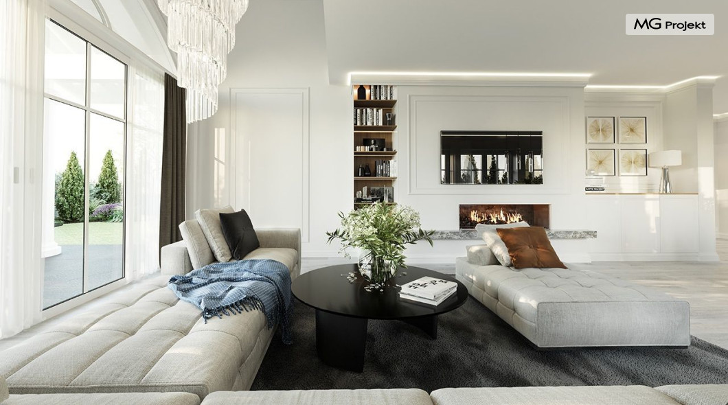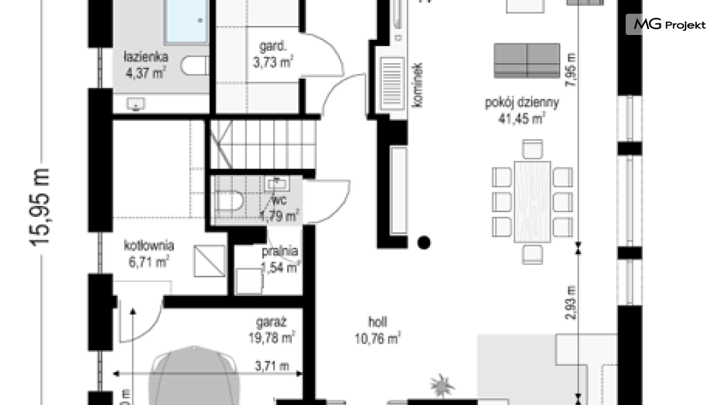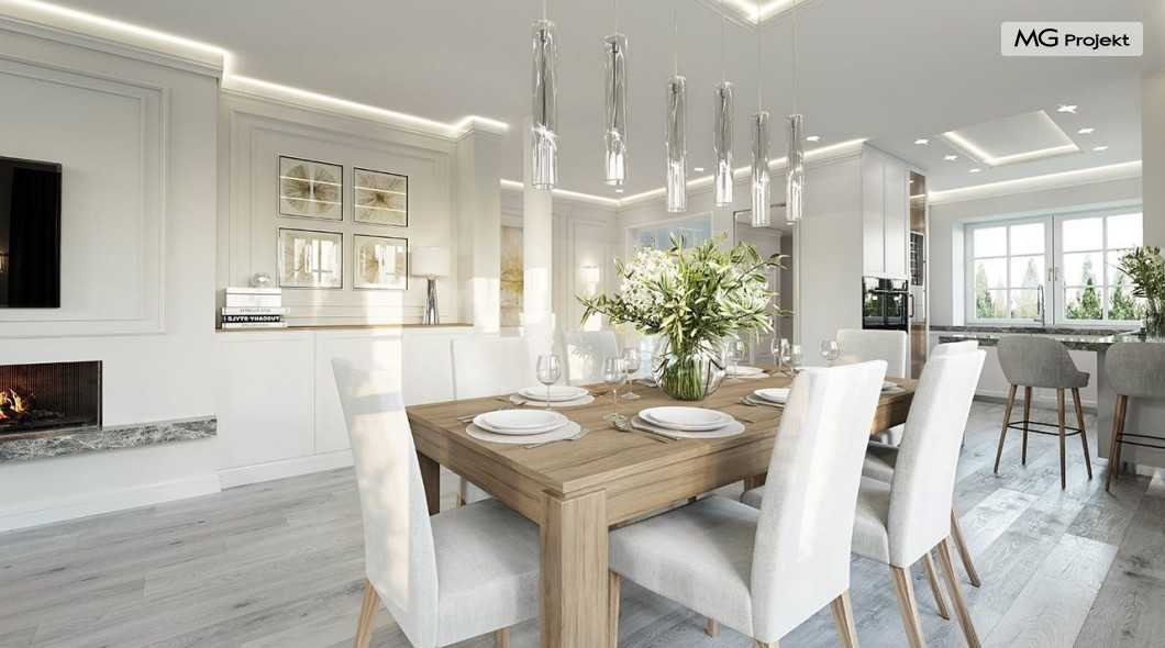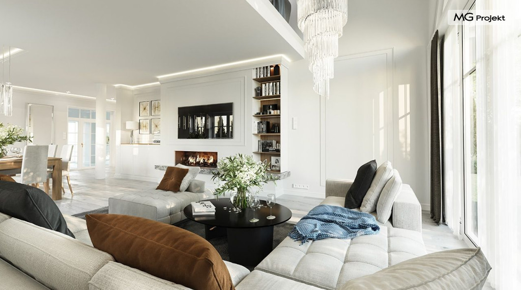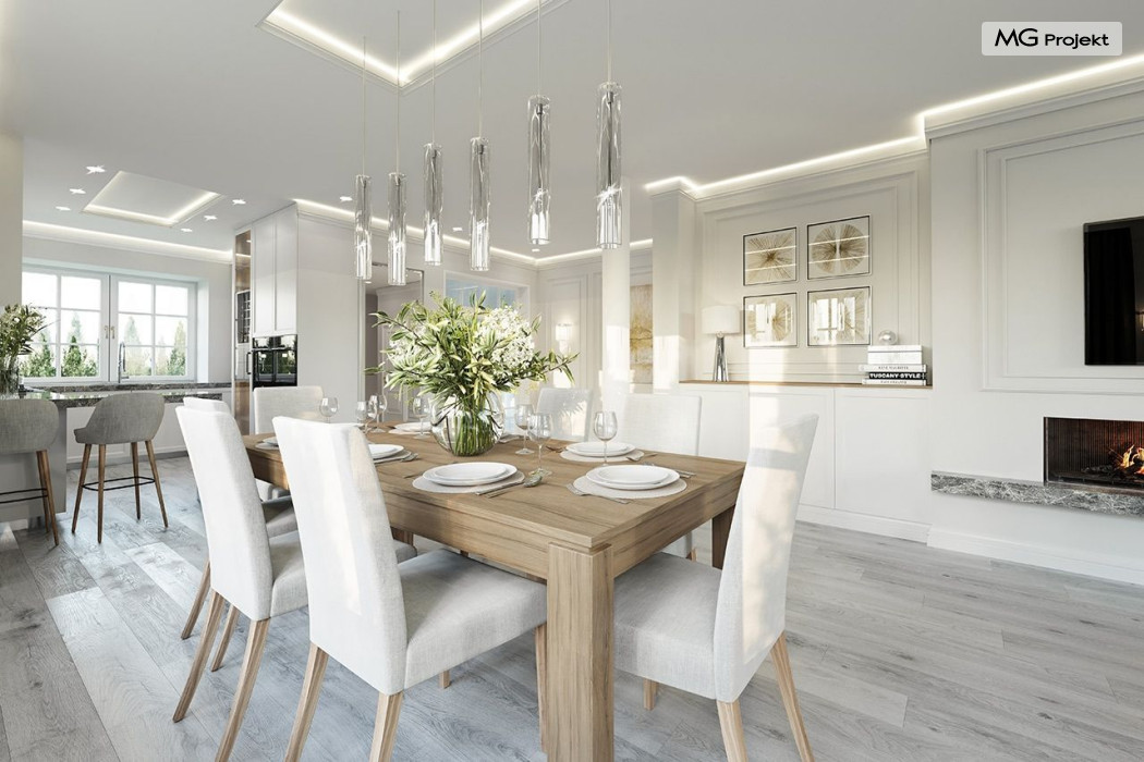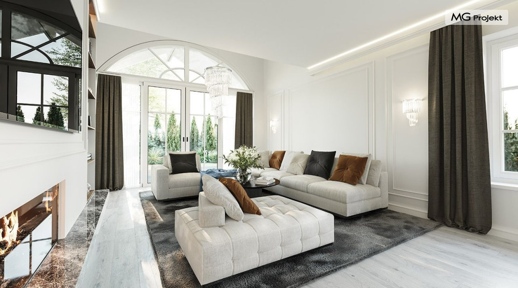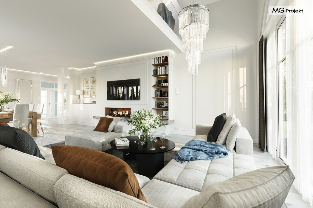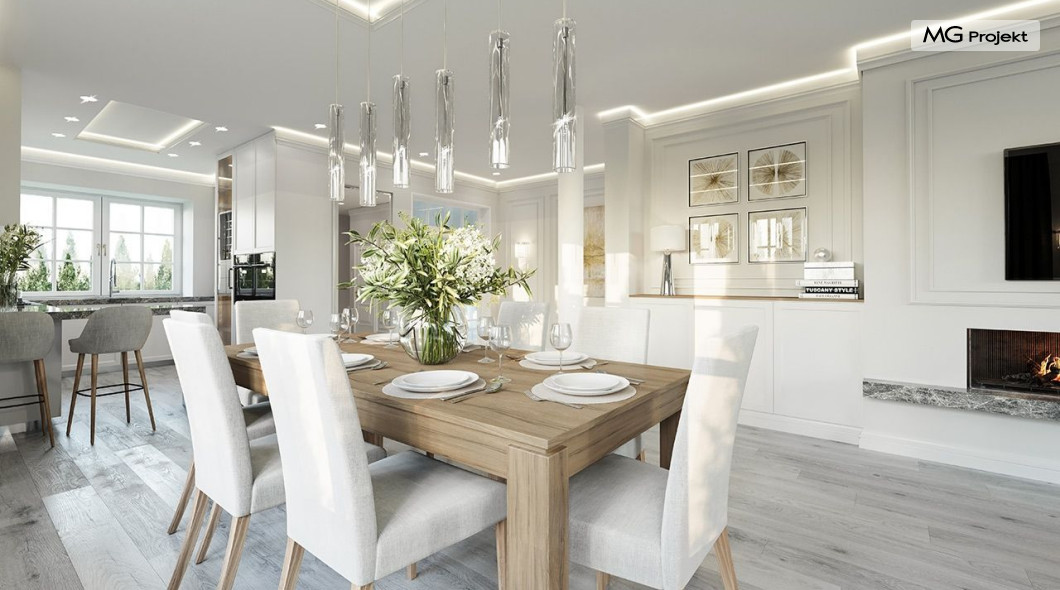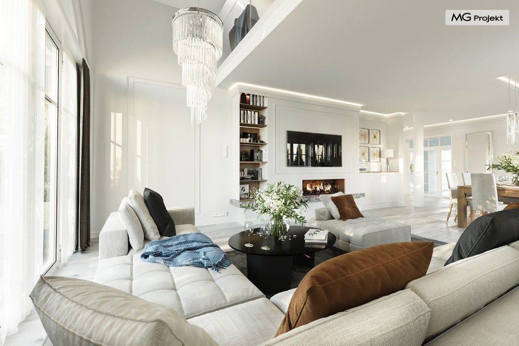 Projekt domu Dom na parkowej 7B to kolejny projekt z cieszącej się popularnością serii projektów: Dom na Parkowej. Budynek zaprojektowano w podobnej stylistyce do innych „parkowych”, z zastosowaniem identycznych detali, ale jego bryła jest zasadniczo inna - przystosowana do budowy domu na wąskiej działce, mającej szerokość nawet poniżej 18-tu metrów. Projekt domu Dom na parkowej 7B zakomponowano na planie prostokąta, którego krótszy bok przylega do frontu działki i drogi dojazdowej. Bryłę przykryto czterospadowych dachem o kącie nachylenia 35 stopni, skrywającym w sobie poddasze użytkowe z sypialniami dziecięcymi. Do domu wchodzimy reprezentacyjnym portykiem wejściowym, z łukowym sklepieniem i frontowymi drzwiami z naświetlami wprost do przedsionka i wnętrza budynku. Po obu stronach podcienia wejściowego pozostają : duże kuchenne okno, oraz wrota garażowe. Od strony elewacji tylnej - ogrodowej, mamy uroczy zadaszony taras z pięknym szerokim oknem salonu z łukowym naświetlem, łączącym wnętrze z tarasem i otaczającym dom ogrodem. Na parterze budynku przewidziano przestrzeń dzienną połączonego salonu, holu i kuchni, dalej część gospodarczą, z garażem, kotłownią i pralnią, oraz apartament rodziców z sypialnią, łazienką i garderobą. Na poddaszu mamy trzy pokoje, oraz łazienkę. Nad częścią salonu przewidziano otwarcie przestrzenne – pustkę, odkrywającą sufit, aby uzyskać więcej oddechu, urozmaicić salon i otworzyć się na piękne wysokie okno na taras. Dom na Parkowej 7B to elegancka, reprezentacyjna niewielka willa. Projekt domu Dom na parkowej 7B zaprojektowany z klasą i smakiem, przewidziany na niedużą działkę i obliczony na rozsądny budżet. Budynek ma zwartą bryłę i prostą konstrukcję. Budowa domu nie powinna przysporzyć wielu kłopotów, a koszty eksploatacji, dzięki doskonałym izolacjom i nowoczesnym instalacjom będą niskie. Projekt domu Dom na parkowej 7B to doskonała propozycja dla Inwestorów lubiących klasyczną architekturę podmiejskich willi i dworku polskiego, ale planujących zmieścić się w sensownym budżecie z samą budową. Zapraszamy do zapoznania się z pełną ofertą pracowni MG Projekt: projekt domu Dom na parkowej, projekt domu Dom na parkowej 2, projekt domu Dom na parkowej 3, projekt domu Dom na parkowej 4, projekt domu Dom na parkowej 5, projekt domu Dom na parkowej 6, projekt domu Dom na parkowej 7 A.
