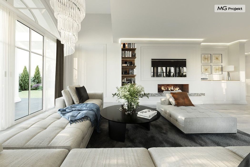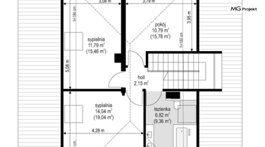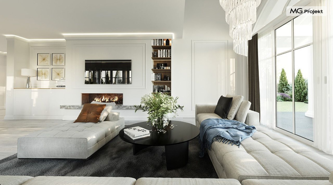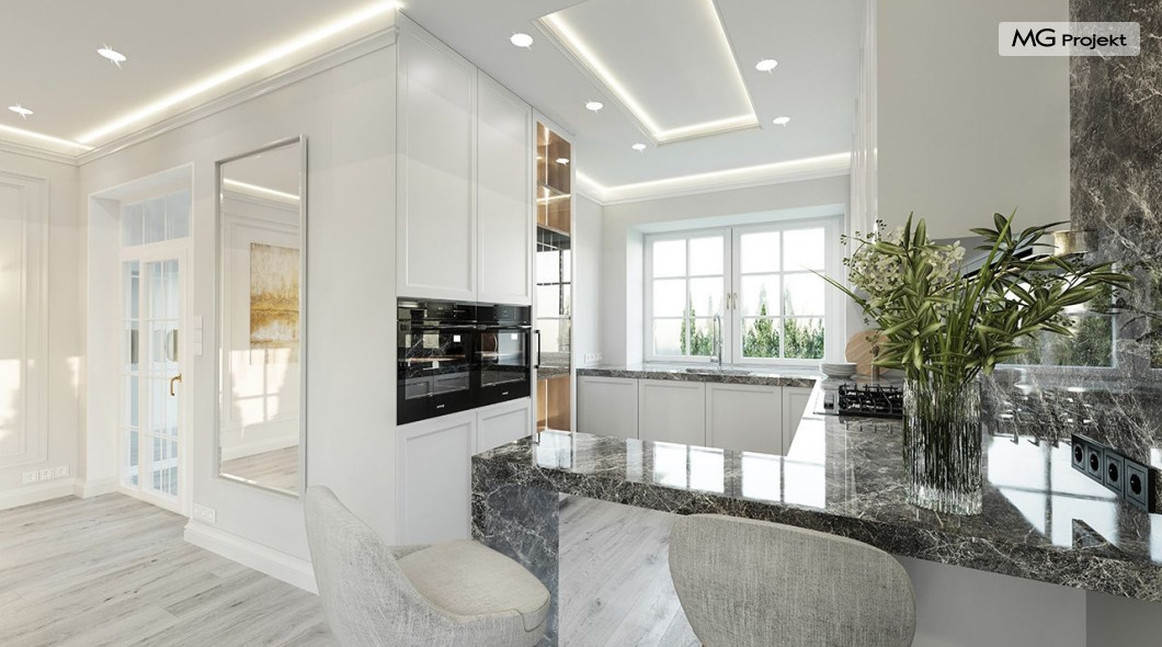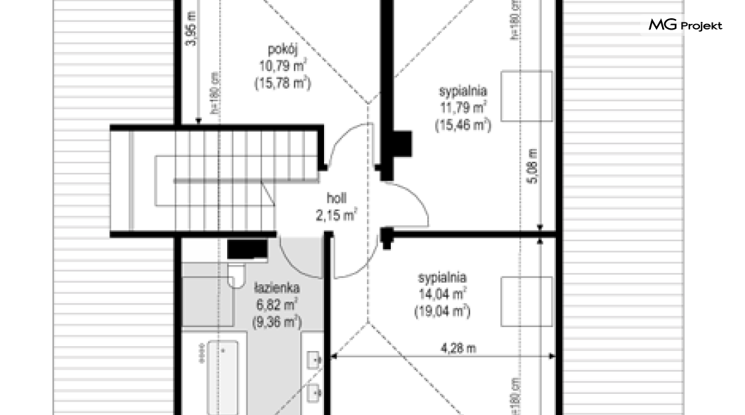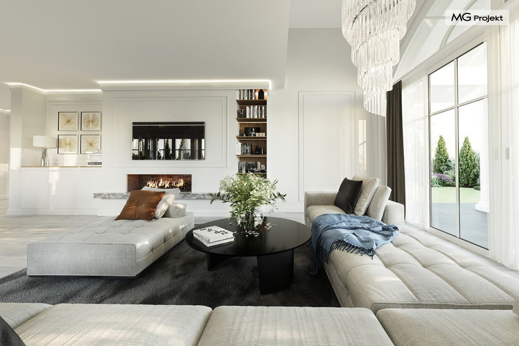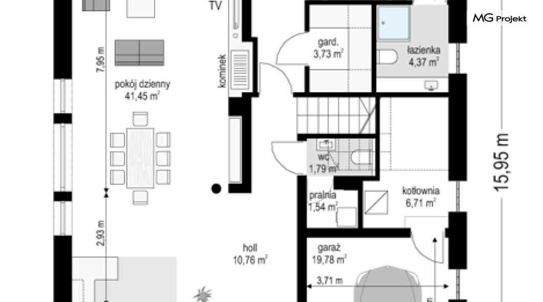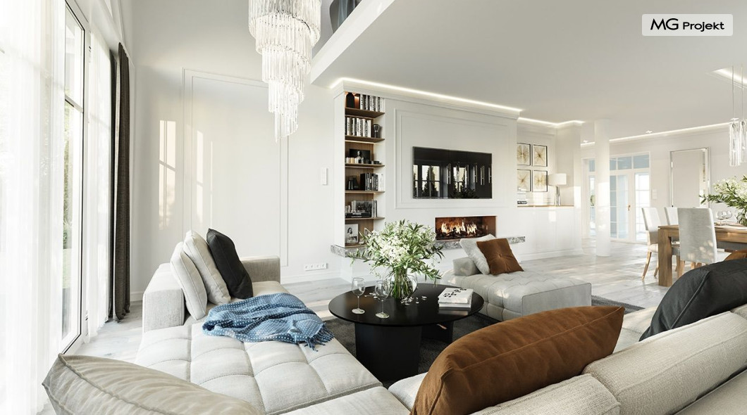 Projekt domu Dom na parkowej 7B to kolejny projekt z cieszącej się popularnością serii projektów: Dom na Parkowej. Budynek zaprojektowano w podobnej stylistyce do innych „parkowych”, z zastosowaniem identycznych detali, ale jego bryła jest zasadniczo inna - przystosowana do budowy domu na wąskiej działce, mającej szerokość nawet poniżej 18-tu metrów. Projekt domu Dom na parkowej 7B zakomponowano na planie prostokąta, którego krótszy bok przylega do frontu działki i drogi dojazdowej. Bryłę przykryto czterospadowych dachem o kącie nachylenia 35 stopni, skrywającym w sobie poddasze użytkowe z sypialniami dziecięcymi. Do domu wchodzimy reprezentacyjnym portykiem wejściowym, z łukowym sklepieniem i frontowymi drzwiami z naświetlami wprost do przedsionka i wnętrza budynku. Po obu stronach podcienia wejściowego pozostają : duże kuchenne okno, oraz wrota garażowe. Od strony elewacji tylnej - ogrodowej, mamy uroczy zadaszony taras z pięknym szerokim oknem salonu z łukowym naświetlem, łączącym wnętrze z tarasem i otaczającym dom ogrodem. Na parterze budynku przewidziano przestrzeń dzienną połączonego salonu, holu i kuchni, dalej część gospodarczą, z garażem, kotłownią i pralnią, oraz apartament rodziców z sypialnią, łazienką i garderobą. Na poddaszu mamy trzy pokoje, oraz łazienkę. Nad częścią salonu przewidziano otwarcie przestrzenne – pustkę, odkrywającą sufit, aby uzyskać więcej oddechu, urozmaicić salon i otworzyć się na piękne wysokie okno na taras. Dom na Parkowej 7B to elegancka, reprezentacyjna niewielka willa. Projekt domu Dom na parkowej 7B zaprojektowany z klasą i smakiem, przewidziany na niedużą działkę i obliczony na rozsądny budżet. Budynek ma zwartą bryłę i prostą konstrukcję. Budowa domu nie powinna przysporzyć wielu kłopotów, a koszty eksploatacji, dzięki doskonałym izolacjom i nowoczesnym instalacjom będą niskie. Projekt domu Dom na parkowej 7B to doskonała propozycja dla Inwestorów lubiących klasyczną architekturę podmiejskich willi i dworku polskiego, ale planujących zmieścić się w sensownym budżecie z samą budową. Zapraszamy do zapoznania się z pełną ofertą pracowni MG Projekt: projekt domu Dom na parkowej, projekt domu Dom na parkowej 2, projekt domu Dom na parkowej 3, projekt domu Dom na parkowej 4, projekt domu Dom na parkowej 5, projekt domu Dom na parkowej 6, projekt domu Dom na parkowej 7 A.