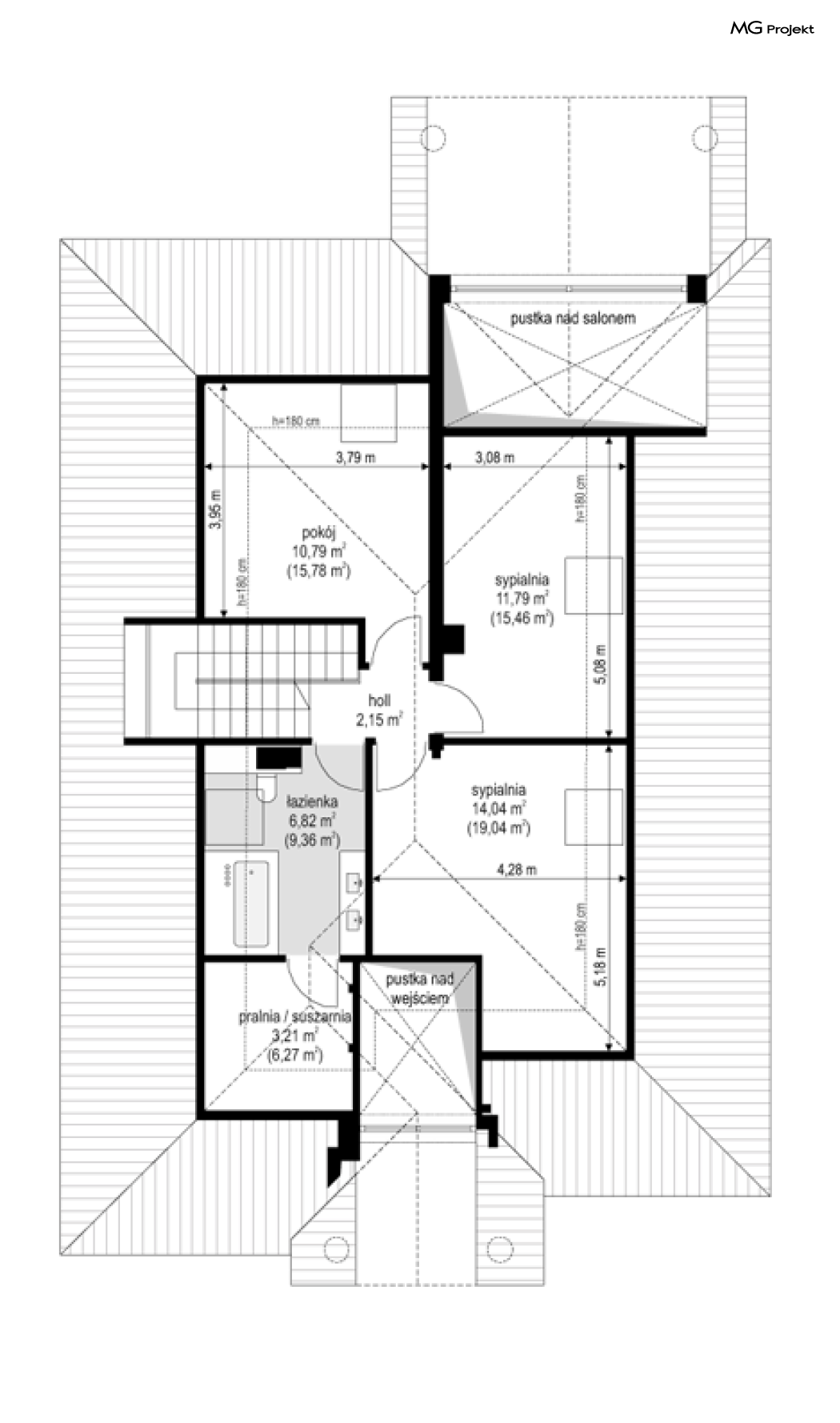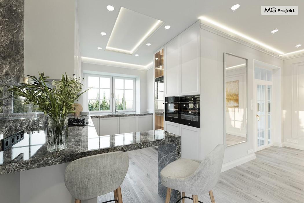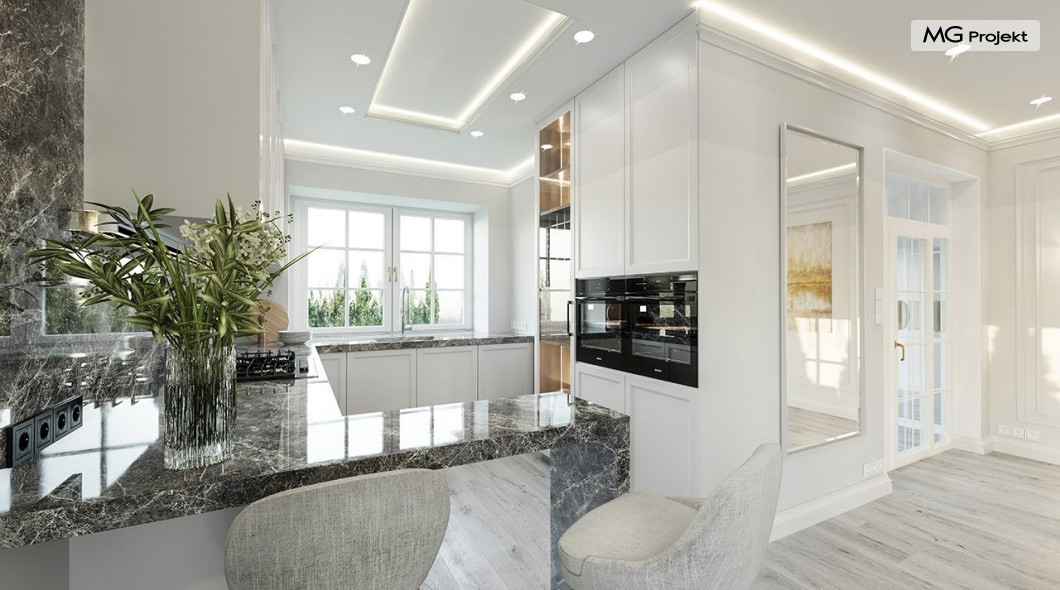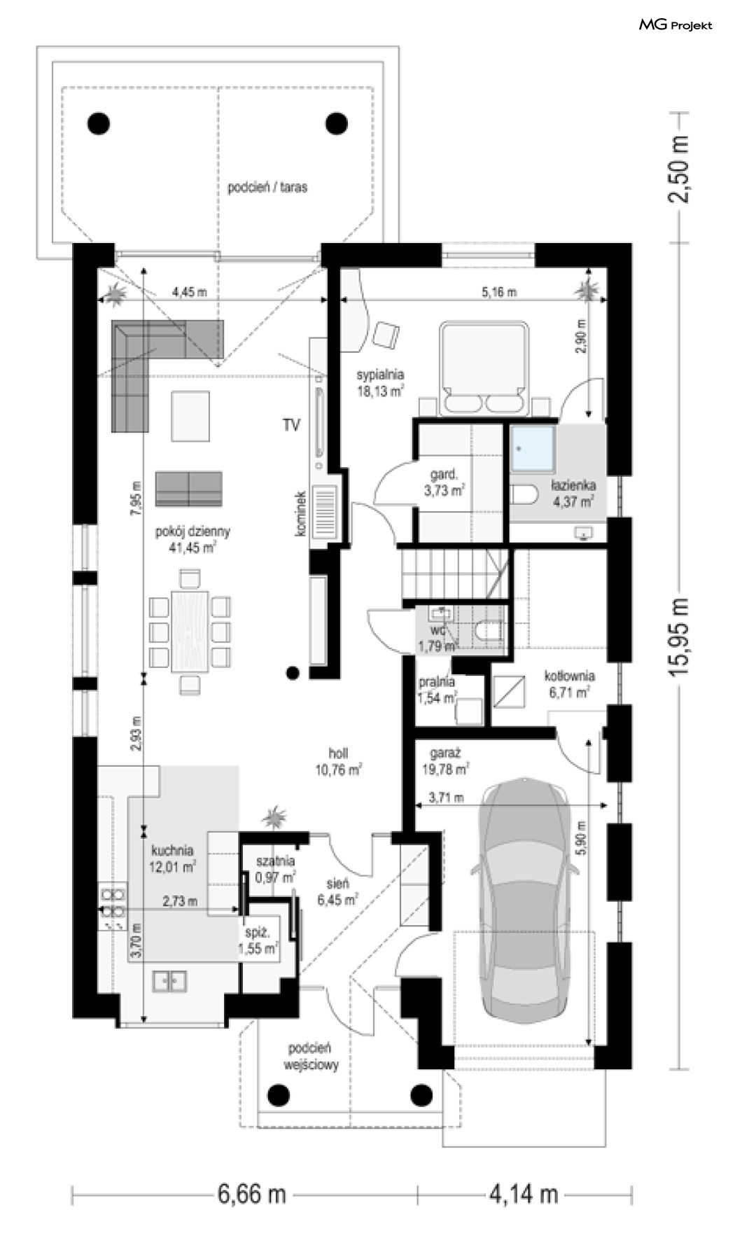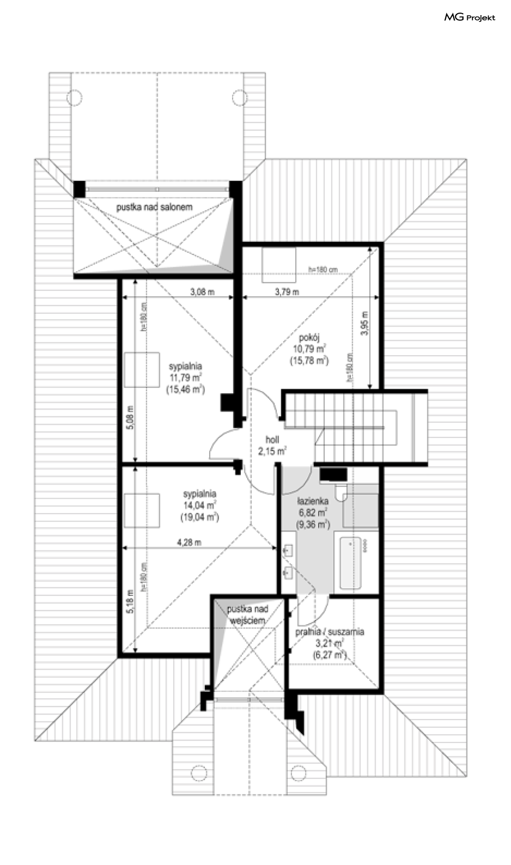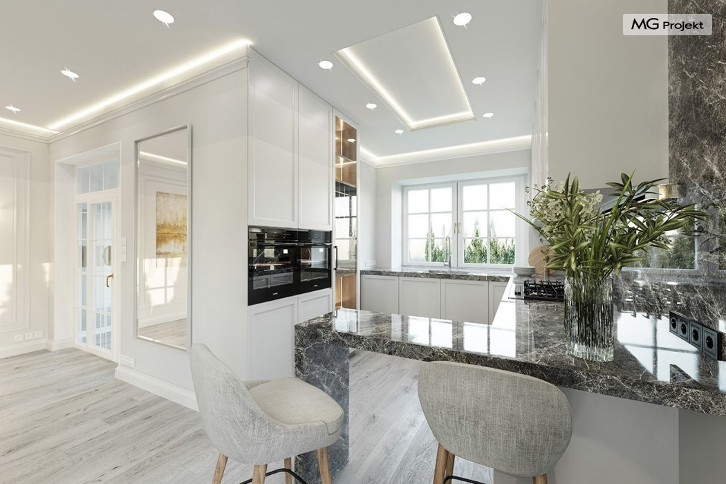 Projekt domu Dom na parkowej 7B to kolejny projekt z cieszącej się popularnością serii projektów: Dom na Parkowej. Budynek zaprojektowano w podobnej stylistyce do innych „parkowych”, z zastosowaniem identycznych detali, ale jego bryła jest zasadniczo inna - przystosowana do budowy domu na wąskiej działce, mającej szerokość nawet poniżej 18-tu metrów. Projekt domu Dom na parkowej 7B zakomponowano na planie prostokąta, którego krótszy bok przylega do frontu działki i drogi dojazdowej. Bryłę przykryto czterospadowych dachem o kącie nachylenia 35 stopni, skrywającym w sobie poddasze użytkowe z sypialniami dziecięcymi. Do domu wchodzimy reprezentacyjnym portykiem wejściowym, z łukowym sklepieniem i frontowymi drzwiami z naświetlami wprost do przedsionka i wnętrza budynku. Po obu stronach podcienia wejściowego pozostają : duże kuchenne okno, oraz wrota garażowe. Od strony elewacji tylnej - ogrodowej, mamy uroczy zadaszony taras z pięknym szerokim oknem salonu z łukowym naświetlem, łączącym wnętrze z tarasem i otaczającym dom ogrodem. Na parterze budynku przewidziano przestrzeń dzienną połączonego salonu, holu i kuchni, dalej część gospodarczą, z garażem, kotłownią i pralnią, oraz apartament rodziców z sypialnią, łazienką i garderobą. Na poddaszu mamy trzy pokoje, oraz łazienkę. Nad częścią salonu przewidziano otwarcie przestrzenne – pustkę, odkrywającą sufit, aby uzyskać więcej oddechu, urozmaicić salon i otworzyć się na piękne wysokie okno na taras. Dom na Parkowej 7B to elegancka, reprezentacyjna niewielka willa. Projekt domu Dom na parkowej 7B zaprojektowany z klasą i smakiem, przewidziany na niedużą działkę i obliczony na rozsądny budżet. Budynek ma zwartą bryłę i prostą konstrukcję. Budowa domu nie powinna przysporzyć wielu kłopotów, a koszty eksploatacji, dzięki doskonałym izolacjom i nowoczesnym instalacjom będą niskie. Projekt domu Dom na parkowej 7B to doskonała propozycja dla Inwestorów lubiących klasyczną architekturę podmiejskich willi i dworku polskiego, ale planujących zmieścić się w sensownym budżecie z samą budową. Zapraszamy do zapoznania się z pełną ofertą pracowni MG Projekt: projekt domu Dom na parkowej, projekt domu Dom na parkowej 2, projekt domu Dom na parkowej 3, projekt domu Dom na parkowej 4, projekt domu Dom na parkowej 5, projekt domu Dom na parkowej 6, projekt domu Dom na parkowej 7 A.