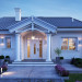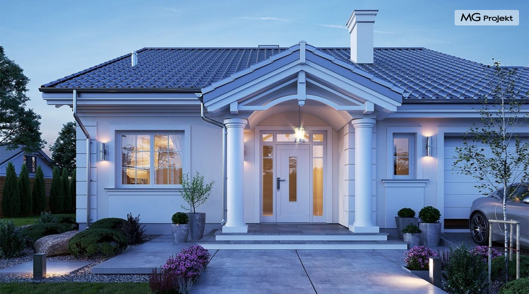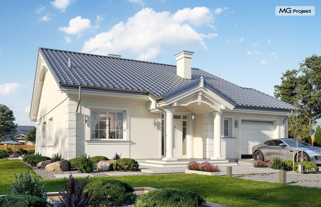 W projekcie domu Parterowy Wąski bryła budynku jest prostokątna, przykryta dwuspadowym dachem, z dobudowanym gankiem wejściowym, oraz wysuniętą sypialnią przykrytą poprzecznym dachem. Elewację frontową projektu Parterowy Wąski ozdobiono pięknym wejściowym portykiem z kolumnami, przez który - przez drzwi z naświetlami wchodzimy do wnętrza. Od strony ogrodowej projekt domu Parterowy Wąski ma szerokie przeszklone drzwi z salonu na taras i podcień. Tradycyjna architektura projektu Parterowy Wąski, zaakcentowane wejście, okna z podziałami, przywołują wrażenie stylowej willi - niewielkiej ale bardzo reprezentacyjnej.
