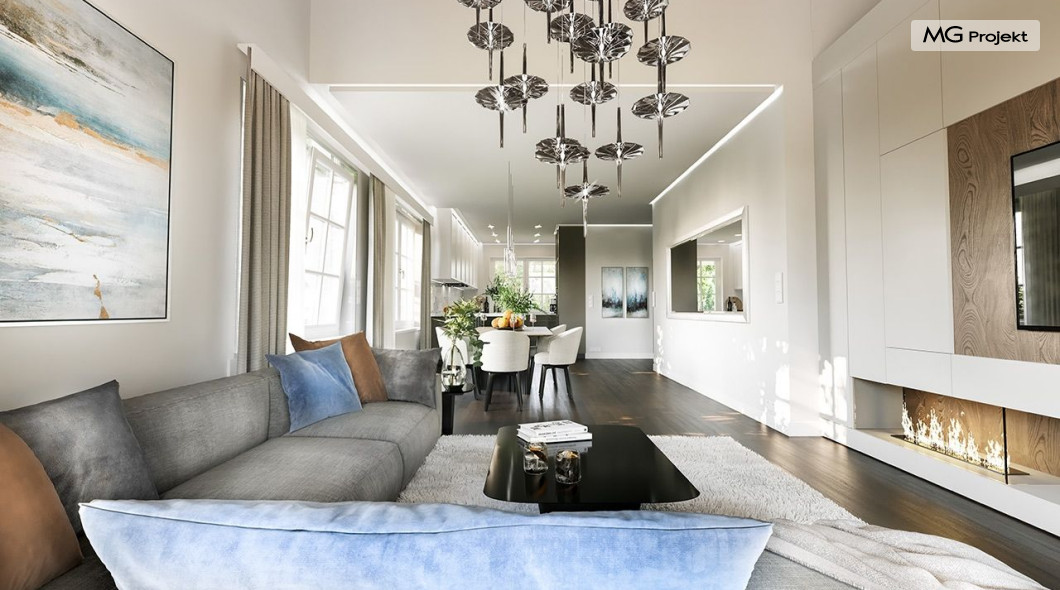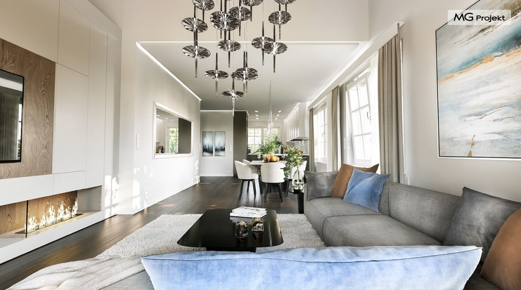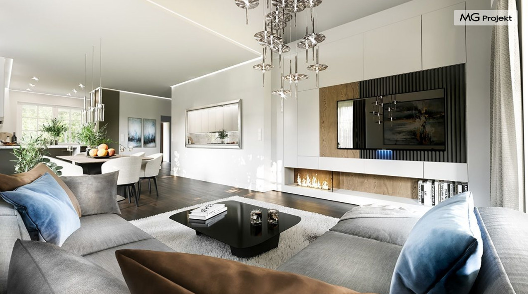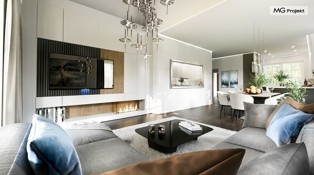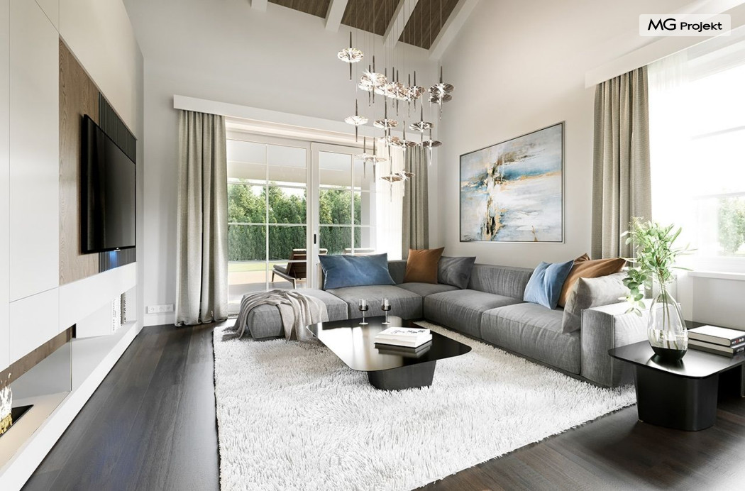 W projekcie domu jednorodzinnego Parterowy Wąski wnętrze parteru podzielone zostało na część dzienną - z salonem, cześć gospodarczą - z garażem i kotłownią, oraz sypialnie. Do wnętrza budynku wchodzimy wygodnym przedsionkiem, do holu połączonego z salonem z jadalnią i kuchnią ze spiżarką. Salon w projekcie domku Parterowy Wąski ma podniesiony aż do dachu sufit nad częścią z meblami wypoczynkowymi, kominkiem i ścianą TV. Na lewo od wejścia z przedsionka projektu Parterowy Wąski przechodzimy do kotłowni i garażu. Przechodząc holem i korytarzem wgłąb domku, trafiamy do sypialni - rodziców z garderobami, dwóch dziecięcych i dużej łazienki. W projekcie domu Parterowy Wąski nad parterem mamy do dyspozycji duży strych, który może być przestrzenią magazynową, lub po doprojektowaniu schodów można go zaadaptować na dodatkowe poddasze użytkowe powiększając w ten sposób powierzchnię użytkową projektu domku Parterowy Wąski – jeśli oczywiście zajdzie taka potrzeba.