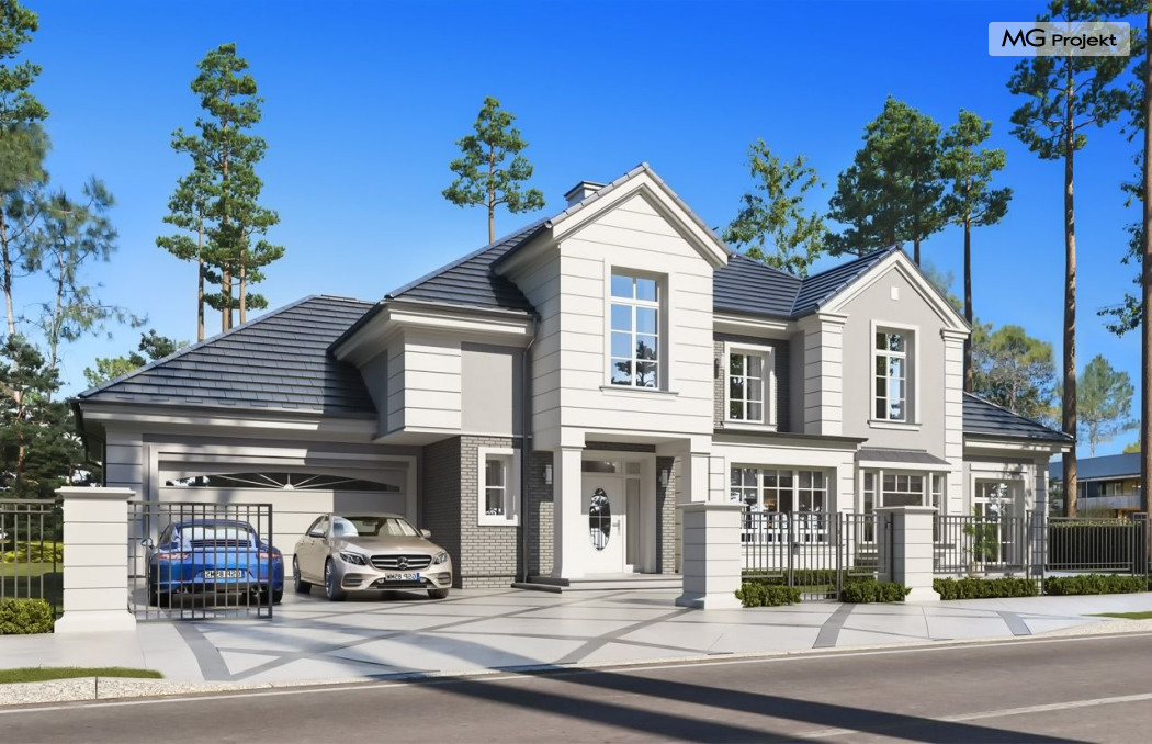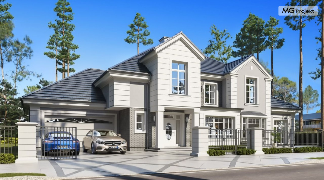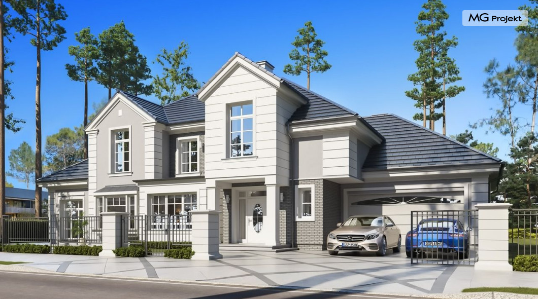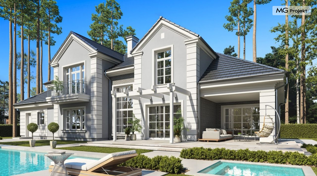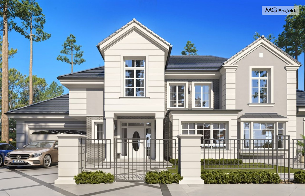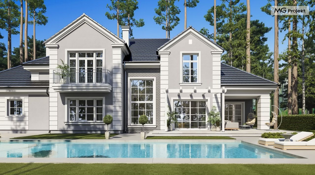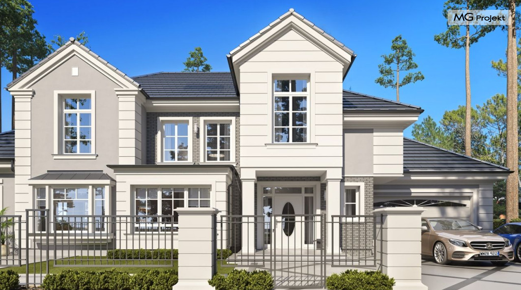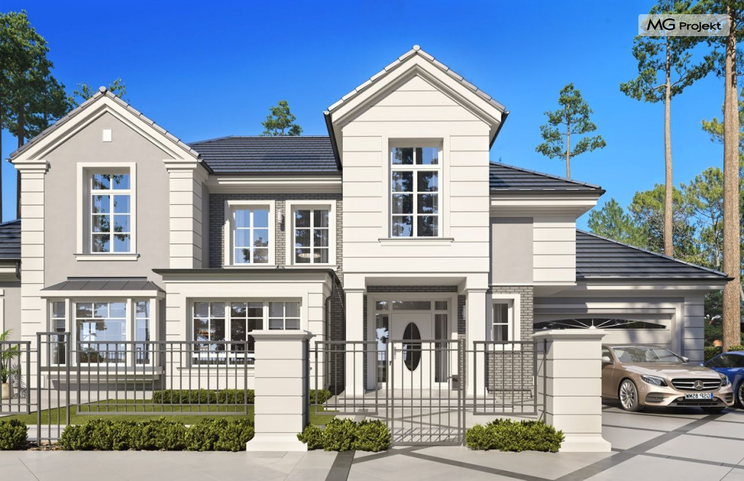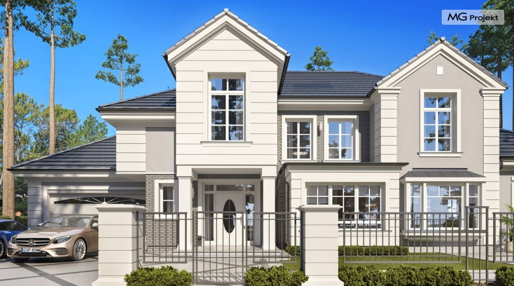 Prezentujemy wersję wariantową naszego projektu Willa Siedziba. W projekcie domu Willa Siedziba 2 elewacje domu ozdobiono płytkami klinkierowymi, dodającymi wrażenia solidności i luksusu, które wyróżnią willę wśród otaczających tynkowanych budynków. Jest to projekt klasycznej reprezentacyjnej willi nawiązującej stylem architektonicznym do najlepszych dwudziestowiecznych wzorów podmiejskich rezydencji. Projekt czerpie z historycznych wzorów architektury rezydencyjnej, pełen jest ciekawych detali, a jednocześnie łączy w sobie zupełnie współczesną funkcję wygodnego domu jednorodzinnego. Budynek zaprojektowano na planie prostokąta, z szeroką elewacją frontową i ogrodową, tak aby idealnie pasował na parcelę zbliżoną kształtem do kwadratu, zostawiając miejsce na ładny ogród i sporo miejsca od frontu. Rozczłonkowana bryła składa się z kilku mniejszych fragmentów. Trzon domu to piętrowa część obudowana wokół parterowymi dobudówkami. Od frontu mamy pięknie zaakcentowane wejście, z szerokimi drzwiami z naświetlami, prowadzącymi do przedsionka i dużego holu. Front to również aż dwa piękne wykusze – kuchni i jadalni domowników, oraz balkon z saloniku-biblioteki na piętrze. Wycofany o kilka metrów w tył garaż nie rzuca się w oczy, a zarazem cofnięcie garażu zwiększa podjazd. Elewacja tylna willi jest równie ciekawa. Mamy tutaj dwukondygnacyjne okno z salonu otwierające widok na ogród i pięknie doświetlające pokój dzienny, oraz dwa wyjścia na taras - pod romantyczną pergolę, oraz do obszernego podcienia - zadaszającego fragment tarasu. Duże okno z gabinetu również otwiera się na stronę ogrodową. Na piętrze szerokie okno balkonowe z balkonem łączy sypialnię państwa domu z widokiem ogrodowym. Wnętrze domu podzielono funkcjonalnie w następujący sposób : strefa wejściowa na parterze składa się z przedsionka z szatnią, połączonego z reprezentacyjnym holem ze schodami na wprost wejścia. Zakończeniem tej osi jest gabinet. Z holu przedostajemy się w lewo do części dziennej, już bardziej prywatnej i mamy tutaj salon z pustką otwarty na antresolę na piętrze, jadalnię – prawdziwy pokój stołowy, oraz kuchnię z mini-jadalnią do spożywania szybkich codziennych posiłków. Lewa strona domu to garaż z pomieszczeniem gospodarczym. Piętro podzielone jest na dwie części - rozdzielone pustką nad salonem i antresolą będącą domową biblioteką a jednocześnie przedłużeniem salonu parteru. Z lewej strony mamy dwie sypialnie dziecięce z garderobami i łazienką, z prawej strony apartament rodziców z garderobą i pokojem kąpielowym, oraz jeszcze jedną sypialnię z łazienką. Dom mimo rozbudowanego planu i funkcji, oraz naprawdę reprezentacyjnej sylwetce, nie jest wcale taki wielki. Swoją powierzchnią trochę przewyższa normalny dom jednorodzinny, udowadniając tym samym, że nie trzeba budować tysiąc-metrowego kolosa żeby mieć wszystko - cały komplet. Dom jest zaprojektowany z energooszczędnych materiałów, ma dobre ocieplenia, nowoczesne instalacje. Będzie niedrogi w użytkowaniu. Jeśli chodzi o koszty budowy - tanio nie będzie, ale efekt końcowy naszym zdaniem wart jest grzechu. Jeśli chce się mieć coś pięknego, wyrastającego ponad przeciętność - to musi to ponadprzeciętnie kosztować. Ten dom nie pozostawi nikogo obojętnie. Zapraszamy !