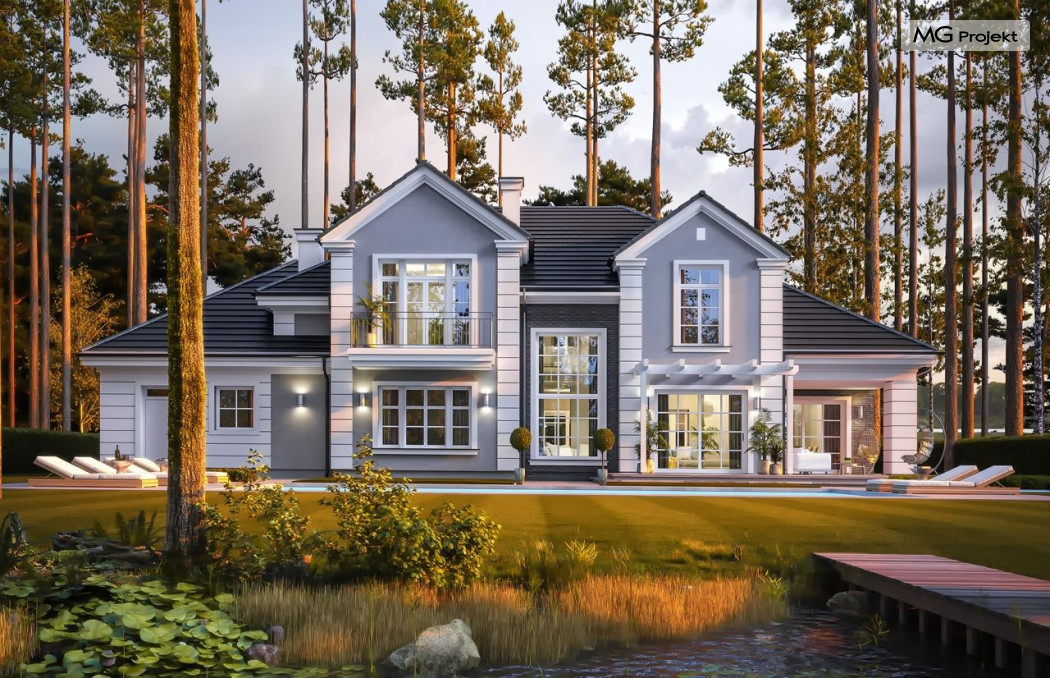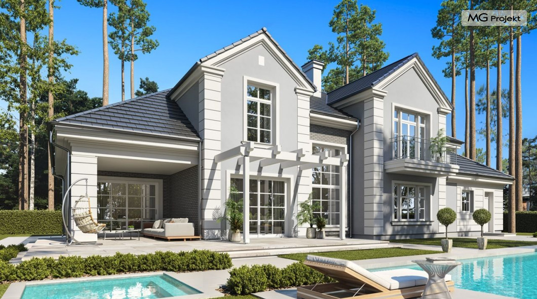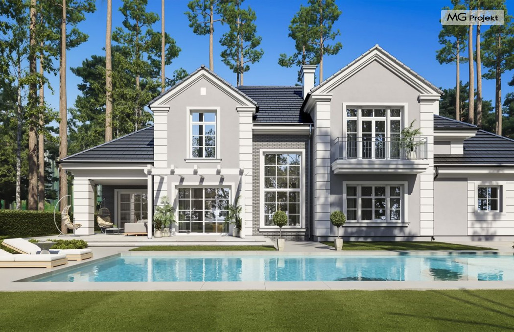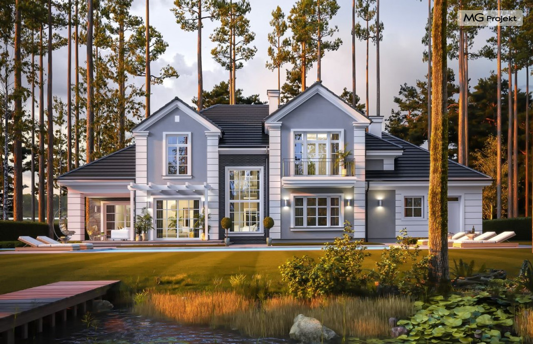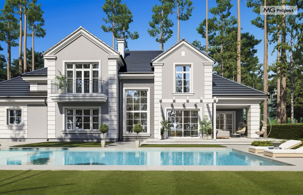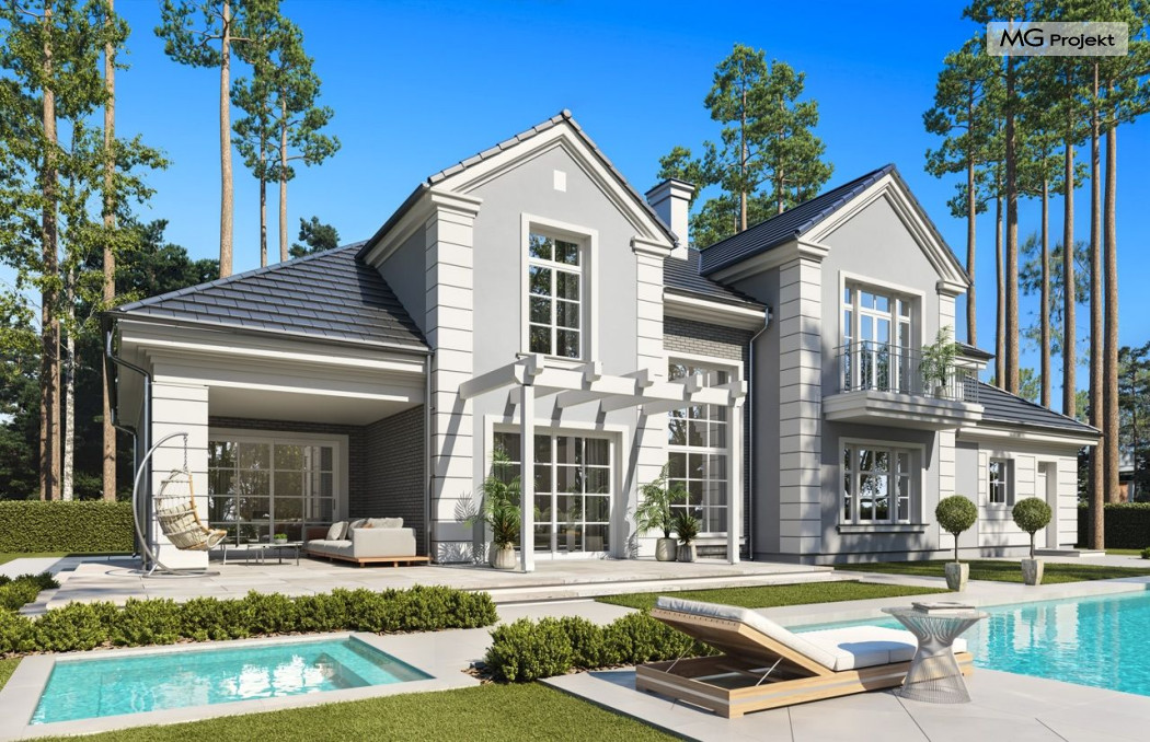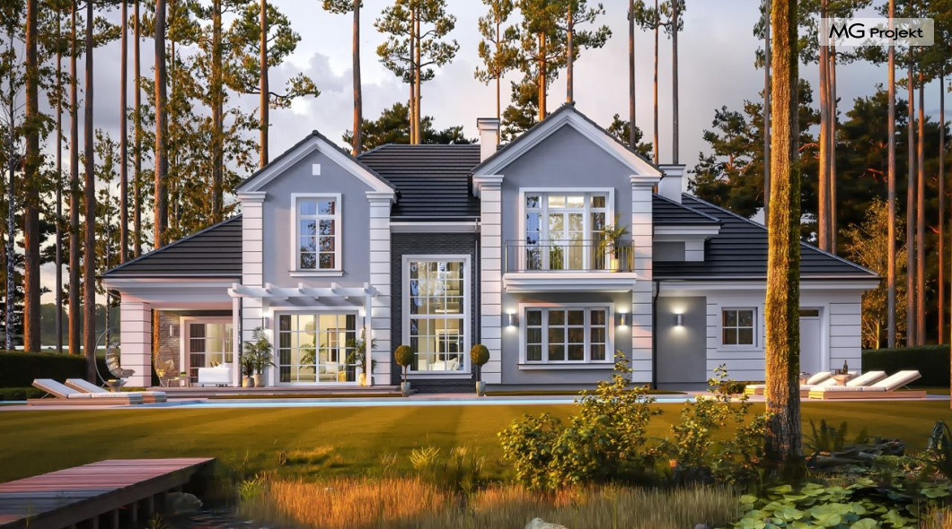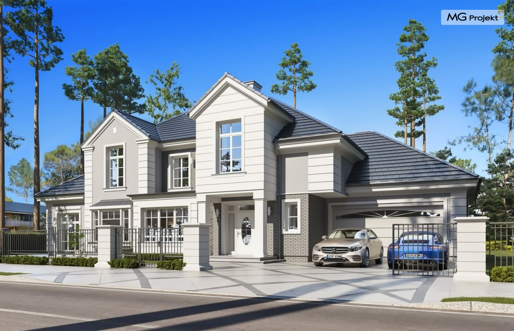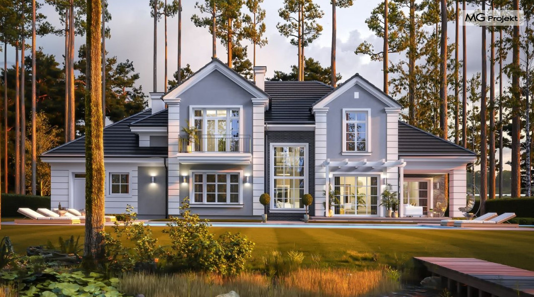 Prezentujemy wersję wariantową naszego projektu Willa Siedziba. W projekcie domu Willa Siedziba 2 elewacje domu ozdobiono płytkami klinkierowymi, dodającymi wrażenia solidności i luksusu, które wyróżnią willę wśród otaczających tynkowanych budynków. Jest to projekt klasycznej reprezentacyjnej willi nawiązującej stylem architektonicznym do najlepszych dwudziestowiecznych wzorów podmiejskich rezydencji. Projekt czerpie z historycznych wzorów architektury rezydencyjnej, pełen jest ciekawych detali, a jednocześnie łączy w sobie zupełnie współczesną funkcję wygodnego domu jednorodzinnego. Budynek zaprojektowano na planie prostokąta, z szeroką elewacją frontową i ogrodową, tak aby idealnie pasował na parcelę zbliżoną kształtem do kwadratu, zostawiając miejsce na ładny ogród i sporo miejsca od frontu. Rozczłonkowana bryła składa się z kilku mniejszych fragmentów. Trzon domu to piętrowa część obudowana wokół parterowymi dobudówkami. Od frontu mamy pięknie zaakcentowane wejście, z szerokimi drzwiami z naświetlami, prowadzącymi do przedsionka i dużego holu. Front to również aż dwa piękne wykusze – kuchni i jadalni domowników, oraz balkon z saloniku-biblioteki na piętrze. Wycofany o kilka metrów w tył garaż nie rzuca się w oczy, a zarazem cofnięcie garażu zwiększa podjazd. Elewacja tylna willi jest równie ciekawa. Mamy tutaj dwukondygnacyjne okno z salonu otwierające widok na ogród i pięknie doświetlające pokój dzienny, oraz dwa wyjścia na taras - pod romantyczną pergolę, oraz do obszernego podcienia - zadaszającego fragment tarasu. Duże okno z gabinetu również otwiera się na stronę ogrodową. Na piętrze szerokie okno balkonowe z balkonem łączy sypialnię państwa domu z widokiem ogrodowym. Wnętrze domu podzielono funkcjonalnie w następujący sposób : strefa wejściowa na parterze składa się z przedsionka z szatnią, połączonego z reprezentacyjnym holem ze schodami na wprost wejścia. Zakończeniem tej osi jest gabinet. Z holu przedostajemy się w lewo do części dziennej, już bardziej prywatnej i mamy tutaj salon z pustką otwarty na antresolę na piętrze, jadalnię – prawdziwy pokój stołowy, oraz kuchnię z mini-jadalnią do spożywania szybkich codziennych posiłków. Lewa strona domu to garaż z pomieszczeniem gospodarczym. Piętro podzielone jest na dwie części - rozdzielone pustką nad salonem i antresolą będącą domową biblioteką a jednocześnie przedłużeniem salonu parteru. Z lewej strony mamy dwie sypialnie dziecięce z garderobami i łazienką, z prawej strony apartament rodziców z garderobą i pokojem kąpielowym, oraz jeszcze jedną sypialnię z łazienką. Dom mimo rozbudowanego planu i funkcji, oraz naprawdę reprezentacyjnej sylwetce, nie jest wcale taki wielki. Swoją powierzchnią trochę przewyższa normalny dom jednorodzinny, udowadniając tym samym, że nie trzeba budować tysiąc-metrowego kolosa żeby mieć wszystko - cały komplet. Dom jest zaprojektowany z energooszczędnych materiałów, ma dobre ocieplenia, nowoczesne instalacje. Będzie niedrogi w użytkowaniu. Jeśli chodzi o koszty budowy - tanio nie będzie, ale efekt końcowy naszym zdaniem wart jest grzechu. Jeśli chce się mieć coś pięknego, wyrastającego ponad przeciętność - to musi to ponadprzeciętnie kosztować. Ten dom nie pozostawi nikogo obojętnie. Zapraszamy !