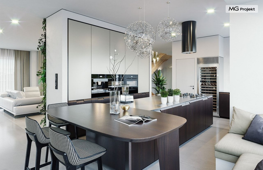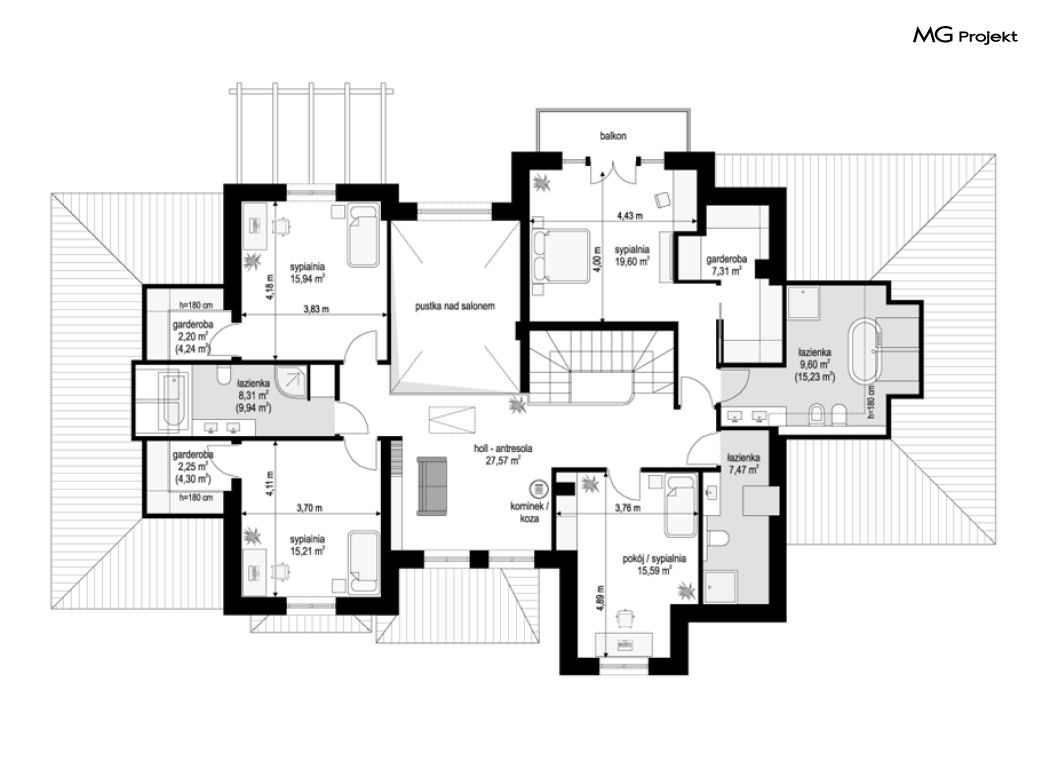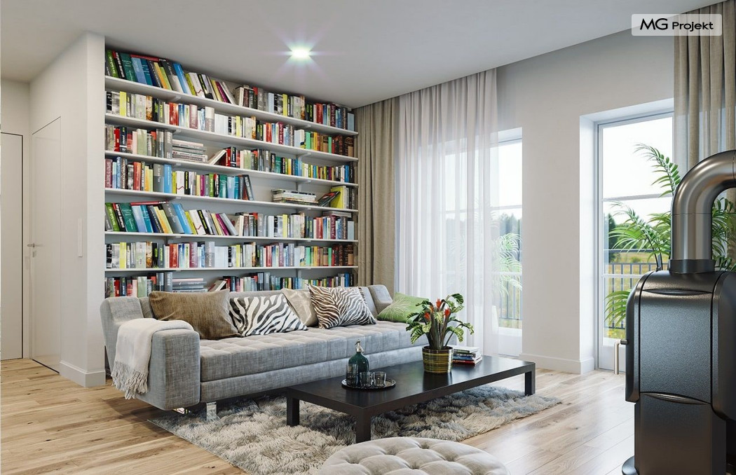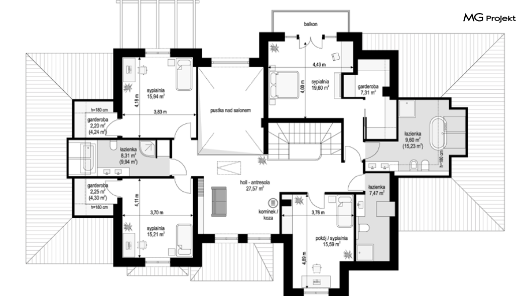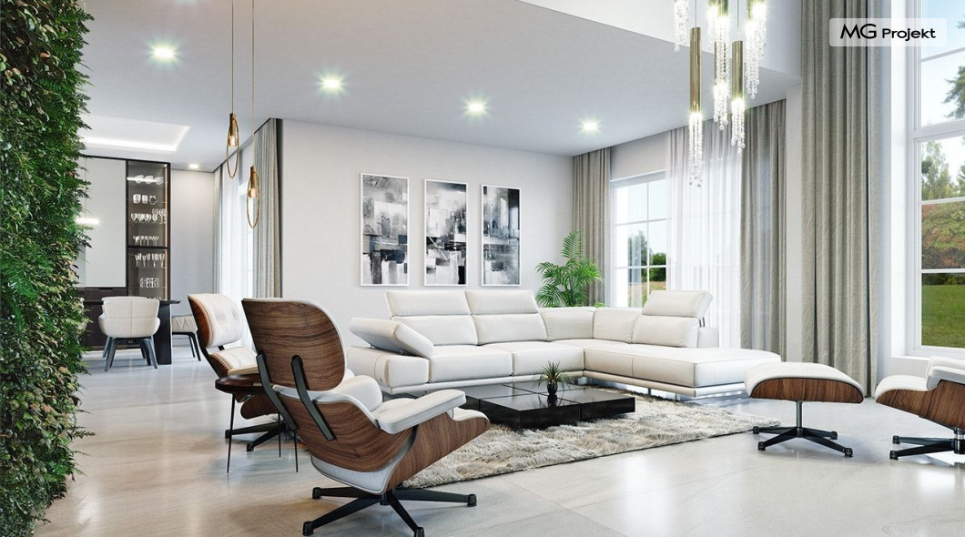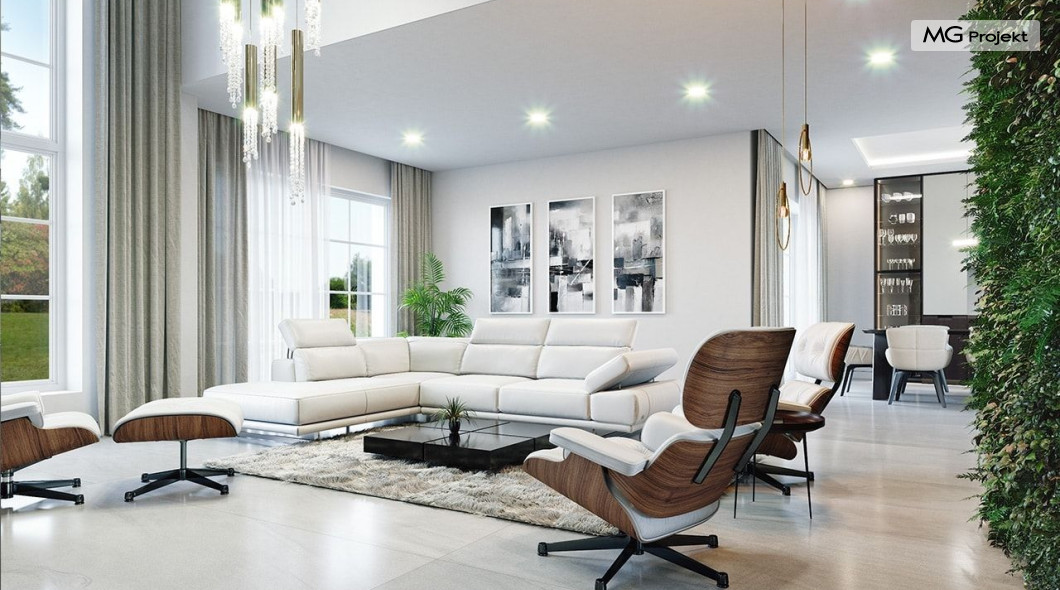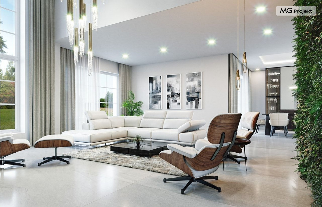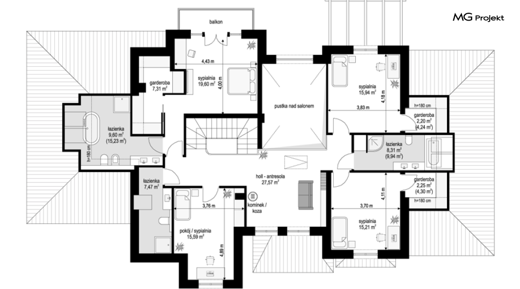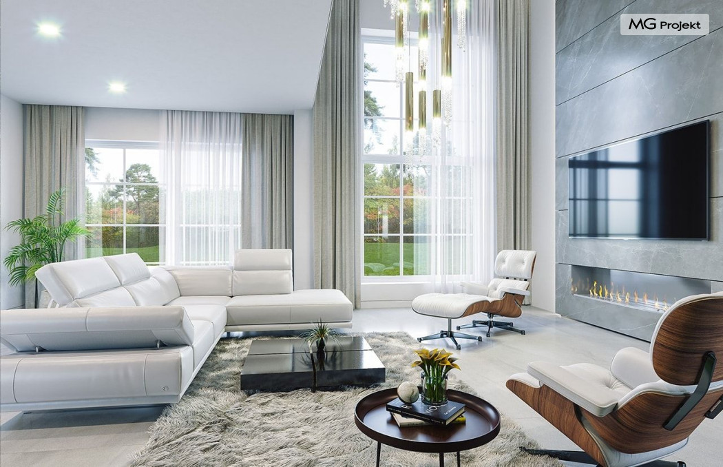 Prezentujemy wersję wariantową naszego projektu Willa Siedziba. W projekcie domu Willa Siedziba 2 elewacje domu ozdobiono płytkami klinkierowymi, dodającymi wrażenia solidności i luksusu, które wyróżnią willę wśród otaczających tynkowanych budynków. Jest to projekt klasycznej reprezentacyjnej willi nawiązującej stylem architektonicznym do najlepszych dwudziestowiecznych wzorów podmiejskich rezydencji. Projekt czerpie z historycznych wzorów architektury rezydencyjnej, pełen jest ciekawych detali, a jednocześnie łączy w sobie zupełnie współczesną funkcję wygodnego domu jednorodzinnego. Budynek zaprojektowano na planie prostokąta, z szeroką elewacją frontową i ogrodową, tak aby idealnie pasował na parcelę zbliżoną kształtem do kwadratu, zostawiając miejsce na ładny ogród i sporo miejsca od frontu. Rozczłonkowana bryła składa się z kilku mniejszych fragmentów. Trzon domu to piętrowa część obudowana wokół parterowymi dobudówkami. Od frontu mamy pięknie zaakcentowane wejście, z szerokimi drzwiami z naświetlami, prowadzącymi do przedsionka i dużego holu. Front to również aż dwa piękne wykusze – kuchni i jadalni domowników, oraz balkon z saloniku-biblioteki na piętrze. Wycofany o kilka metrów w tył garaż nie rzuca się w oczy, a zarazem cofnięcie garażu zwiększa podjazd. Elewacja tylna willi jest równie ciekawa. Mamy tutaj dwukondygnacyjne okno z salonu otwierające widok na ogród i pięknie doświetlające pokój dzienny, oraz dwa wyjścia na taras - pod romantyczną pergolę, oraz do obszernego podcienia - zadaszającego fragment tarasu. Duże okno z gabinetu również otwiera się na stronę ogrodową. Na piętrze szerokie okno balkonowe z balkonem łączy sypialnię państwa domu z widokiem ogrodowym. Wnętrze domu podzielono funkcjonalnie w następujący sposób : strefa wejściowa na parterze składa się z przedsionka z szatnią, połączonego z reprezentacyjnym holem ze schodami na wprost wejścia. Zakończeniem tej osi jest gabinet. Z holu przedostajemy się w lewo do części dziennej, już bardziej prywatnej i mamy tutaj salon z pustką otwarty na antresolę na piętrze, jadalnię – prawdziwy pokój stołowy, oraz kuchnię z mini-jadalnią do spożywania szybkich codziennych posiłków. Lewa strona domu to garaż z pomieszczeniem gospodarczym. Piętro podzielone jest na dwie części - rozdzielone pustką nad salonem i antresolą będącą domową biblioteką a jednocześnie przedłużeniem salonu parteru. Z lewej strony mamy dwie sypialnie dziecięce z garderobami i łazienką, z prawej strony apartament rodziców z garderobą i pokojem kąpielowym, oraz jeszcze jedną sypialnię z łazienką. Dom mimo rozbudowanego planu i funkcji, oraz naprawdę reprezentacyjnej sylwetce, nie jest wcale taki wielki. Swoją powierzchnią trochę przewyższa normalny dom jednorodzinny, udowadniając tym samym, że nie trzeba budować tysiąc-metrowego kolosa żeby mieć wszystko - cały komplet. Dom jest zaprojektowany z energooszczędnych materiałów, ma dobre ocieplenia, nowoczesne instalacje. Będzie niedrogi w użytkowaniu. Jeśli chodzi o koszty budowy - tanio nie będzie, ale efekt końcowy naszym zdaniem wart jest grzechu. Jeśli chce się mieć coś pięknego, wyrastającego ponad przeciętność - to musi to ponadprzeciętnie kosztować. Ten dom nie pozostawi nikogo obojętnie. Zapraszamy !
