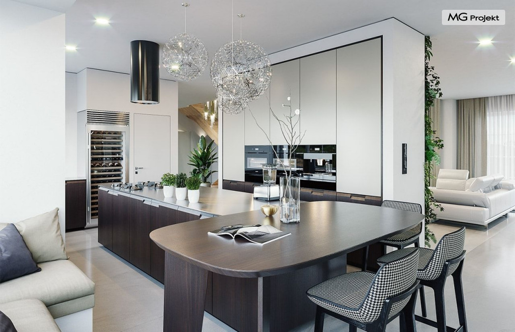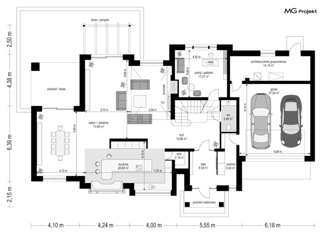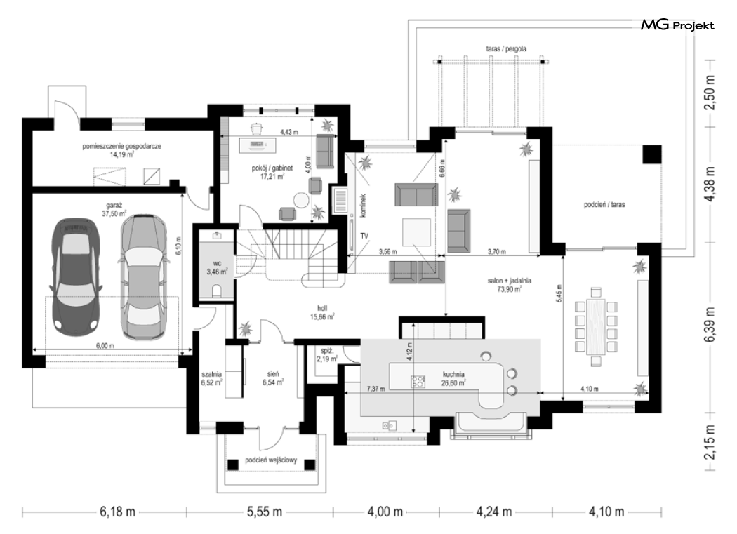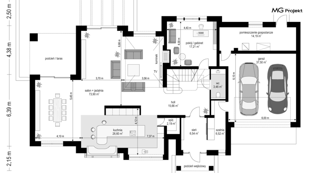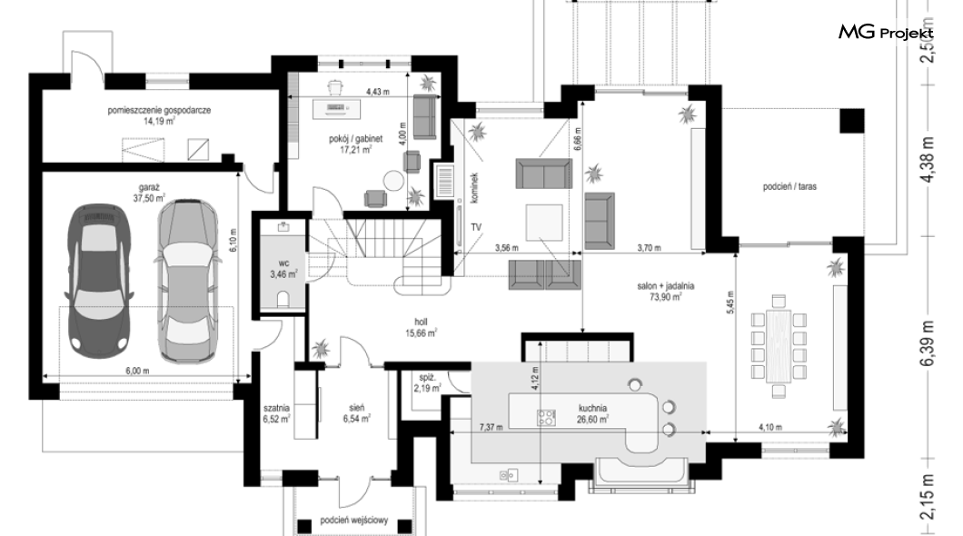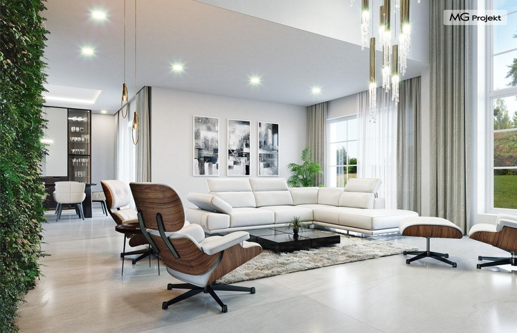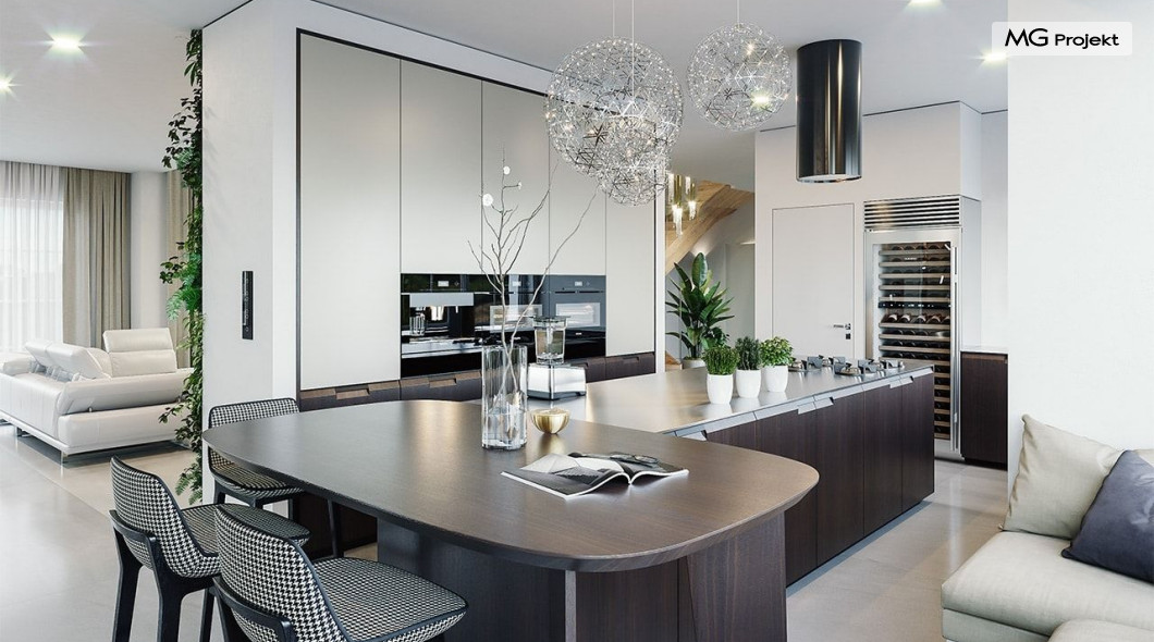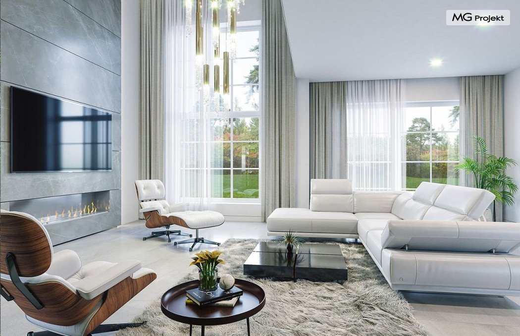Prezentujemy wersję wariantową naszego projektu Willa Siedziba. W projekcie domu Willa Siedziba 2 elewacje domu ozdobiono płytkami klinkierowymi, dodającymi wrażenia solidności i luksusu, które wyróżnią willę wśród otaczających tynkowanych budynków. Jest to projekt klasycznej reprezentacyjnej willi nawiązującej stylem architektonicznym do najlepszych dwudziestowiecznych wzorów podmiejskich rezydencji. Projekt czerpie z historycznych wzorów architektury rezydencyjnej, pełen jest ciekawych detali, a jednocześnie łączy w sobie zupełnie współczesną funkcję wygodnego domu jednorodzinnego. Budynek zaprojektowano na planie prostokąta, z szeroką elewacją frontową i ogrodową, tak aby idealnie pasował na parcelę zbliżoną kształtem do kwadratu, zostawiając miejsce na ładny ogród i sporo miejsca od frontu. Rozczłonkowana bryła składa się z kilku mniejszych fragmentów. Trzon domu to piętrowa część obudowana wokół parterowymi dobudówkami. Od frontu mamy pięknie zaakcentowane wejście, z szerokimi drzwiami z naświetlami, prowadzącymi do przedsionka i dużego holu. Front to również aż dwa piękne wykusze – kuchni i jadalni domowników, oraz balkon z saloniku-biblioteki na piętrze. Wycofany o kilka metrów w tył garaż nie rzuca się w oczy, a zarazem cofnięcie garażu zwiększa podjazd. Elewacja tylna willi jest równie ciekawa. Mamy tutaj dwukondygnacyjne okno z salonu otwierające widok na ogród i pięknie doświetlające pokój dzienny, oraz dwa wyjścia na taras - pod romantyczną pergolę, oraz do obszernego podcienia - zadaszającego fragment tarasu. Duże okno z gabinetu również otwiera się na stronę ogrodową. Na piętrze szerokie okno balkonowe z balkonem łączy sypialnię państwa domu z widokiem ogrodowym. Wnętrze domu podzielono funkcjonalnie w następujący sposób : strefa wejściowa na parterze składa się z przedsionka z szatnią, połączonego z reprezentacyjnym holem ze schodami na wprost wejścia. Zakończeniem tej osi jest gabinet. Z holu przedostajemy się w lewo do części dziennej, już bardziej prywatnej i mamy tutaj salon z pustką otwarty na antresolę na piętrze, jadalnię – prawdziwy pokój stołowy, oraz kuchnię z mini-jadalnią do spożywania szybkich codziennych posiłków. Lewa strona domu to garaż z pomieszczeniem gospodarczym. Piętro podzielone jest na dwie części - rozdzielone pustką nad salonem i antresolą będącą domową biblioteką a jednocześnie przedłużeniem salonu parteru. Z lewej strony mamy dwie sypialnie dziecięce z garderobami i łazienką, z prawej strony apartament rodziców z garderobą i pokojem kąpielowym, oraz jeszcze jedną sypialnię z łazienką. Dom mimo rozbudowanego planu i funkcji, oraz naprawdę reprezentacyjnej sylwetce, nie jest wcale taki wielki. Swoją powierzchnią trochę przewyższa normalny dom jednorodzinny, udowadniając tym samym, że nie trzeba budować tysiąc-metrowego kolosa żeby mieć wszystko - cały komplet. Dom jest zaprojektowany z energooszczędnych materiałów, ma dobre ocieplenia, nowoczesne instalacje. Będzie niedrogi w użytkowaniu. Jeśli chodzi o koszty budowy - tanio nie będzie, ale efekt końcowy naszym zdaniem wart jest grzechu. Jeśli chce się mieć coś pięknego, wyrastającego ponad przeciętność - to musi to ponadprzeciętnie kosztować. Ten dom nie pozostawi nikogo obojętnie. Zapraszamy !