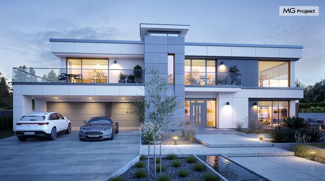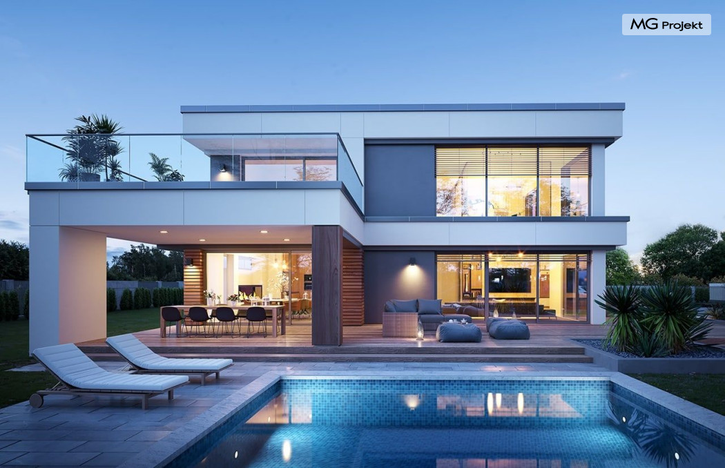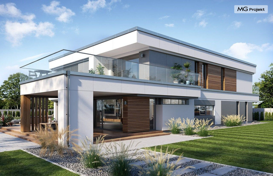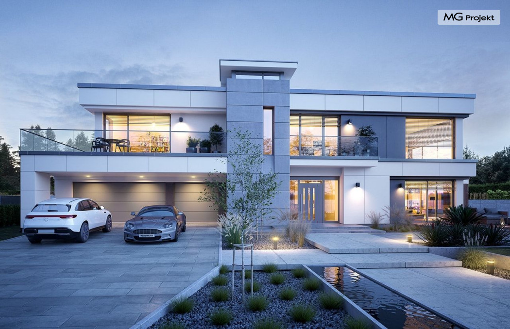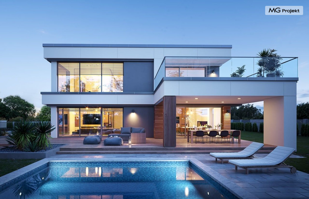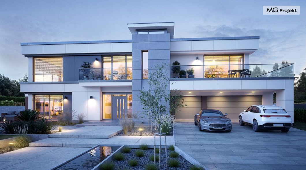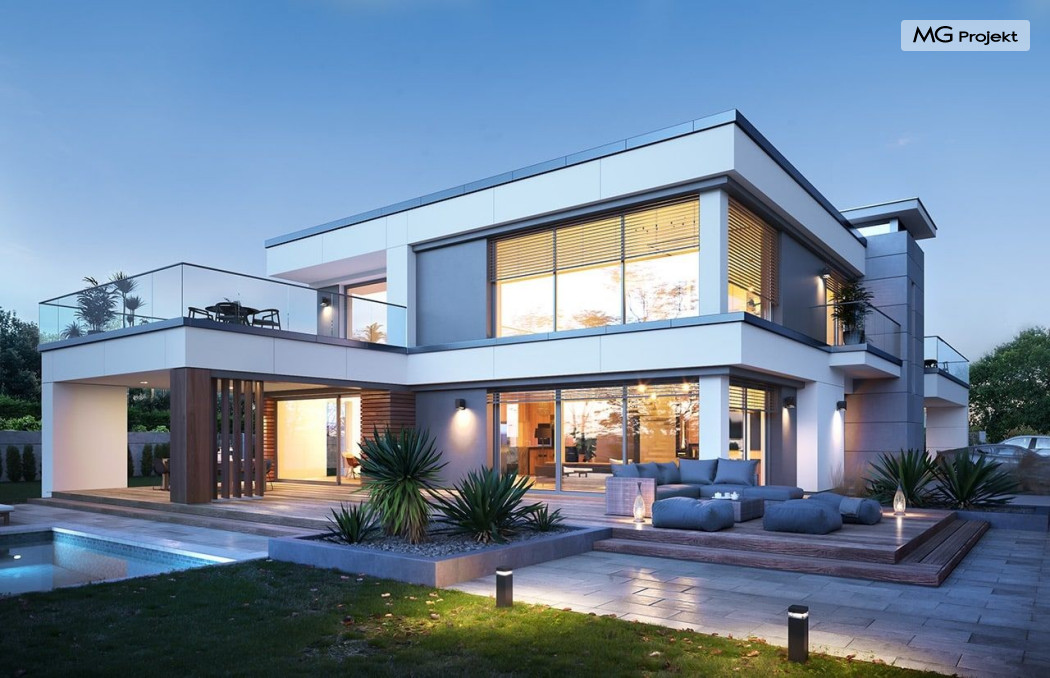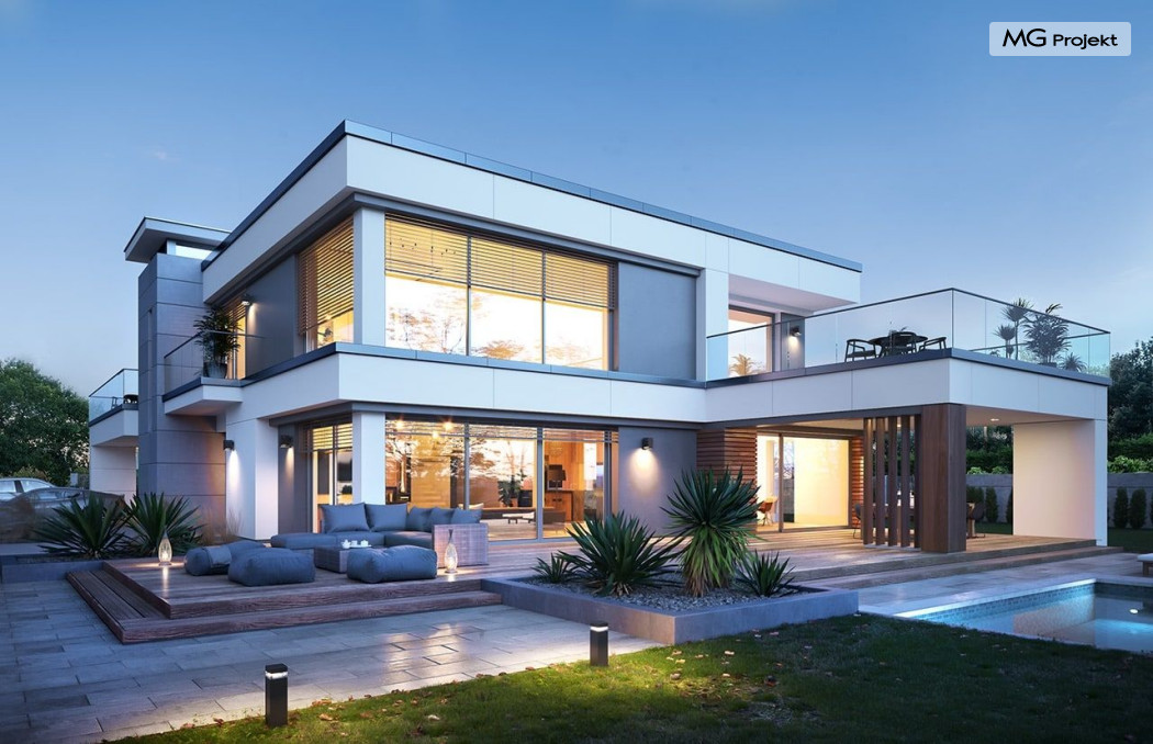 Projekt domu Willa Floryda 5 jest kolejnym z projektów luksusowych rezydencji z serii „Willa Floryda”. Dom jest komfortową, piętrową willą, przeznaczoną na działkę z bocznym lub frontowym ogrodem. Architektura domu łączy w sobie nowoczesną formę z funkcjonalnie rozwiązanym wnętrzem. Stylowa urozmaicona bryła, oraz reprezentacyjne wnętrze podkreślą status i dobry gust właścicieli. Rozczłonkowana piętrowa sylwetka domu przykryta jest czterospadowym dachem, praktycznie niewidocznym z wysokości oczu człowieka, dając wrażenie budynku z płaskim dachem, przy – tak naprawdę zadaszeniu spadzistym ( częstym wymogu w zapisach warunków zabudowy ). Elewacje podzielone zostały na pasy okien przeplecionych białymi belkami oddzielającymi kondygnacje, wprowadzają rytm i porządek. Do budynku wchodzimy eleganckimi szerokimi drzwiami wejściowymi z bocznymi naświetlami pod zadaszeniem balkonu. Front domu ozdabia tutaj pionowa dwukondygnacyjna ściana z naświetlem, duże okna w narożnikach elewacji, oraz wygodna wiata przed trzystanowiskowym garażem.
