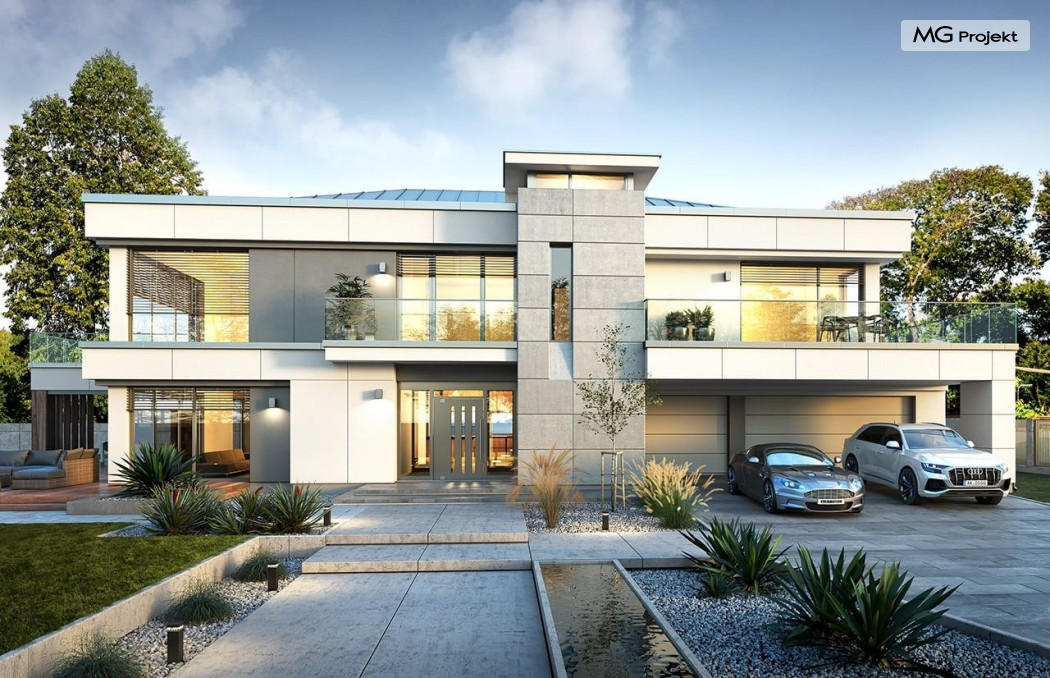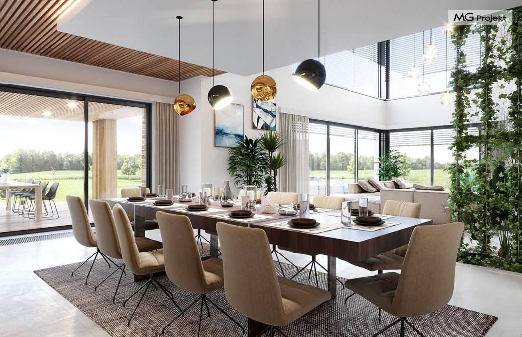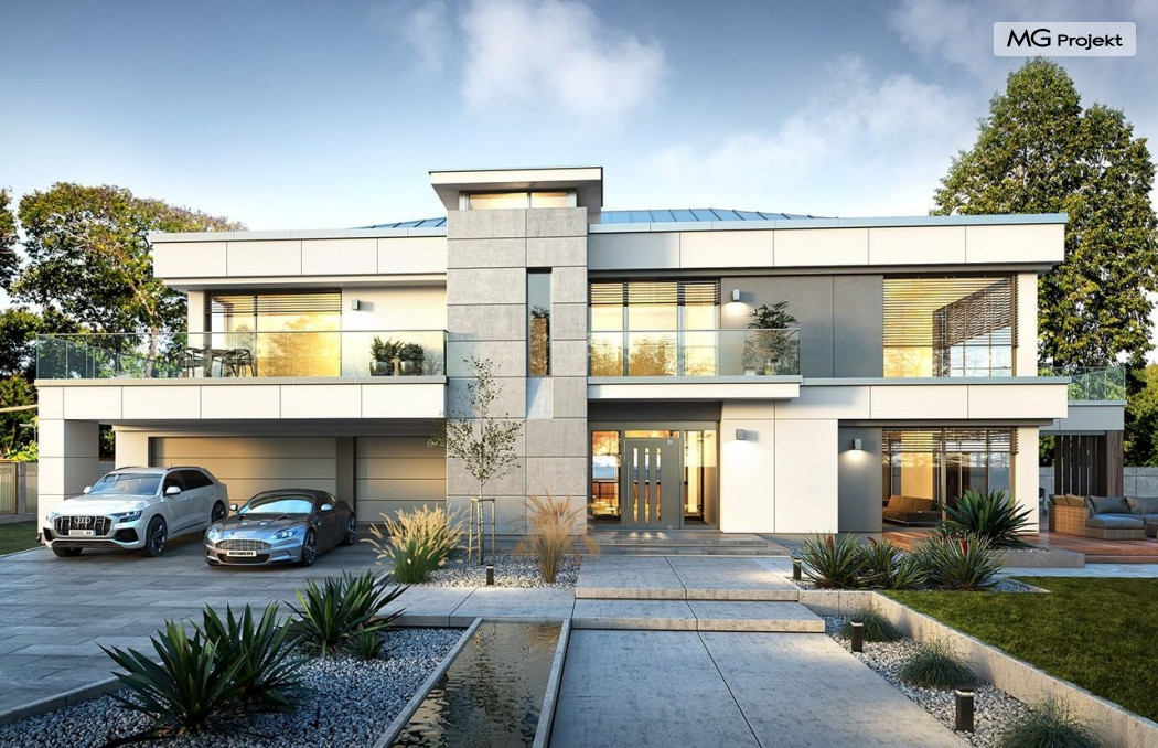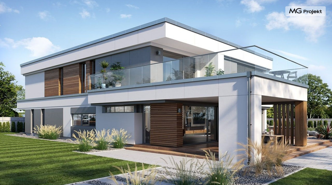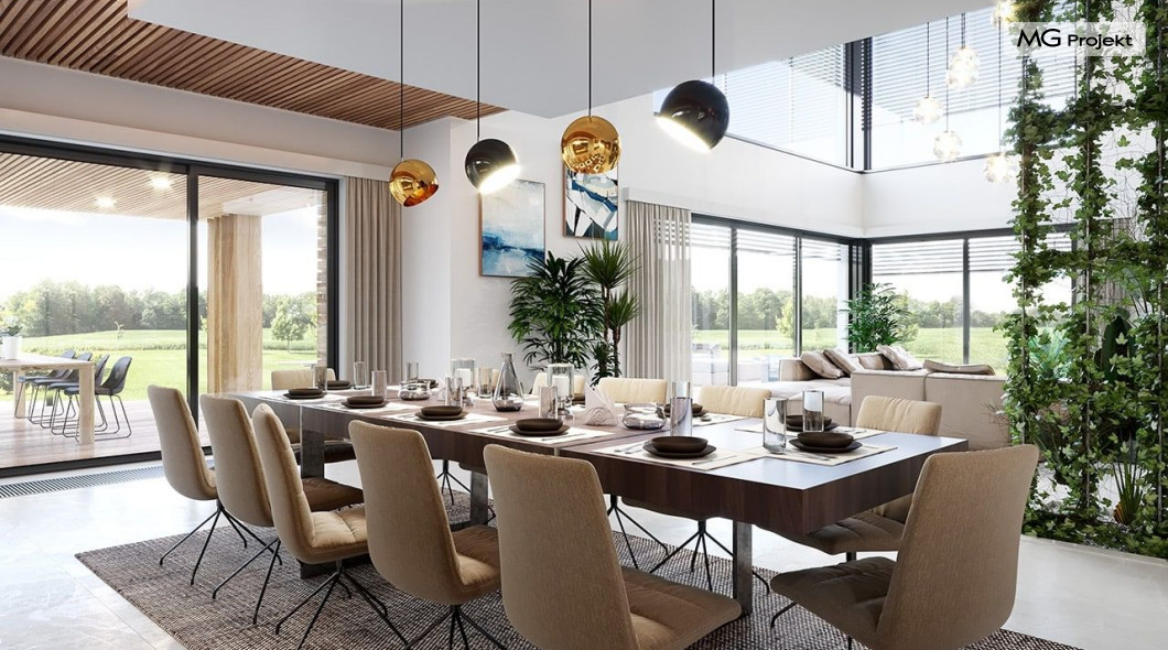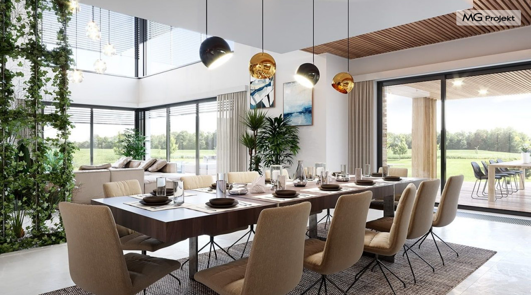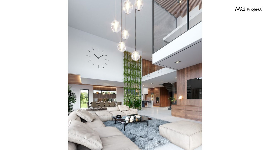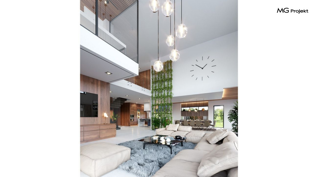Elewacją ogrodową jest w Willi Florydzie 5 elewacja boczna domu z dużym zadaszonym tarasem - miejscem wieczornych biesiad, oraz wielkimi narożnymi przeszkleniami salonu. Wnętrze parteru to przede wszystkim ogromna jednoprzestrzenna powierzchni połączonych pomieszczeń holu, salonu, jadalni i kuchni. To prawie 150 m2 swobodnej, otwartej przestrzeni dziennej. Mieszczą się tutaj reprezentacyjne schody na piętro, salon z dużą pustką i otwarciem na antresolę powyżej, z rozkosznym kompletem wypoczynkowym i ścianą telewizyjną. Mamy tutaj jadalnię ze stołem na 14 lub więcej osób i pięknym kominkiem gazowym, mamy kuchnię z wyspą, a na środku ogródek na reprezentacyjne rośliny i mnóstwo miejsca na ekspozycję wyjątkowych obrazów i innych dzieł sztuki. Wszystko skąpane jest w świetle szerokich dwukondygnacyjnych przeszkleń. Na zapleczu za kuchnią mamy pomieszczenia gospodarcze jak pralnia, spiżarnia, czy kotłownia. Przy wejściu : szatnię, toaletę i przejście do trzystanowiskowego garażu. Piętro domu to z kolei sypialnia master z garderobami i łazienką, oraz z dodatkowym rezerwowym pokojem i dwie sypialnie dziecięce z własną drugą łazienką. Nad salonem wisi pięknie przeszklone pomieszczenie biura domowego lub biblioteki, oraz otwierająca się na parter i na ogród antresola. Wszystkie pokoje na piętrze mają swoje wyjścia na okalające tarasy. Sypialnia master ma osobny bardzo duży taras z widokiem na ogród. Willa Floryda 5 to kolejna propozycja dużego luksusowego domu dla odważnych Inwestorów, chcących spełnić swoje marzenia o wyjątkowym miejscu do życia, chcących cieszyć się nietuzinkową - nowoczesną zarazem niekrzykliwą a gustowną architekturą. Zapraszamy do zapoznania się z pełną ofertą pracowni MG Projekt: Willa Floryda 2, Willa Floryda, Willa Floryda 3, Willa Floryda 4, Rezydencja Floryda, Rezydencja Floryda 2.