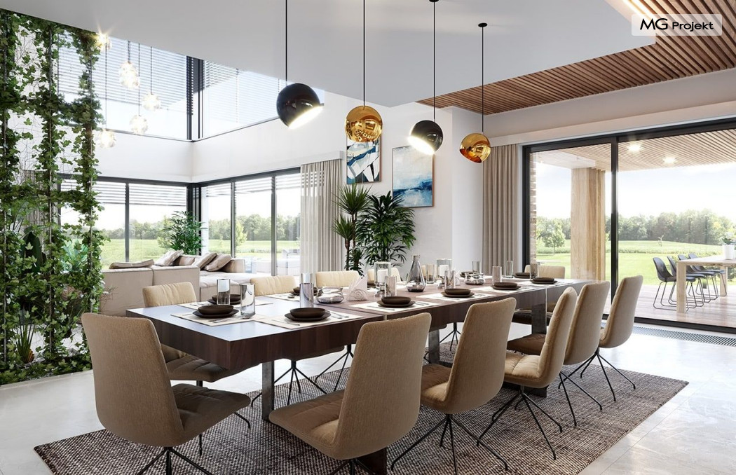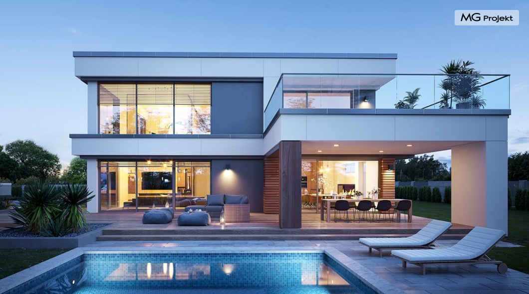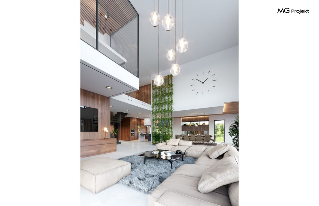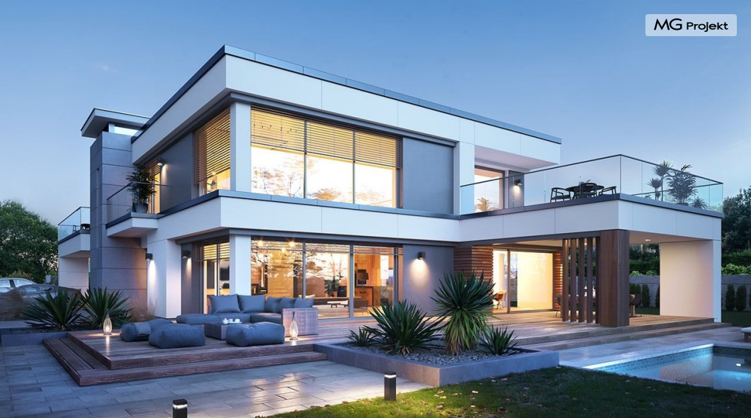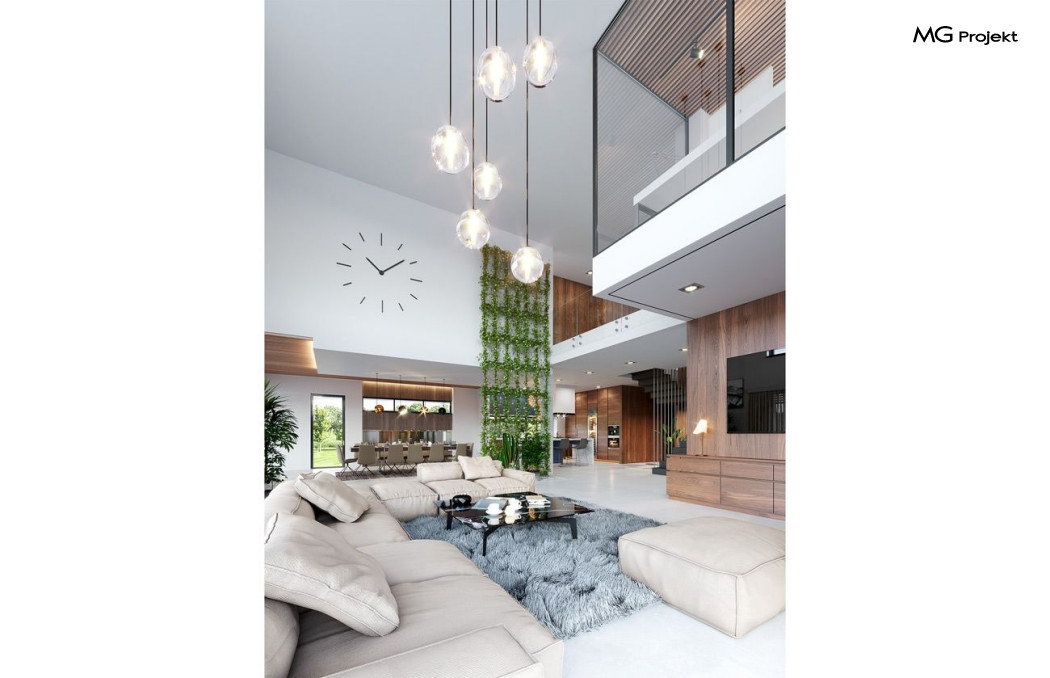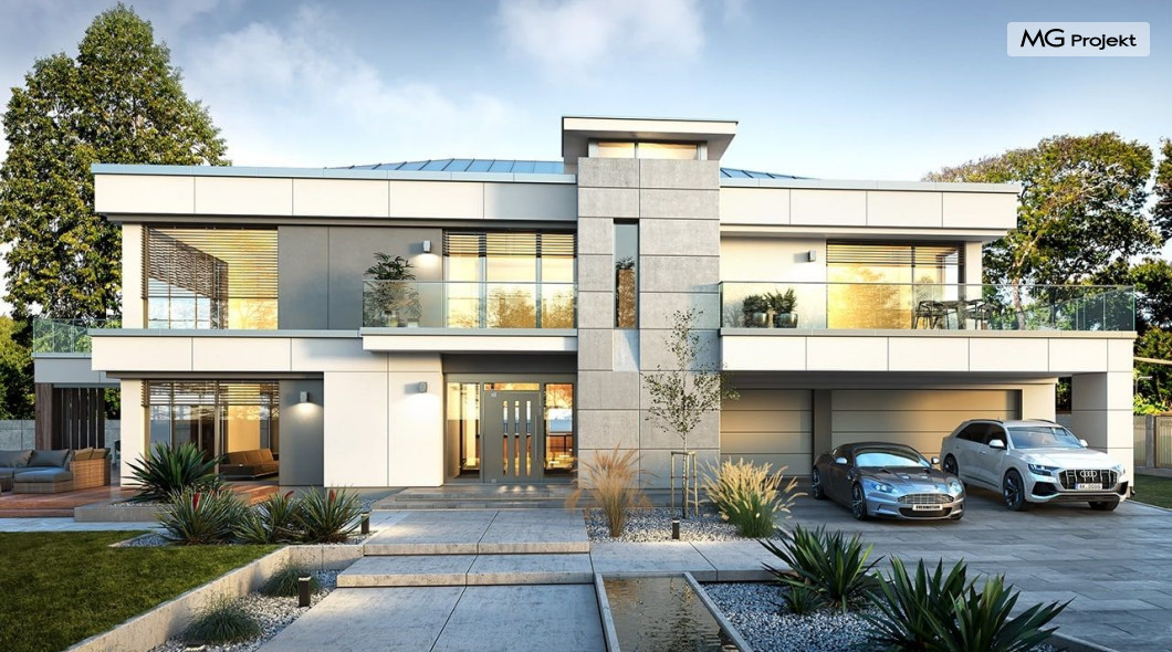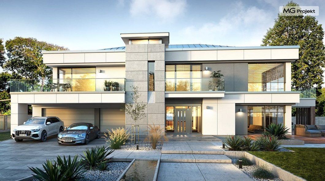 Elewacją ogrodową jest w Willi Florydzie 5 elewacja boczna domu z dużym zadaszonym tarasem - miejscem wieczornych biesiad, oraz wielkimi narożnymi przeszkleniami salonu. Wnętrze parteru to przede wszystkim ogromna jednoprzestrzenna powierzchni połączonych pomieszczeń holu, salonu, jadalni i kuchni. To prawie 150 m2 swobodnej, otwartej przestrzeni dziennej. Mieszczą się tutaj reprezentacyjne schody na piętro, salon z dużą pustką i otwarciem na antresolę powyżej, z rozkosznym kompletem wypoczynkowym i ścianą telewizyjną. Mamy tutaj jadalnię ze stołem na 14 lub więcej osób i pięknym kominkiem gazowym, mamy kuchnię z wyspą, a na środku ogródek na reprezentacyjne rośliny i mnóstwo miejsca na ekspozycję wyjątkowych obrazów i innych dzieł sztuki. Wszystko skąpane jest w świetle szerokich dwukondygnacyjnych przeszkleń. Na zapleczu za kuchnią mamy pomieszczenia gospodarcze jak pralnia, spiżarnia, czy kotłownia. Przy wejściu : szatnię, toaletę i przejście do trzystanowiskowego garażu. Piętro domu to z kolei sypialnia master z garderobami i łazienką, oraz z dodatkowym rezerwowym pokojem i dwie sypialnie dziecięce z własną drugą łazienką. Nad salonem wisi pięknie przeszklone pomieszczenie biura domowego lub biblioteki, oraz otwierająca się na parter i na ogród antresola. Wszystkie pokoje na piętrze mają swoje wyjścia na okalające tarasy. Sypialnia master ma osobny bardzo duży taras z widokiem na ogród. Willa Floryda 5 to kolejna propozycja dużego luksusowego domu dla odważnych Inwestorów, chcących spełnić swoje marzenia o wyjątkowym miejscu do życia, chcących cieszyć się nietuzinkową - nowoczesną zarazem niekrzykliwą a gustowną architekturą. Zapraszamy do zapoznania się z pełną ofertą pracowni MG Projekt: Willa Floryda 2, Willa Floryda, Willa Floryda 3, Willa Floryda 4, Rezydencja Floryda, Rezydencja Floryda 2.