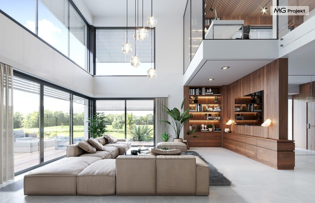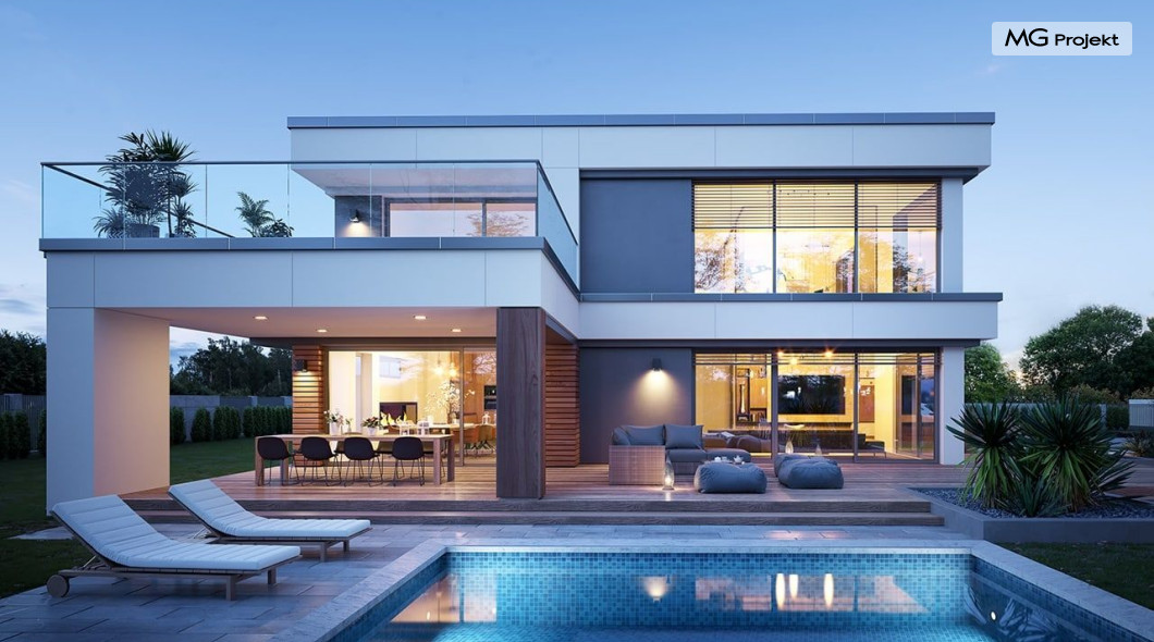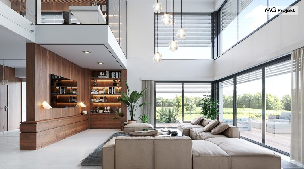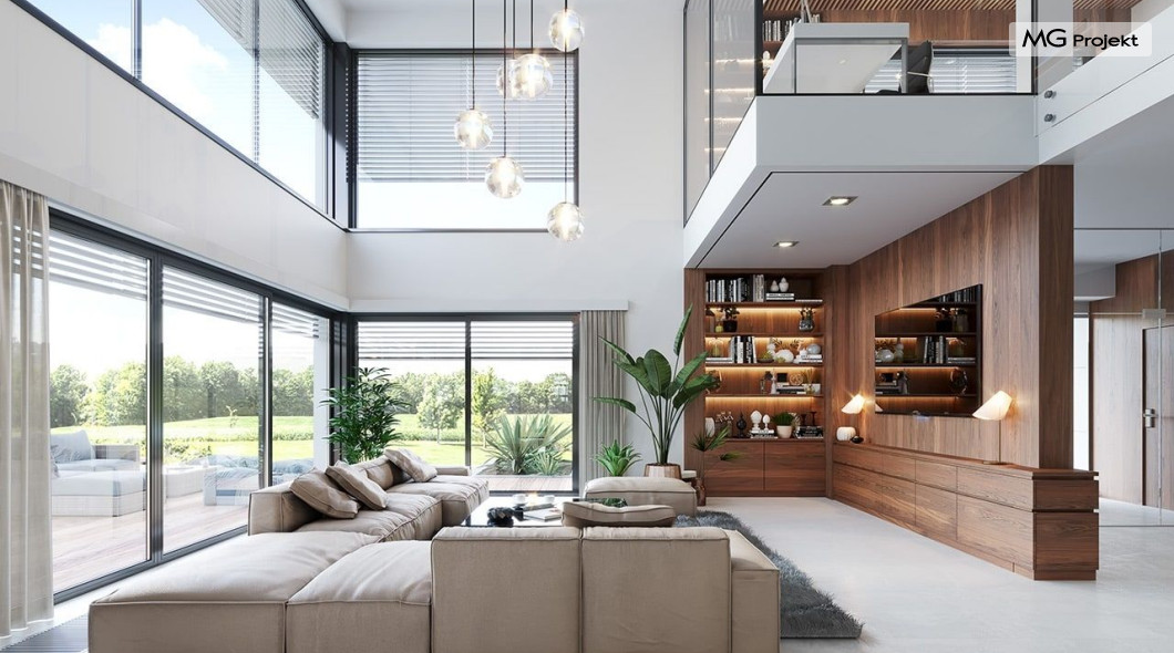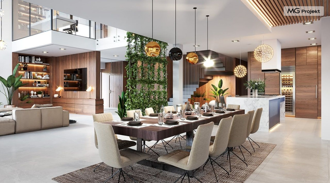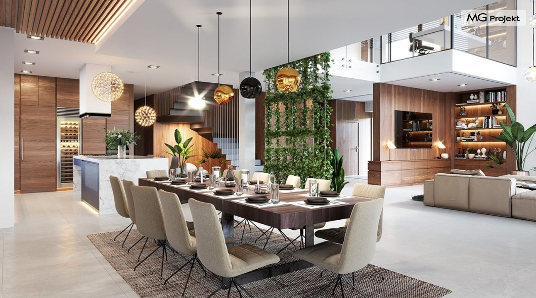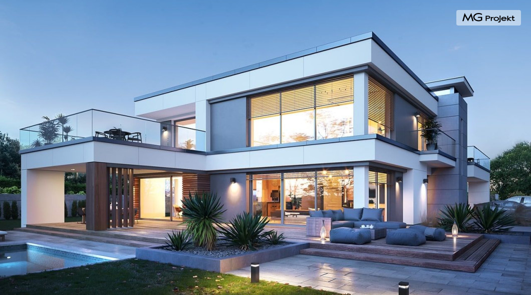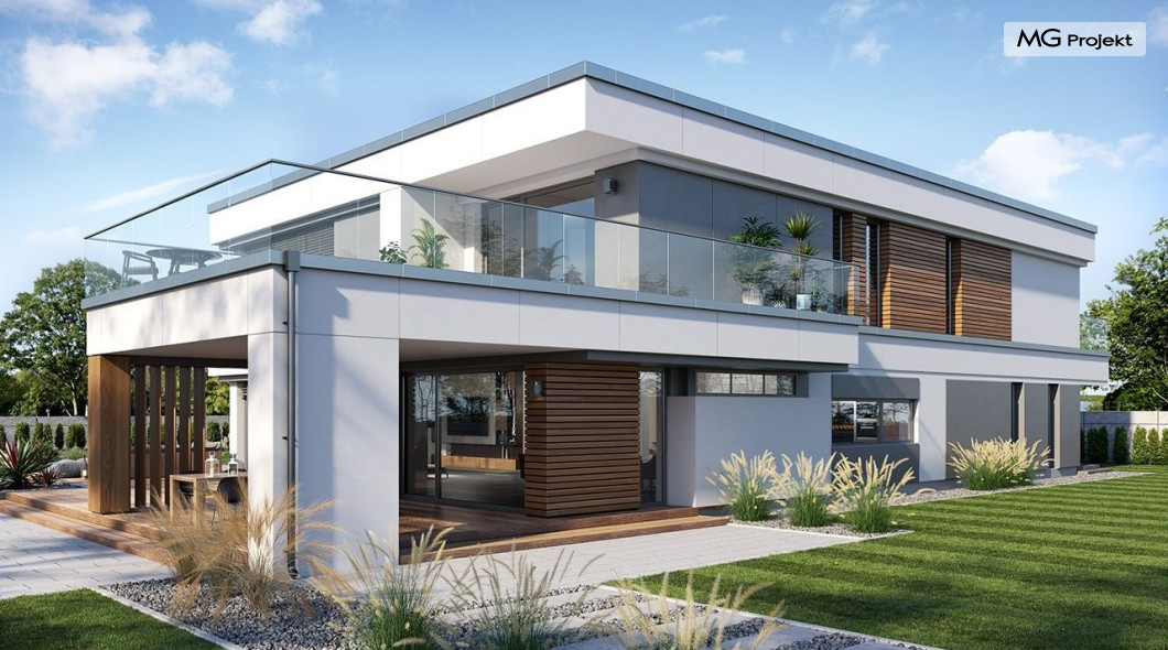 Elewacją ogrodową jest w Willi Florydzie 5 elewacja boczna domu z dużym zadaszonym tarasem - miejscem wieczornych biesiad, oraz wielkimi narożnymi przeszkleniami salonu. Wnętrze parteru to przede wszystkim ogromna jednoprzestrzenna powierzchni połączonych pomieszczeń holu, salonu, jadalni i kuchni. To prawie 150 m2 swobodnej, otwartej przestrzeni dziennej. Mieszczą się tutaj reprezentacyjne schody na piętro, salon z dużą pustką i otwarciem na antresolę powyżej, z rozkosznym kompletem wypoczynkowym i ścianą telewizyjną. Mamy tutaj jadalnię ze stołem na 14 lub więcej osób i pięknym kominkiem gazowym, mamy kuchnię z wyspą, a na środku ogródek na reprezentacyjne rośliny i mnóstwo miejsca na ekspozycję wyjątkowych obrazów i innych dzieł sztuki. Wszystko skąpane jest w świetle szerokich dwukondygnacyjnych przeszkleń. Na zapleczu za kuchnią mamy pomieszczenia gospodarcze jak pralnia, spiżarnia, czy kotłownia. Przy wejściu : szatnię, toaletę i przejście do trzystanowiskowego garażu. Piętro domu to z kolei sypialnia master z garderobami i łazienką, oraz z dodatkowym rezerwowym pokojem i dwie sypialnie dziecięce z własną drugą łazienką. Nad salonem wisi pięknie przeszklone pomieszczenie biura domowego lub biblioteki, oraz otwierająca się na parter i na ogród antresola. Wszystkie pokoje na piętrze mają swoje wyjścia na okalające tarasy. Sypialnia master ma osobny bardzo duży taras z widokiem na ogród. Willa Floryda 5 to kolejna propozycja dużego luksusowego domu dla odważnych Inwestorów, chcących spełnić swoje marzenia o wyjątkowym miejscu do życia, chcących cieszyć się nietuzinkową - nowoczesną zarazem niekrzykliwą a gustowną architekturą. Zapraszamy do zapoznania się z pełną ofertą pracowni MG Projekt: Willa Floryda 2, Willa Floryda, Willa Floryda 3, Willa Floryda 4, Rezydencja Floryda, Rezydencja Floryda 2.