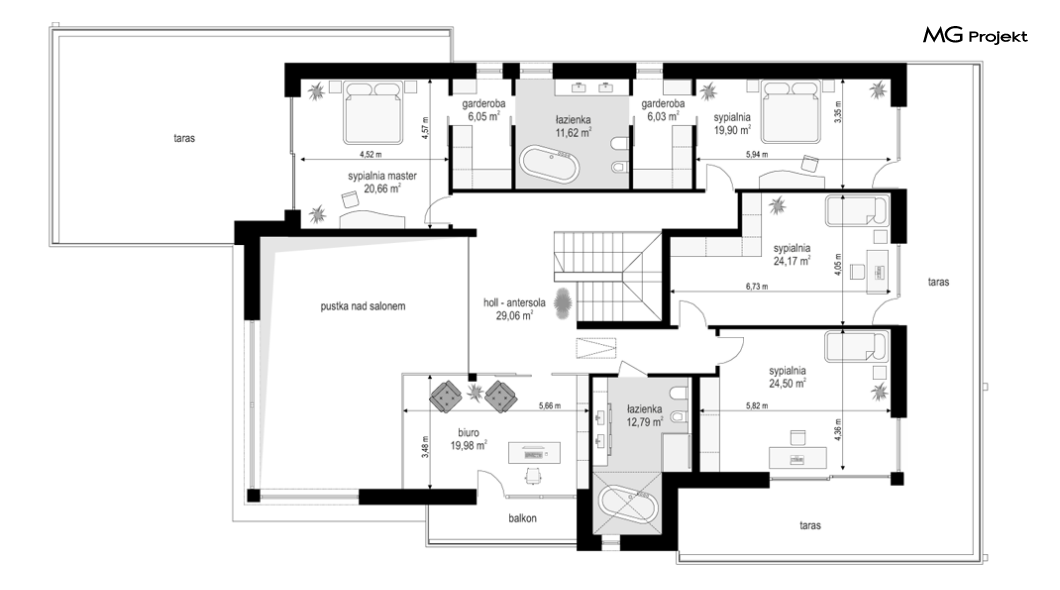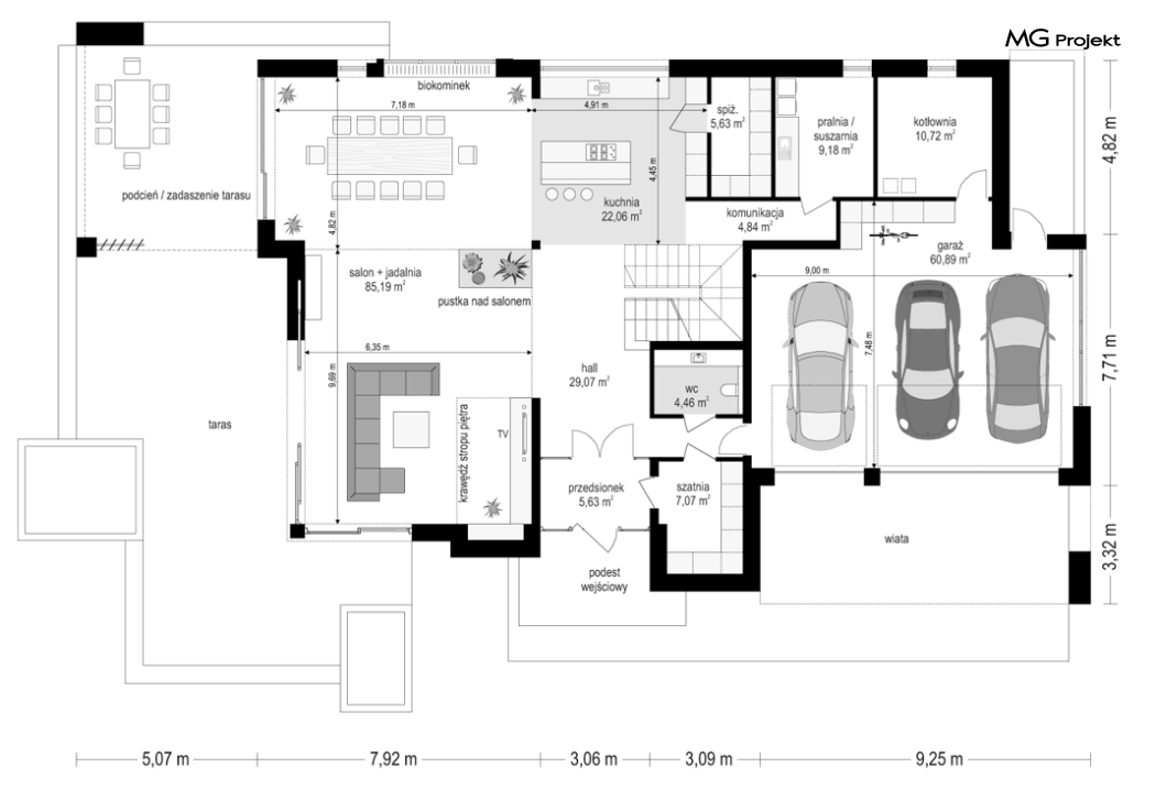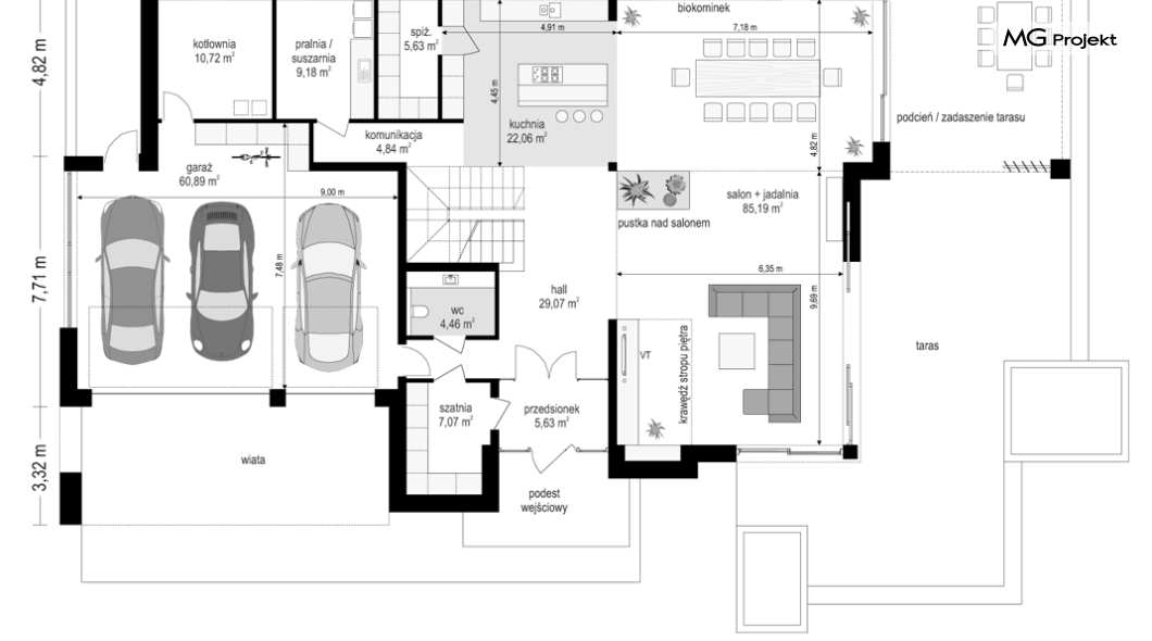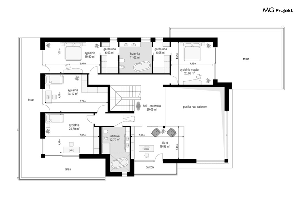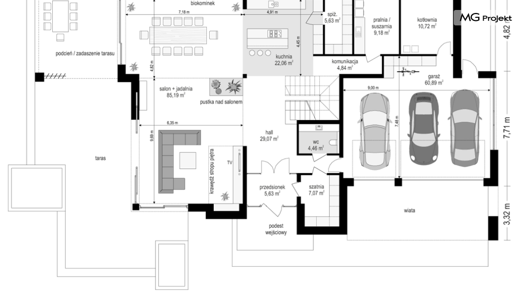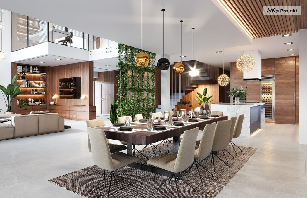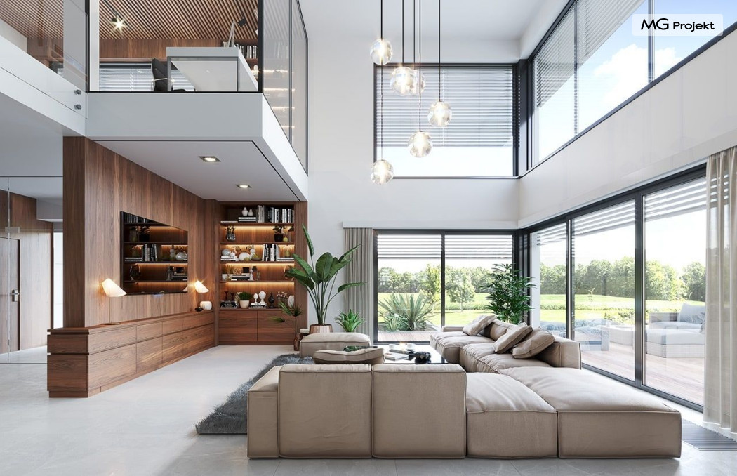 Elewacją ogrodową jest w Willi Florydzie 5 elewacja boczna domu z dużym zadaszonym tarasem - miejscem wieczornych biesiad, oraz wielkimi narożnymi przeszkleniami salonu. Wnętrze parteru to przede wszystkim ogromna jednoprzestrzenna powierzchni połączonych pomieszczeń holu, salonu, jadalni i kuchni. To prawie 150 m2 swobodnej, otwartej przestrzeni dziennej. Mieszczą się tutaj reprezentacyjne schody na piętro, salon z dużą pustką i otwarciem na antresolę powyżej, z rozkosznym kompletem wypoczynkowym i ścianą telewizyjną. Mamy tutaj jadalnię ze stołem na 14 lub więcej osób i pięknym kominkiem gazowym, mamy kuchnię z wyspą, a na środku ogródek na reprezentacyjne rośliny i mnóstwo miejsca na ekspozycję wyjątkowych obrazów i innych dzieł sztuki. Wszystko skąpane jest w świetle szerokich dwukondygnacyjnych przeszkleń. Na zapleczu za kuchnią mamy pomieszczenia gospodarcze jak pralnia, spiżarnia, czy kotłownia. Przy wejściu : szatnię, toaletę i przejście do trzystanowiskowego garażu. Piętro domu to z kolei sypialnia master z garderobami i łazienką, oraz z dodatkowym rezerwowym pokojem i dwie sypialnie dziecięce z własną drugą łazienką. Nad salonem wisi pięknie przeszklone pomieszczenie biura domowego lub biblioteki, oraz otwierająca się na parter i na ogród antresola. Wszystkie pokoje na piętrze mają swoje wyjścia na okalające tarasy. Sypialnia master ma osobny bardzo duży taras z widokiem na ogród. Willa Floryda 5 to kolejna propozycja dużego luksusowego domu dla odważnych Inwestorów, chcących spełnić swoje marzenia o wyjątkowym miejscu do życia, chcących cieszyć się nietuzinkową - nowoczesną zarazem niekrzykliwą a gustowną architekturą. Zapraszamy do zapoznania się z pełną ofertą pracowni MG Projekt: Willa Floryda 2, Willa Floryda, Willa Floryda 3, Willa Floryda 4, Rezydencja Floryda, Rezydencja Floryda 2.