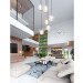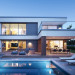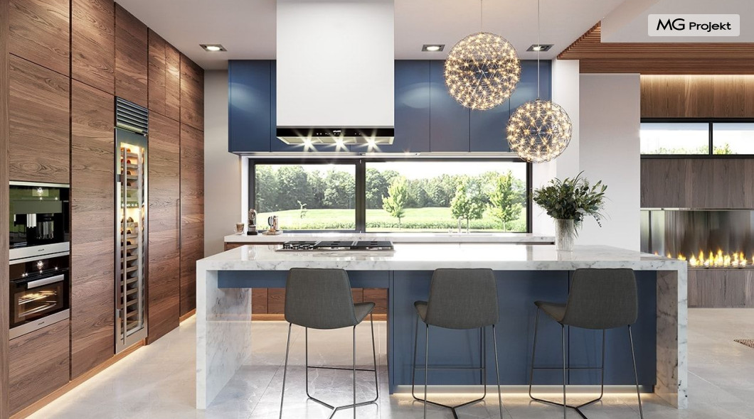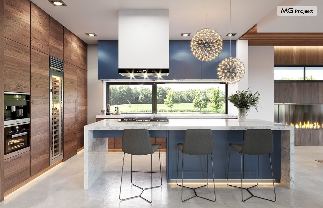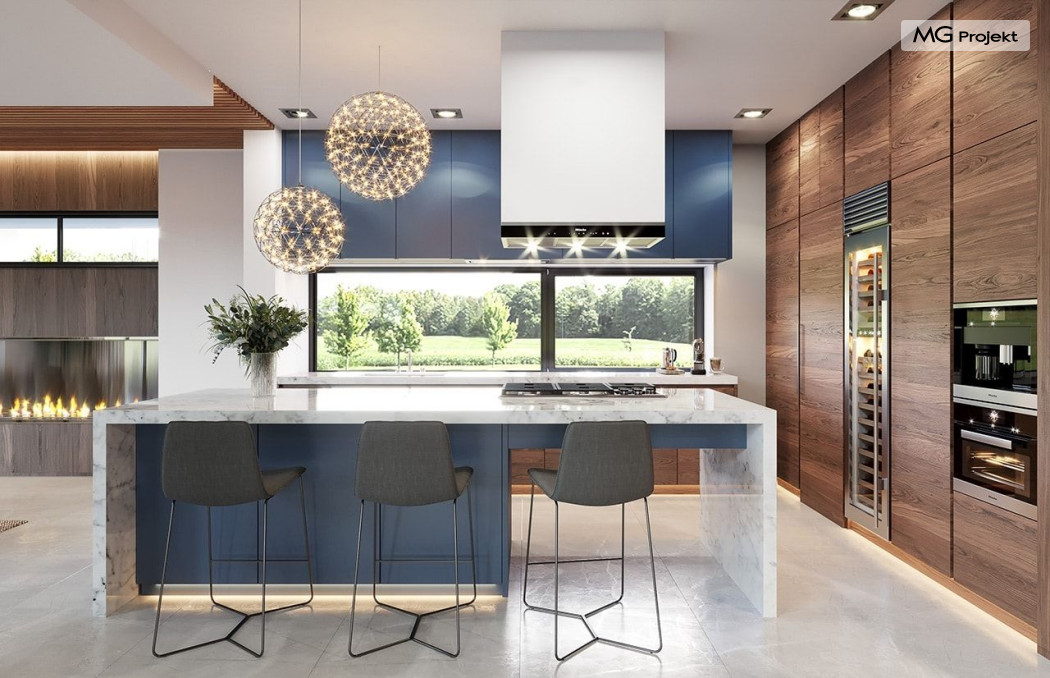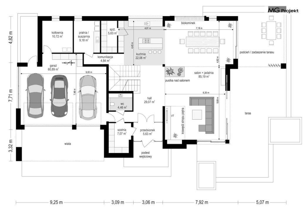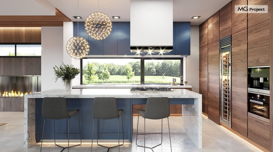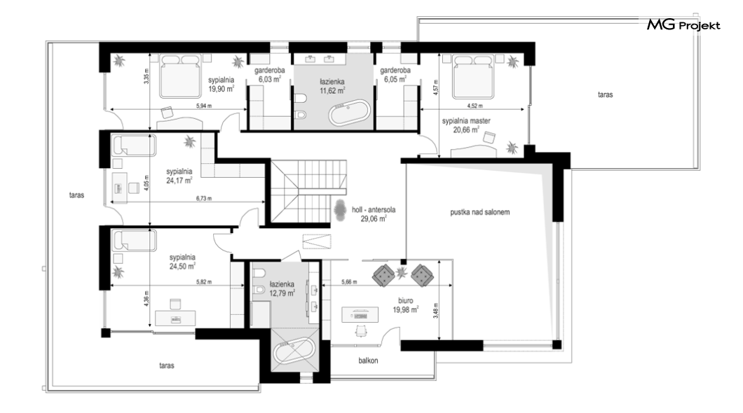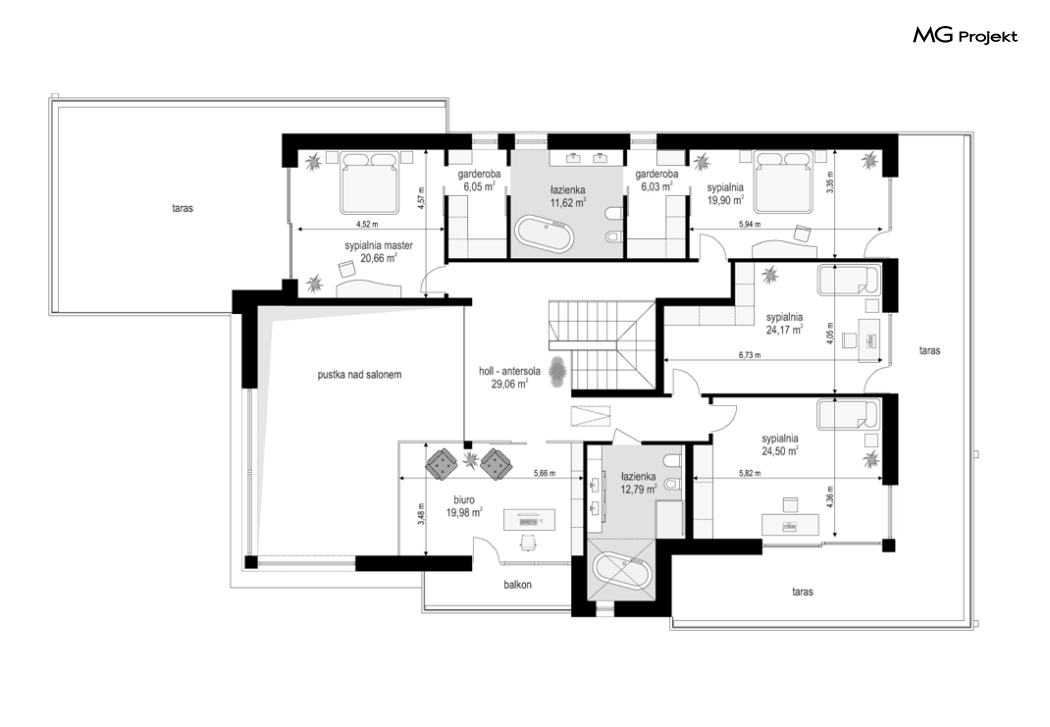 Elewacją ogrodową jest w Willi Florydzie 5 elewacja boczna domu z dużym zadaszonym tarasem - miejscem wieczornych biesiad, oraz wielkimi narożnymi przeszkleniami salonu. Wnętrze parteru to przede wszystkim ogromna jednoprzestrzenna powierzchni połączonych pomieszczeń holu, salonu, jadalni i kuchni. To prawie 150 m2 swobodnej, otwartej przestrzeni dziennej. Mieszczą się tutaj reprezentacyjne schody na piętro, salon z dużą pustką i otwarciem na antresolę powyżej, z rozkosznym kompletem wypoczynkowym i ścianą telewizyjną. Mamy tutaj jadalnię ze stołem na 14 lub więcej osób i pięknym kominkiem gazowym, mamy kuchnię z wyspą, a na środku ogródek na reprezentacyjne rośliny i mnóstwo miejsca na ekspozycję wyjątkowych obrazów i innych dzieł sztuki. Wszystko skąpane jest w świetle szerokich dwukondygnacyjnych przeszkleń. Na zapleczu za kuchnią mamy pomieszczenia gospodarcze jak pralnia, spiżarnia, czy kotłownia. Przy wejściu : szatnię, toaletę i przejście do trzystanowiskowego garażu. Piętro domu to z kolei sypialnia master z garderobami i łazienką, oraz z dodatkowym rezerwowym pokojem i dwie sypialnie dziecięce z własną drugą łazienką. Nad salonem wisi pięknie przeszklone pomieszczenie biura domowego lub biblioteki, oraz otwierająca się na parter i na ogród antresola. Wszystkie pokoje na piętrze mają swoje wyjścia na okalające tarasy. Sypialnia master ma osobny bardzo duży taras z widokiem na ogród. Willa Floryda 5 to kolejna propozycja dużego luksusowego domu dla odważnych Inwestorów, chcących spełnić swoje marzenia o wyjątkowym miejscu do życia, chcących cieszyć się nietuzinkową - nowoczesną zarazem niekrzykliwą a gustowną architekturą. Zapraszamy do zapoznania się z pełną ofertą pracowni MG Projekt: Willa Floryda 2, Willa Floryda, Willa Floryda 3, Willa Floryda 4, Rezydencja Floryda, Rezydencja Floryda 2.