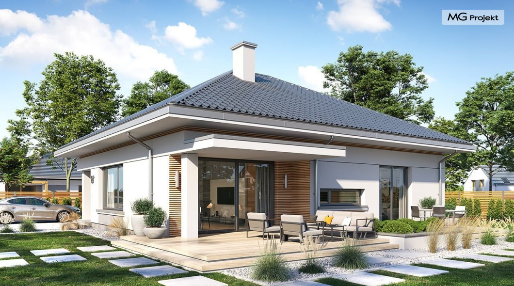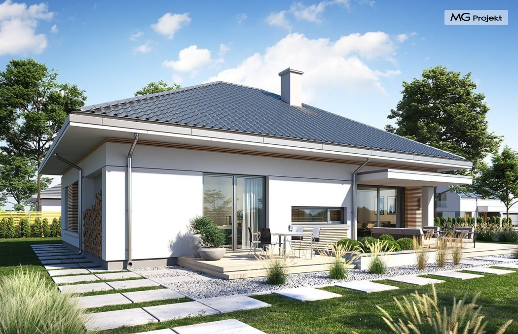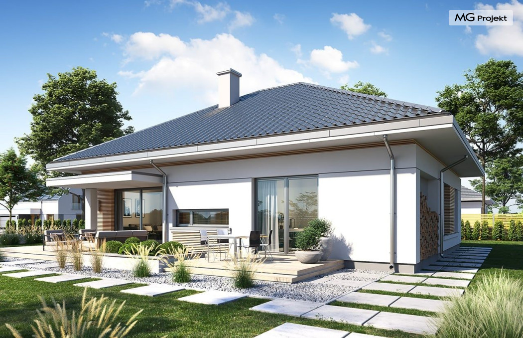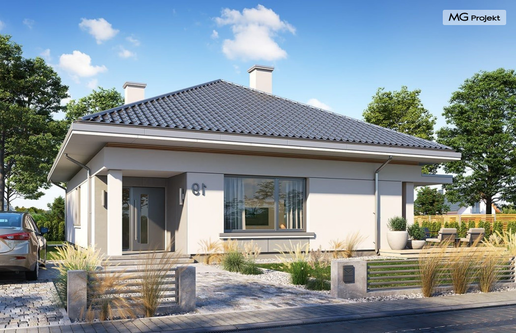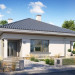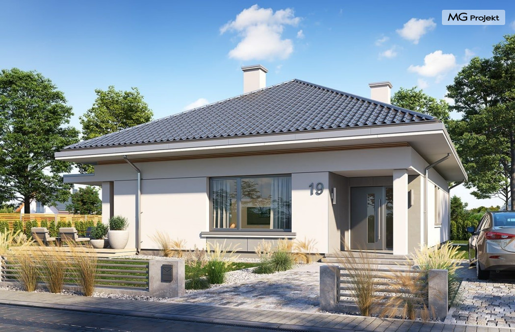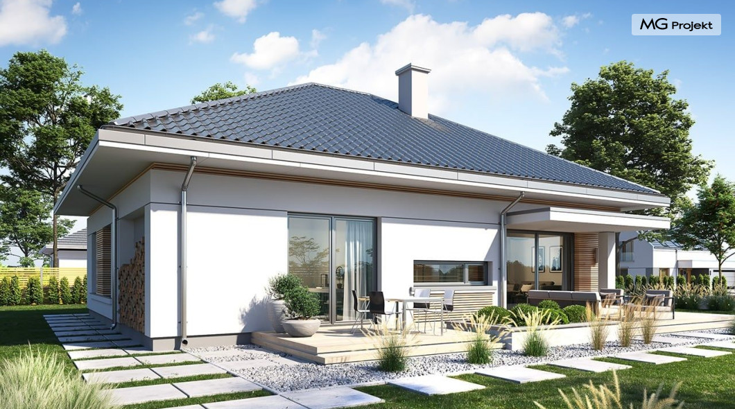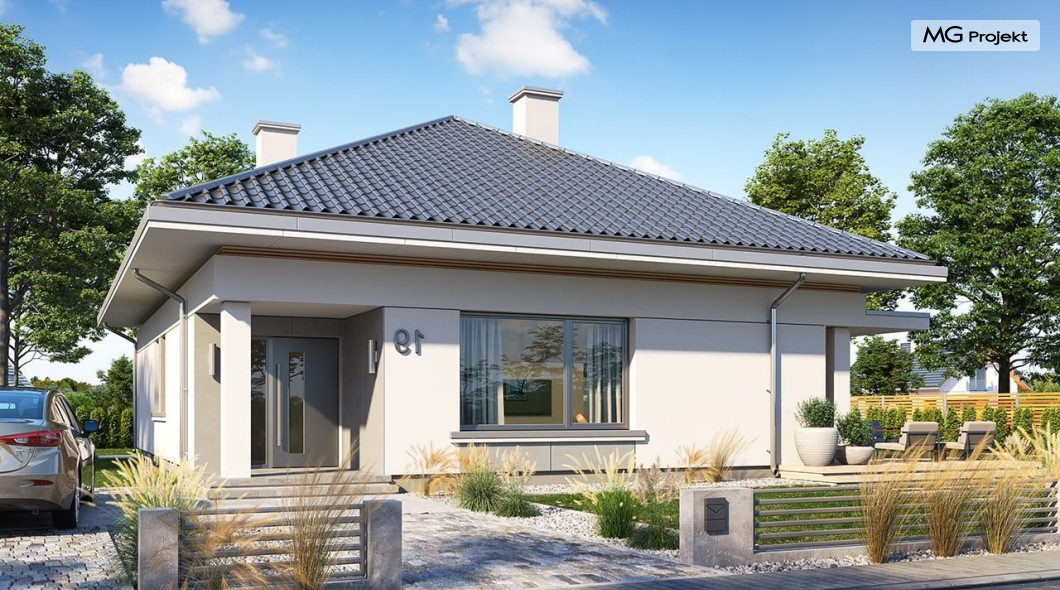 Projekt domu Wspaniały 2 to projekt z serii naszych domków „Wspaniałych”. Jest to budynek parterowy, zbudowany na planie prostokąta, przykryty czterospadowym dachem. Dom mimo swojej prostej formy i bryły, ma ciekawą nowoczesną architekturę, przełamującą monotonię i nudę wielu innych nudnych parterówek. Dzięki zastosowanym detalom i materiałom dom jest oryginalny i inny. Mimo swojej niedużej powierzchni robi wrażenie komfortowego i przestronnego. Dzięki przesunięciu części dziennej na front budynku doskonale nadaje się na działki o niekorzystnym ustawieniu do słońca - z ogrodem z boku domu lub nawet od strony drogi dojazdowej. Podcień wejściowy zlokalizowany w narożniku pozwoli ustawić budynek względem wjazdu frontem lub bokiem - dowolnie, w zależności od pomysłu na zagospodarowanie działki. Narożny podcień, podział elewacji na poziome pasy, czy płata zadaszenia nad tarasem, stanowią piękne urozmaicenie architektury budynku. Duże przeszklenia części dziennej otwierają wnętrze na otaczający ogród. Wnętrze podzielono na jednoprzestrzenną powierzchnię połączonego salonu z jadalnią i kuchnią, oraz na cześć nocną z trzema sypialniami. Sypialnia rodziców ma dwie oddzielne garderoby –jej i jego, sypialnie dziecięce mają wbudowane w ścianę szafy wnękowe. Dodatkowe pomieszczenia gospodarcze - kotłownia i pralnia dopełniają wnętrze. Centralnym miejscem części dziennej jest pięknie skomponowana ściana telewizyjno – kominkowa. Wygodna częściowo otwarta kuchnia ozdobiona jest szerokim oknem między szafkami, przez które można podziwiać ogród. Dom ma prostą konstrukcję, prostą bryłę, jest łatwy i niedrogi w budowie. We „Wspaniałym 2” przewidziano strop nad parterem ora konstrukcję dachu w postaci konstrukcji z wiązarów prefabrykowanych drewnianych, co znacznie uprasza i przyspiesza budowę i obniża jej koszt. Nad parterem znajduje się dodatkowa przestrzeń strychowa do dowolnego wykorzystania. Dom jest energooszczędny, ma bardzo dobre izolacje i zastosowane nowoczesne instalacje, dzięki czemu będzie tani w eksploatacji. „Wspaniały 2” jest odpowiedzią dla Inwestorów poszukujących projektu prostego i nowoczesnego domu, z funkcjonalnym wnętrzem i ciekawą architekturą - niedrogiego i łatwego w budowie. Zapraszamy !