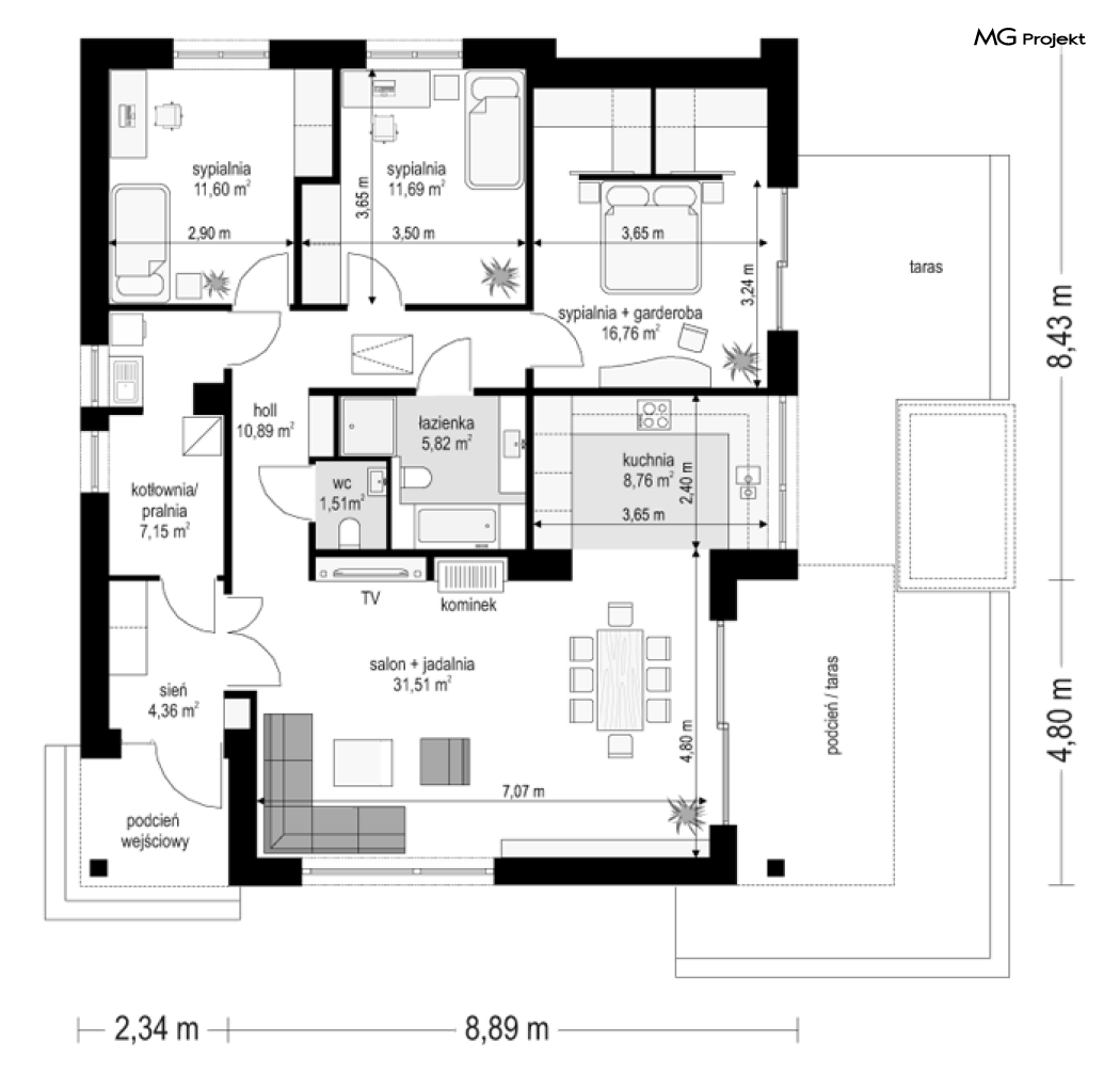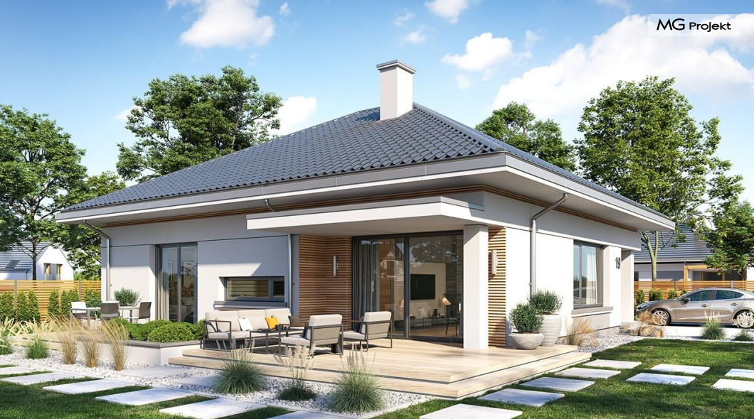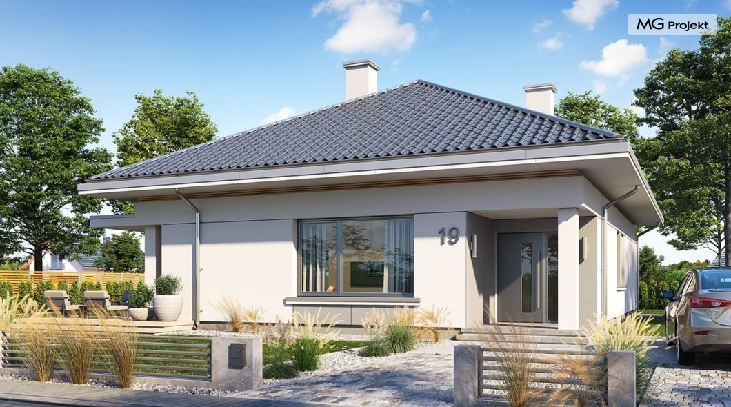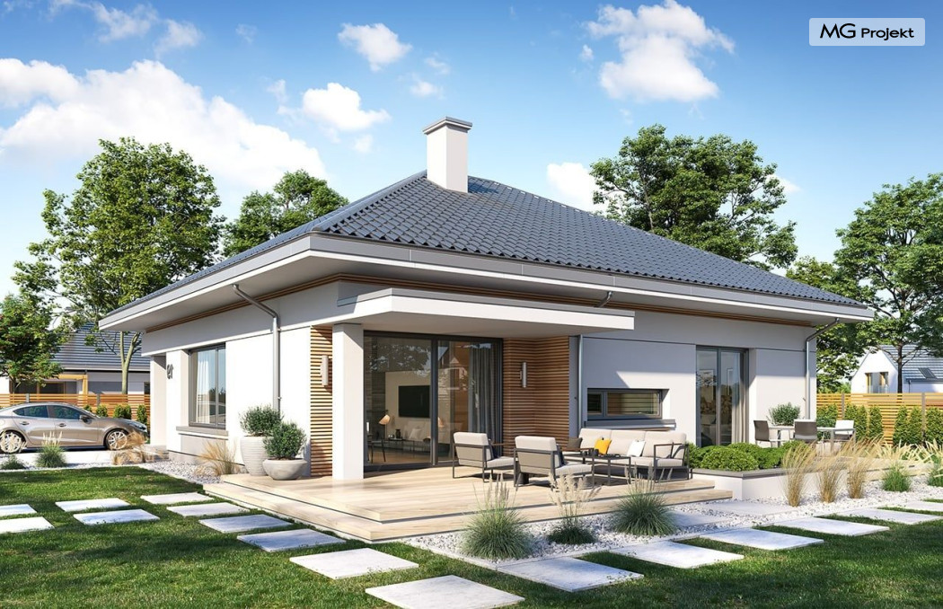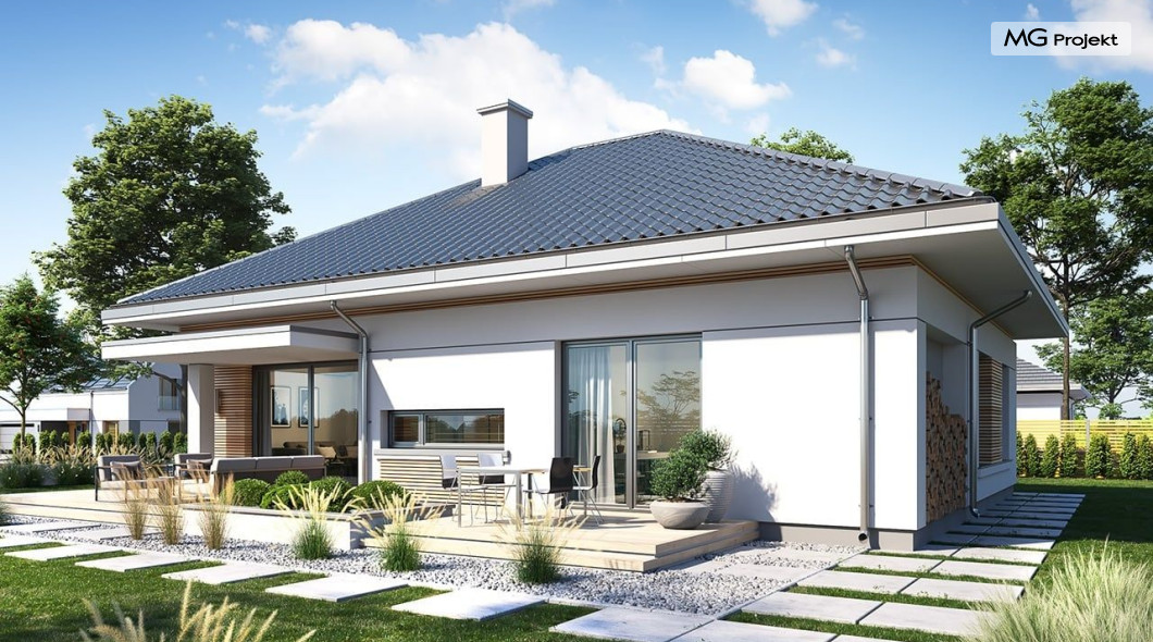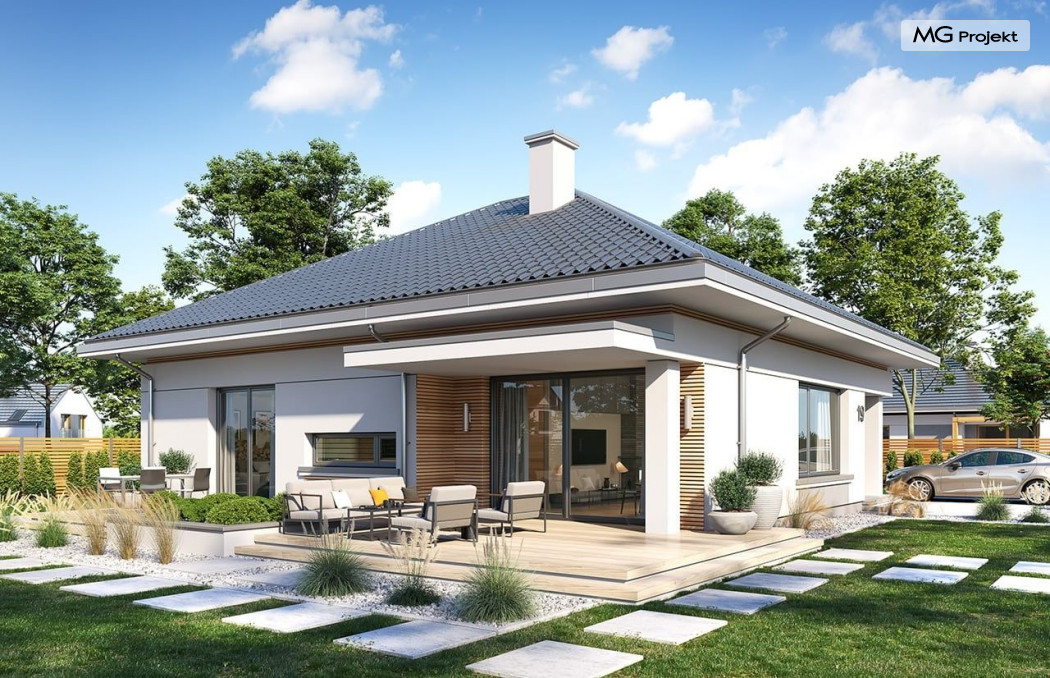 Projekt domu Wspaniały 2 to projekt z serii naszych domków „Wspaniałych”. Jest to budynek parterowy, zbudowany na planie prostokąta, przykryty czterospadowym dachem. Dom mimo swojej prostej formy i bryły, ma ciekawą nowoczesną architekturę, przełamującą monotonię i nudę wielu innych nudnych parterówek. Dzięki zastosowanym detalom i materiałom dom jest oryginalny i inny. Mimo swojej niedużej powierzchni robi wrażenie komfortowego i przestronnego. Dzięki przesunięciu części dziennej na front budynku doskonale nadaje się na działki o niekorzystnym ustawieniu do słońca - z ogrodem z boku domu lub nawet od strony drogi dojazdowej. Podcień wejściowy zlokalizowany w narożniku pozwoli ustawić budynek względem wjazdu frontem lub bokiem - dowolnie, w zależności od pomysłu na zagospodarowanie działki. Narożny podcień, podział elewacji na poziome pasy, czy płata zadaszenia nad tarasem, stanowią piękne urozmaicenie architektury budynku. Duże przeszklenia części dziennej otwierają wnętrze na otaczający ogród. Wnętrze podzielono na jednoprzestrzenną powierzchnię połączonego salonu z jadalnią i kuchnią, oraz na cześć nocną z trzema sypialniami. Sypialnia rodziców ma dwie oddzielne garderoby –jej i jego, sypialnie dziecięce mają wbudowane w ścianę szafy wnękowe. Dodatkowe pomieszczenia gospodarcze - kotłownia i pralnia dopełniają wnętrze. Centralnym miejscem części dziennej jest pięknie skomponowana ściana telewizyjno – kominkowa. Wygodna częściowo otwarta kuchnia ozdobiona jest szerokim oknem między szafkami, przez które można podziwiać ogród. Dom ma prostą konstrukcję, prostą bryłę, jest łatwy i niedrogi w budowie. We „Wspaniałym 2” przewidziano strop nad parterem ora konstrukcję dachu w postaci konstrukcji z wiązarów prefabrykowanych drewnianych, co znacznie uprasza i przyspiesza budowę i obniża jej koszt. Nad parterem znajduje się dodatkowa przestrzeń strychowa do dowolnego wykorzystania. Dom jest energooszczędny, ma bardzo dobre izolacje i zastosowane nowoczesne instalacje, dzięki czemu będzie tani w eksploatacji. „Wspaniały 2” jest odpowiedzią dla Inwestorów poszukujących projektu prostego i nowoczesnego domu, z funkcjonalnym wnętrzem i ciekawą architekturą - niedrogiego i łatwego w budowie. Zapraszamy !