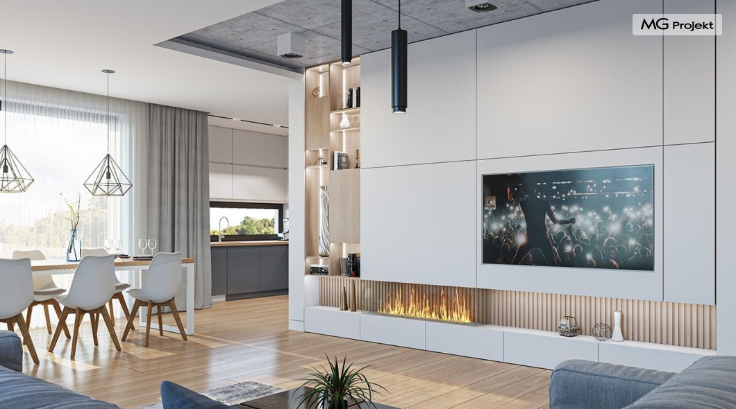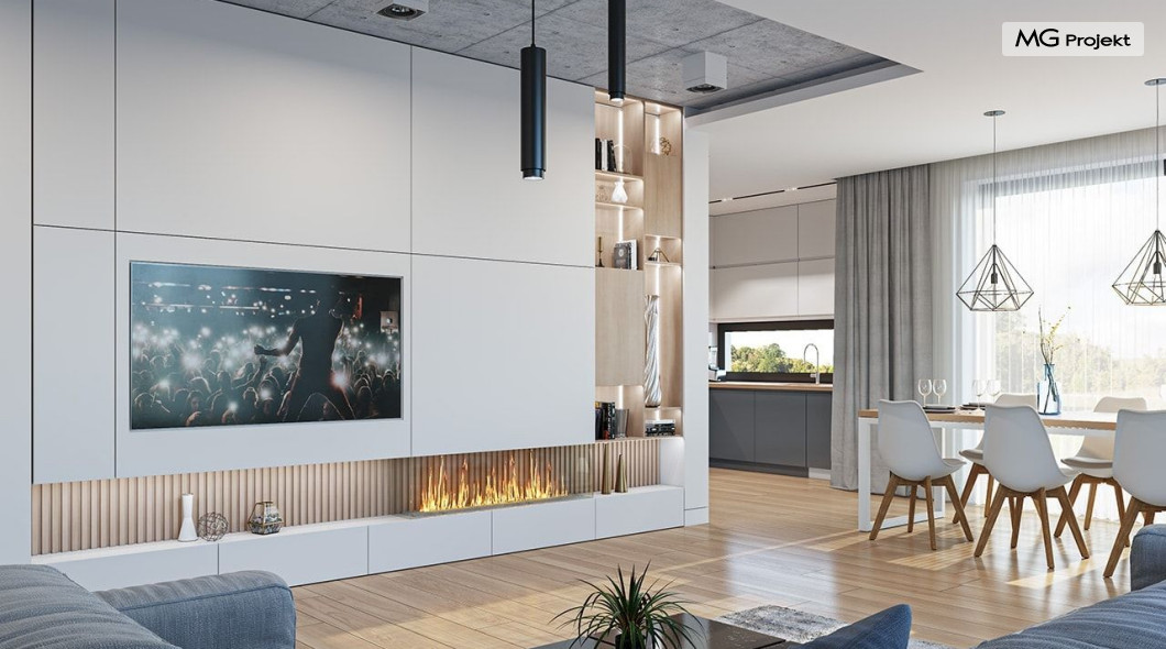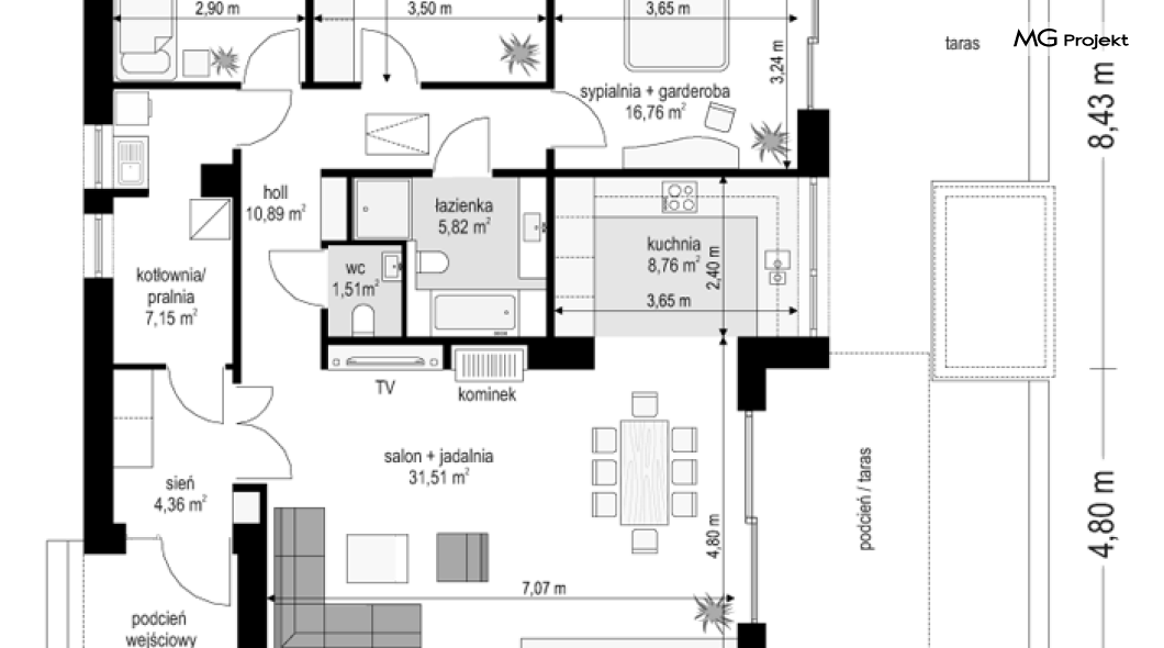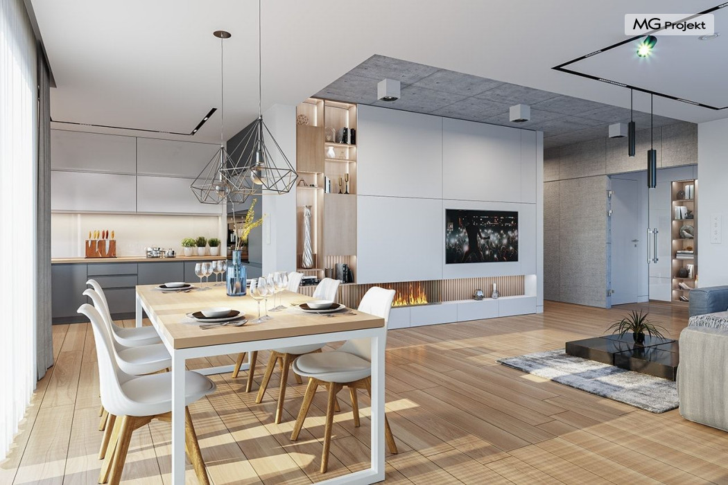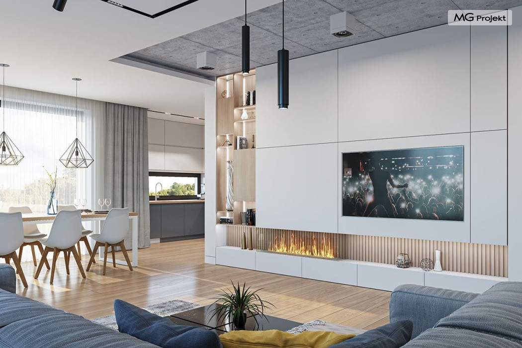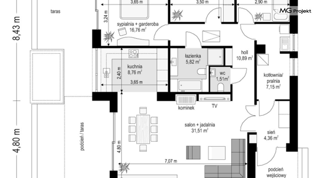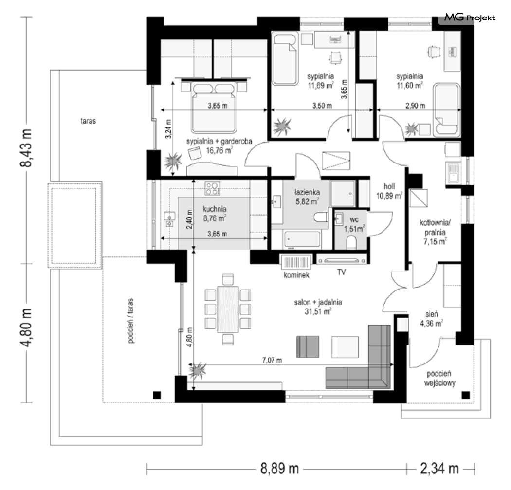 Projekt domu Wspaniały 2 to projekt z serii naszych domków „Wspaniałych”. Jest to budynek parterowy, zbudowany na planie prostokąta, przykryty czterospadowym dachem. Dom mimo swojej prostej formy i bryły, ma ciekawą nowoczesną architekturę, przełamującą monotonię i nudę wielu innych nudnych parterówek. Dzięki zastosowanym detalom i materiałom dom jest oryginalny i inny. Mimo swojej niedużej powierzchni robi wrażenie komfortowego i przestronnego. Dzięki przesunięciu części dziennej na front budynku doskonale nadaje się na działki o niekorzystnym ustawieniu do słońca - z ogrodem z boku domu lub nawet od strony drogi dojazdowej. Podcień wejściowy zlokalizowany w narożniku pozwoli ustawić budynek względem wjazdu frontem lub bokiem - dowolnie, w zależności od pomysłu na zagospodarowanie działki. Narożny podcień, podział elewacji na poziome pasy, czy płata zadaszenia nad tarasem, stanowią piękne urozmaicenie architektury budynku. Duże przeszklenia części dziennej otwierają wnętrze na otaczający ogród. Wnętrze podzielono na jednoprzestrzenną powierzchnię połączonego salonu z jadalnią i kuchnią, oraz na cześć nocną z trzema sypialniami. Sypialnia rodziców ma dwie oddzielne garderoby –jej i jego, sypialnie dziecięce mają wbudowane w ścianę szafy wnękowe. Dodatkowe pomieszczenia gospodarcze - kotłownia i pralnia dopełniają wnętrze. Centralnym miejscem części dziennej jest pięknie skomponowana ściana telewizyjno – kominkowa. Wygodna częściowo otwarta kuchnia ozdobiona jest szerokim oknem między szafkami, przez które można podziwiać ogród. Dom ma prostą konstrukcję, prostą bryłę, jest łatwy i niedrogi w budowie. We „Wspaniałym 2” przewidziano strop nad parterem ora konstrukcję dachu w postaci konstrukcji z wiązarów prefabrykowanych drewnianych, co znacznie uprasza i przyspiesza budowę i obniża jej koszt. Nad parterem znajduje się dodatkowa przestrzeń strychowa do dowolnego wykorzystania. Dom jest energooszczędny, ma bardzo dobre izolacje i zastosowane nowoczesne instalacje, dzięki czemu będzie tani w eksploatacji. „Wspaniały 2” jest odpowiedzią dla Inwestorów poszukujących projektu prostego i nowoczesnego domu, z funkcjonalnym wnętrzem i ciekawą architekturą - niedrogiego i łatwego w budowie. Zapraszamy !