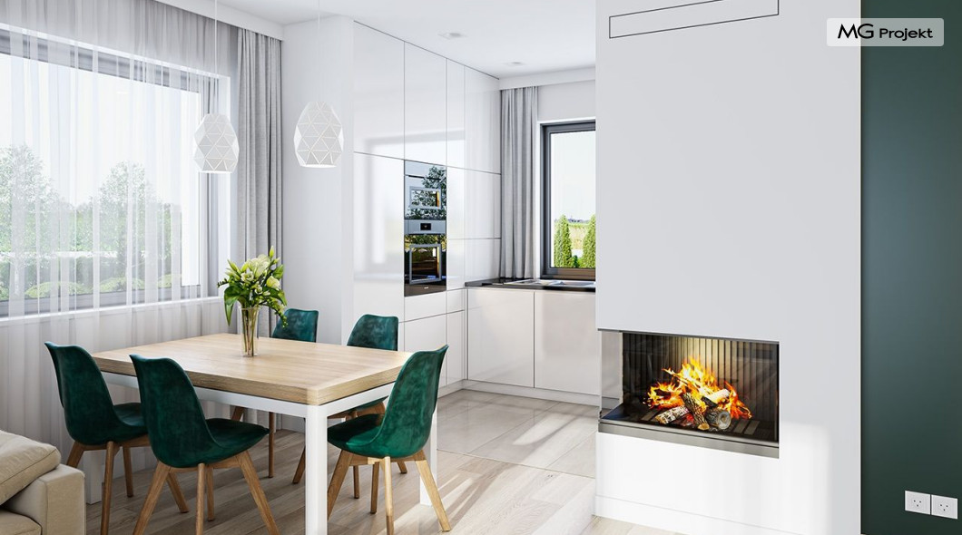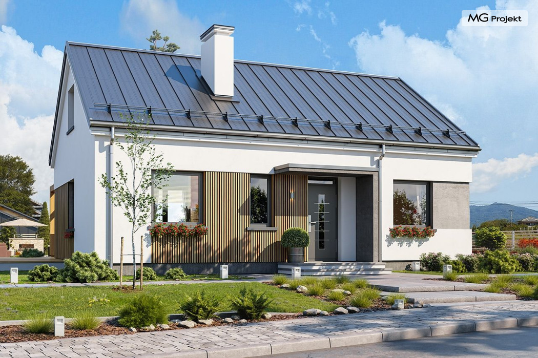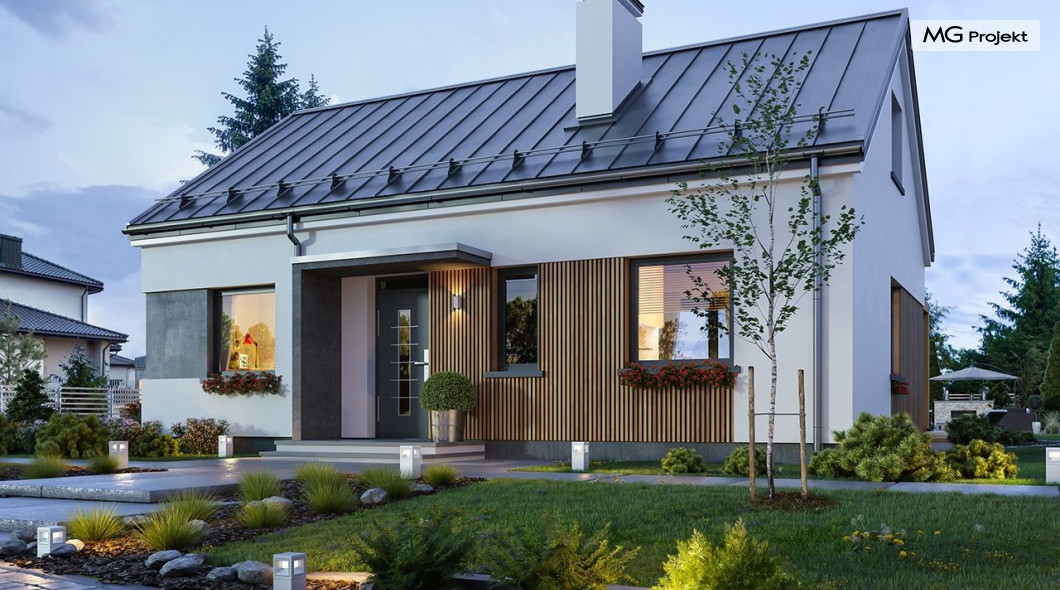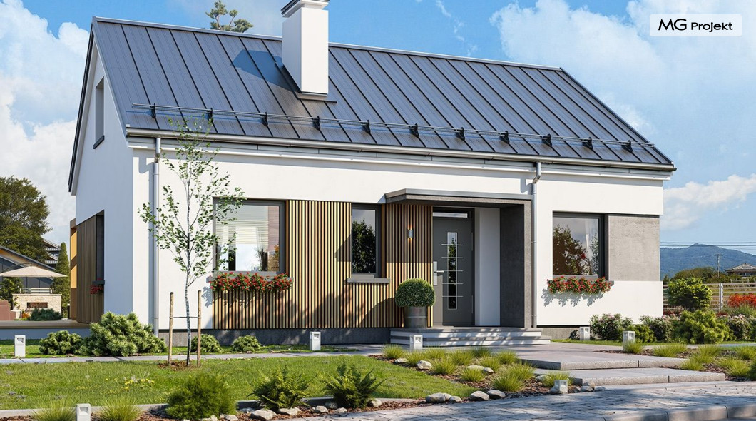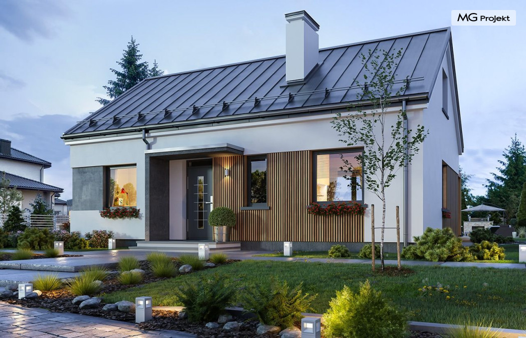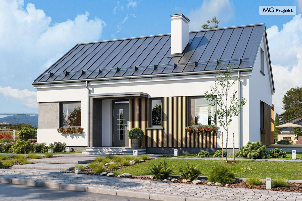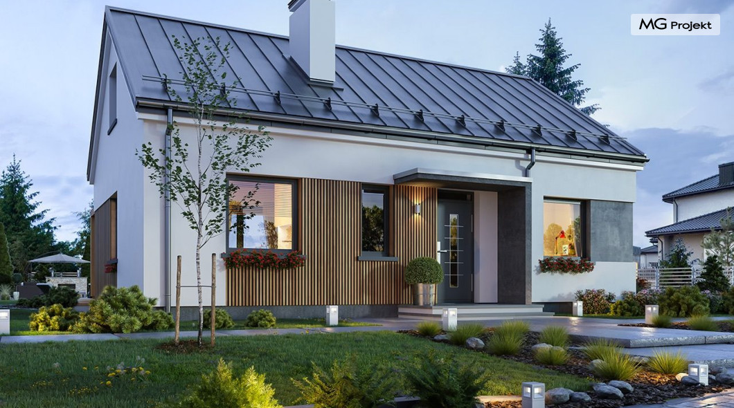 Projekt domu Kasia 6 to projekt prostego bezpretensjonalnego domu – energooszczędnego, niedrogiego w budowie i późniejszym utrzymaniu - w sam raz dla 4-5 osobowej rodziny, która chce żyć wygodnie i komfortowo, ale nie chce zadłużać się na całe życie inwestując w drogi dom. Seria domków „ Kasia ” to doskonała propozycja dla pragmatycznie myślących osób, planujących budowę łatwą, szybką i nieskomplikowaną. Budynek zaprojektowano jako parterowy, założony na planie prostokąta o wymiarach 11x8 m, przykryty dwuspadowym dachem. Zasadniczą podstawową bryłę domu można - w zależności od wybranej wersji wariantowej „Kasi” - wzbogacić o : wiatę garażową, garaż, zadaszenie nad tarasem ogrodowym, czy też strych nad parterem o funkcji magazynu, lub poddasza do zagospodarowania w razie potrzeby. Dom ma prostą i nowoczesną architekturę, a zarazem przytulny i sympatyczny wygląd - aż ma się ochotę w nim zamieszkać. Do wnętrza prowadzą nas drzwi wejściowe z naświetlem, do przedsionka z szafami. Stąd przechodzimy do przedpokoju, a dalej do salonu z kuchnią, oraz sypialni, łazienki i wc. Z przedsionka jest też dostęp do kotłowni, w której można umieścić zarówno kocioł c.o. na gaz, jak i pompę ciepła powietrze –woda, albo niewielki kocioł na paliwo stałe - w zależności od wyboru systemu ogrzewania. W salonie mamy wolną ścianę telewizyjną i kominek narożny na osobnej ścianie - obok kotłowni dzięki czemu w domu jest tylko jeden zespół kominowy. W domu zaprojektowano osobno łazienkę i wc - wygodne rzadko spotykane rozwiązanie w niewielkich domach. W łazience mamy dużo miejsca na prysznic, oraz pralkę i suszarkę. W budynku przewidziano wentylację mechaniczną z rekuperacją w standardzie. Można rozważyć dokupienie instalacji paneli fotowoltaicznych - kształt dachu na to pozwala. Konstrukcja „Kasi” jest bardzo prosta - prościej się nie da : mamy tutaj tylko ściany zewnętrzne jako konstrukcyjne, a nad ścianami wiązary dachowe, stanowiące konstrukcję stropu i dachu. Posiadamy wersję wariantową z otwartym sufitem nad salonem aż do dachu, dzięki czemu wnętrze salonu powiększa się. „Kasia” to projekt energooszczędny, z bardzo dobrymi ociepleniami przegród, z nowoczesnymi instalacjami, tani w budowie i późniejszym utrzymaniu. Zapraszamy do zapoznanie się także z projektami domków: Kasia, Kasia 2, Kasia 3, Kasia 4, Kasia 5, Kasia 7!