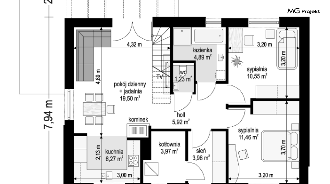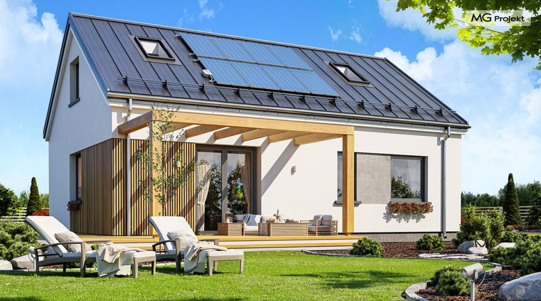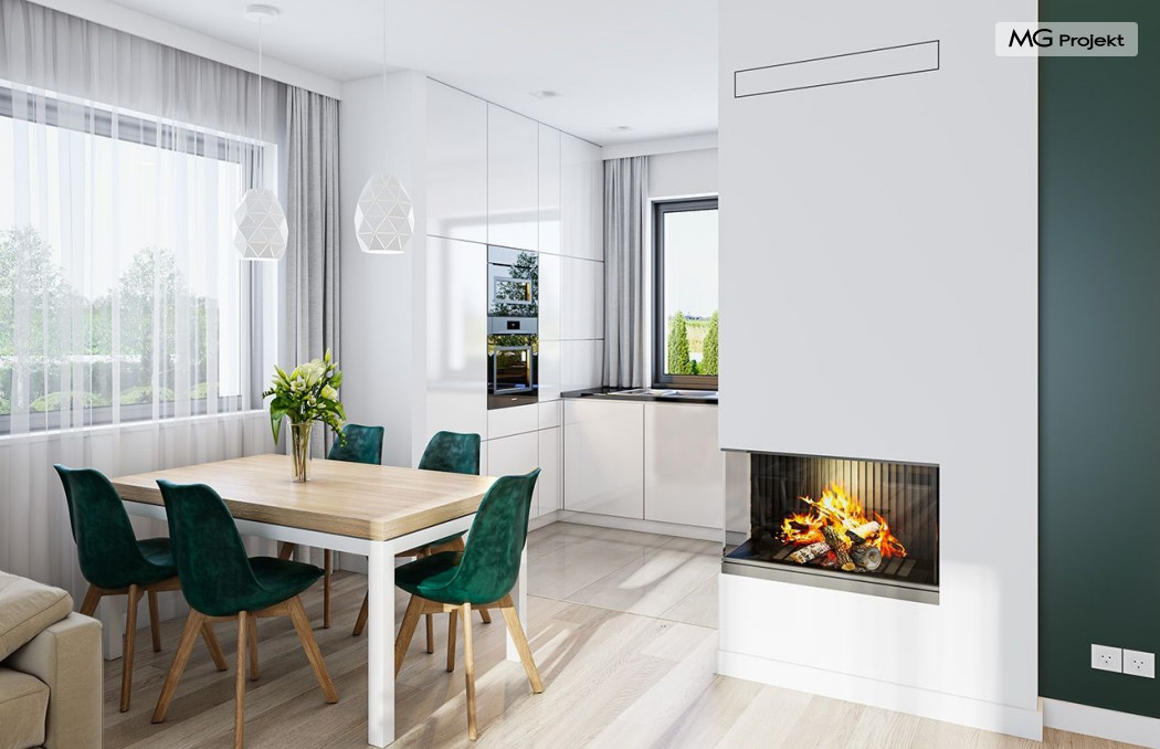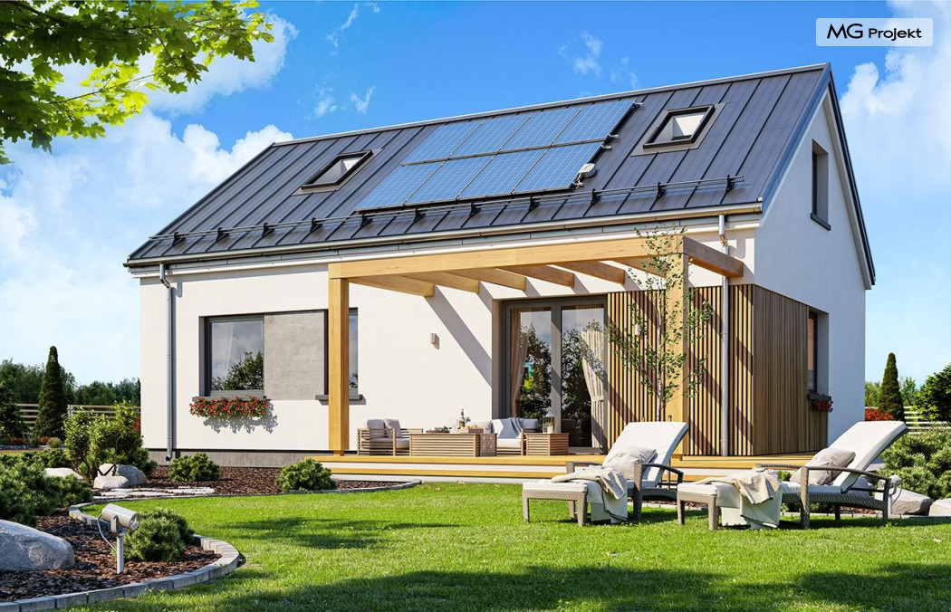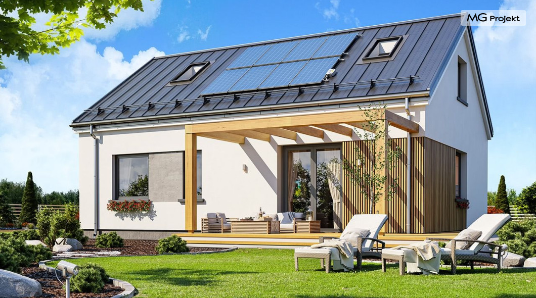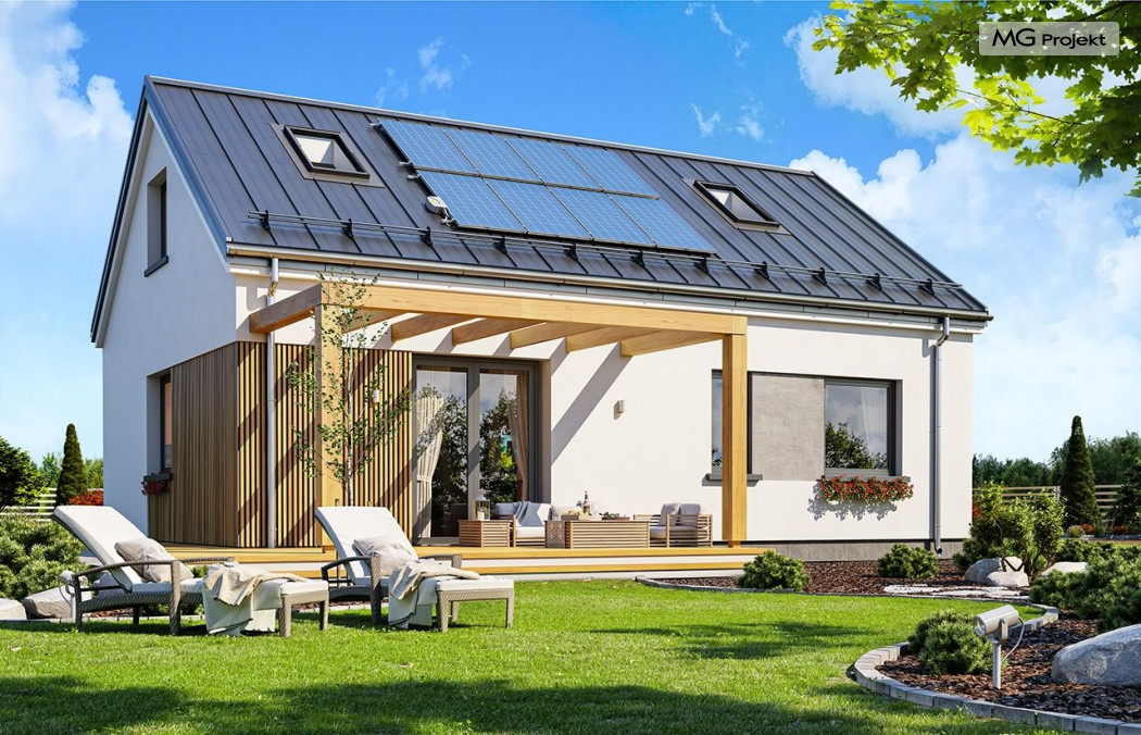 Projekt domu Kasia 6 to projekt prostego bezpretensjonalnego domu – energooszczędnego, niedrogiego w budowie i późniejszym utrzymaniu - w sam raz dla 4-5 osobowej rodziny, która chce żyć wygodnie i komfortowo, ale nie chce zadłużać się na całe życie inwestując w drogi dom. Seria domków „ Kasia ” to doskonała propozycja dla pragmatycznie myślących osób, planujących budowę łatwą, szybką i nieskomplikowaną. Budynek zaprojektowano jako parterowy, założony na planie prostokąta o wymiarach 11x8 m, przykryty dwuspadowym dachem. Zasadniczą podstawową bryłę domu można - w zależności od wybranej wersji wariantowej „Kasi” - wzbogacić o : wiatę garażową, garaż, zadaszenie nad tarasem ogrodowym, czy też strych nad parterem o funkcji magazynu, lub poddasza do zagospodarowania w razie potrzeby. Dom ma prostą i nowoczesną architekturę, a zarazem przytulny i sympatyczny wygląd - aż ma się ochotę w nim zamieszkać. Do wnętrza prowadzą nas drzwi wejściowe z naświetlem, do przedsionka z szafami. Stąd przechodzimy do przedpokoju, a dalej do salonu z kuchnią, oraz sypialni, łazienki i wc. Z przedsionka jest też dostęp do kotłowni, w której można umieścić zarówno kocioł c.o. na gaz, jak i pompę ciepła powietrze –woda, albo niewielki kocioł na paliwo stałe - w zależności od wyboru systemu ogrzewania. W salonie mamy wolną ścianę telewizyjną i kominek narożny na osobnej ścianie - obok kotłowni dzięki czemu w domu jest tylko jeden zespół kominowy. W domu zaprojektowano osobno łazienkę i wc - wygodne rzadko spotykane rozwiązanie w niewielkich domach. W łazience mamy dużo miejsca na prysznic, oraz pralkę i suszarkę. W budynku przewidziano wentylację mechaniczną z rekuperacją w standardzie. Można rozważyć dokupienie instalacji paneli fotowoltaicznych - kształt dachu na to pozwala. Konstrukcja „Kasi” jest bardzo prosta - prościej się nie da : mamy tutaj tylko ściany zewnętrzne jako konstrukcyjne, a nad ścianami wiązary dachowe, stanowiące konstrukcję stropu i dachu. Posiadamy wersję wariantową z otwartym sufitem nad salonem aż do dachu, dzięki czemu wnętrze salonu powiększa się. „Kasia” to projekt energooszczędny, z bardzo dobrymi ociepleniami przegród, z nowoczesnymi instalacjami, tani w budowie i późniejszym utrzymaniu. Zapraszamy do zapoznanie się także z projektami domków: Kasia, Kasia 2, Kasia 3, Kasia 4, Kasia 5, Kasia 7!