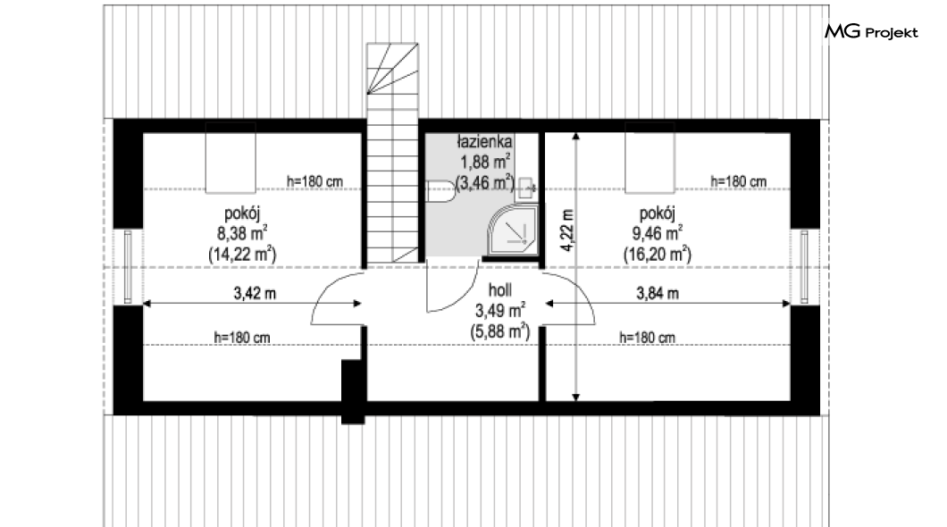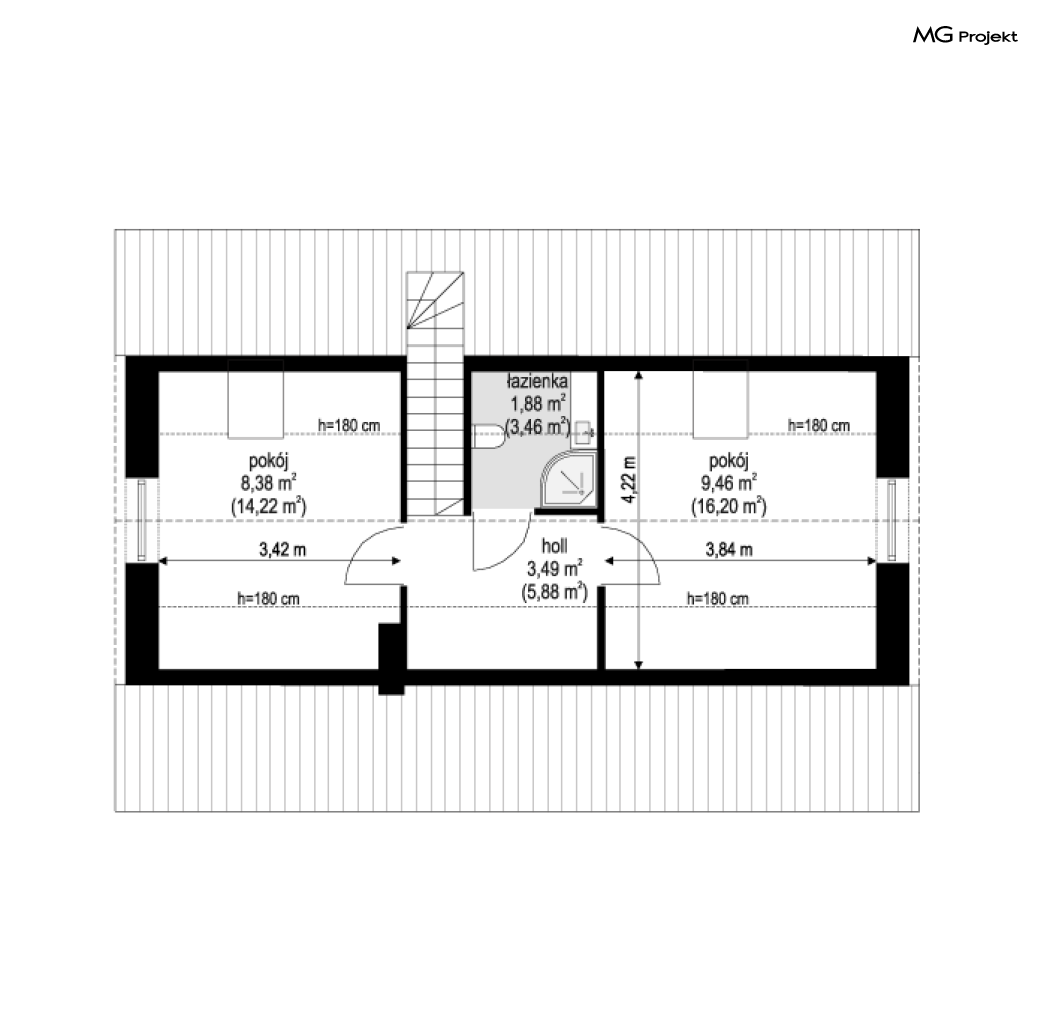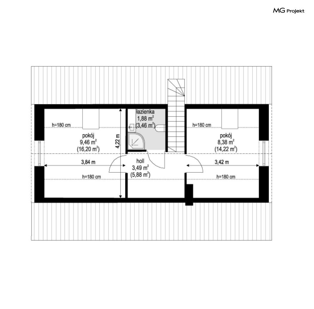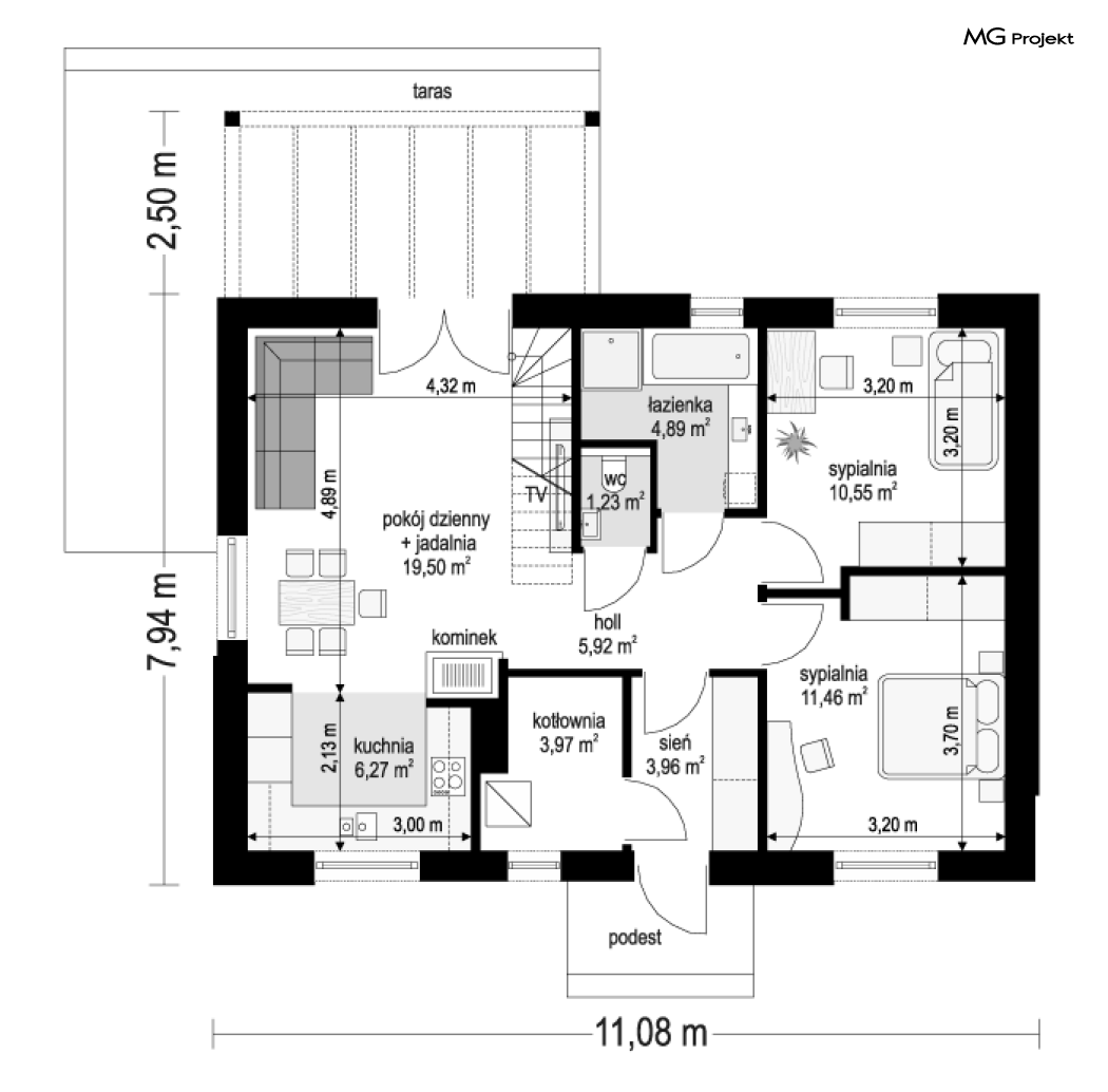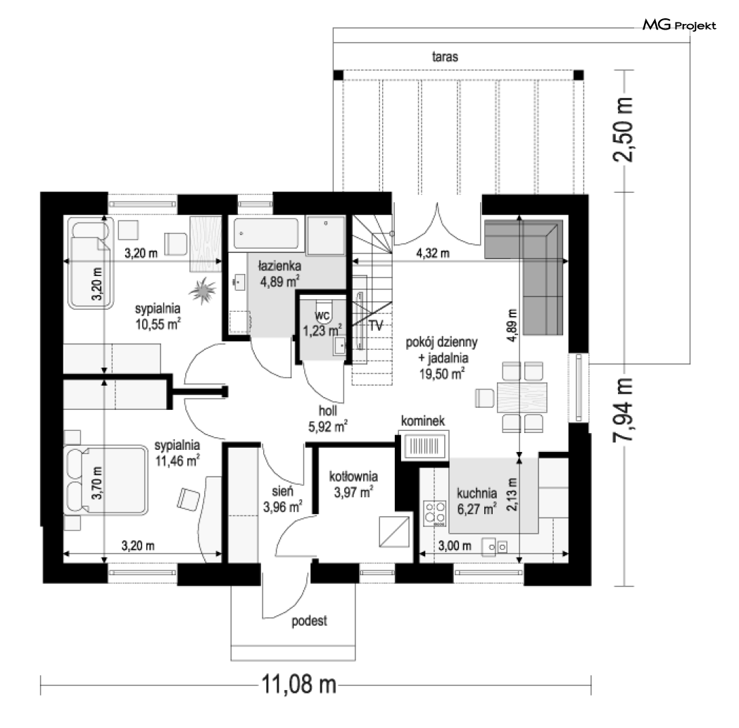 Projekt domu Kasia 6 to projekt prostego bezpretensjonalnego domu – energooszczędnego, niedrogiego w budowie i późniejszym utrzymaniu - w sam raz dla 4-5 osobowej rodziny, która chce żyć wygodnie i komfortowo, ale nie chce zadłużać się na całe życie inwestując w drogi dom. Seria domków „ Kasia ” to doskonała propozycja dla pragmatycznie myślących osób, planujących budowę łatwą, szybką i nieskomplikowaną. Budynek zaprojektowano jako parterowy, założony na planie prostokąta o wymiarach 11x8 m, przykryty dwuspadowym dachem. Zasadniczą podstawową bryłę domu można - w zależności od wybranej wersji wariantowej „Kasi” - wzbogacić o : wiatę garażową, garaż, zadaszenie nad tarasem ogrodowym, czy też strych nad parterem o funkcji magazynu, lub poddasza do zagospodarowania w razie potrzeby. Dom ma prostą i nowoczesną architekturę, a zarazem przytulny i sympatyczny wygląd - aż ma się ochotę w nim zamieszkać. Do wnętrza prowadzą nas drzwi wejściowe z naświetlem, do przedsionka z szafami. Stąd przechodzimy do przedpokoju, a dalej do salonu z kuchnią, oraz sypialni, łazienki i wc. Z przedsionka jest też dostęp do kotłowni, w której można umieścić zarówno kocioł c.o. na gaz, jak i pompę ciepła powietrze –woda, albo niewielki kocioł na paliwo stałe - w zależności od wyboru systemu ogrzewania. W salonie mamy wolną ścianę telewizyjną i kominek narożny na osobnej ścianie - obok kotłowni dzięki czemu w domu jest tylko jeden zespół kominowy. W domu zaprojektowano osobno łazienkę i wc - wygodne rzadko spotykane rozwiązanie w niewielkich domach. W łazience mamy dużo miejsca na prysznic, oraz pralkę i suszarkę. W budynku przewidziano wentylację mechaniczną z rekuperacją w standardzie. Można rozważyć dokupienie instalacji paneli fotowoltaicznych - kształt dachu na to pozwala. Konstrukcja „Kasi” jest bardzo prosta - prościej się nie da : mamy tutaj tylko ściany zewnętrzne jako konstrukcyjne, a nad ścianami wiązary dachowe, stanowiące konstrukcję stropu i dachu. Posiadamy wersję wariantową z otwartym sufitem nad salonem aż do dachu, dzięki czemu wnętrze salonu powiększa się. „Kasia” to projekt energooszczędny, z bardzo dobrymi ociepleniami przegród, z nowoczesnymi instalacjami, tani w budowie i późniejszym utrzymaniu. Zapraszamy do zapoznanie się także z projektami domków: Kasia, Kasia 2, Kasia 3, Kasia 4, Kasia 5, Kasia 7!