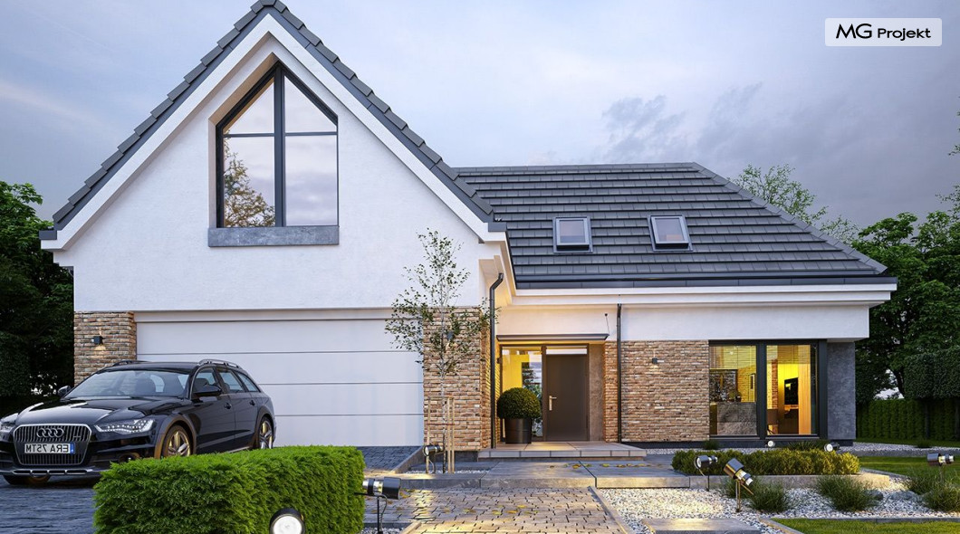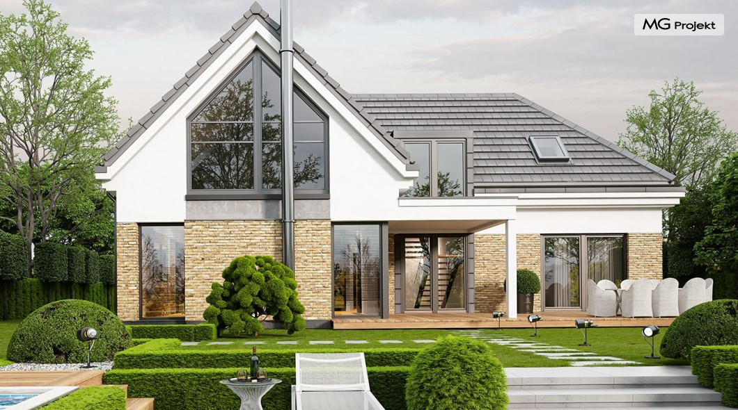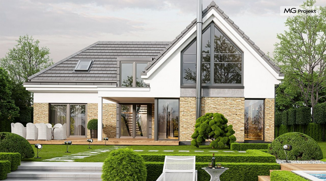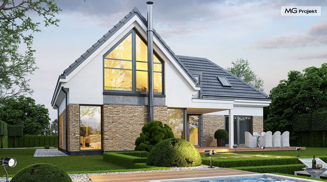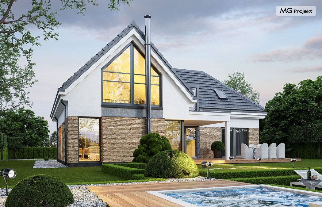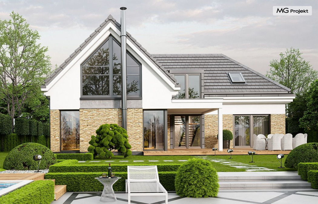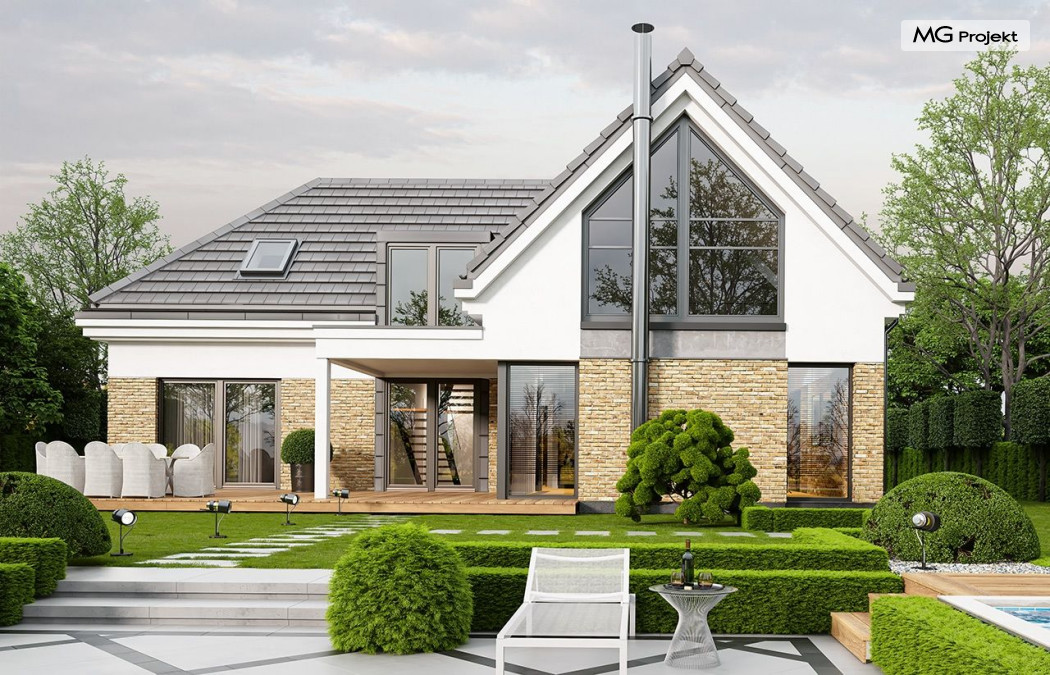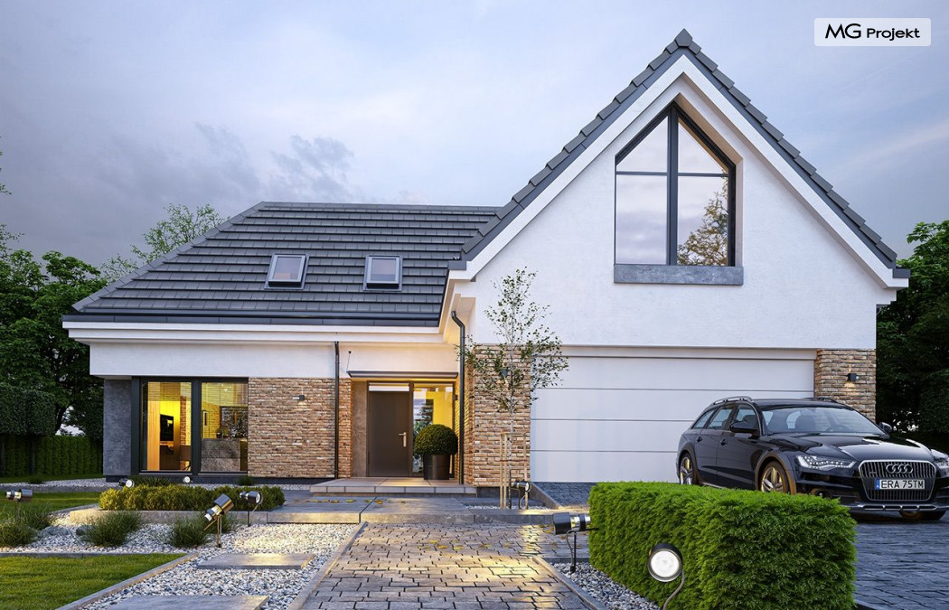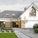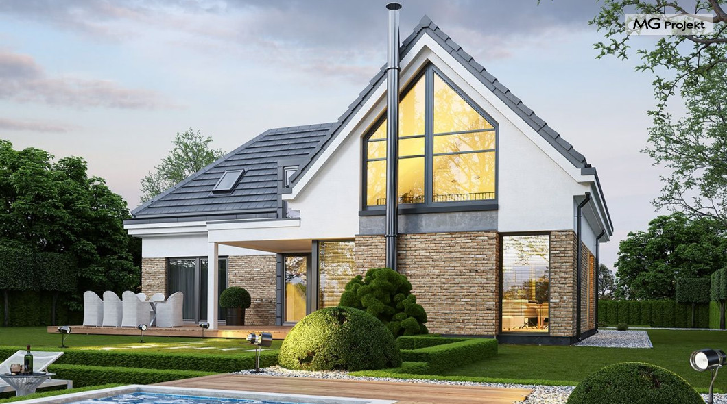Nazwa projektu domu Willa Eska wzięła się od kształtu bryły, wygiętej w literę "S", tworząc w ten sposób bardzo korzystny funkcjonalnie i wizualnie plan - z dziedzińcem frontowym i z tylnym patiem ogrodowym. Ideą projektu Willa Eska jest wkomponowanie nowoczesnej architektury, detali i funkcji, w tradycyjny kształt domu z dwuspadowym dachem. Dobrze dobrane proporcje willi eski, ciekawie poprowadzone podziały miedzy ścianami a powierzchniami szyb tworzą harmonijną, spokojną sylwetkę, o stonowanej ludzkiej skali. Front domu jednorodzinnego Willa Eska ozdabia reprezentacyjne wejście z bocznymi i górnymi naświetlami, zaakcentowane wnęką i zadaszeniem. Atrakcyjności elewacji frontowej dodaje narożne okno kuchenne, oraz piękne wysokie okno na poddaszu jednej z sypialni. Od strony ogrodu na pierwszy plan wychodzą detale: dużego okna części salonowej z otwarciem przestrzennym do sufitu, oraz prostopadłościenny przeszklony wykusz klatki schodowej wykończony blachą na rąbek. Udane proporcje projektu budynku Willa Eska, połączenie właściwie zastosowanych materiałów dają spójny atrakcyjny estetycznie efekt. Dodatkowo uroku sylwetce budynku Willa Eska dodają oryginalne gzymsowania okapów.