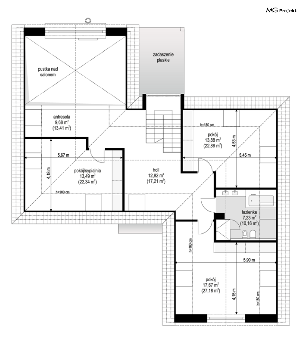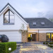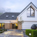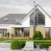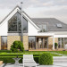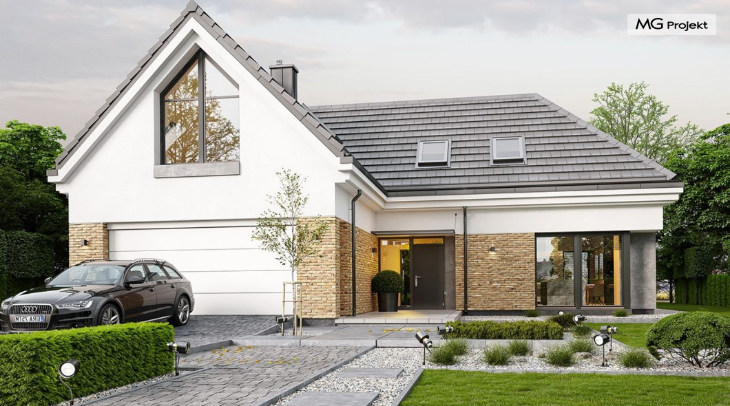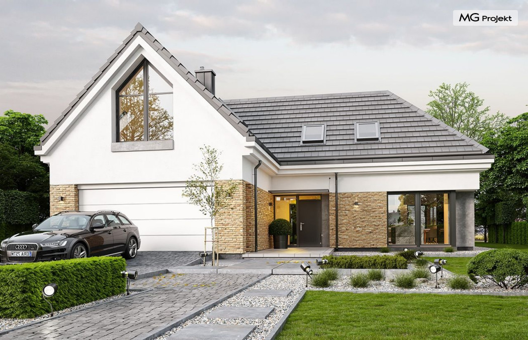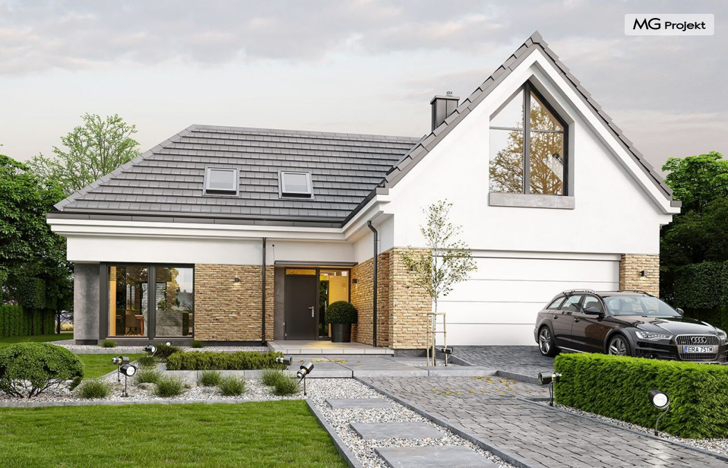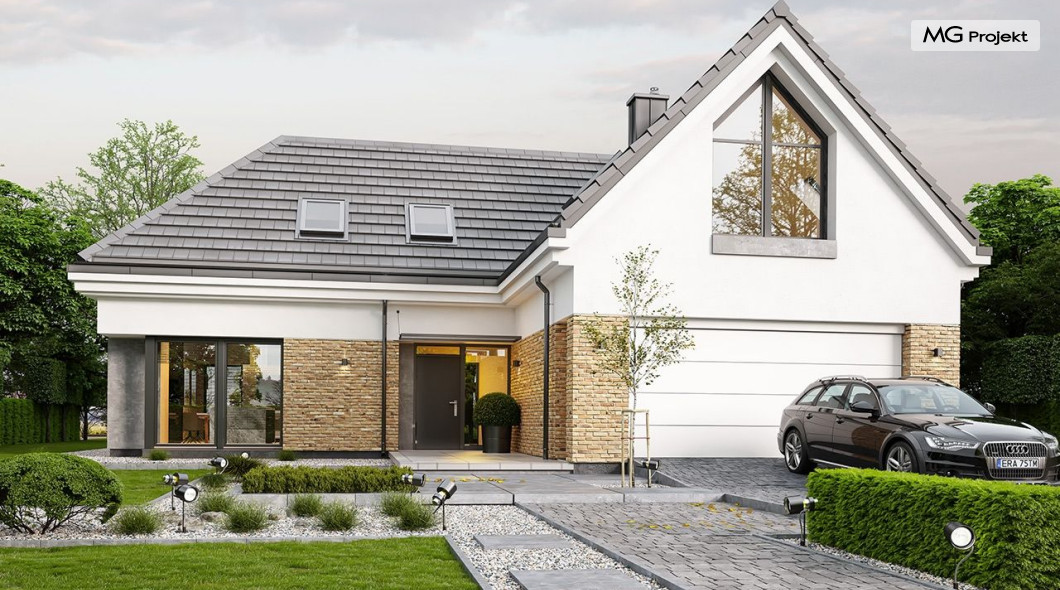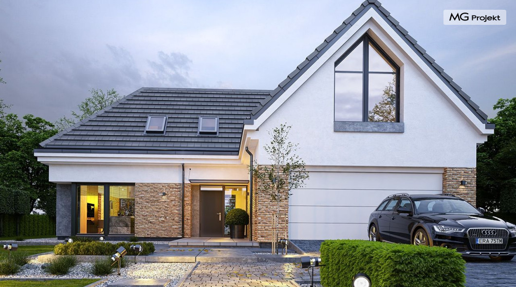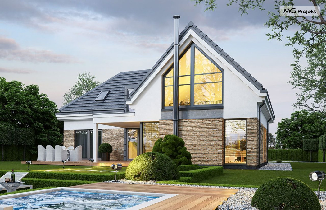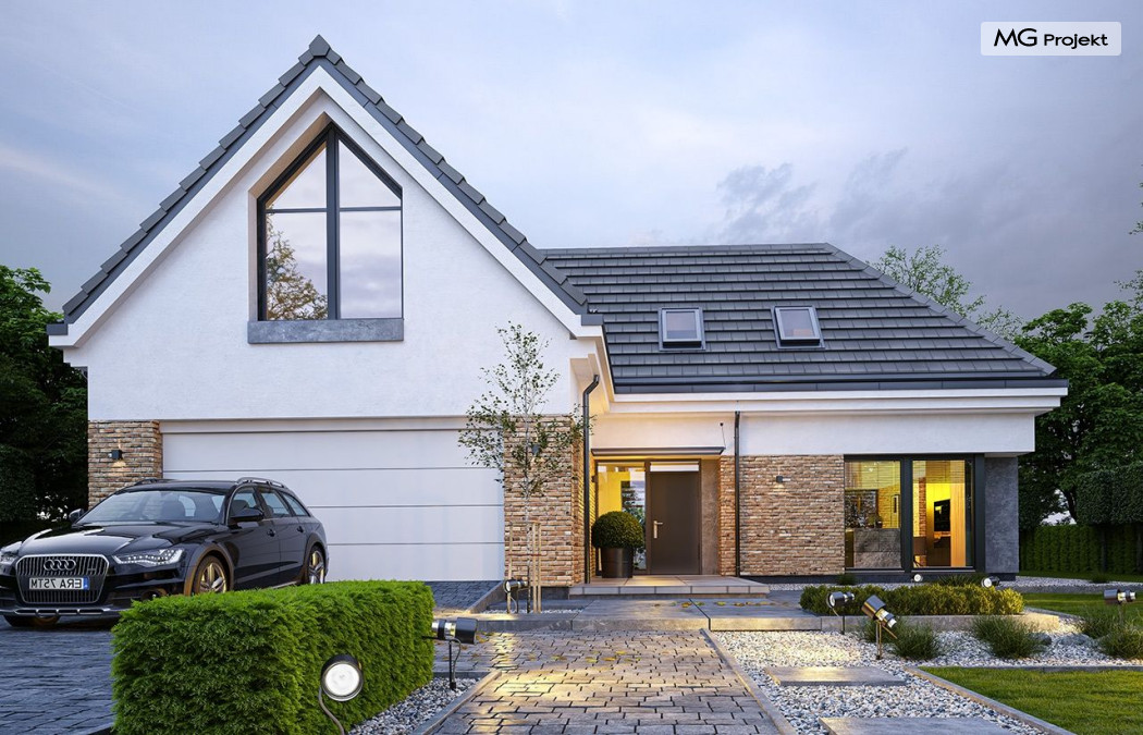 Nazwa projektu domu Willa Eska wzięła się od kształtu bryły, wygiętej w literę "S", tworząc w ten sposób bardzo korzystny funkcjonalnie i wizualnie plan - z dziedzińcem frontowym i z tylnym patiem ogrodowym. Ideą projektu Willa Eska jest wkomponowanie nowoczesnej architektury, detali i funkcji, w tradycyjny kształt domu z dwuspadowym dachem. Dobrze dobrane proporcje willi eski, ciekawie poprowadzone podziały miedzy ścianami a powierzchniami szyb tworzą harmonijną, spokojną sylwetkę, o stonowanej ludzkiej skali. Front domu jednorodzinnego Willa Eska ozdabia reprezentacyjne wejście z bocznymi i górnymi naświetlami, zaakcentowane wnęką i zadaszeniem. Atrakcyjności elewacji frontowej dodaje narożne okno kuchenne, oraz piękne wysokie okno na poddaszu jednej z sypialni. Od strony ogrodu na pierwszy plan wychodzą detale: dużego okna części salonowej z otwarciem przestrzennym do sufitu, oraz prostopadłościenny przeszklony wykusz klatki schodowej wykończony blachą na rąbek. Udane proporcje projektu budynku Willa Eska, połączenie właściwie zastosowanych materiałów dają spójny atrakcyjny estetycznie efekt. Dodatkowo uroku sylwetce budynku Willa Eska dodają oryginalne gzymsowania okapów.