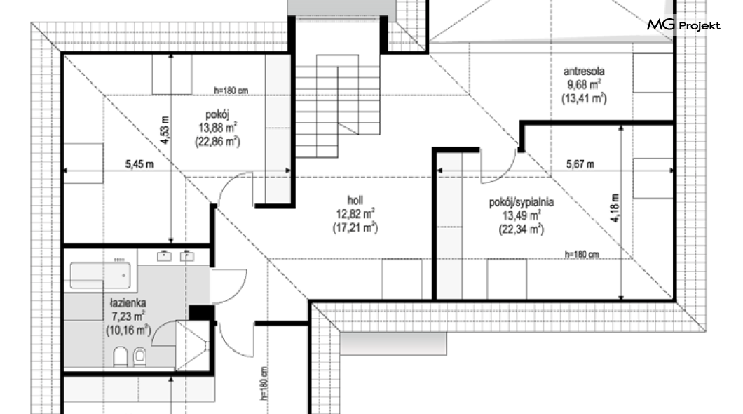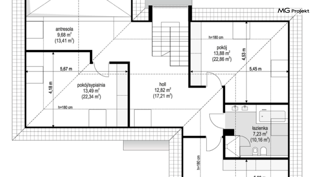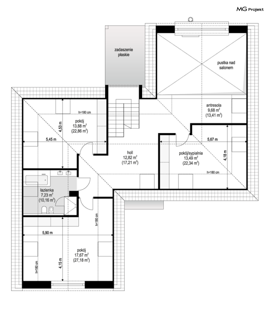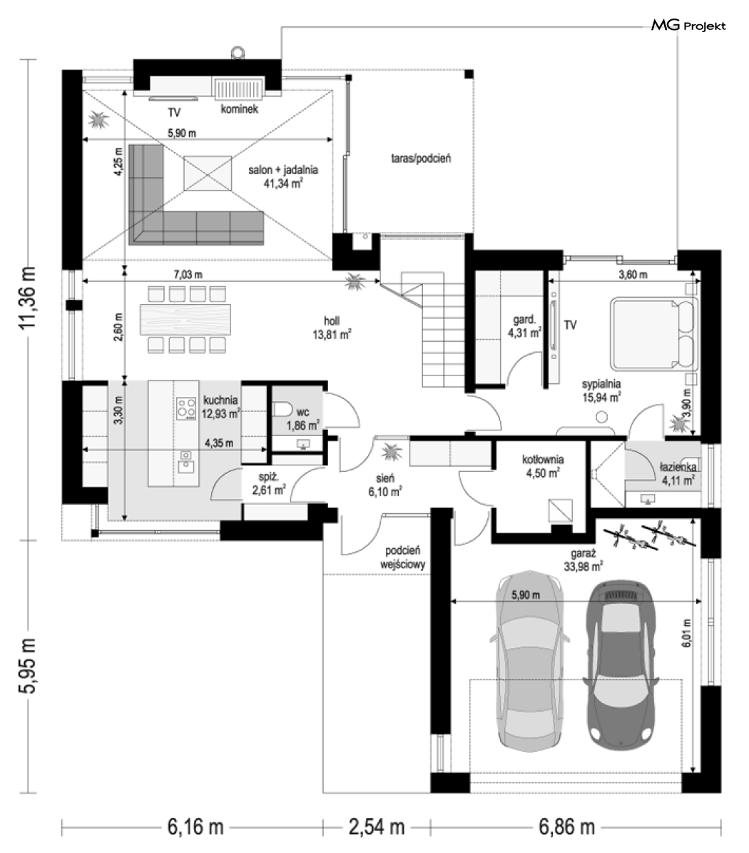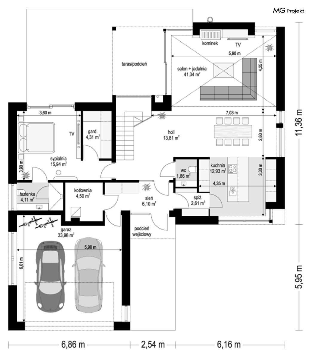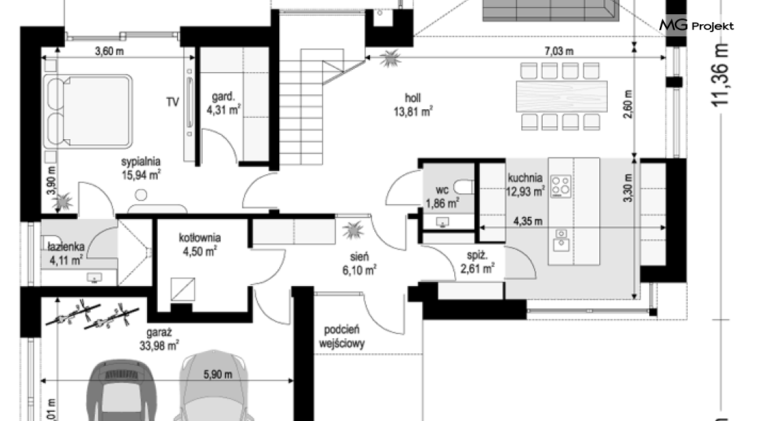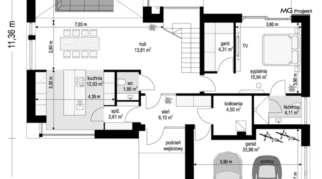 Wnętrze w domku Willa Eska zaprojektowano dzieląc je na poszczególne sekcje. Wchodząc do środka przez przeszklony przedsionek przechodzimy do reprezentacyjnego holu, z którego mamy osiowy widok na przestrzał na ogród i rozchodzimy się do poszczególnych części domostwa. Hol w projekcie domu Willa Eska łączy się z pięknym wnętrzem dziennym - z salonem, jadalnią i kuchnią. W domku Willa Eska nad salonem mamy otwarcie przestrzenne z antresolą. Wygodna kuchnia z wyspą stanowi przedłużenie pokoju dziennego. Dzięki poprzecznemu ciągowi komunikacyjnemu uzyskano łatwe i praktyczne przejście z garażu, przez przedsionek i spiżarnię do kuchni. Na parterze Willi Eski wydzielono cześć sypialną z łazienką i garderobą – sypialnię państwa domu z dostępem do tarasu ogrodowego. W innych wersjach projektu Willa Eska ta powierzchnia jest inaczej zagospodarowana. Pozostałe pomieszczenia na parterze to duży dwustanowiskowy garaż i kotłownia. Na poddaszu zaprojektowano trzy wygodne sypialnie, oraz w pełni wyposażoną łazienkę. Dość spory hol pełni tutaj funkcję bawialni. Na antresoli nad salonem można postawić domową bibliotekę i wygodną kanapę, albo biurko do pracy.