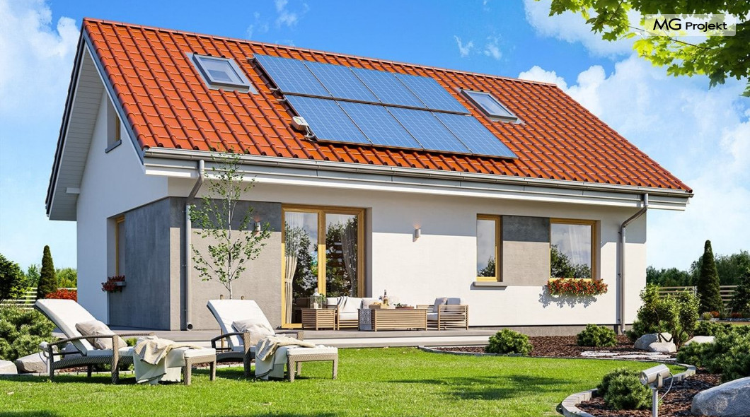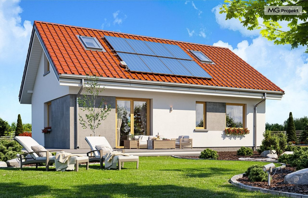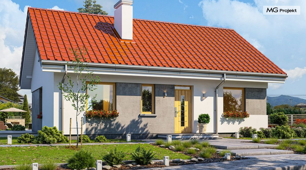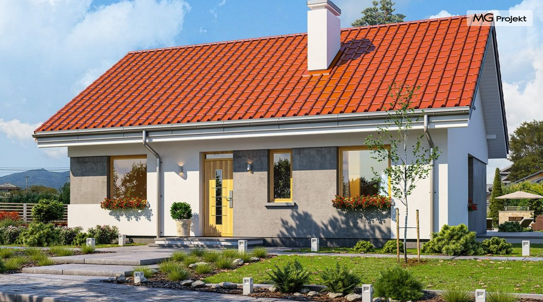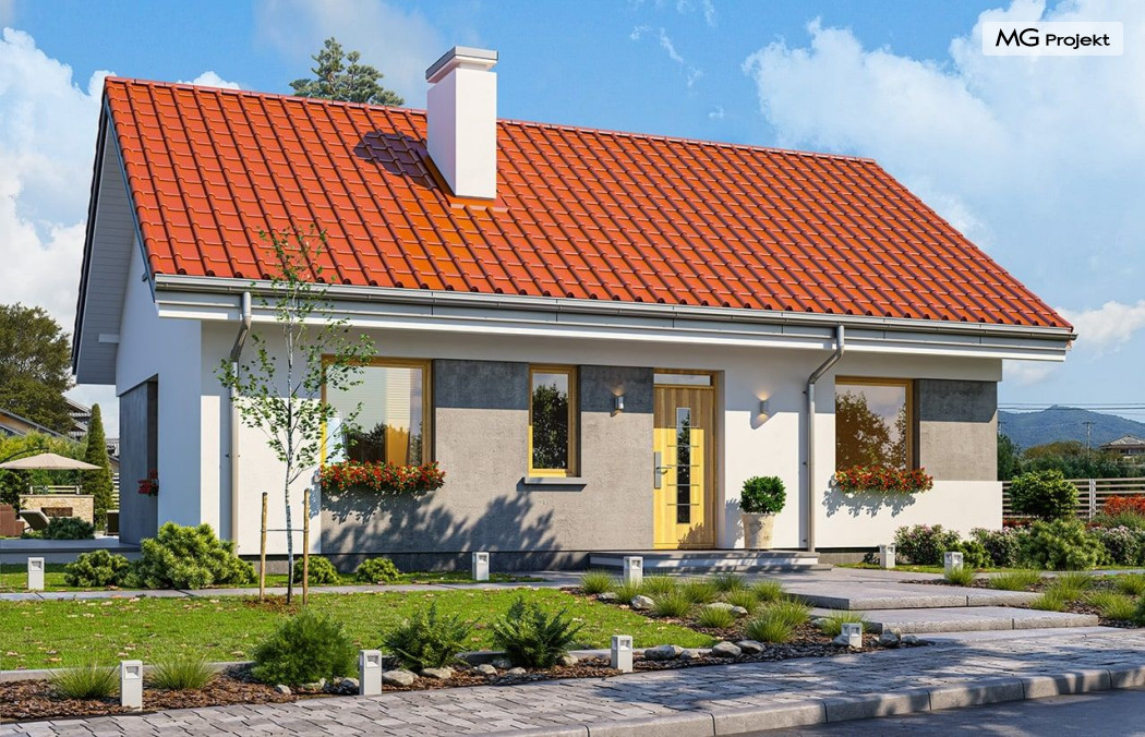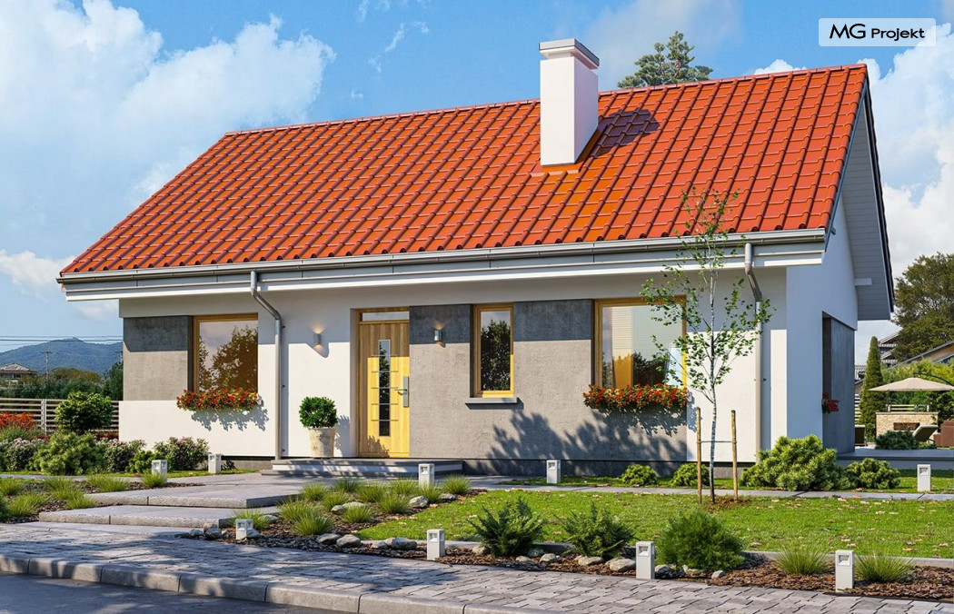 Projekt domu Kasia 5 to projekt prostego bezpretensjonalnego domu – energooszczędnego, niedrogiego w budowie i późniejszym utrzymaniu - w sam raz dla 4-5 osobowej rodziny, która chce żyć wygodnie i komfortowo, ale nie chce zadłużać się na całe życie inwestując w drogi dom. Seria domków „ Kasia ” to doskonała propozycja dla pragmatycznie myślących osób, planujących budowę łatwą, szybką i nieskomplikowaną. Budynek zaprojektowano jako parterowy, założony na planie prostokąta o wymiarach 11x8 m, przykryty dwuspadowym dachem. Zasadniczą podstawową bryłę domu można - w zależności od wybranej wersji wariantowej „Kasi” - wzbogacić o : wiatę garażową, garaż, zadaszenie nad tarasem ogrodowym, czy też strych nad parterem o funkcji magazynu, lub poddasza do zagospodarowania w razie potrzeby. Dom ma prostą i nowoczesną architekturę, a zarazem przytulny i sympatyczny wygląd - aż ma się ochotę w nim zamieszkać. Do wnętrza prowadzą nas drzwi wejściowe z naświetlem, do przedsionka z szafami. Stąd przechodzimy do przedpokoju, a dalej do salonu z kuchnią, oraz sypialni, łazienki i wc. Z przedsionka jest też dostęp do kotłowni, w której można umieścić zarówno kocioł c.o. na gaz, jak i pompę ciepła powietrze –woda, albo niewielki kocioł na paliwo stałe - w zależności od wyboru systemu ogrzewania. W salonie mamy wolną ścianę telewizyjną i kominek narożny na osobnej ścianie - obok kotłowni dzięki czemu w domu jest tylko jeden zespół kominowy. W domu zaprojektowano osobno łazienkę i wc - wygodne rzadko spotykane rozwiązanie w niewielkich domach. W łazience mamy dużo miejsca na prysznic, oraz pralkę i suszarkę. W budynku przewidziano wentylację mechaniczną z rekuperacją w standardzie. Można rozważyć dokupienie instalacji paneli fotowoltaicznych - kształt dachu na to pozwala. Konstrukcja „Kasi” jest bardzo prosta - prościej się nie da : mamy tutaj tylko ściany zewnętrzne jako konstrukcyjne, a nad ścianami wiązary dachowe, stanowiące konstrukcję stropu i dachu. Posiadamy wersję wariantową z otwartym sufitem nad salonem aż do dachu, dzięki czemu wnętrze salonu powiększa się. „Kasia” to projekt energooszczędny, z bardzo dobrymi ociepleniami przegród, z nowoczesnymi instalacjami, tani w budowie i późniejszym utrzymaniu. Zapraszamy do zapoznanie się także z projektami domków: Kasia, Kasia 2, Kasia 3, Kasia 4, Kasia 6, Kasia 7 !