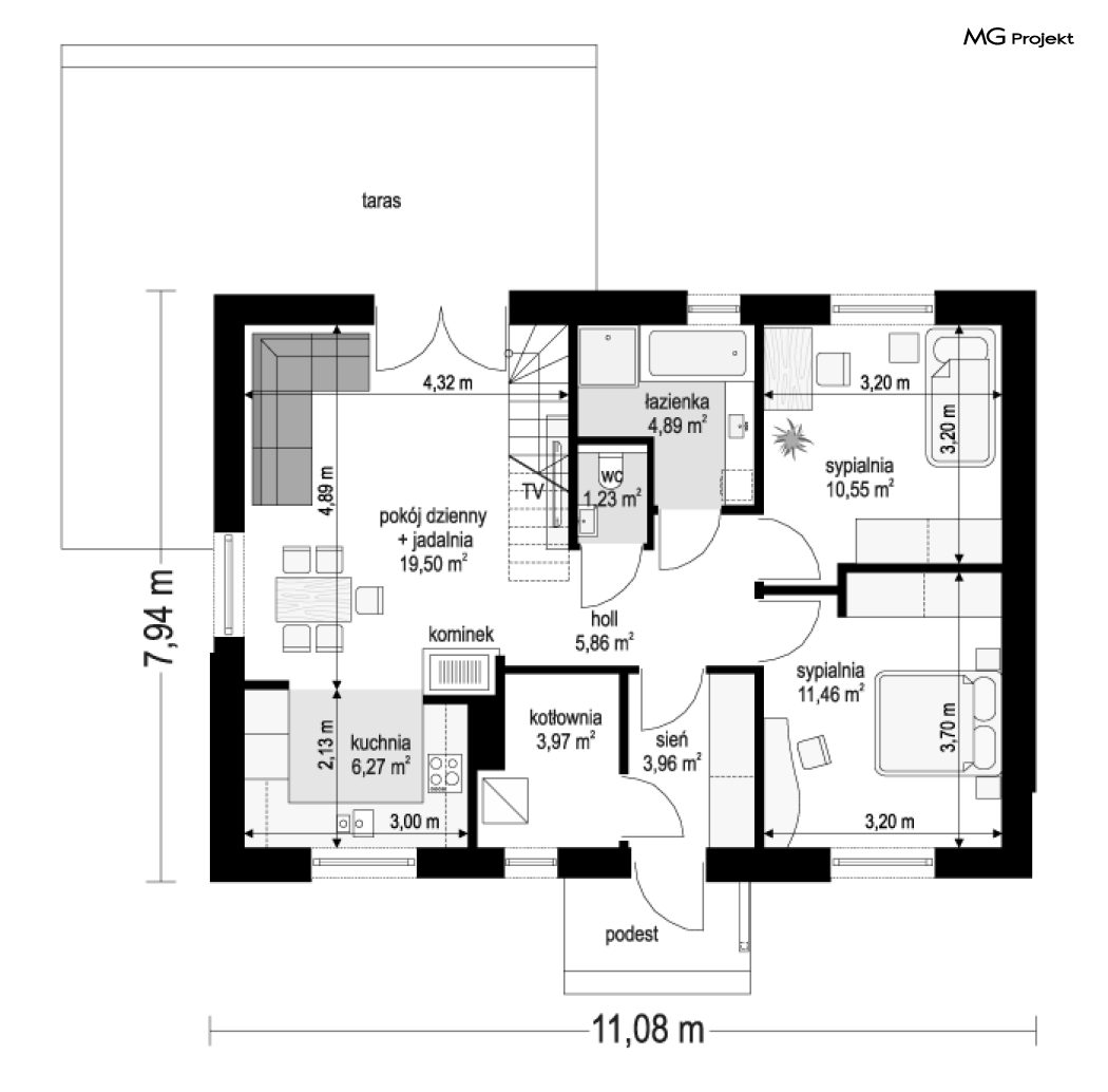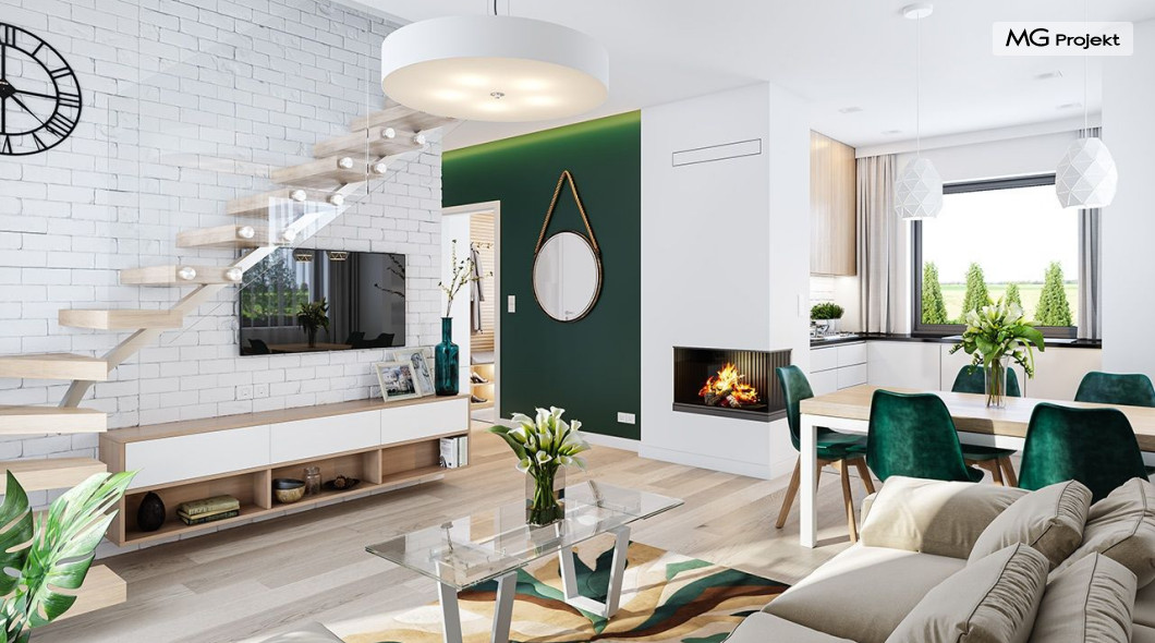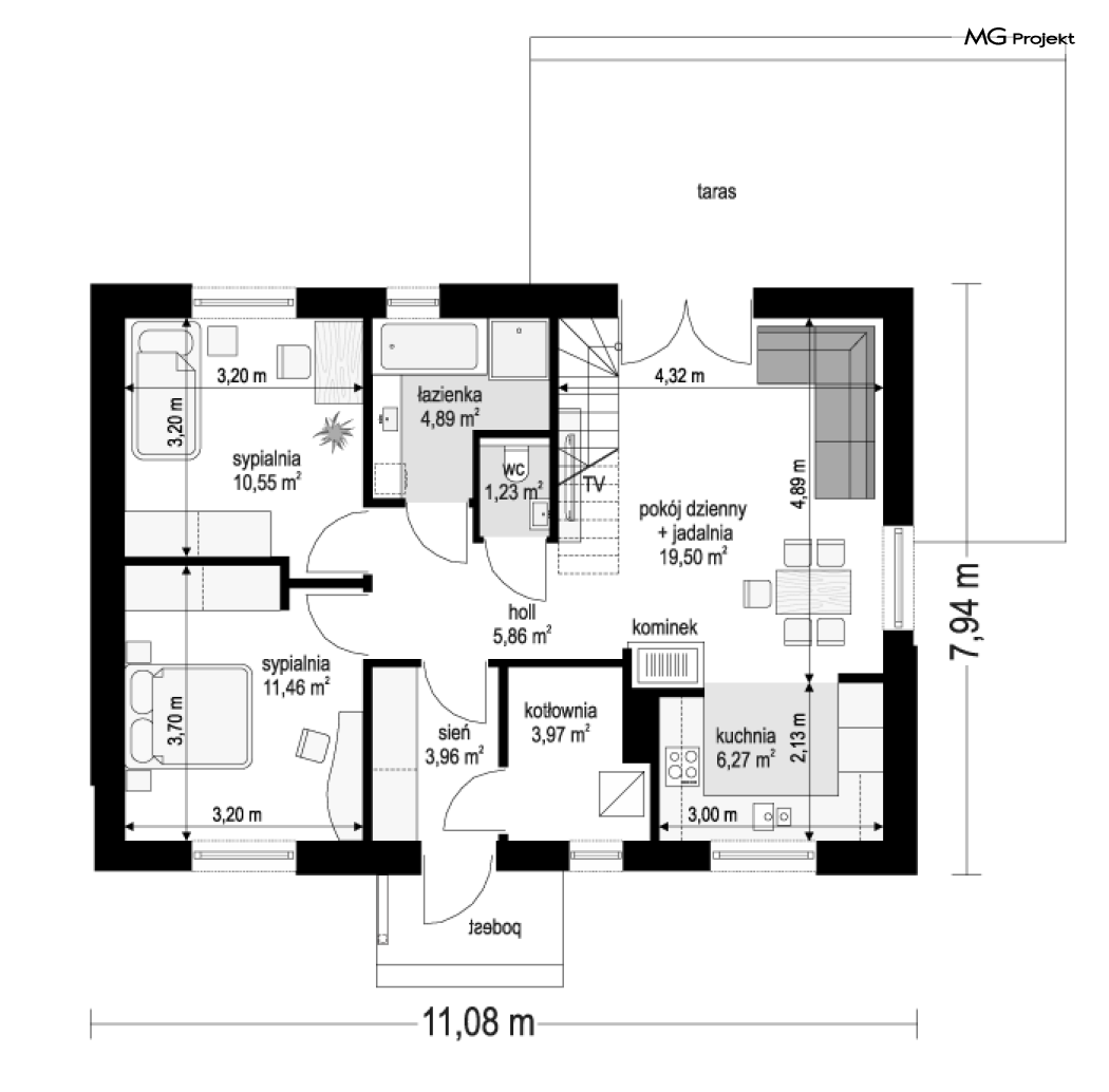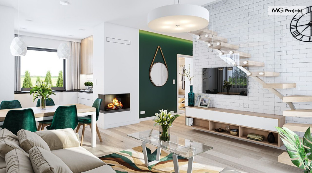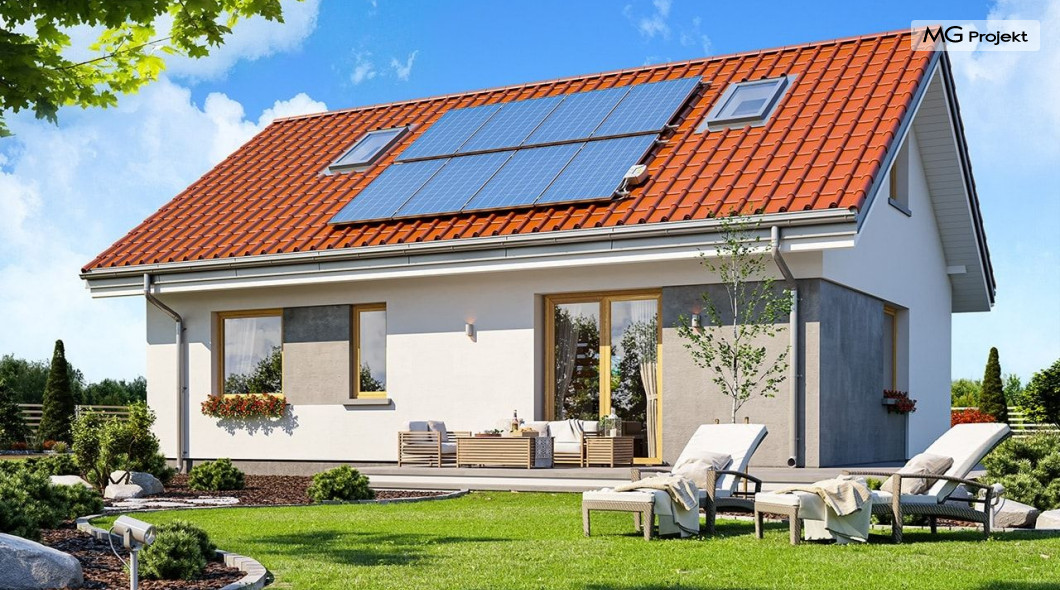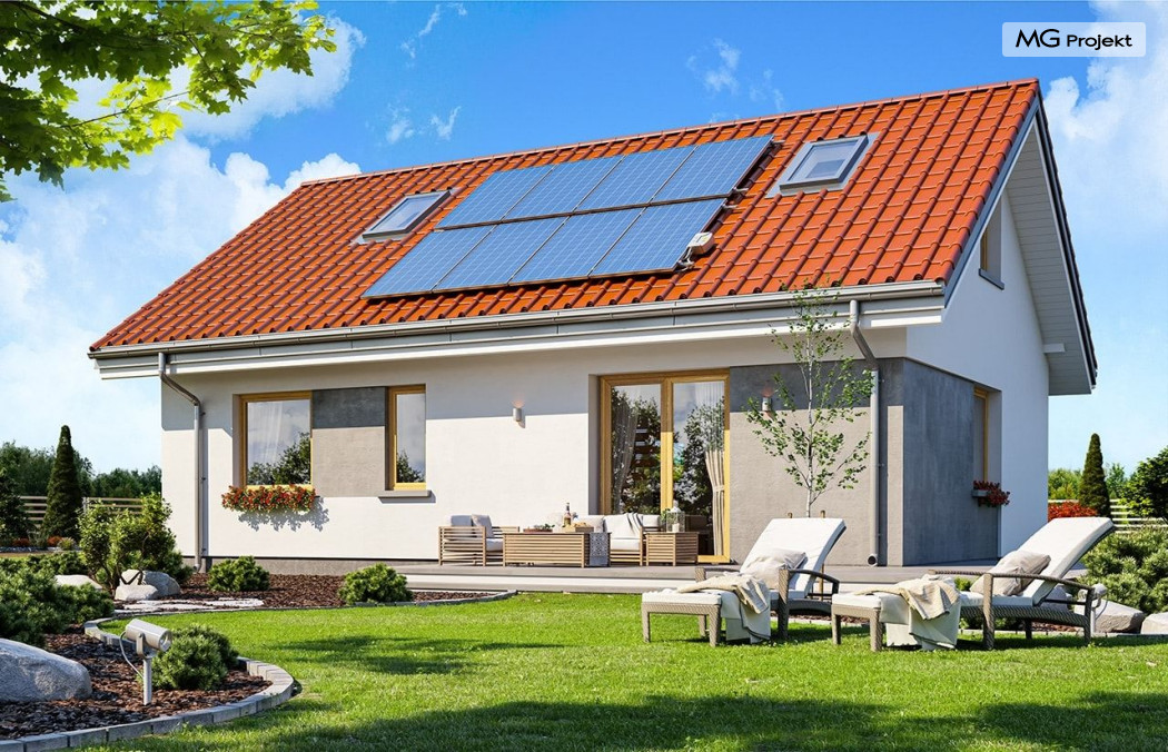 Projekt domu Kasia 5 to projekt prostego bezpretensjonalnego domu – energooszczędnego, niedrogiego w budowie i późniejszym utrzymaniu - w sam raz dla 4-5 osobowej rodziny, która chce żyć wygodnie i komfortowo, ale nie chce zadłużać się na całe życie inwestując w drogi dom. Seria domków „ Kasia ” to doskonała propozycja dla pragmatycznie myślących osób, planujących budowę łatwą, szybką i nieskomplikowaną. Budynek zaprojektowano jako parterowy, założony na planie prostokąta o wymiarach 11x8 m, przykryty dwuspadowym dachem. Zasadniczą podstawową bryłę domu można - w zależności od wybranej wersji wariantowej „Kasi” - wzbogacić o : wiatę garażową, garaż, zadaszenie nad tarasem ogrodowym, czy też strych nad parterem o funkcji magazynu, lub poddasza do zagospodarowania w razie potrzeby. Dom ma prostą i nowoczesną architekturę, a zarazem przytulny i sympatyczny wygląd - aż ma się ochotę w nim zamieszkać. Do wnętrza prowadzą nas drzwi wejściowe z naświetlem, do przedsionka z szafami. Stąd przechodzimy do przedpokoju, a dalej do salonu z kuchnią, oraz sypialni, łazienki i wc. Z przedsionka jest też dostęp do kotłowni, w której można umieścić zarówno kocioł c.o. na gaz, jak i pompę ciepła powietrze –woda, albo niewielki kocioł na paliwo stałe - w zależności od wyboru systemu ogrzewania. W salonie mamy wolną ścianę telewizyjną i kominek narożny na osobnej ścianie - obok kotłowni dzięki czemu w domu jest tylko jeden zespół kominowy. W domu zaprojektowano osobno łazienkę i wc - wygodne rzadko spotykane rozwiązanie w niewielkich domach. W łazience mamy dużo miejsca na prysznic, oraz pralkę i suszarkę. W budynku przewidziano wentylację mechaniczną z rekuperacją w standardzie. Można rozważyć dokupienie instalacji paneli fotowoltaicznych - kształt dachu na to pozwala. Konstrukcja „Kasi” jest bardzo prosta - prościej się nie da : mamy tutaj tylko ściany zewnętrzne jako konstrukcyjne, a nad ścianami wiązary dachowe, stanowiące konstrukcję stropu i dachu. Posiadamy wersję wariantową z otwartym sufitem nad salonem aż do dachu, dzięki czemu wnętrze salonu powiększa się. „Kasia” to projekt energooszczędny, z bardzo dobrymi ociepleniami przegród, z nowoczesnymi instalacjami, tani w budowie i późniejszym utrzymaniu. Zapraszamy do zapoznanie się także z projektami domków: Kasia, Kasia 2, Kasia 3, Kasia 4, Kasia 6, Kasia 7 !