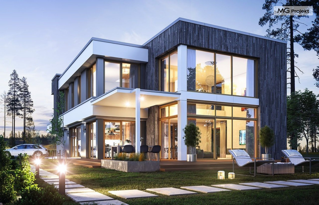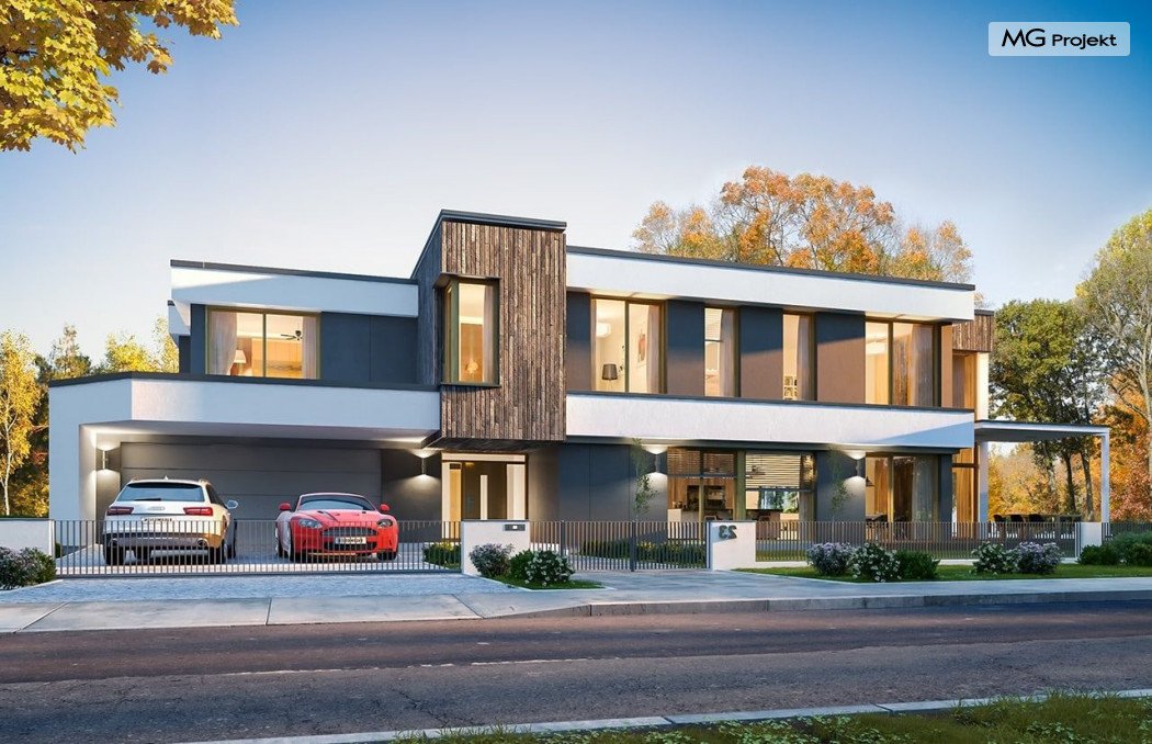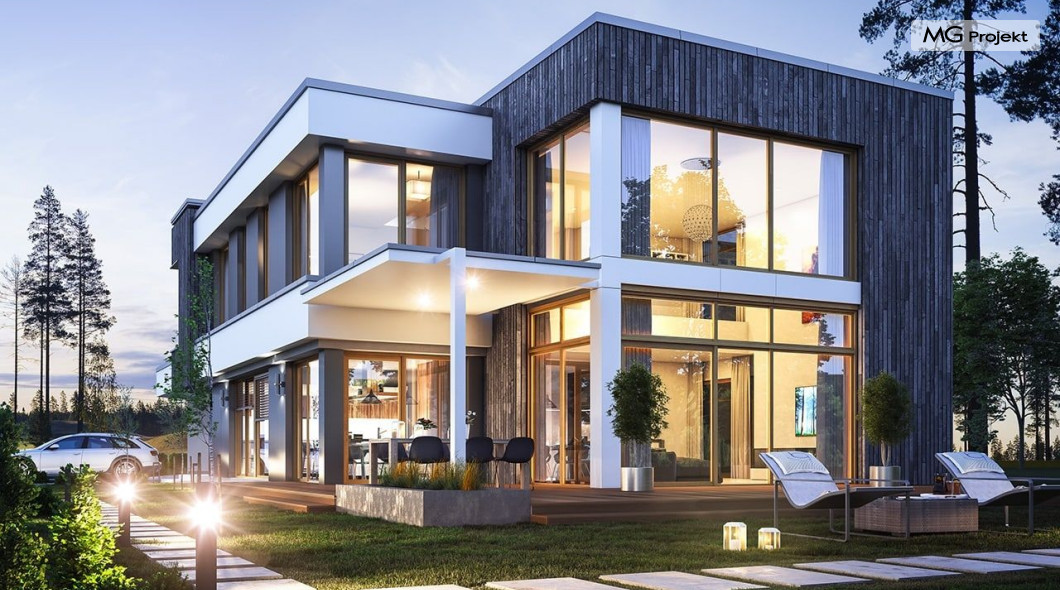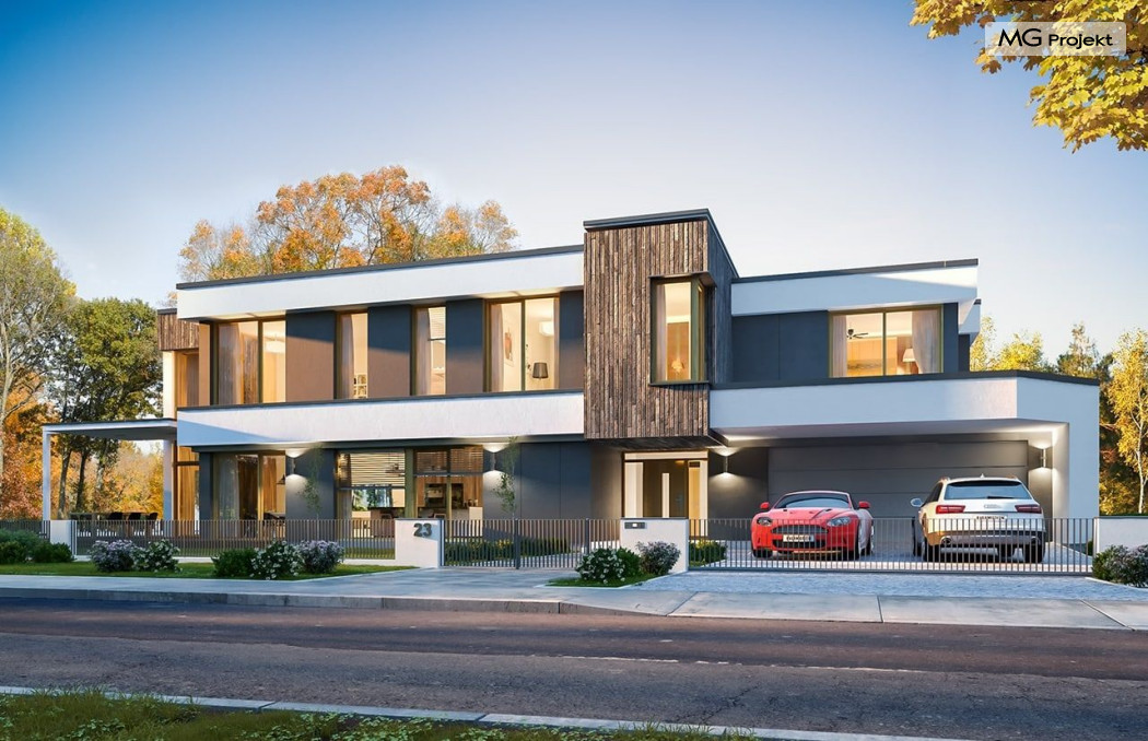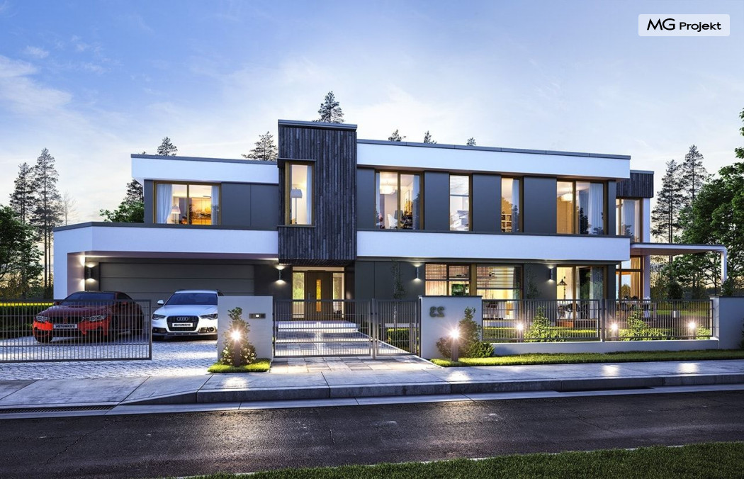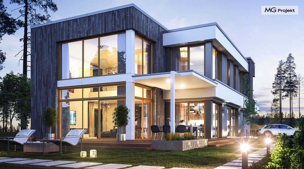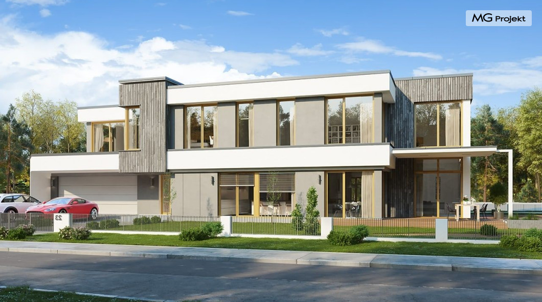 Projekt Willa Moderna jest propozycją dla osób planujących budowę dużego wygodnego domu, mających doświadczenia z mniejszymi wnętrzami i stawiających przy kolejnej inwestycji na nieudawany komfort i wygodę. Ten dom zaprojektowaliśmy dla osób wiedzących czego chcą, zdających sobie sprawę, że luksus kosztuje, ale jest nie do przecenienia. W projekcie Willa Moderna zastosowano nowoczesne rozwiązania materiałowe i technologicznie. Dom Willa Moderna jest bardzo dobrze izolowany. Zastosowano w nim energooszczędne rozwiązania instalacyjne. Projekt rezydencji Willa Moderna można zamówić w odbiciu lustrzanym, dostępne są też inne wersje domu: Willa Moderna 2.