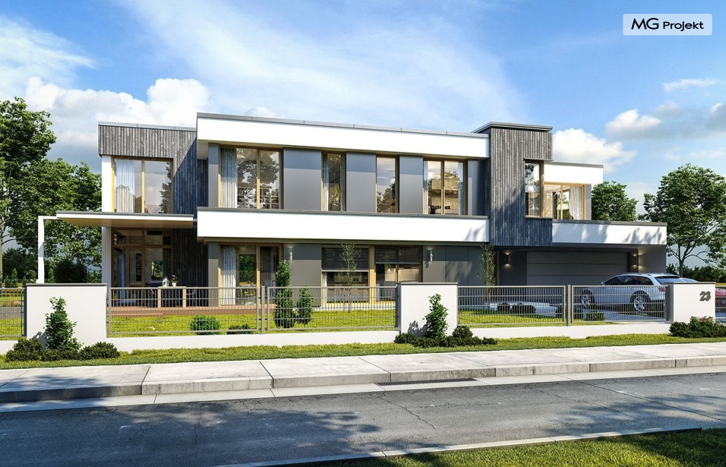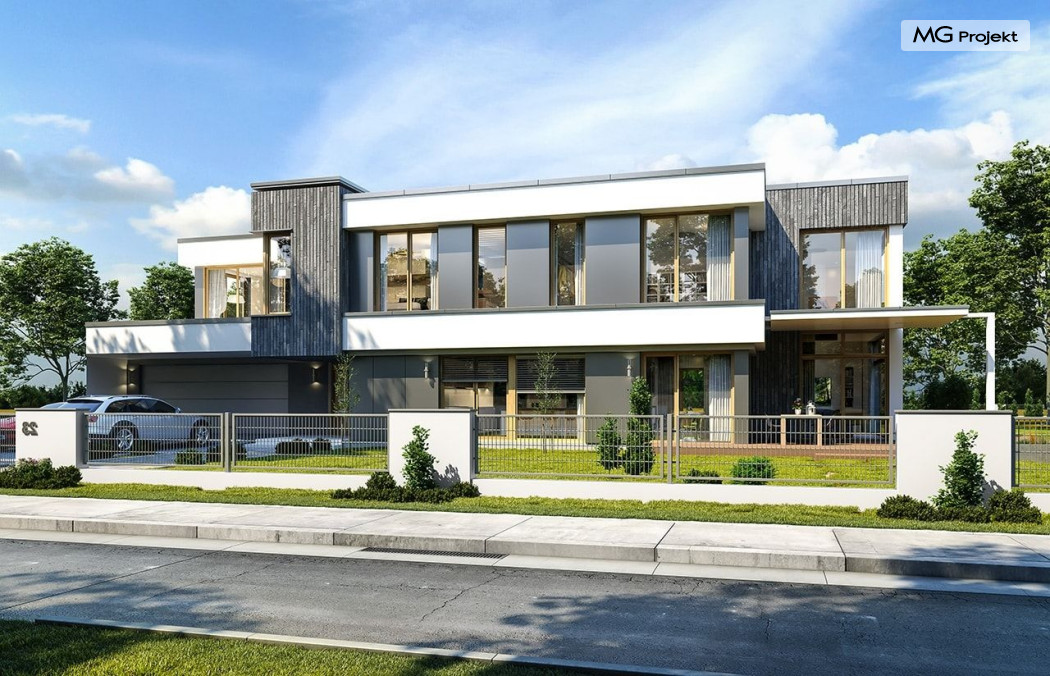 Projekt domu Willa moderna to reprezentacyjna willa miejska przeznaczona na płytką działkę z ogrodem z boku domu, pasująca na parcelę z niekorzystną orientacją działki względem stron świata i nasłonecznienia. Dom Willa Moderna ma jednopiętrową dwukondygnacyjną bryłę z płaskim dachem i składa się z kilku mniejszych brył przenikających się wzajemnie.