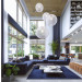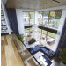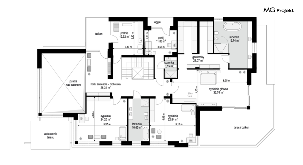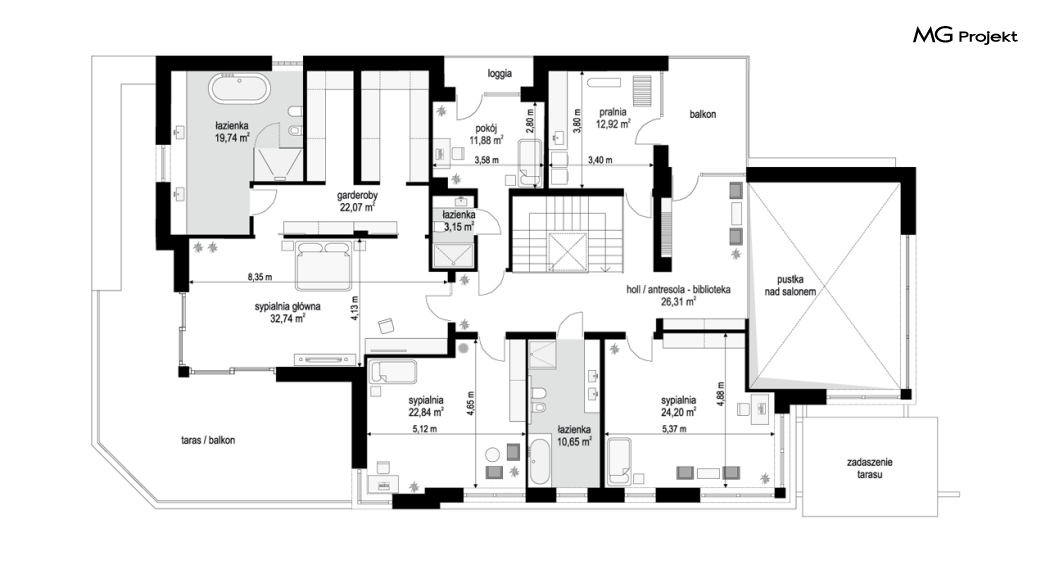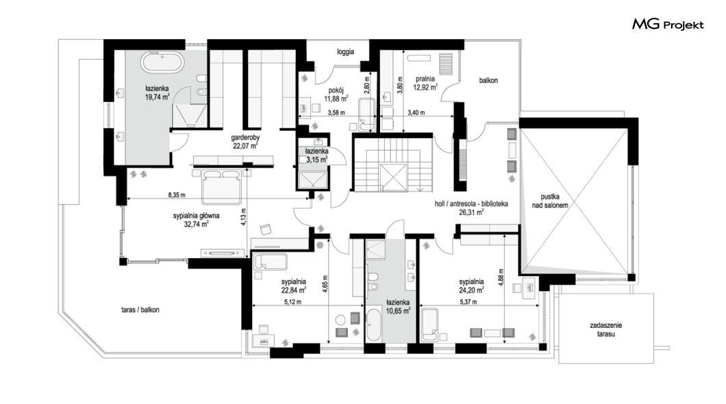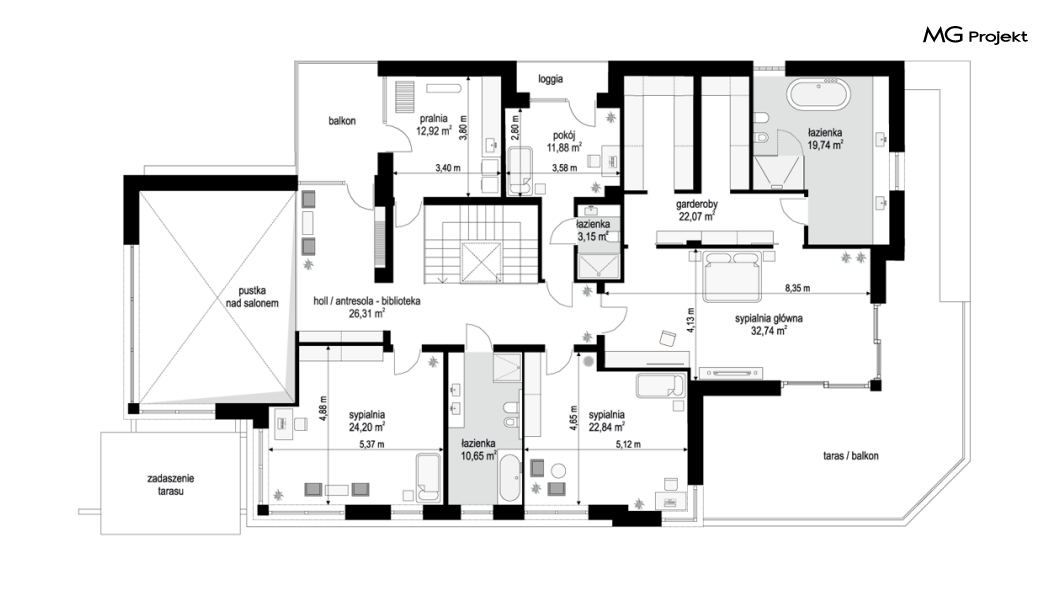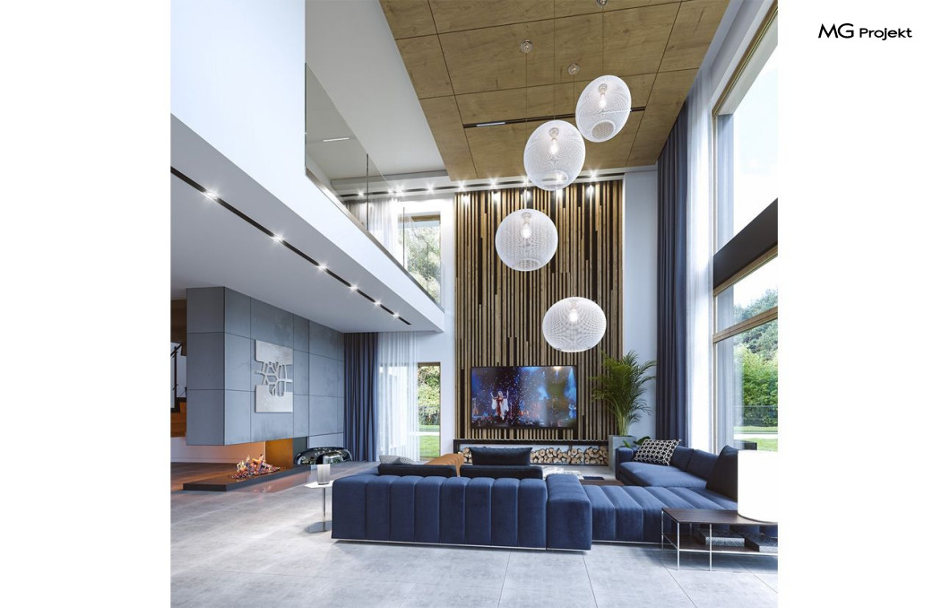 Wnętrze rezydencji Willa Moderna zaprojektowano z podziałem na maksymalnie otwartą część dzienną parteru i pokoje na piętrze. W projekcie willa moderna do budynku wchodzimy przez bardzo duży, niemal 10-metrowy przedsionek, do holu domu. Obok do dyspozycji jest duża szatnia i przejście do części garażowo-gospodarczej. W holu budynku centralne miejsce zajmują monumentalne reprezentacyjne schody z szeroką pustką w środku zabiegu schodów. Z holu przechodzimy do jeszcze bardziej spektakularnego wnętrza pokoju dziennego, którego większa część ma wysokość dwóch kondygnacji i piękne przeszklenie otwierające wnętrze na światło i ogród. W projekcie domu Willa Moderna od strony elewacji frontowej zaprojektowano kuchnię z wyspą i bardzo ładną spiżarnią – magazynem, oraz jadalnię. Pokój dzienny, poza narożnym wielkim oknem ma też ścianę rozrywkowo -telewizyjną, oraz piękny minimalistyczny trójstronny kominek, ozdabiający wnętrze i widoczny z wielu miejsc domu Willa Moderna. Za schodami przechodzimy do dodatkowego przestronnego gabinetu / biura domowego. Piętro stanowią głównie pokoje sypialne, oraz oddzielona antresola – biblioteka nad pustką salonu, stanowiąca jego przedłużenie i dopełnienie. Od frontu mamy dwie duże sypialnie dziecięce z łazienką, za schodami dodatkową sypialnię gościnną z własną łazienką, oraz pralnię-suszarnię z własnym balkonem, która jest na tyle duża aby pełnić również rolę pomieszczenia gospodarczo-pomocniczego na piętrze. Nad częścią garażową domu Willa Moderna mamy oddzielny bardzo luksusowy apartament master, z dużą sypialnią, podwójną garderobą Pani i Pana domu, oraz piękną łazienką. Apartament w projekcie Willa Moderna łączy się z bardzo ładnym tarasem na dachu.