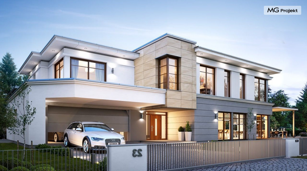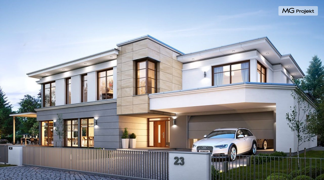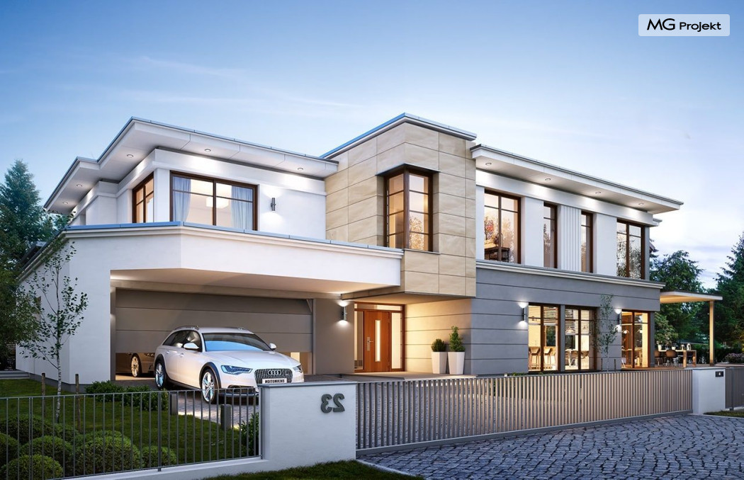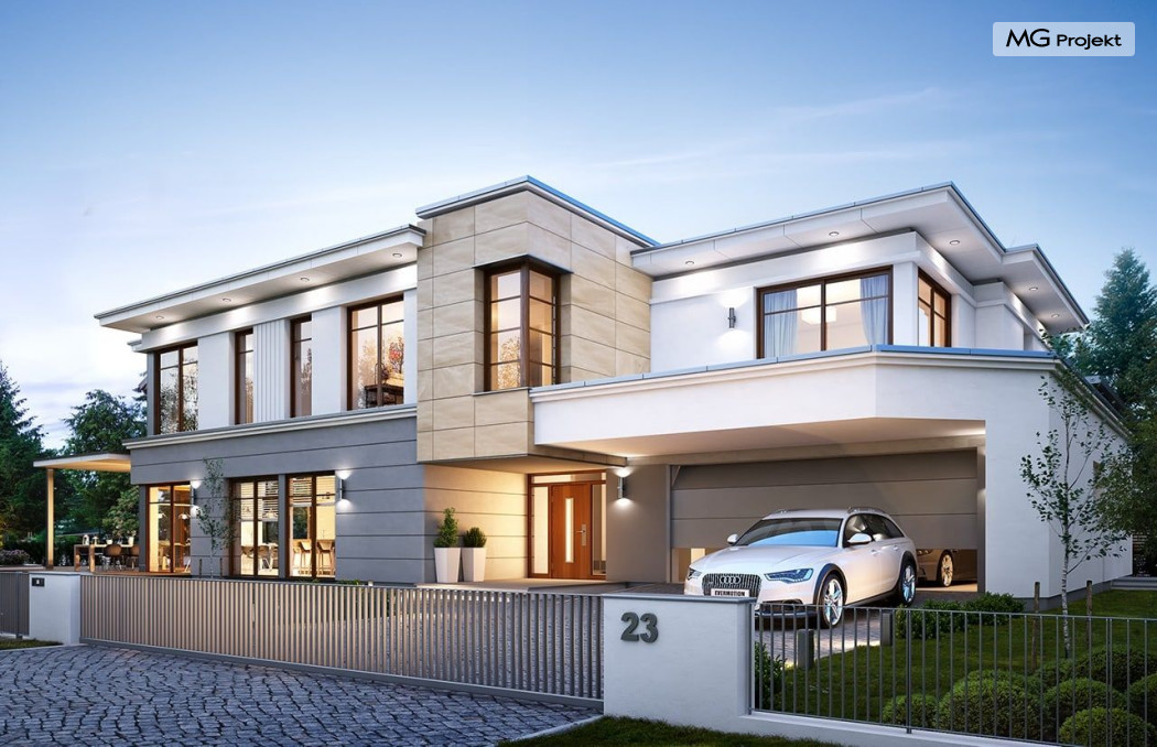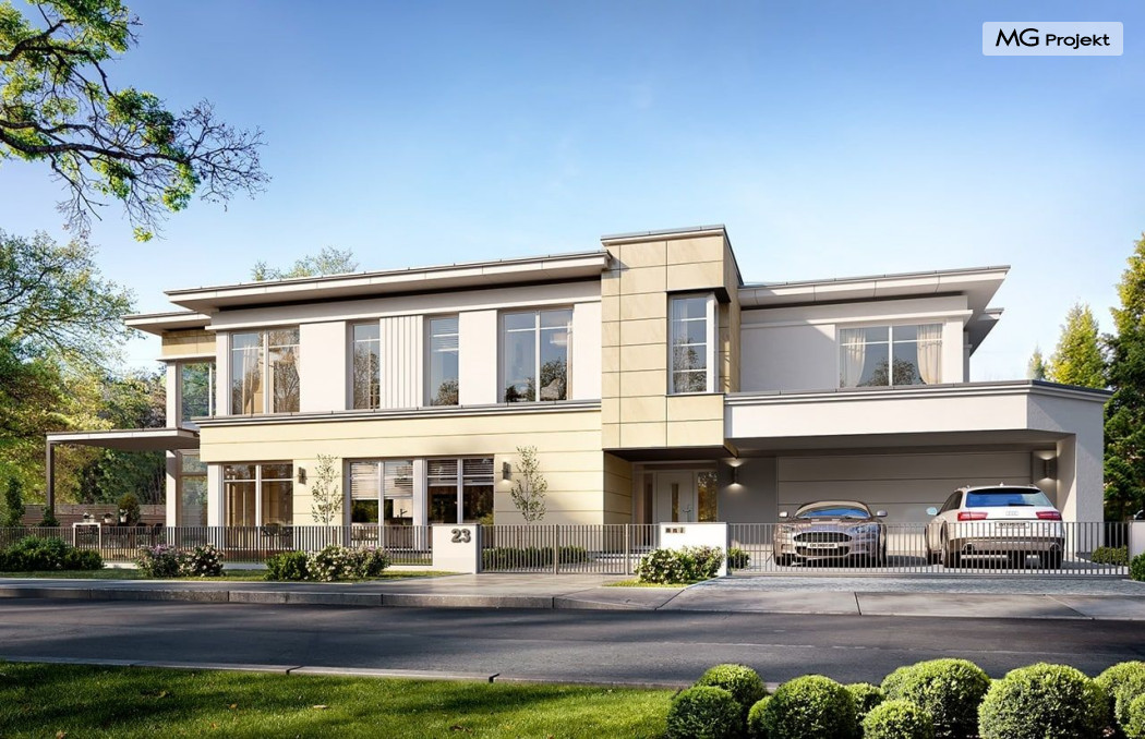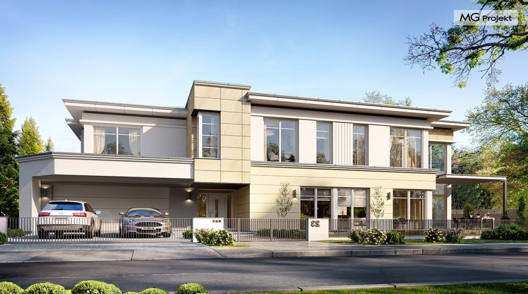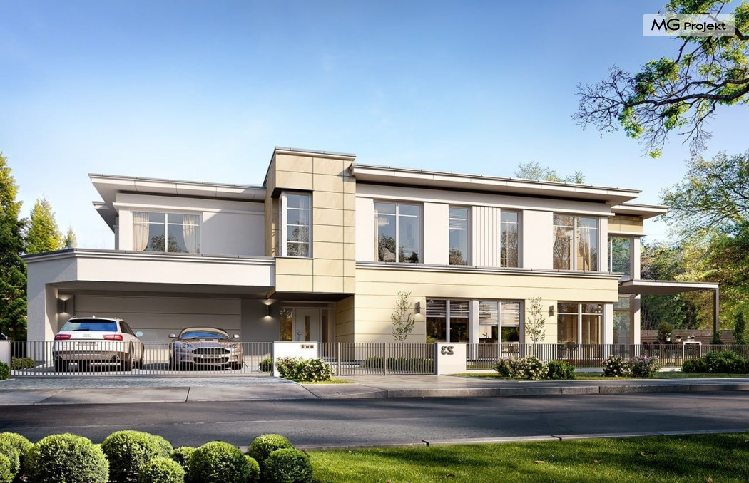 Projekt domu Willa Moderna 2 to propozycja dla Klientów, dysponujących środkami, gustem i wizją posiadania prawdziwej miejskiej willi. Projekt Willa Moderna 2 jest budynkiem dla osób planujących budowę dużego, wygodnego domu, mających już doświadczenia z mniejszymi wnętrzami i stawiających tym razem, przy kolejnej budowie na prawdziwy komfort i wygodę, gotowych zainwestować w komfortową oprawę swojego domostwa do codziennego życia. W projekcie Willa Moderna 2 zastosowano nowoczesne rozwiązania materiałowe i technologicznie, czyniące budynek energooszczędnym i łatwym w przyszłej eksploatacji. Projekt Willa Moderna 2 można zamówić również w wersji odbicia lustrzanego z garażem po lewej stronie. Zapraszamy także do zapoznania się z projektem Willa Moderna 1.